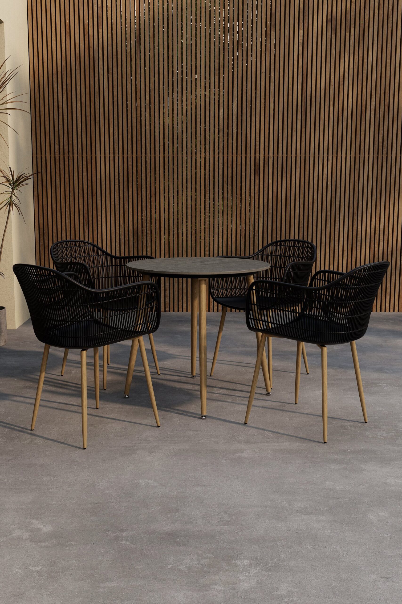 Anafi on stiilne söögikomplekt, mis ühendab kaasaegse disaini kõrge mugavusega. Komplekti kuulub elegantse lauaplaadiga ümarlaud ning neli kallistavate seljatugede ja mugavate patjadega tooli. Must värv ja rafineeritud detailid annavad sellele eksklusiivse välimuse, mis täiustab teie terrassi, rõdu või aia atmosfääri.