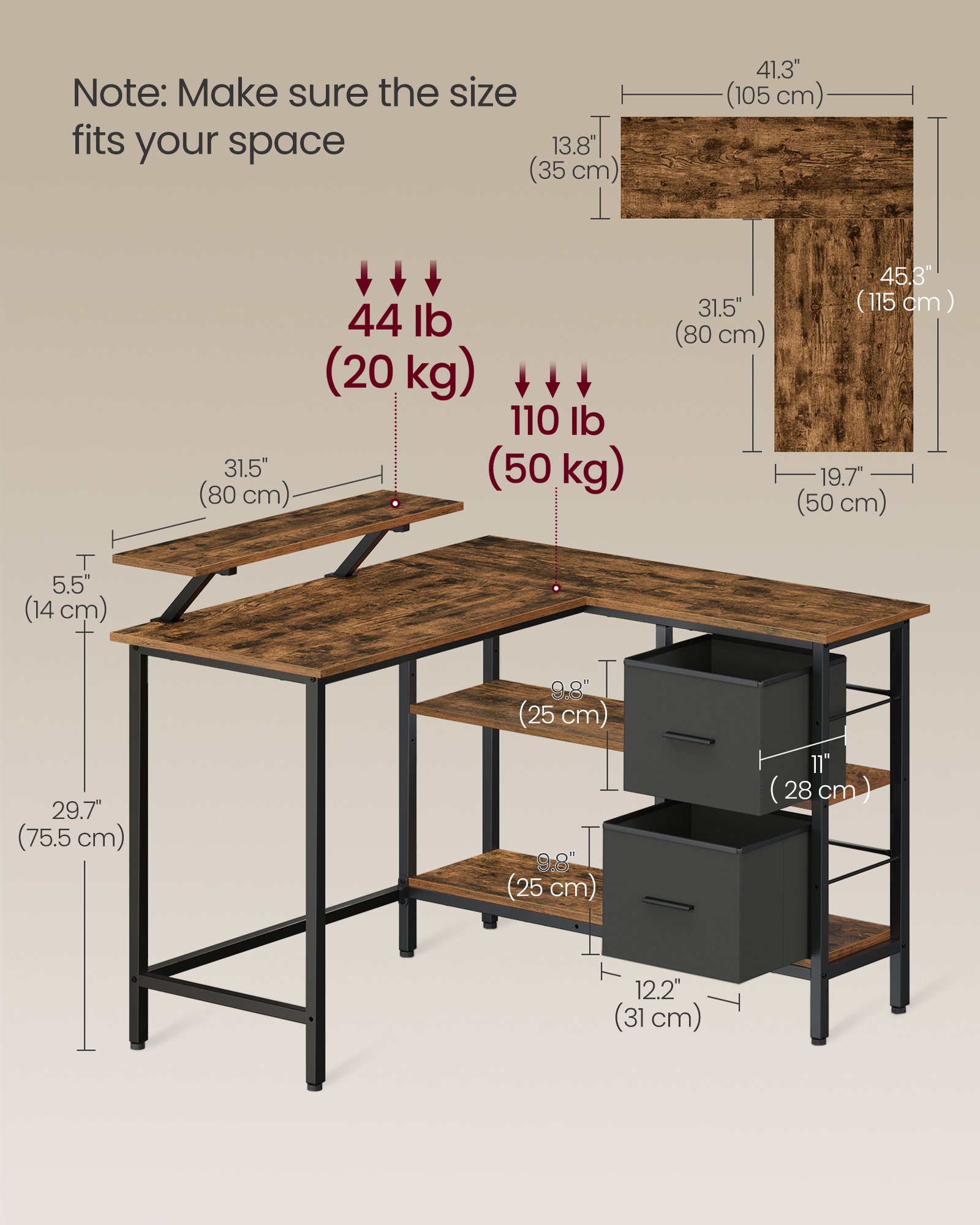 Spetsifikatsioonid: Värv: Rustikaalne pruun Materjal: Puitlaastplaat, teras, lausriie, polüpuuvillkangas Toote mõõdud: 41,3″S x 45,3″L x 35,2″K (105 x 115 x 89,5 cm) Toote kaal: 46,2 naela (21 kg) Lauaplaadi maksimaalne staatiline kandevõime: 110 naela (50 kg) Monitori aluse maksimaalne staatiline kandevõime: 44 naela (20 kg) Pakisisu: 1 x L-kujuline laud 1 x tarvikute komplekt 1 x juhend