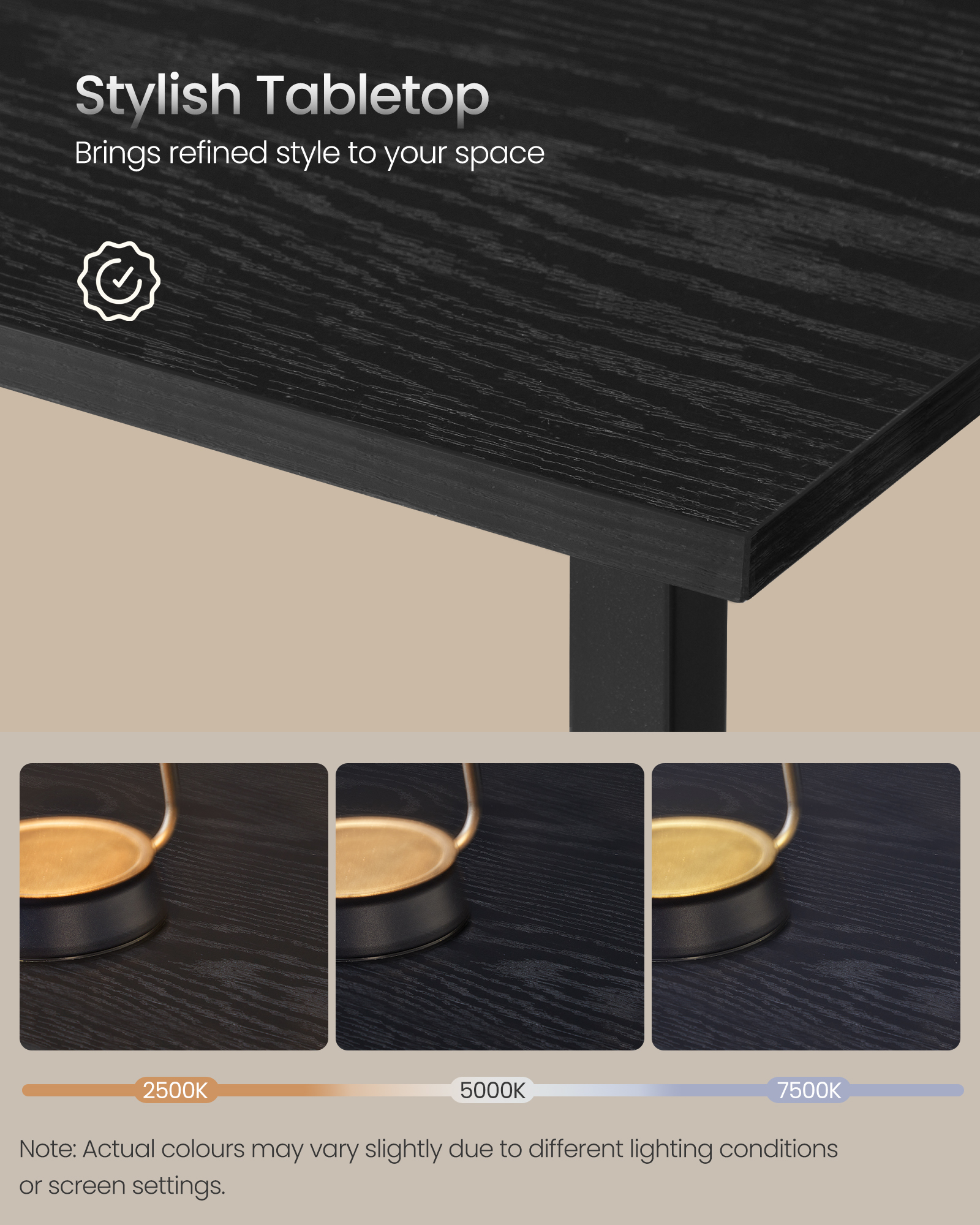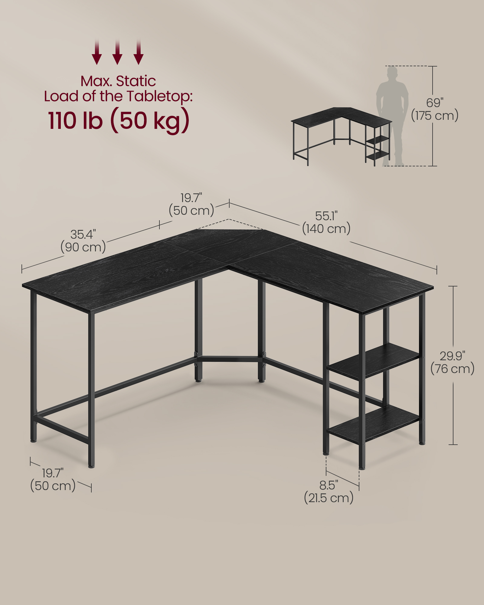 Spetsifikatsioonid: – Värvus: eebenimust – Materjal: puitlaastplaat, teras – Toote mõõdud: 55,1″L x 55,1″S x 29,9″K (140 x 140 x 76 cm) – Toote kaal: 40,8 naela (18,5 kg) – Lauaplaadi maksimaalne staatiline kandevõime: 110 naela (50 kg) – Iga hoiuriiuli maksimaalne staatiline kandevõime: 22 naela (10 kg) Pakisisu: – 1 x arvutilaud – 1 x lisatarvikute komplekt – 1 x juhend