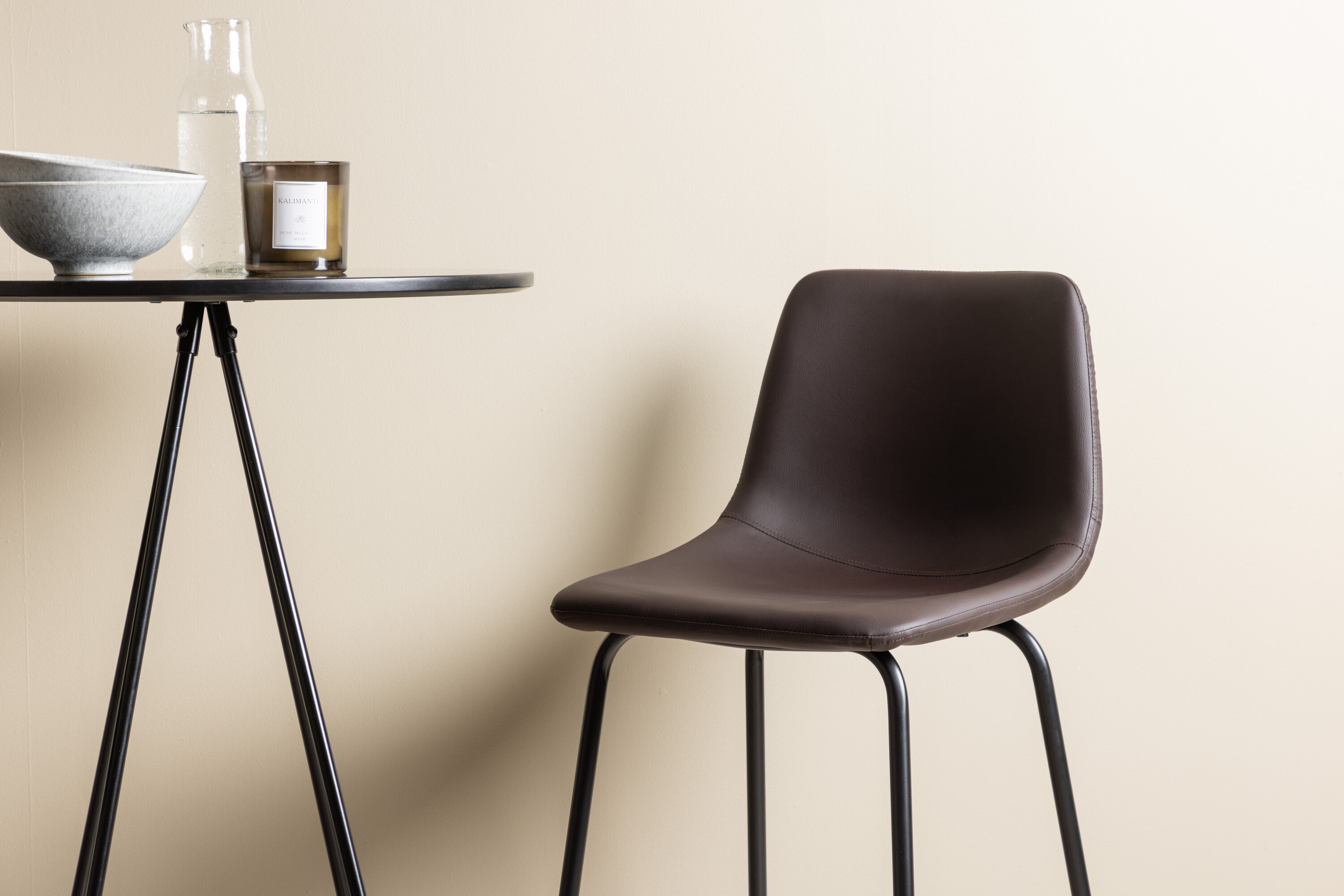 Sisusta nutikalt kaasaegsetes maalähedastes toonides! Bistro baarilaual on minimalistlik, skandinaavialik disain ja ümmargune lauaplaat mustast spooniga MDF-st. Õhulised koonusekujulised lauajalad on kergelt laienevad mustast metallist ja neil on integreeritud raam jalatoe jaoks. Siin stiilne kombinatsioon Alexi sarja pruunide baaripukkidega. Disain on hästi läbimõeldud: pruunist polsterdatud polüuretaannahast ja polüestrist täielikult polsterdatud tool ning mustast pulbervärvitud metallist kitsad jalad koos integreeritud jalatoega lisamugavuse tagamiseks. Tere tulemast koju trendikindlasse baarigruppi! Laua mõõdud: 60 cm.