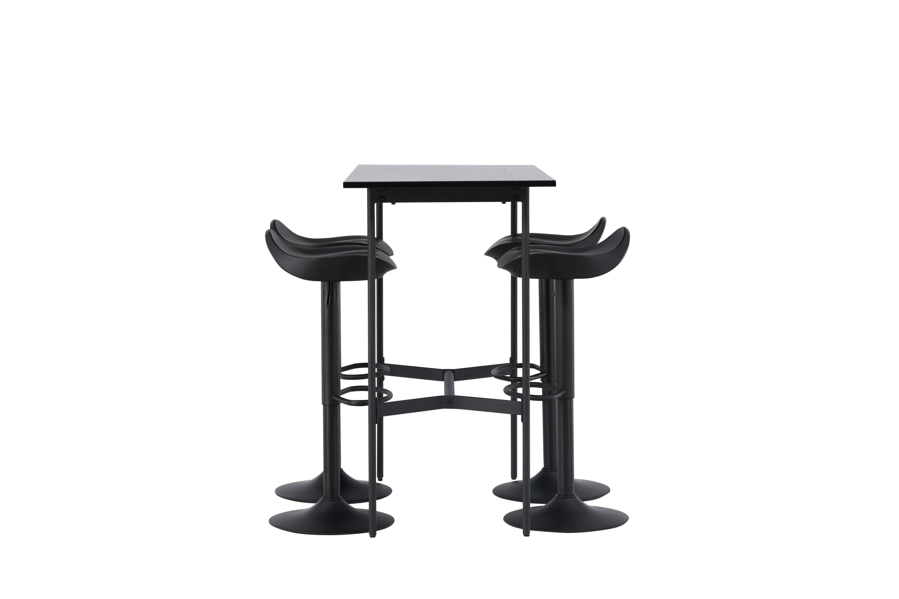 Õhuline ja stiilne! Minimalistlikul baarilaual Rax on õhuke mustast MDF-plaadist lauaplaat ja kitsad lauajalad koos integreeritud mustast metallist jalatoega. Siin koos klassikaliste mustade baaripukkidega Adesto sarjast. Toolil on stiilne disain, mille trompetijalg on mustast terasest ja lihtne iste mustast plastikust. Ühendage minimalism ajatu disainiga! Laua mõõdud: 120x60cm.