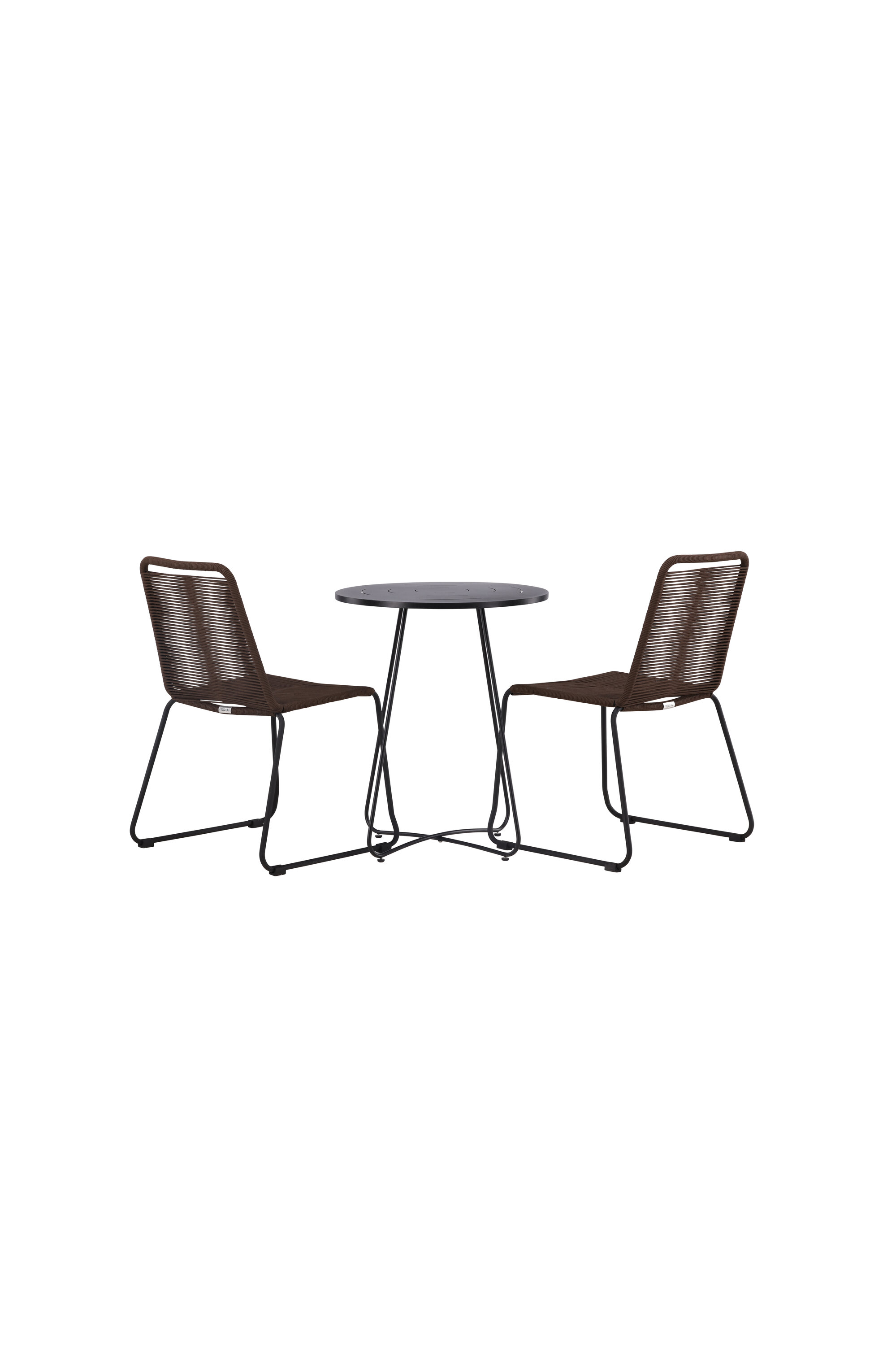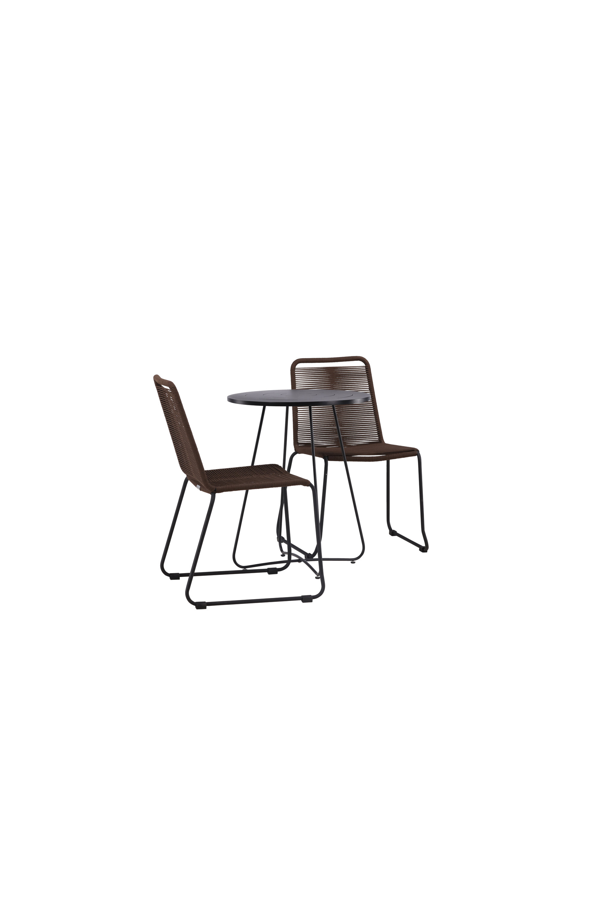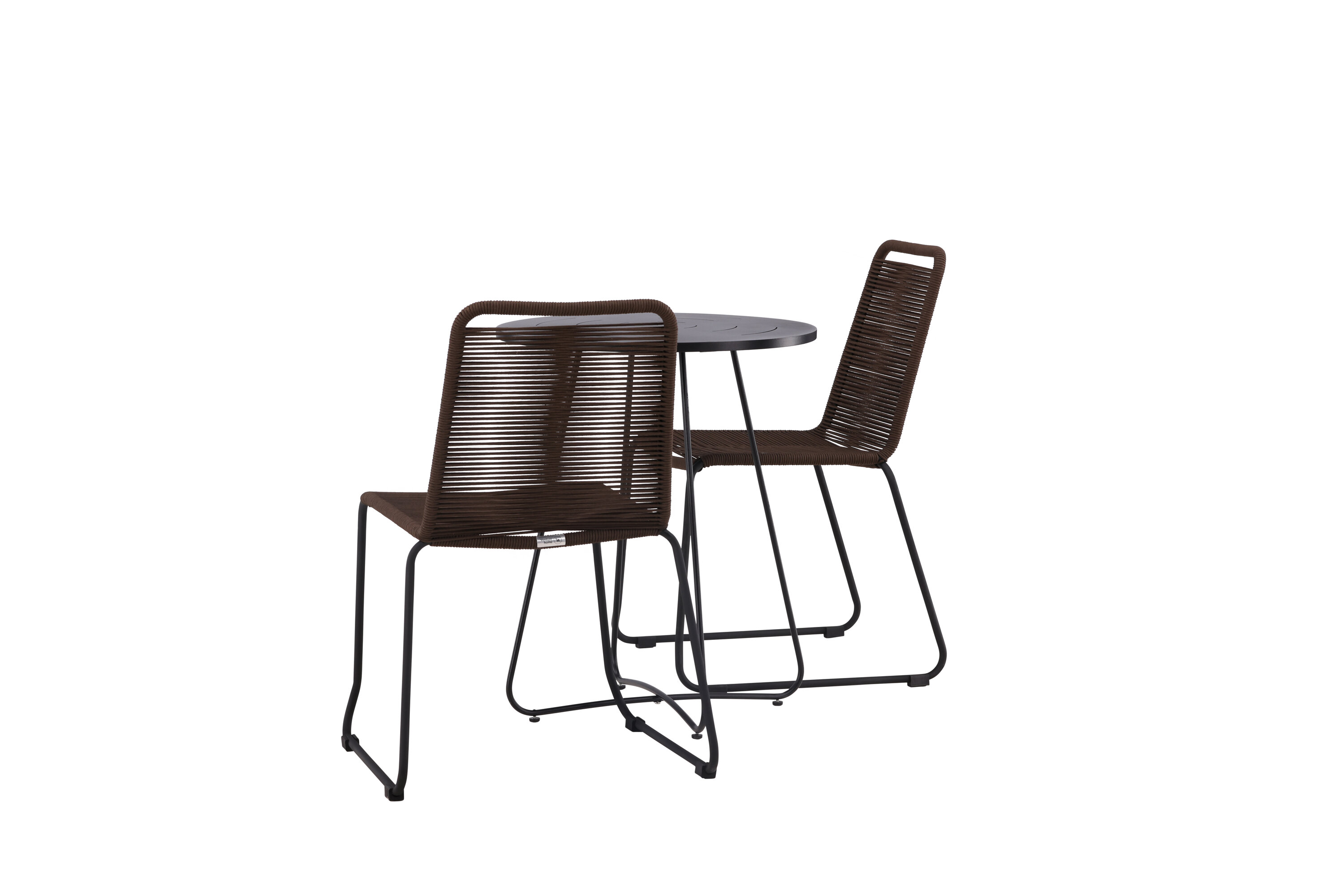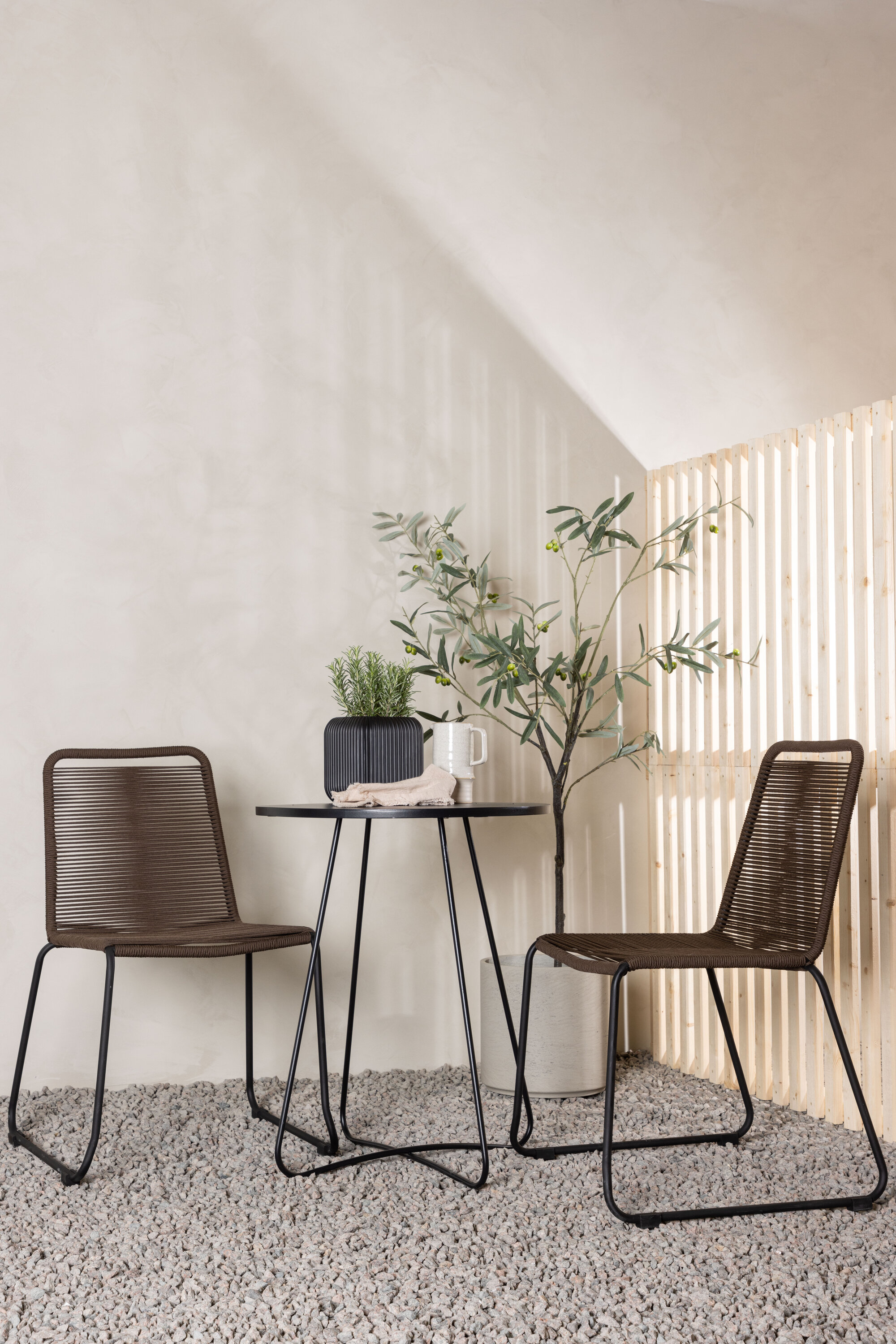 Maalähedane ja kaasaegne – ideaalne kohvikugrupp väikesele rõdule või terrassile! Bacong sarja võluv kohvikulaud on ümara plaadi ja saledate mustast terasest jalgadega. Siin on stiilne kombinatsioon 2 Lindose seeria söögitooliga. Tool on pruuni värvi vastupidavast köiest ja sobib ideaalselt välitingimustes kasutamiseks. Joo sel suvel kohvi õues ja naudi meeldivaid hetki! Laua läbimõõt: 60 cm.