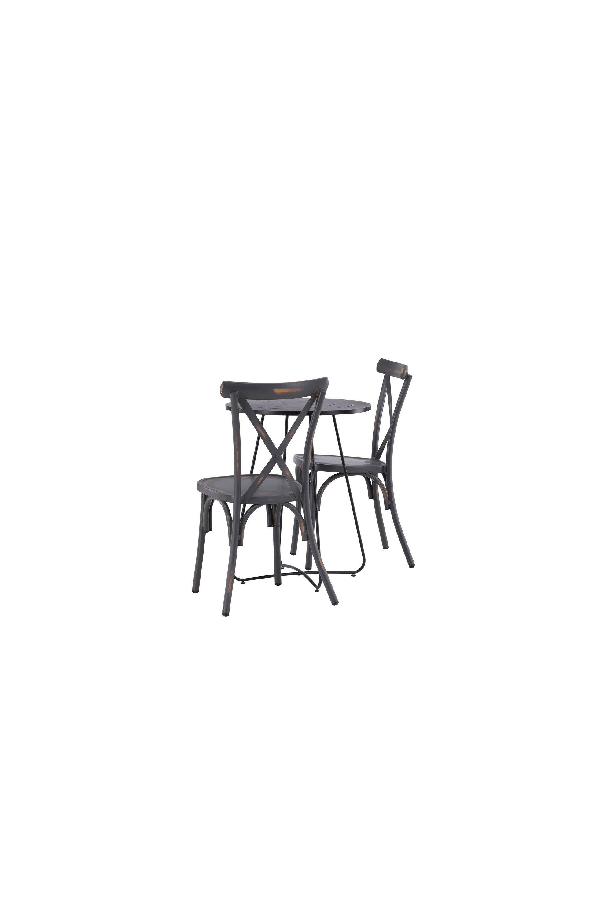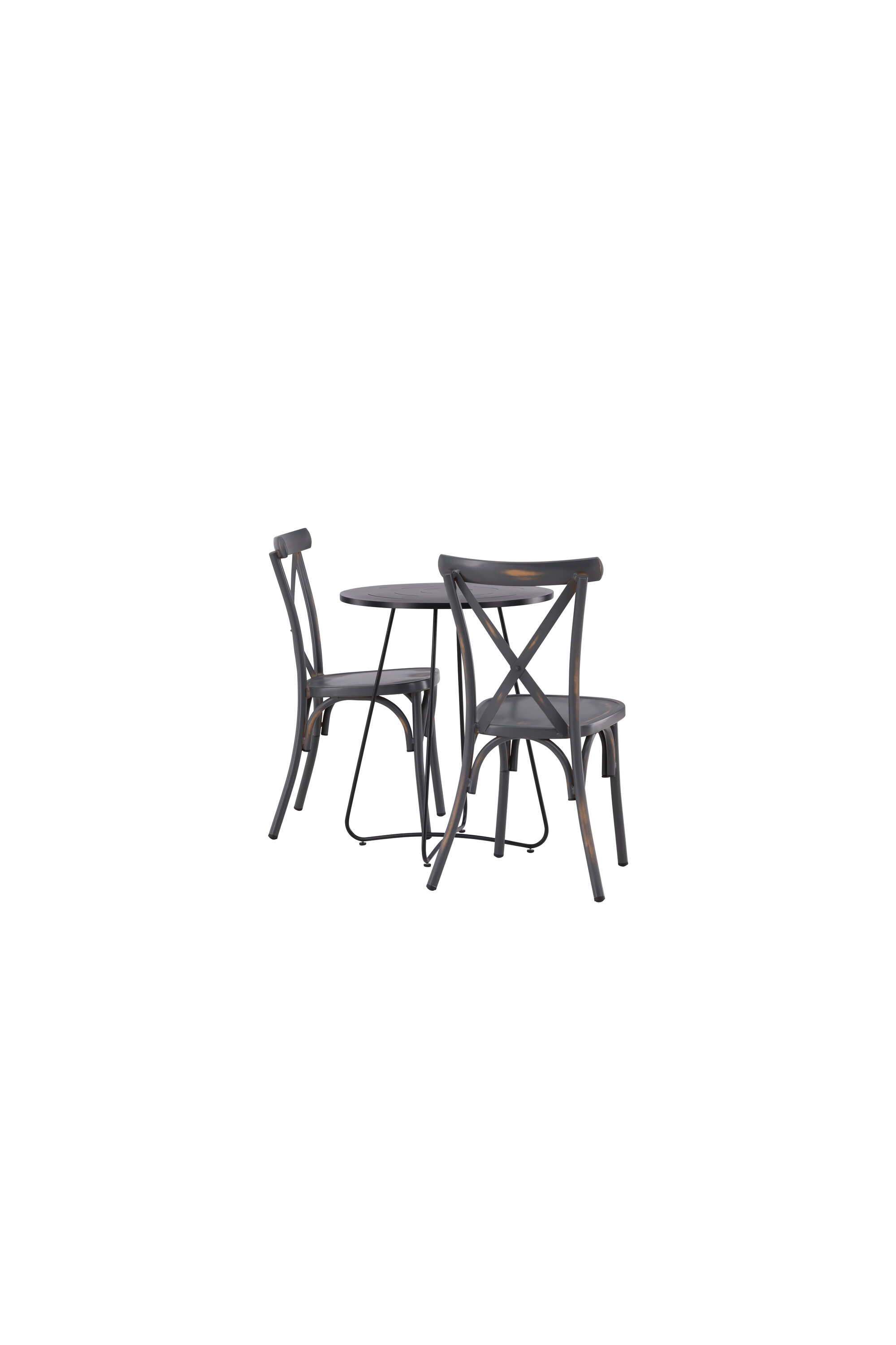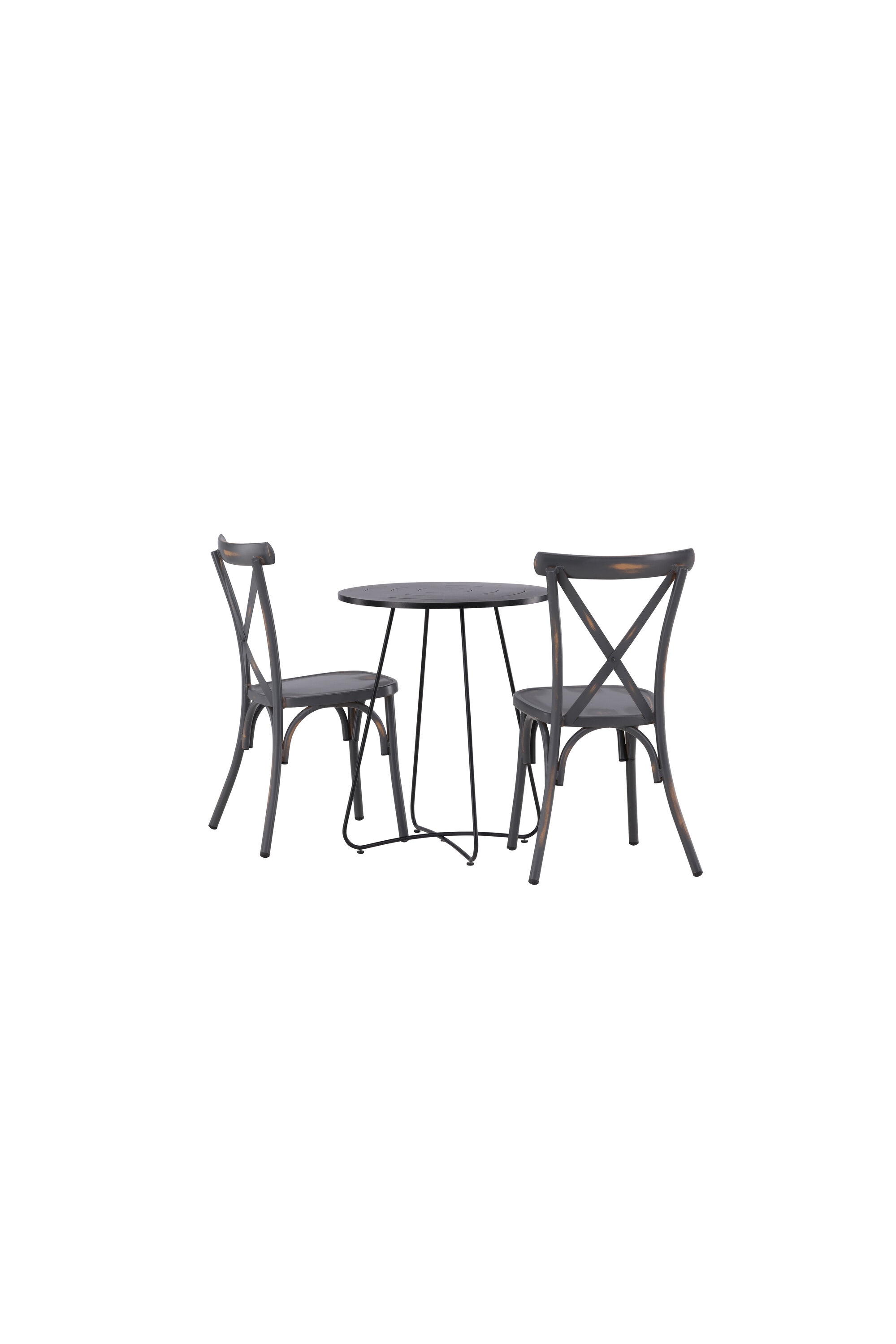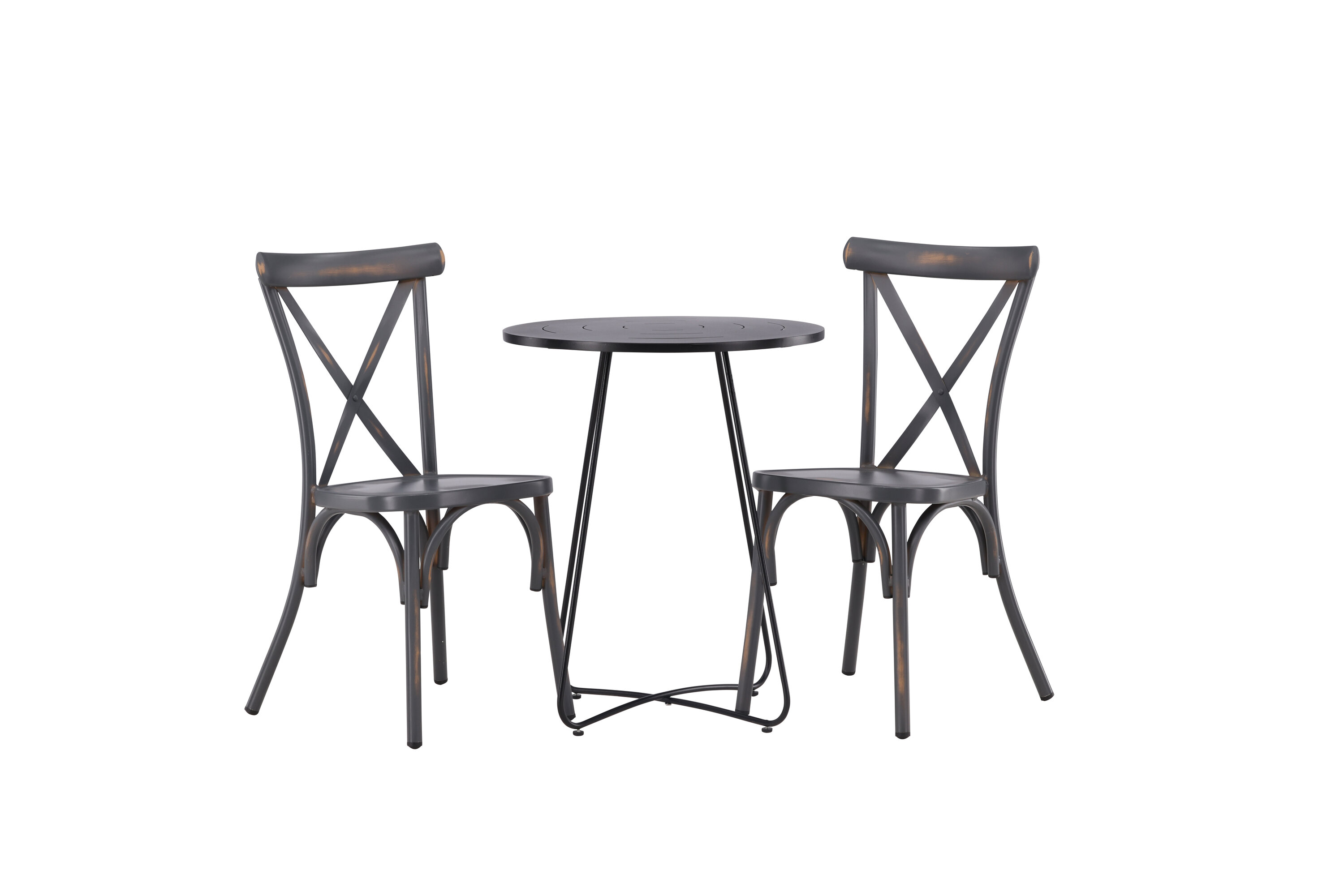 Imeline kokkusobiv söögigrupp, mis sobib suurepäraselt kõikideks selle suve kohvipausideks! Korralikul Bacongi seeria kohvikulaual on ümmargune plaat ja saledad mustast terasest jalad. Siin ideaalses kombinatsioonis 2 söögitooliga sarjast Tablas. Toolil on ristatud seljatugi ja kergelt laienevad jalad, mis tagavad ühtlase mulje. Kõik koos valmistatud tahmast musta värvi alumiiniumist. Olge valmis silmapaistvaks ööeluks! Laua läbimõõt: 60 cm.