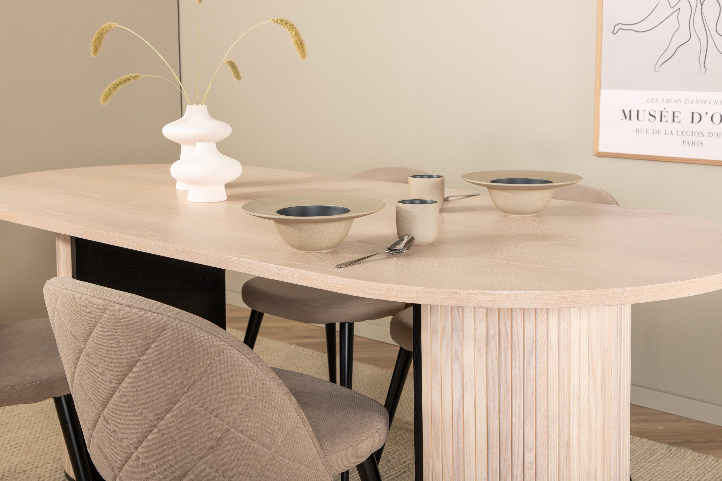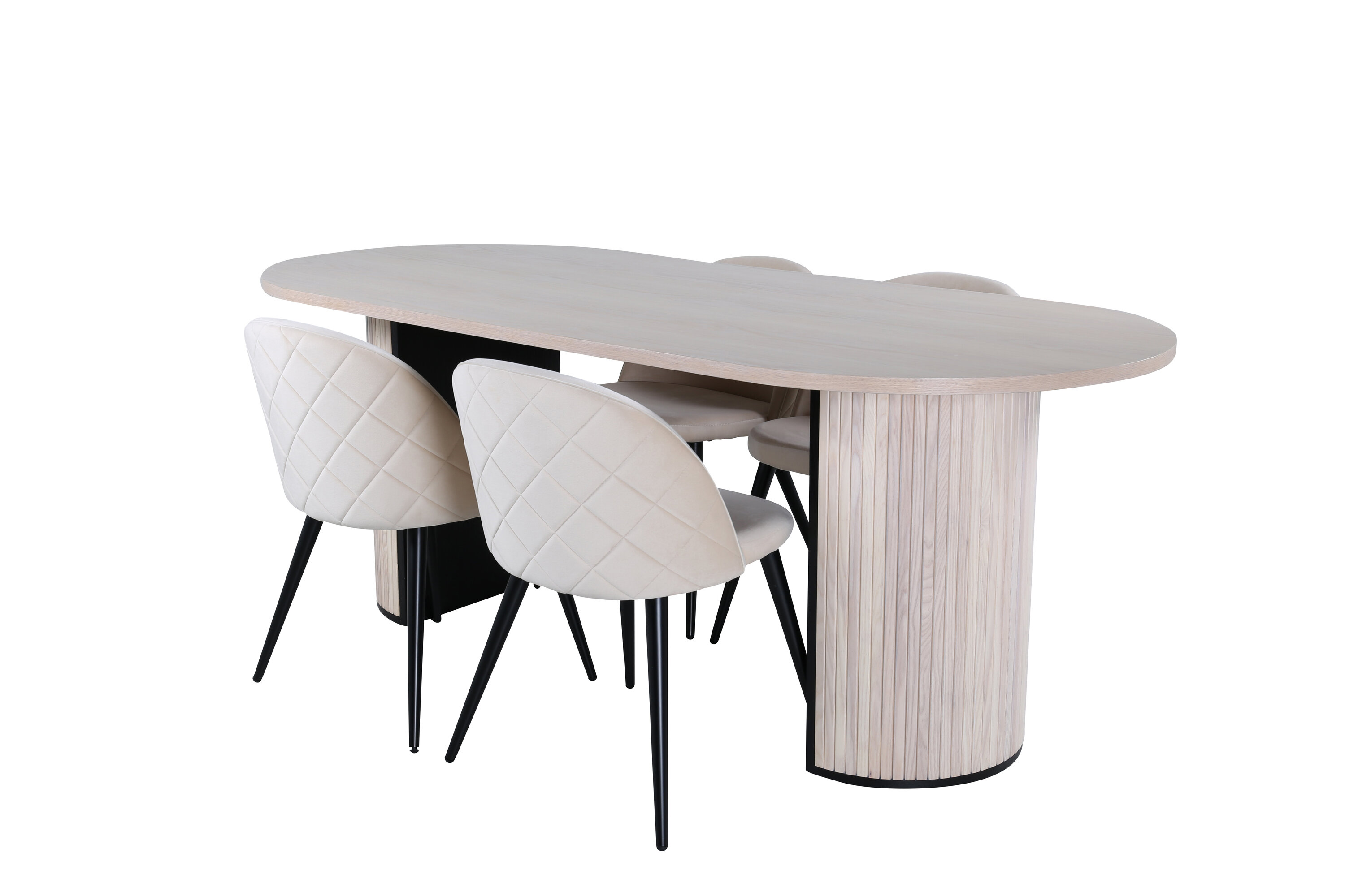 Moodne toidugrupp, mis tõmbab pilke! Krohvitud valget värvi ovaalne söögilaud Bianca on maitsva disainiga, millel on spooniga luuvalgest MDF-plaadist lauaplaat ning vastupidava ribilise disainiga puidust ja MDF-st raam, mis jätab ühtlase mulje. Laua mõõdud: pikkus: 200 cm, laius: 90 cm, kõrgus: 75 cm. Siin on ideaalne kombinatsioon nelja meie populaarse Velvet söögitooliga. Toolid keskenduvad stiilile ja mugavusele – beežist sametkangast mugav iste ja rauast laienevad toolijalad. Tooli mõõdud: kõrgus: 76,5 cm, istme kõrgus: 46,5 cm, laius: 50 cm, sügavus: 57 cm. Las söögilauas veedetud aeg saab üheks tänase päeva tipphetkeks!