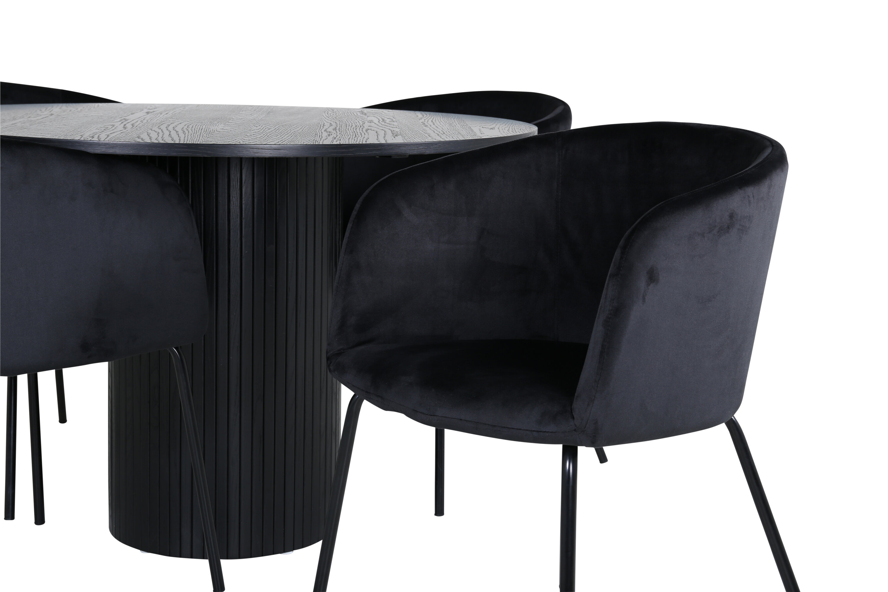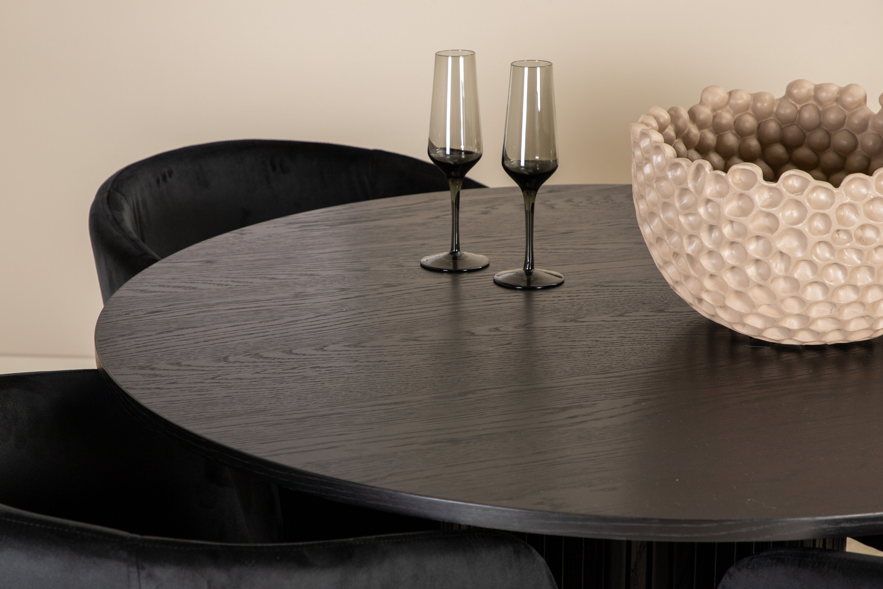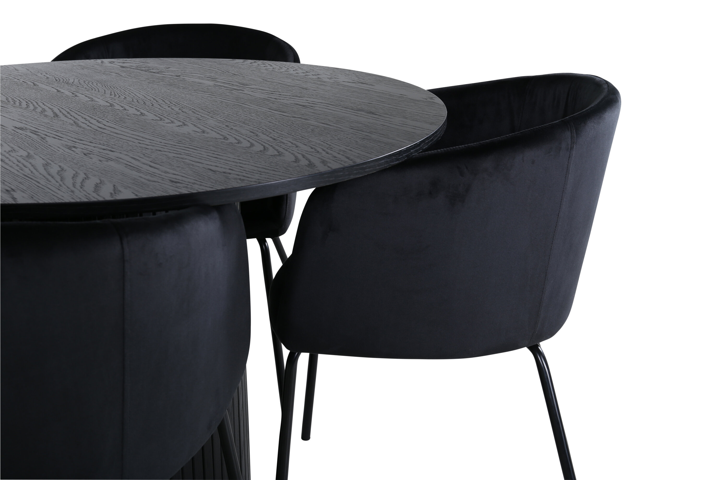 Moodne, stiilne ja pompoosne – loo luksuslik pilgupüüdja kodu südamesse! Meie ühtlaselt musta värvi ümmargusel söögilaual Bianca on trendikas disain koos MDF-plaadiga lauaplaadiga ja vastupidava soonikuga raamiga, mis jätab püsiva mulje. Siin on täiuslik kombinatsioon 4 luksusliku disainiga Berit söögitooliga. Toolil on pompoosne mustjas sametist disain ja toolijalad on stiilselt kitsad mustast rauast. Sisustage kutsuvalt ja looge oma koju stiilne välimus!