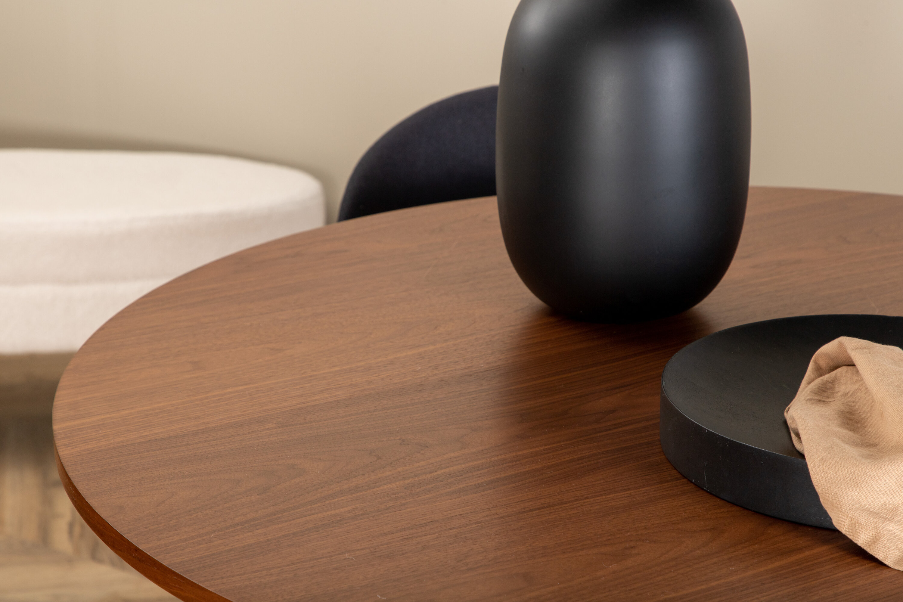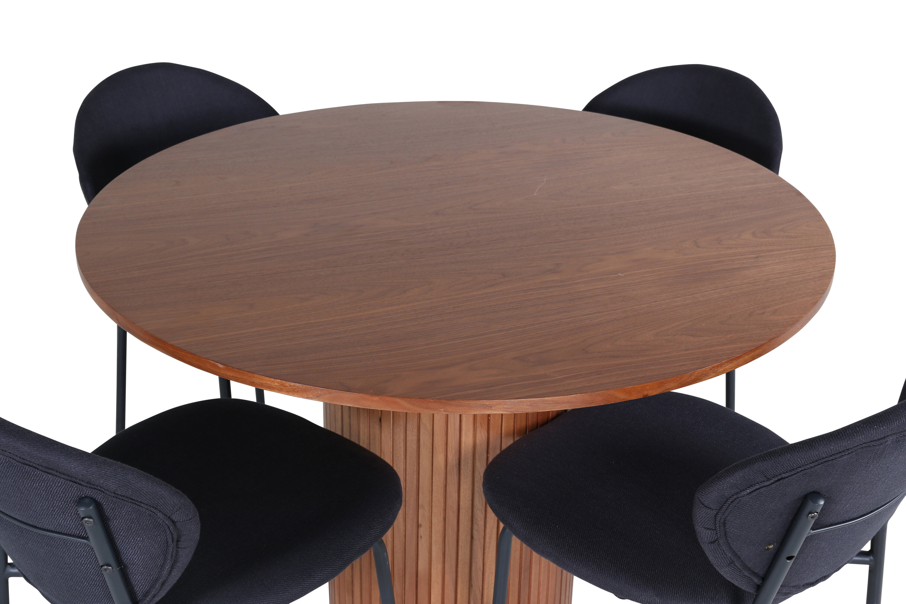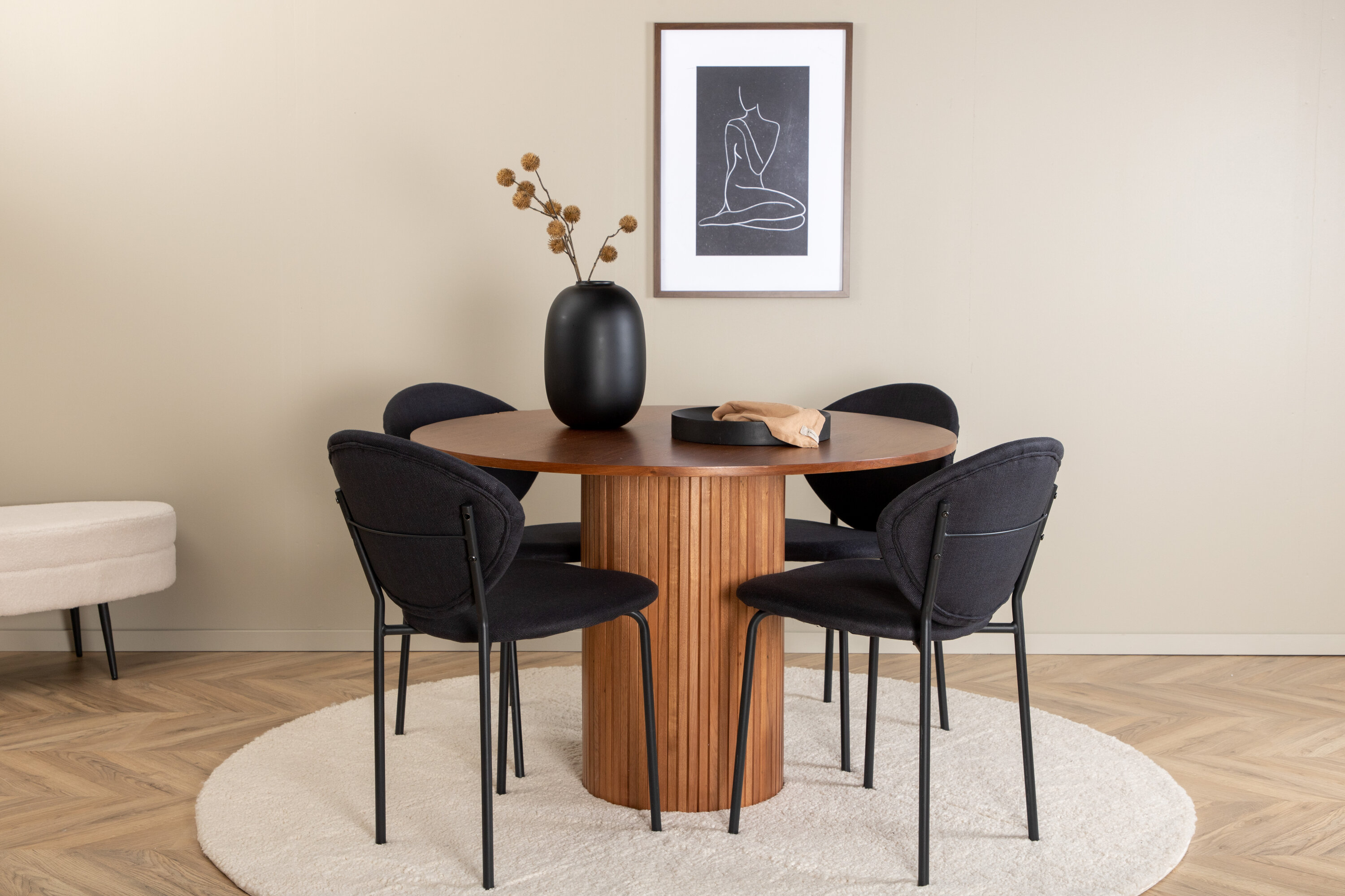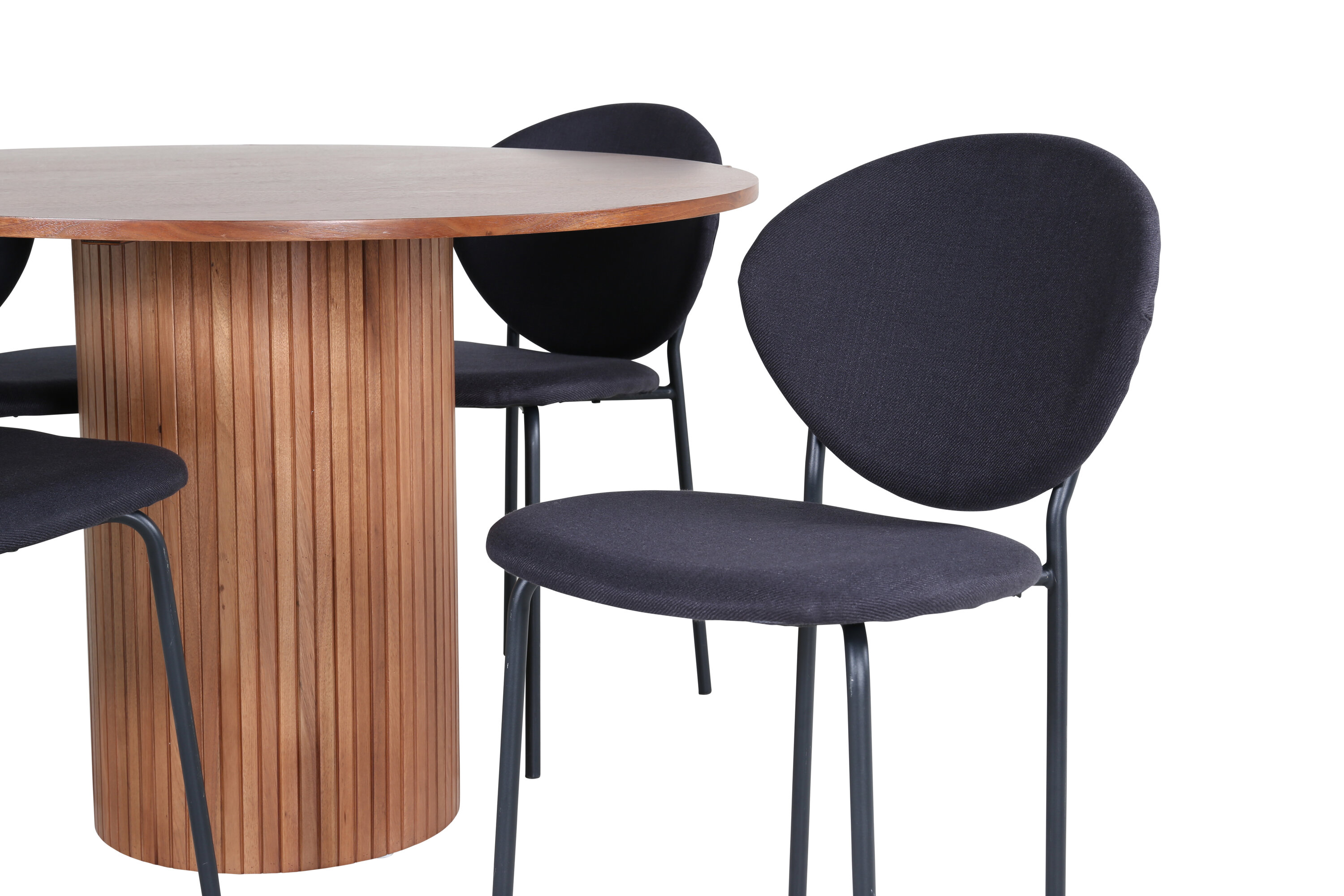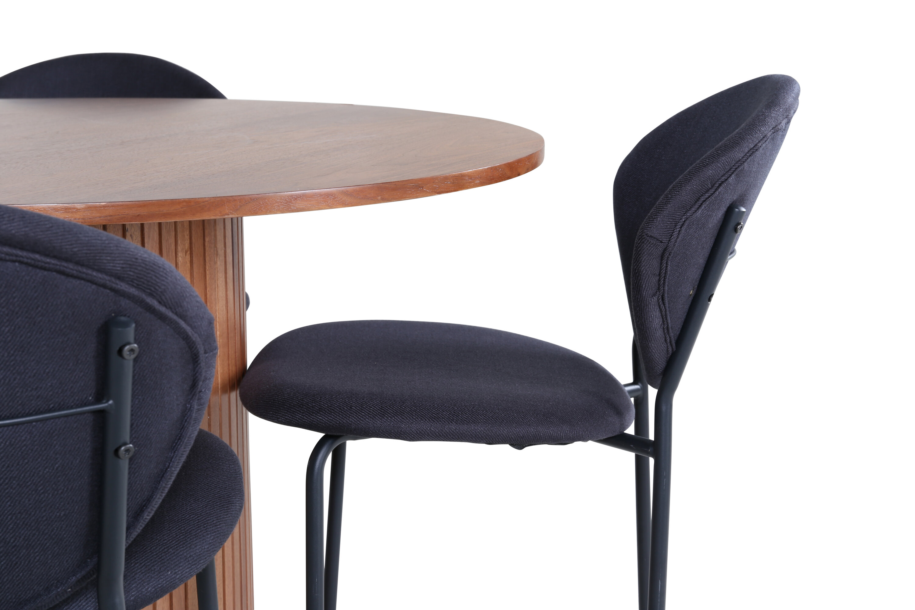 Moodsa ja stiilse disainiga toidugrupp! Meie trendikas pähklivärvides ovaalne söögilaud Bianca sobib ideaalselt nii elutuppa kui ka avarasse kööki. Lauaplaat on pähklivärvi MDF spooniga ja korpus on vastupidav pähklipuust, samuti musta värvi puidust ja MDF-st soonikuga, mis jätab ühtlase mulje. Siin koos 4 Vault ovaalse disainiga söögitooliga. Tooli jalad on metallist ja iste mustast polüestrist. Sisustus kuldse serva jaoks igapäevaelus – koju tulles peaks olema mõnus tunne!