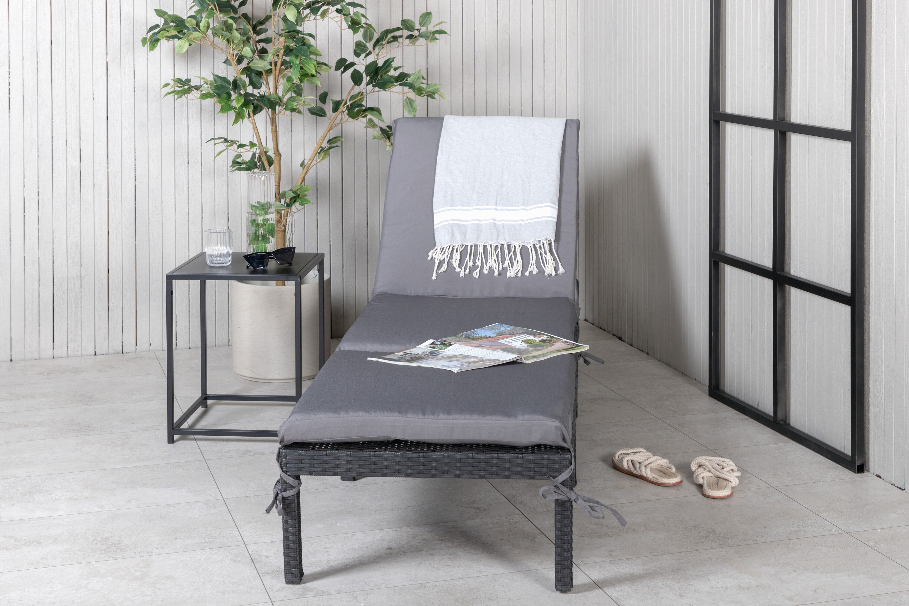 Stiilne ja mugav mustast kunstrotangist lamamistool. Tooli seljatugi on reguleeritav, kaasas on hall solaariumipadi. Naudi kõiki suvehetki – korralik ja mugav!