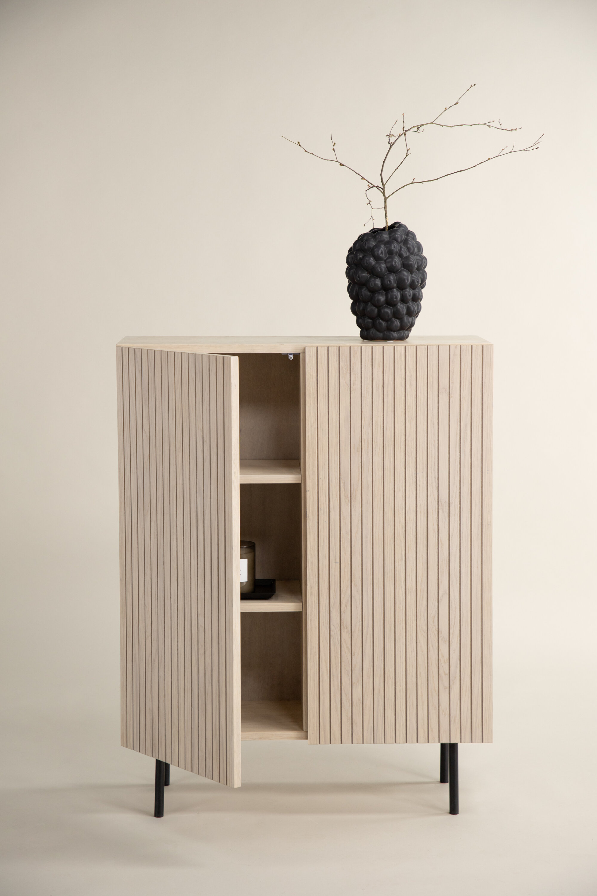 Sama stiilne kui nutikas hoiulahendus teie koju! See Björkön-sarja kõrgreljeefne kapp on saadaval erinevates värvides ja suurustes ning ronib stiilse disainiga kiiresti trendinimekirjadesse. Kapil on kaks soonikuga pilu ja kolm riiulit peidetud hoiustamiseks. Valmistatud valgest krohvitud spoonist ja tõstetud mustast terasest kitsaste jalgadega. Aseta kaunite kaunistuste ja küünlajalgadega abilauaks või peidetud vitriinkapiks – ainult kujutlusvõime seab piirid!