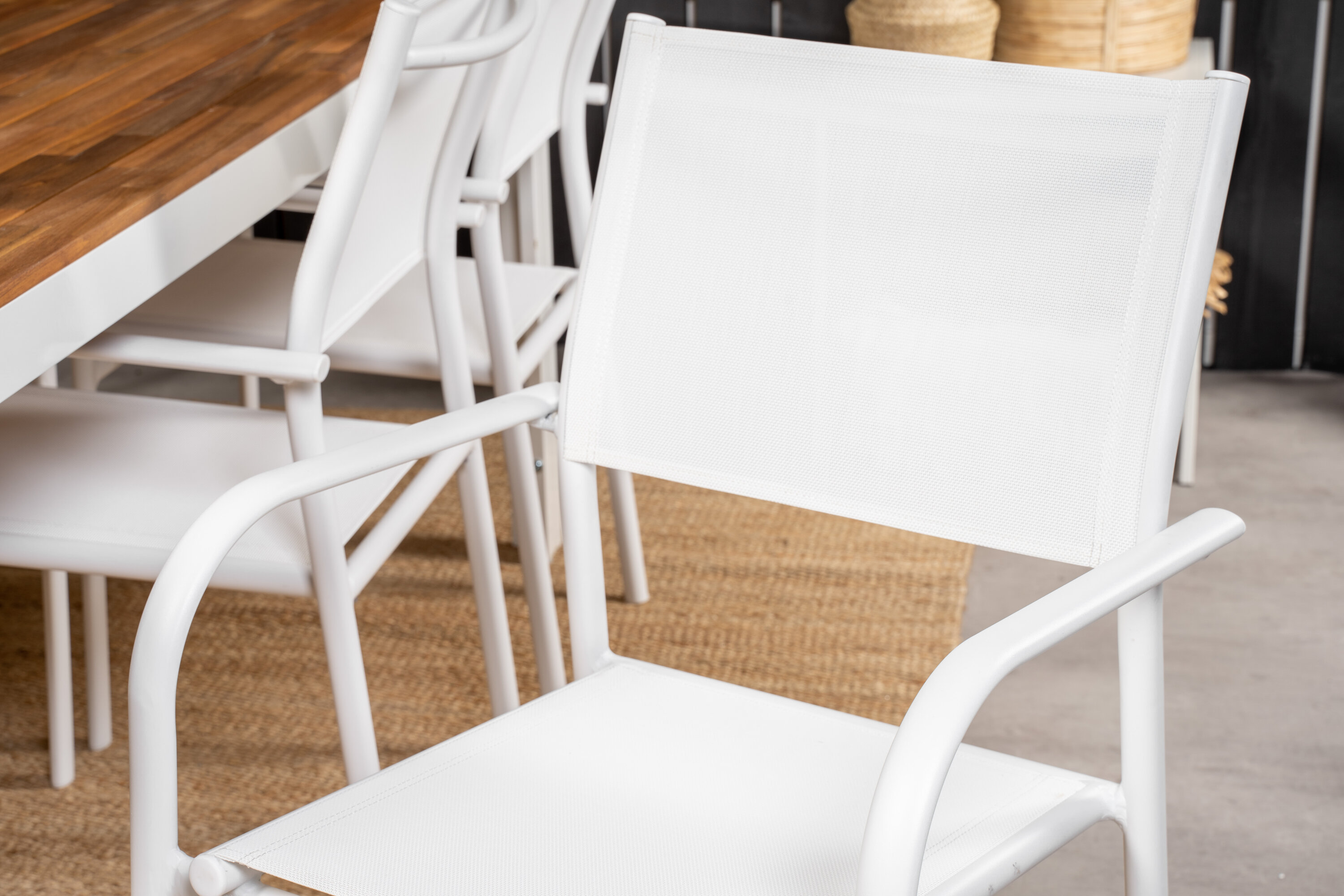 Valgest alumiiniumkonstruktsioonist Boi söögilaud koos meie virnastatavate Santorini söögitoolidega. Tee ruumi pikkadeks ja mugavateks suvisteks õhtusöökideks!