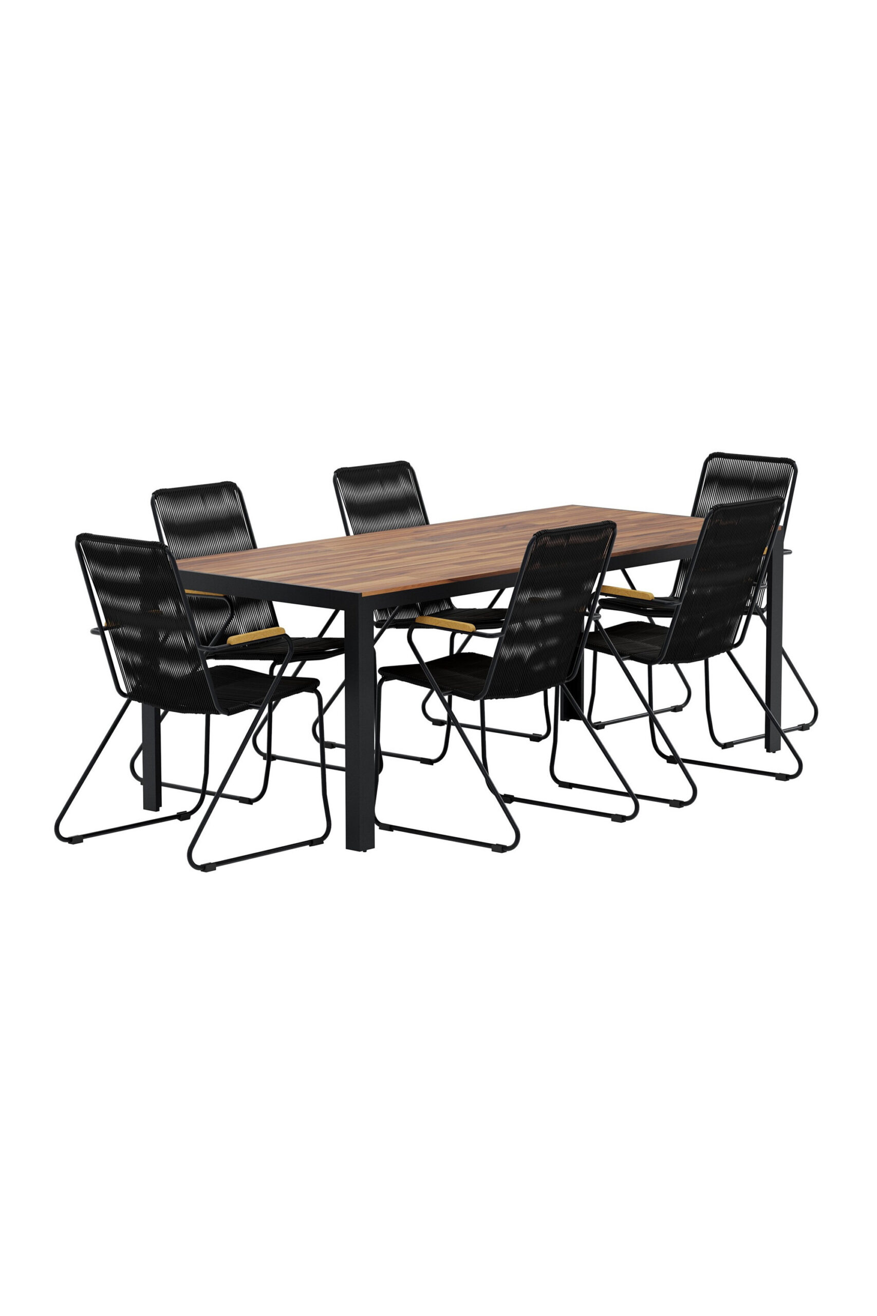Looge Boisi söögikomplektiga kaasaegne ja stiilne väljas einestamisnurk. Trendikatel söögitoolidel on mugav disain koos tiikpuust käetugede ja musta nööriistmega, mis loovad elegantse kontrasti ja kutsuva tunde. Mugavaks hoiustamiseks on toolid ka virnastatavad. Sobiv Bois söögilaud täiendab toole suurepäraselt oma dekoratiivse akaatsiast pealse ja mustade metalljalgadega. Puhtad põhjamaised jooned annavad klassikalise ilme, mis sobib nii terrassile, terrassile kui ka aeda. Toolid ja laud moodustavad koos ajatu ja võluva söögikomplekti – ideaalne mõnusate einete ja seltskondlike hetkede jaoks õues.