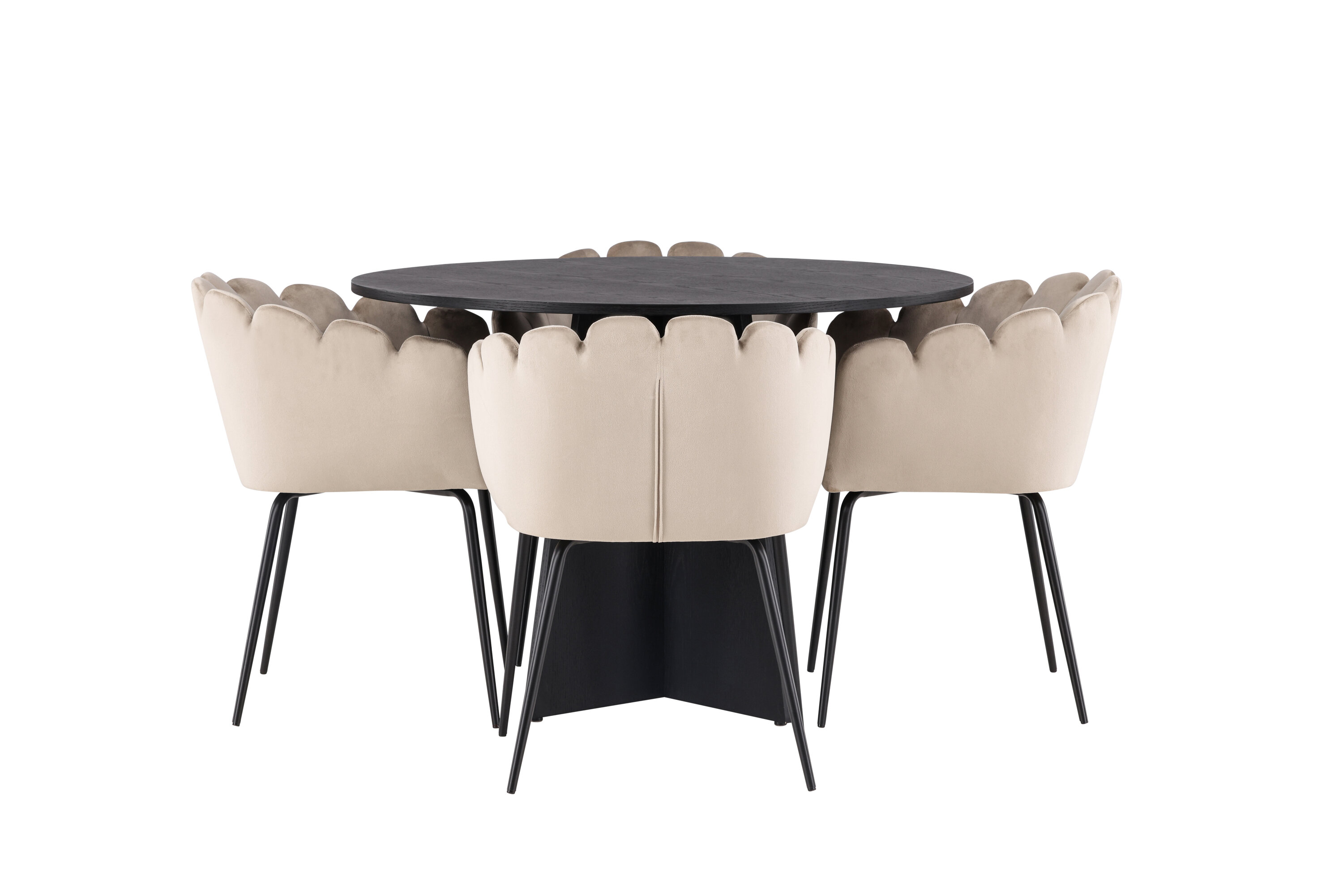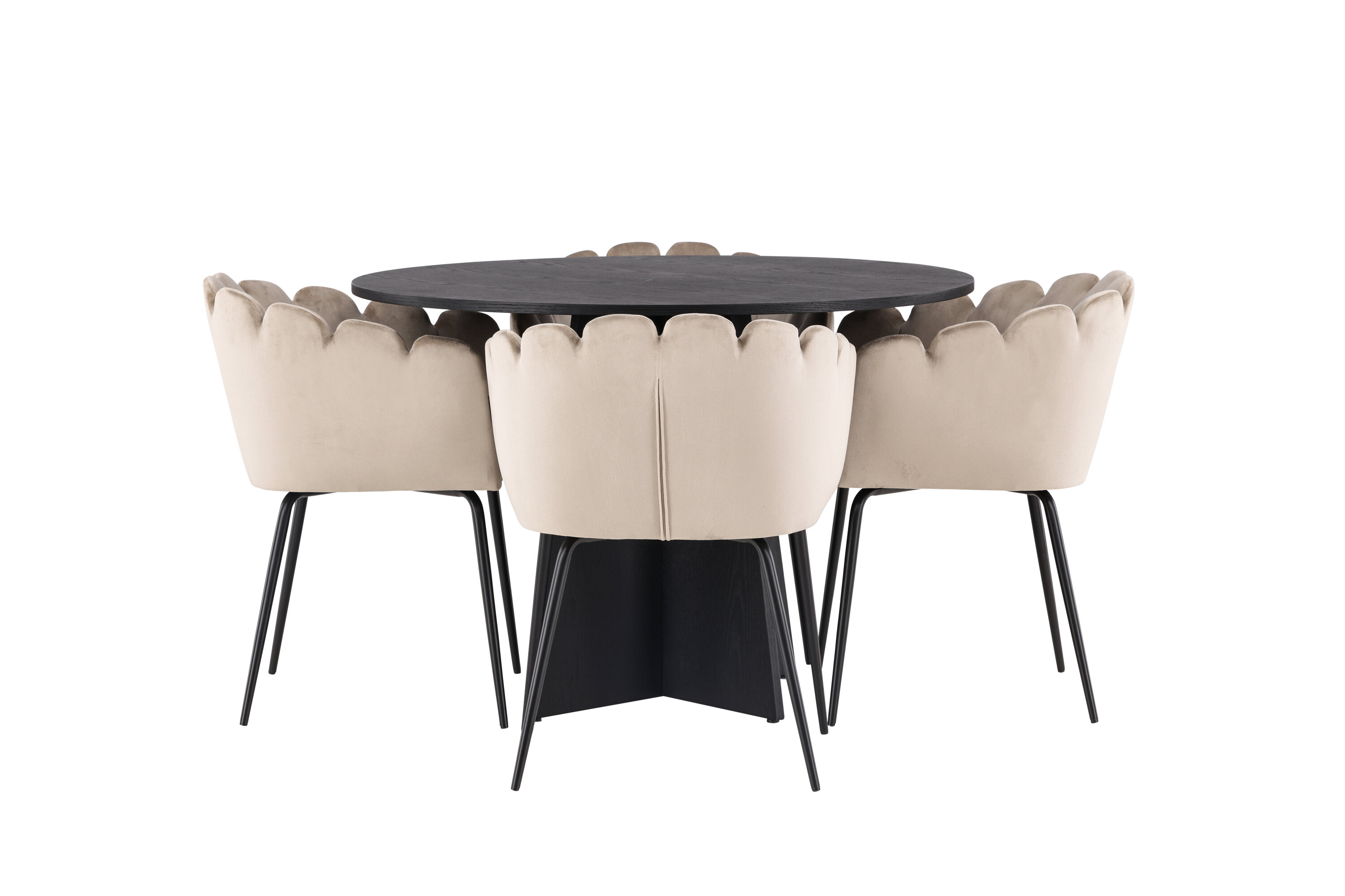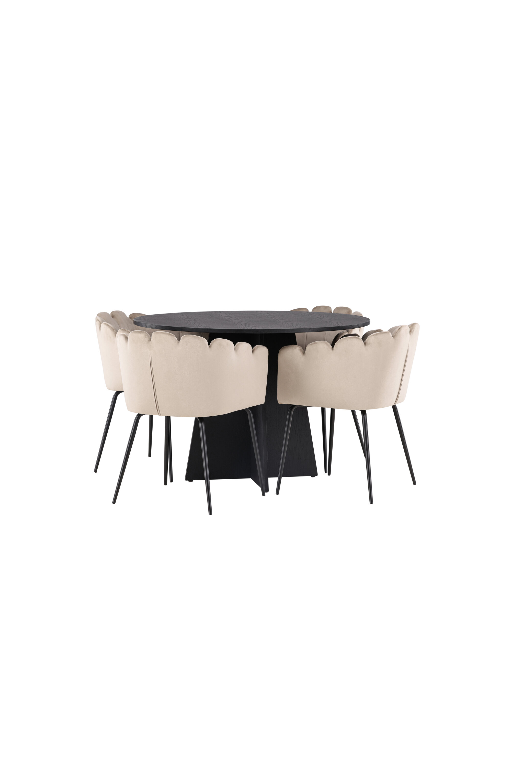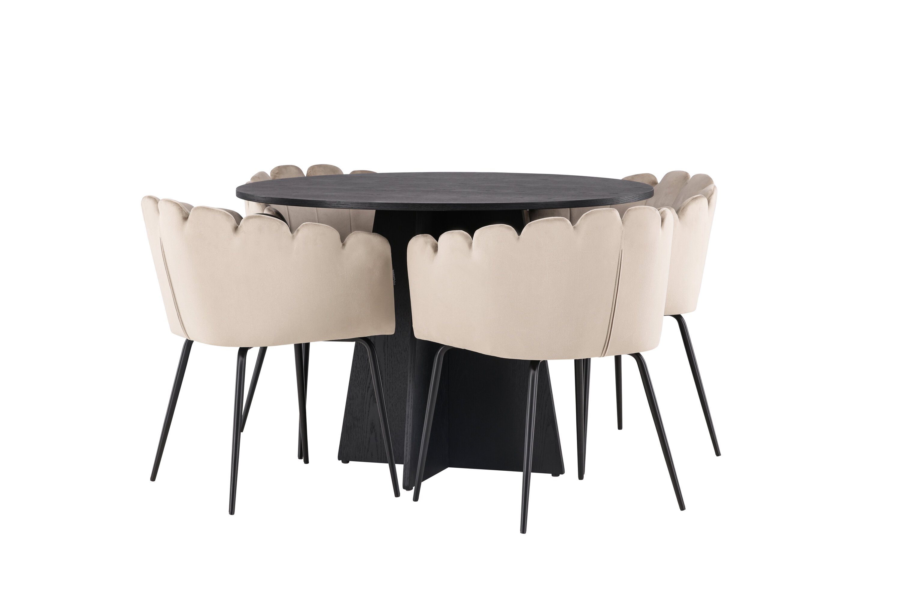 Sisusta elutuba elegantselt! Ühtlaselt mustas värvitoonis ümmargusel söögilaual Bootcut on spooniga MDF-ist lauaplaat ja disainirikas raam, mis jätab üldpildile armsa mulje. Siin koos meie populaarsete Limhamni sarja söögitoolidega. Toolil on kutsuv disain dekoratiivse kestakujulise dekoratiivõmblustega seljatoe ja maitsekalt beežist sametkangast ümara istmega. Jalad on musta pulbervärvitud metallist. Siin saab mugavalt istuda ja keegi ei riski äärepealt sattuda! Laua mõõdud: 110 cm.