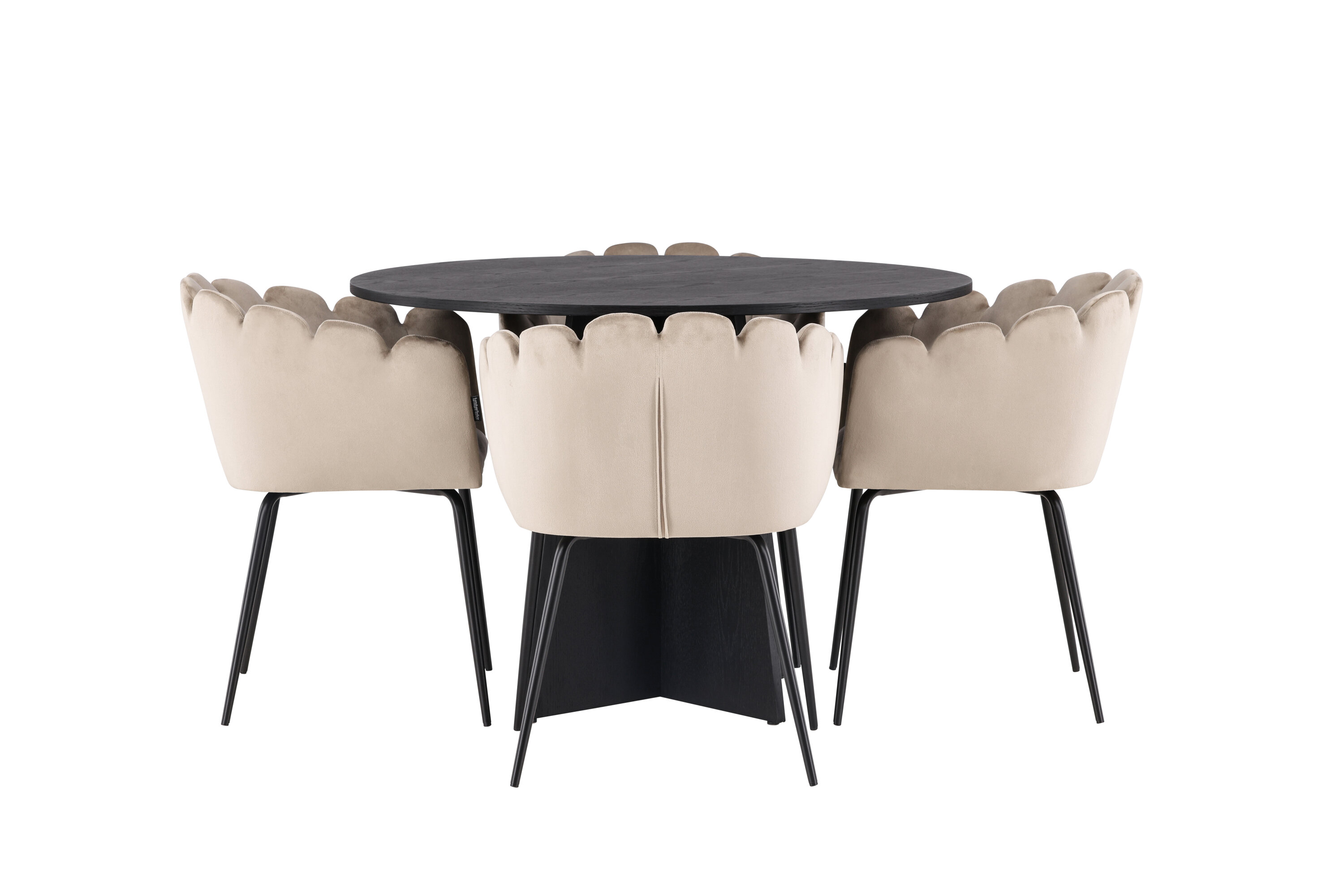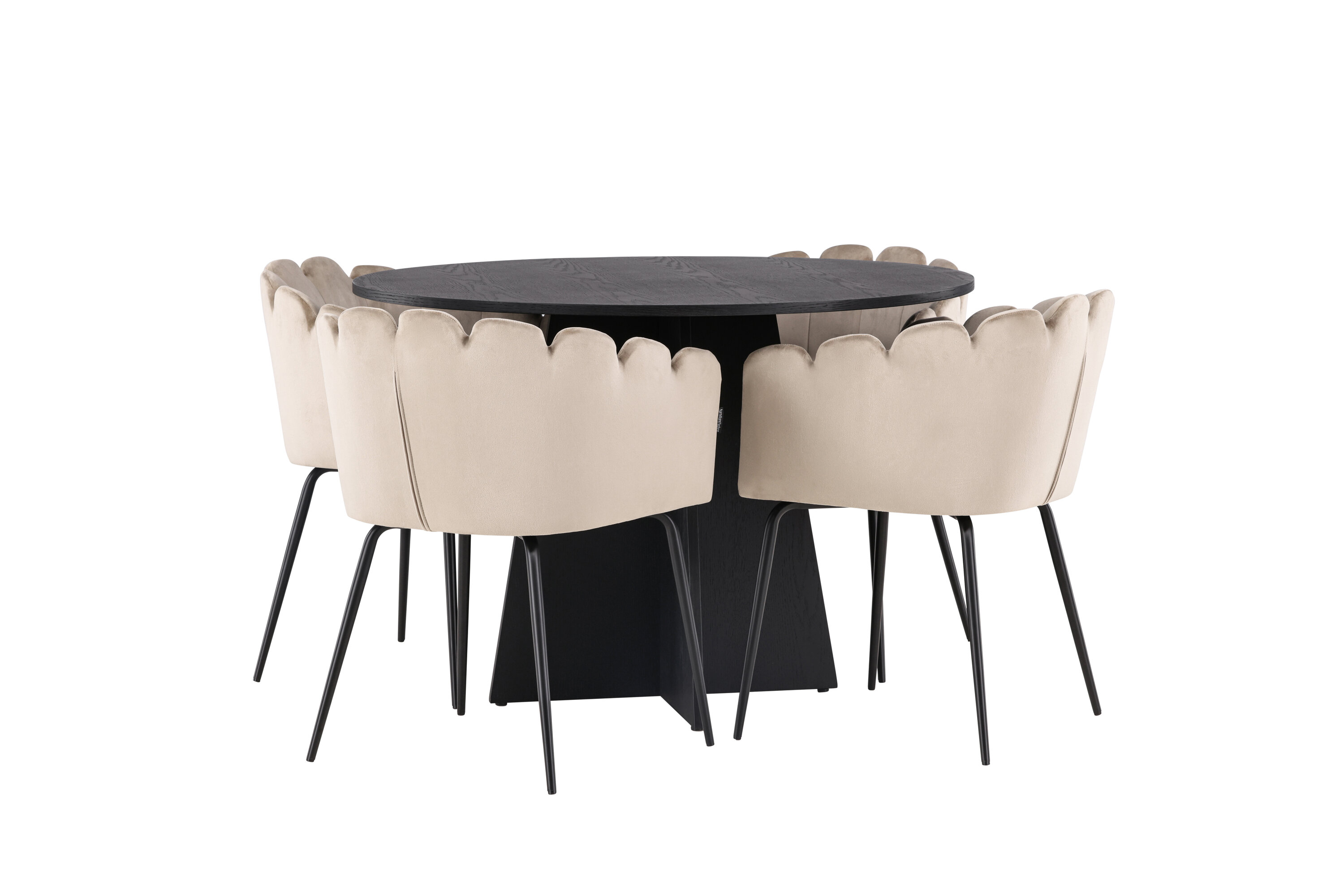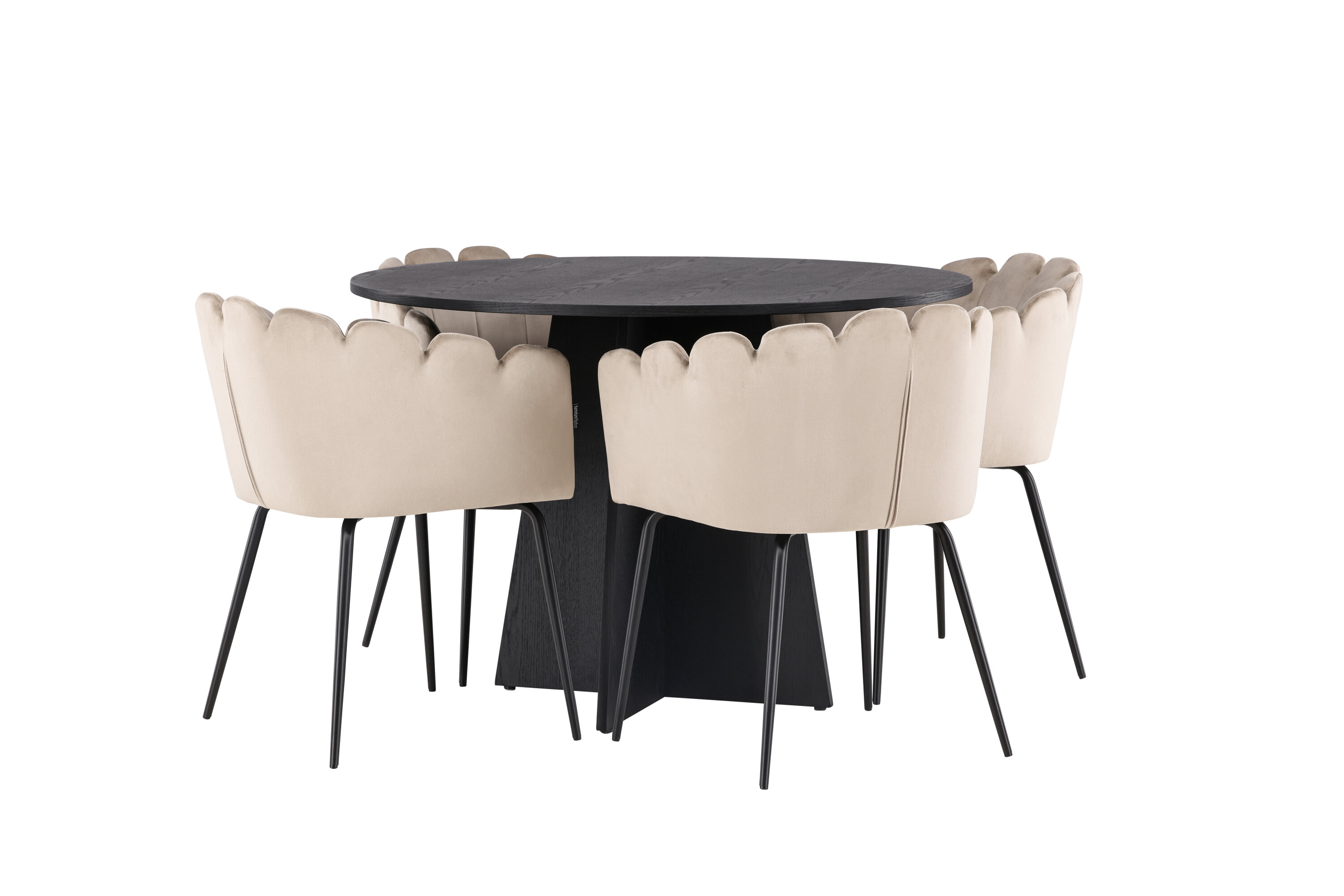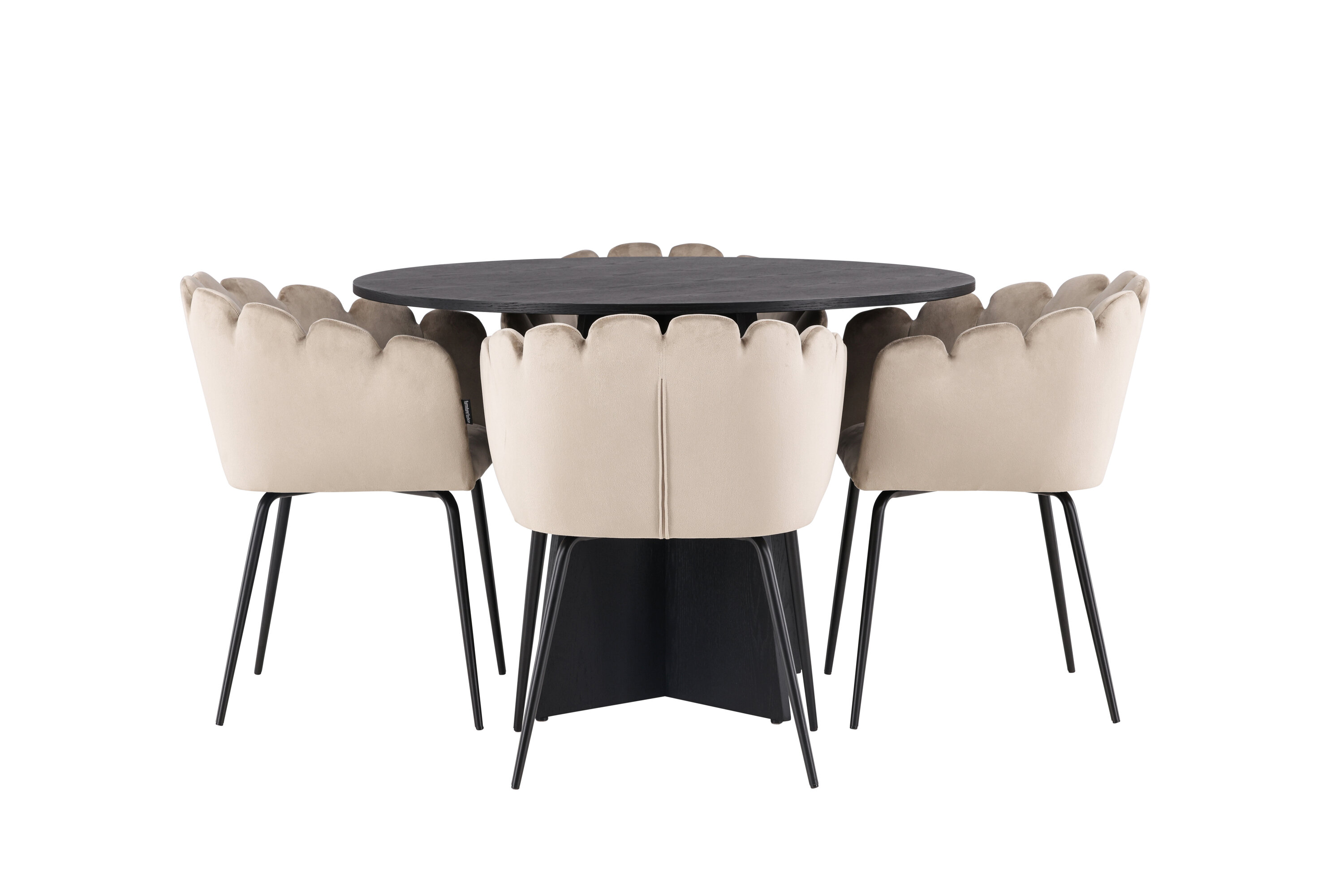 Sisusta elutuba elegantselt! Ühtlaselt mustas värvitoonis ümmargusel söögilaual Bootcut on spooniga MDF-ist lauaplaat ja disainirikas raam, mis jätab üldpildile armsa mulje. Siin koos meie populaarsete Limhamni sarja söögitoolidega. Toolil on kutsuv disain dekoratiivse kestakujulise dekoratiivõmblustega seljatoe ja maitsekalt beežist sametkangast ümara istmega. Jalad on musta pulbervärvitud metallist. Siin saab mugavalt istuda ja keegi ei riski äärepealt sattuda! Laua mõõdud: 110 cm.