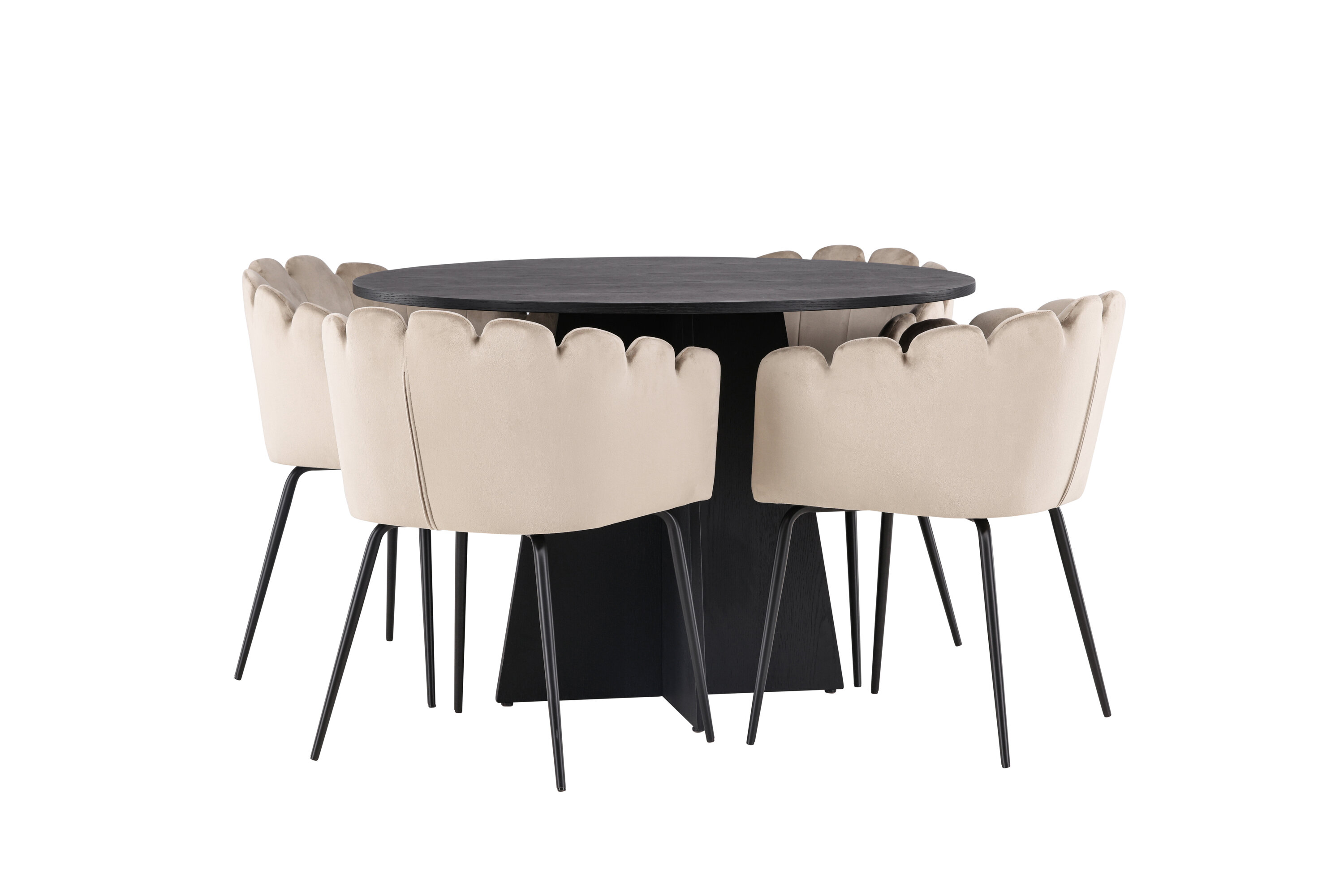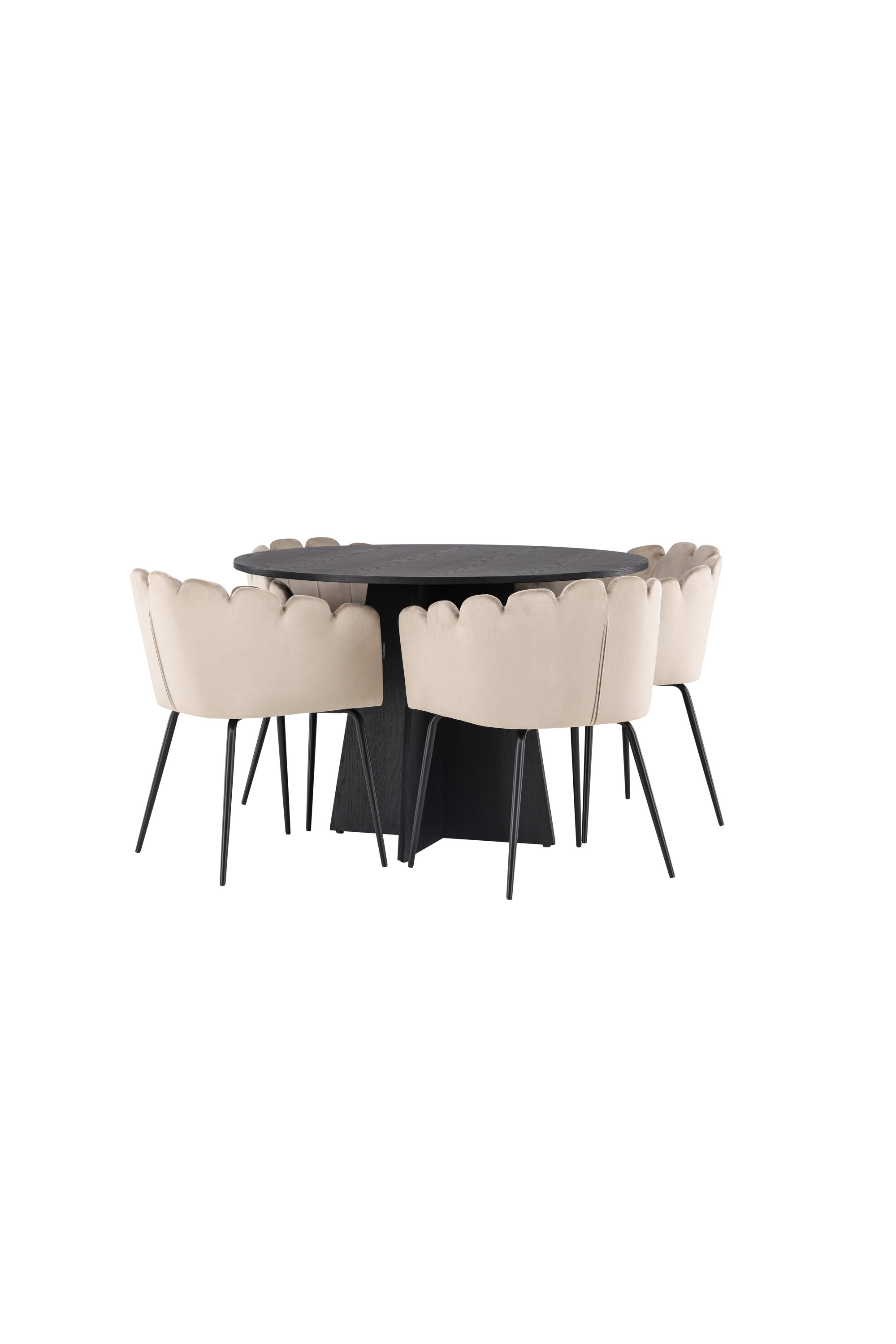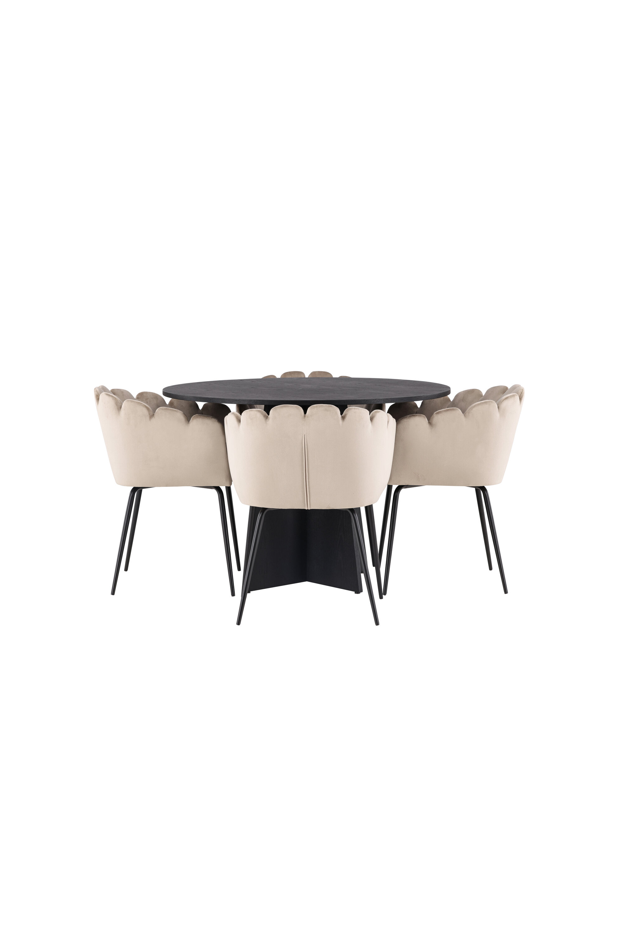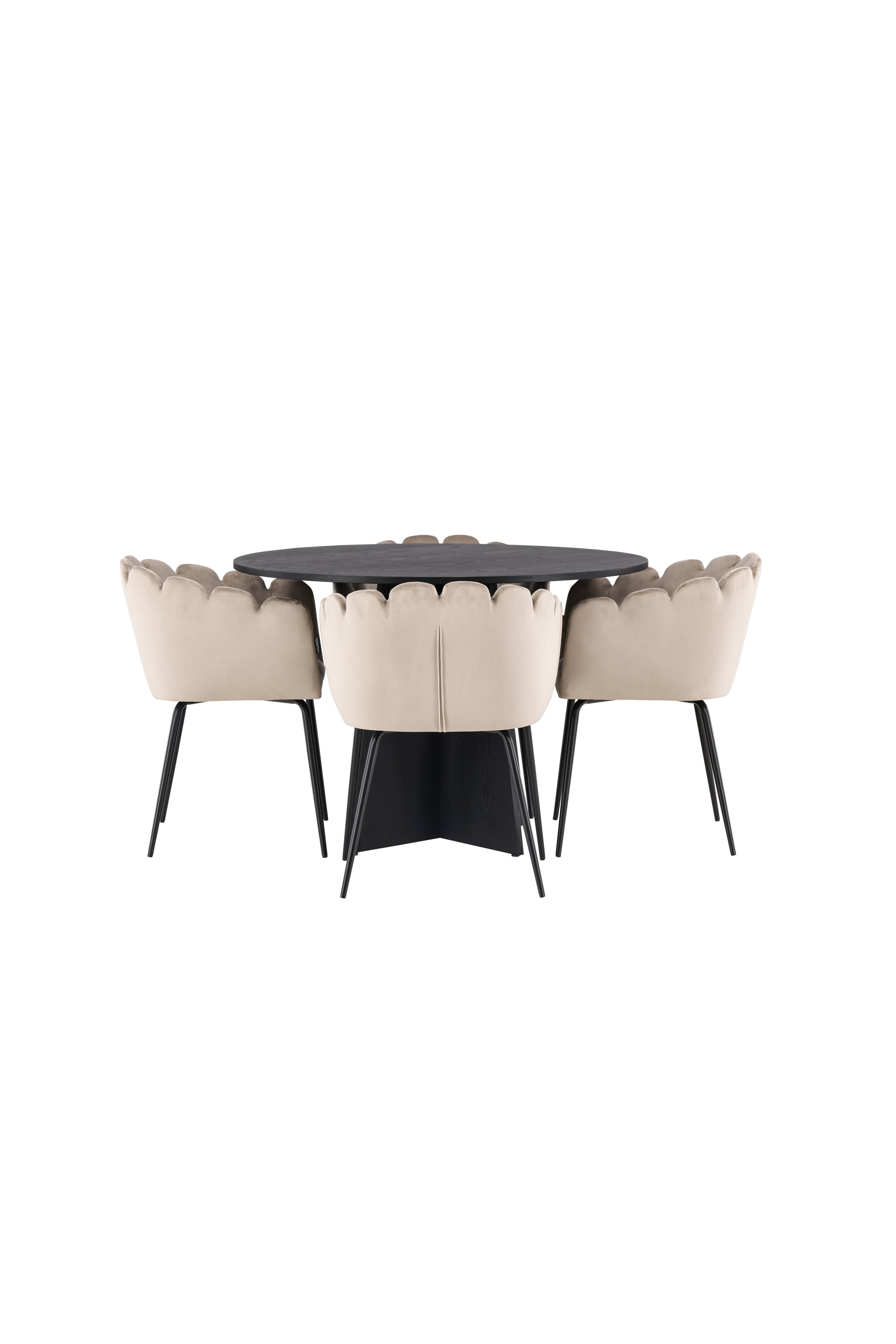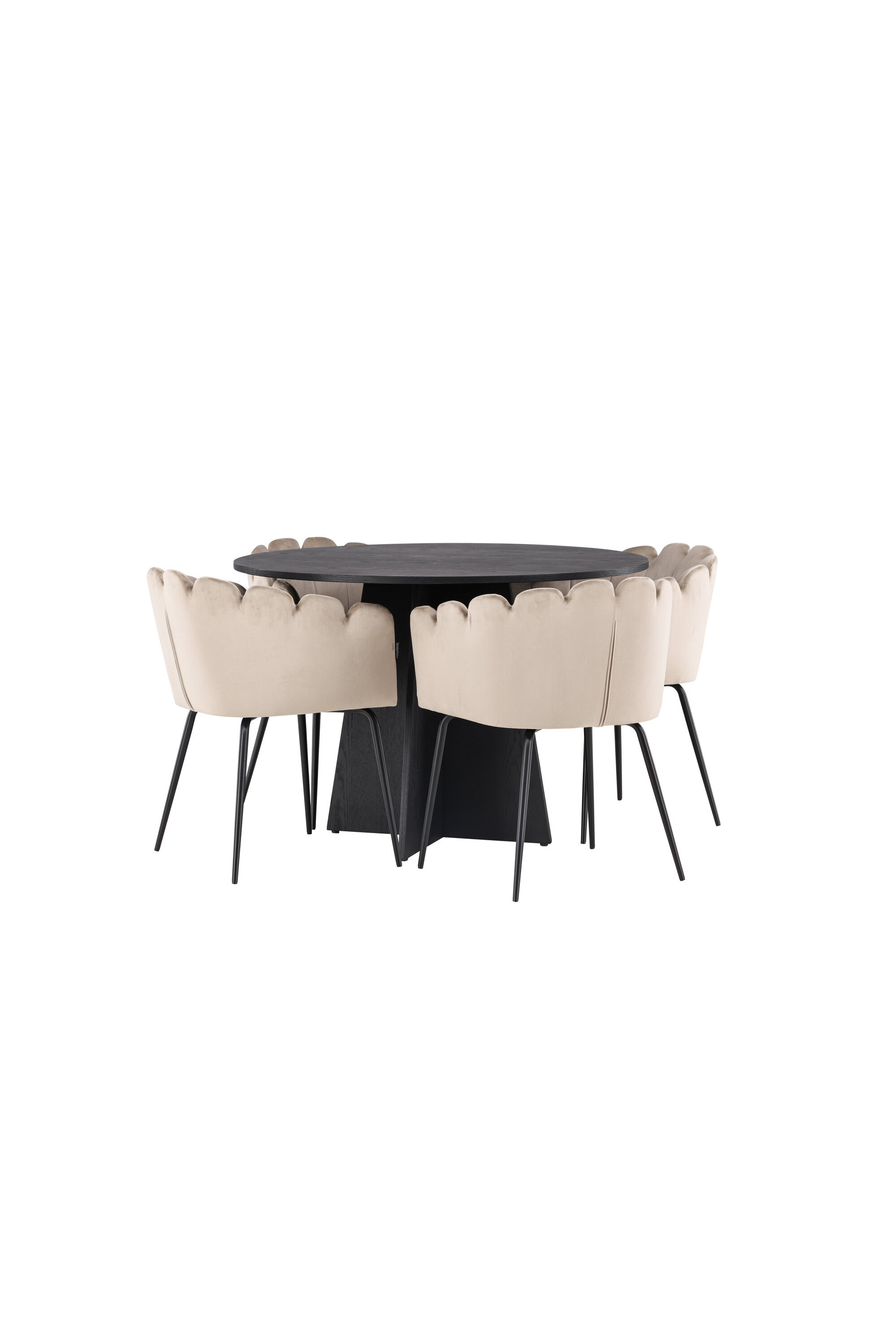 Sisusta elutuba elegantselt! Ühtlaselt mustas värvitoonis ümmargusel söögilaual Bootcut on spooniga MDF-ist lauaplaat ja disainirikas raam, mis jätab üldpildile armsa mulje. Siin koos meie populaarsete Limhamni sarja söögitoolidega. Toolil on kutsuv disain dekoratiivse kestakujulise dekoratiivõmblustega seljatoe ja maitsekalt beežist sametkangast ümara istmega. Jalad on musta pulbervärvitud metallist. Siin saab mugavalt istuda ja keegi ei riski äärepealt sattuda! Laua mõõdud: 110 cm.