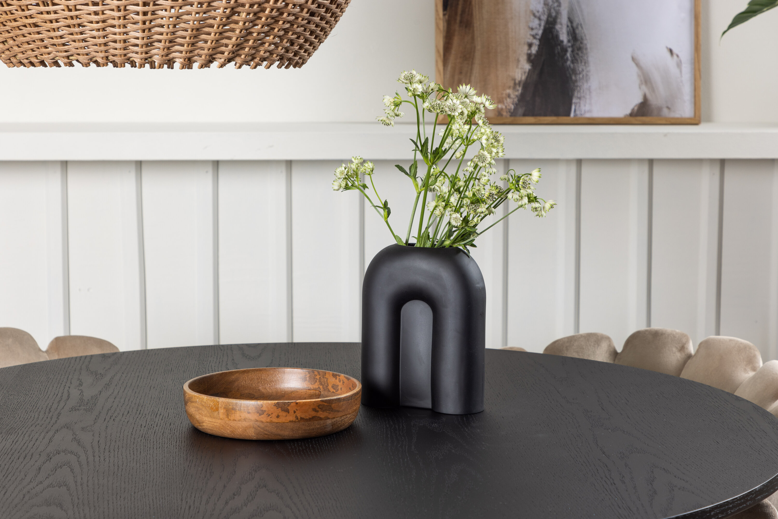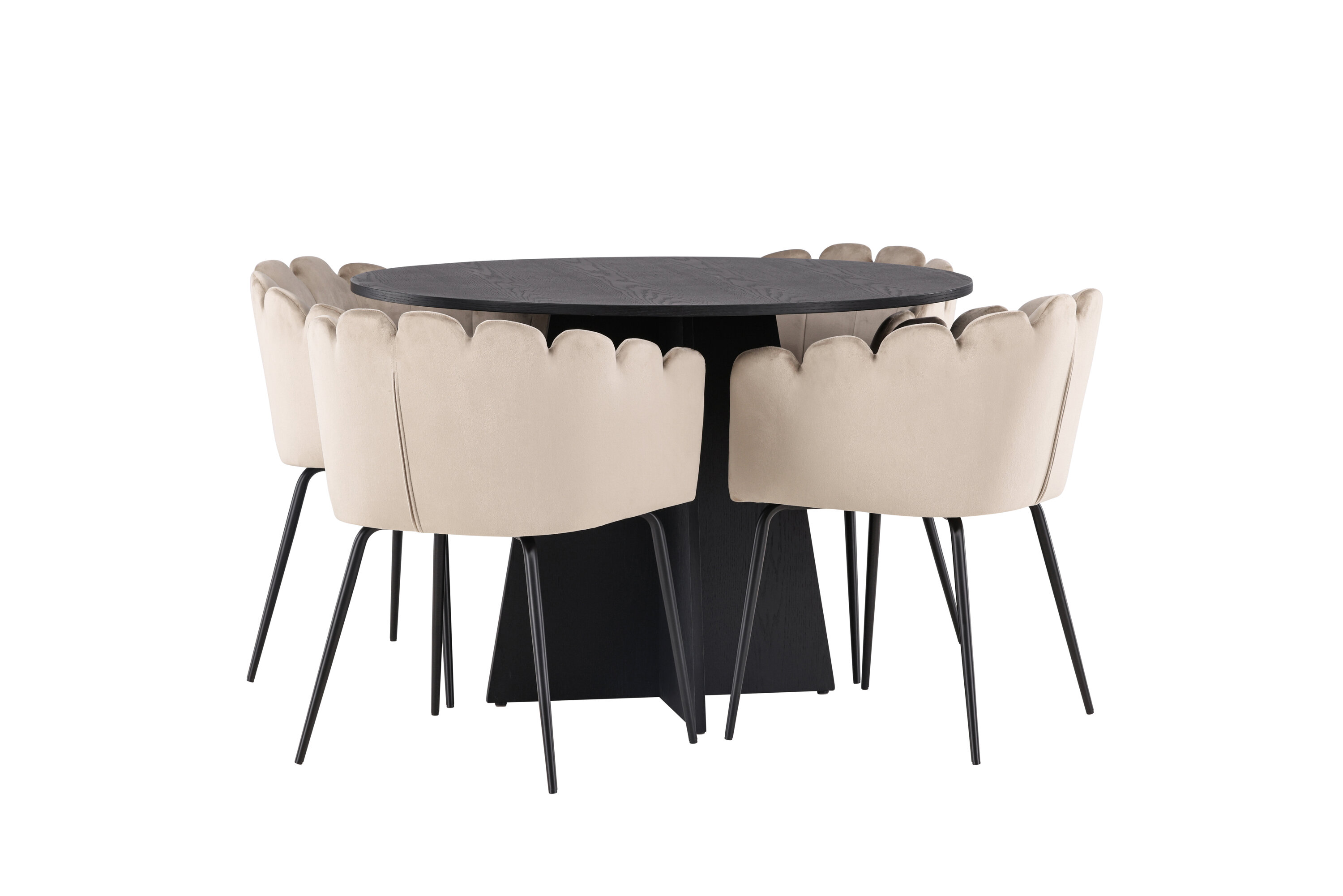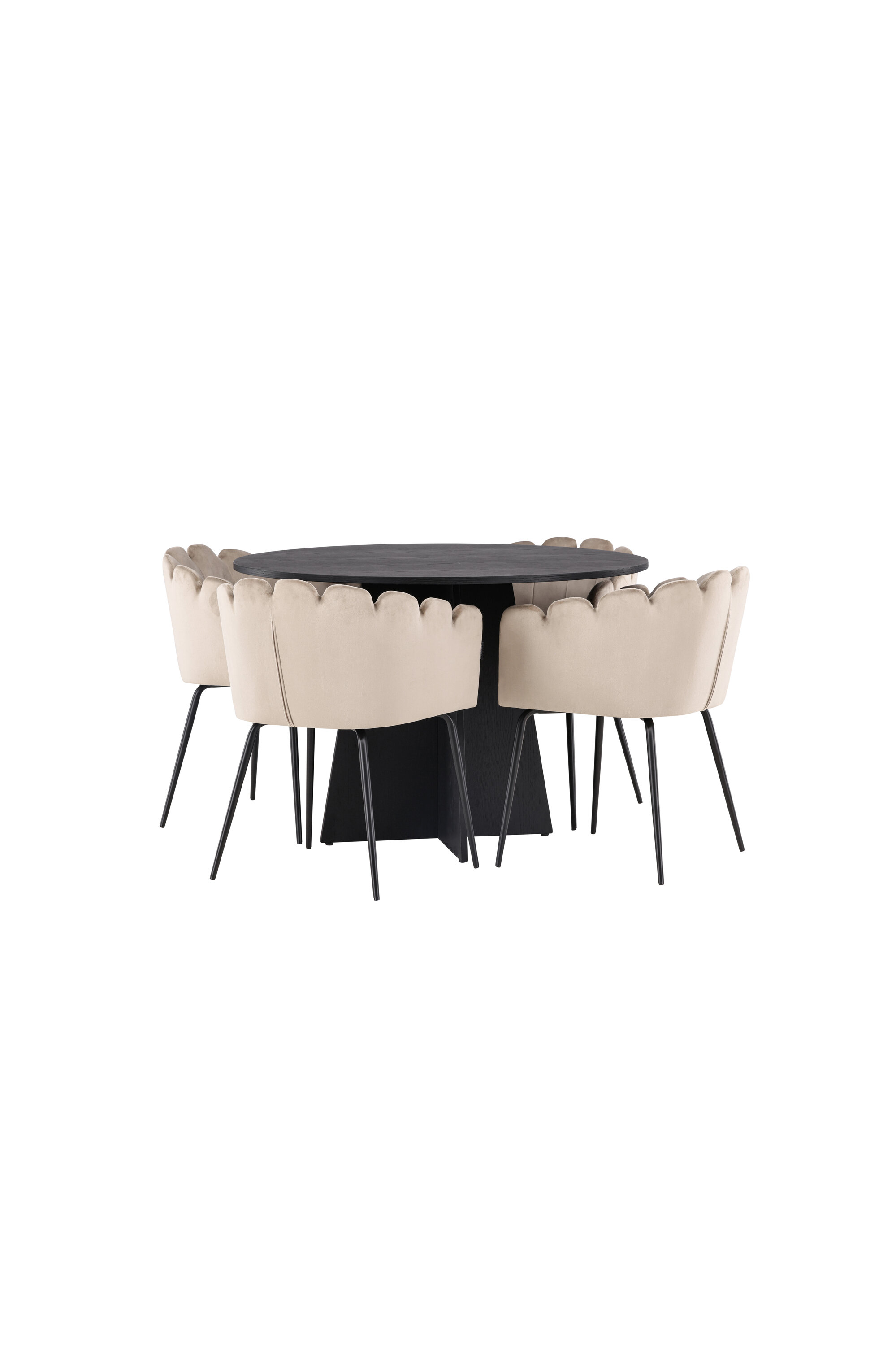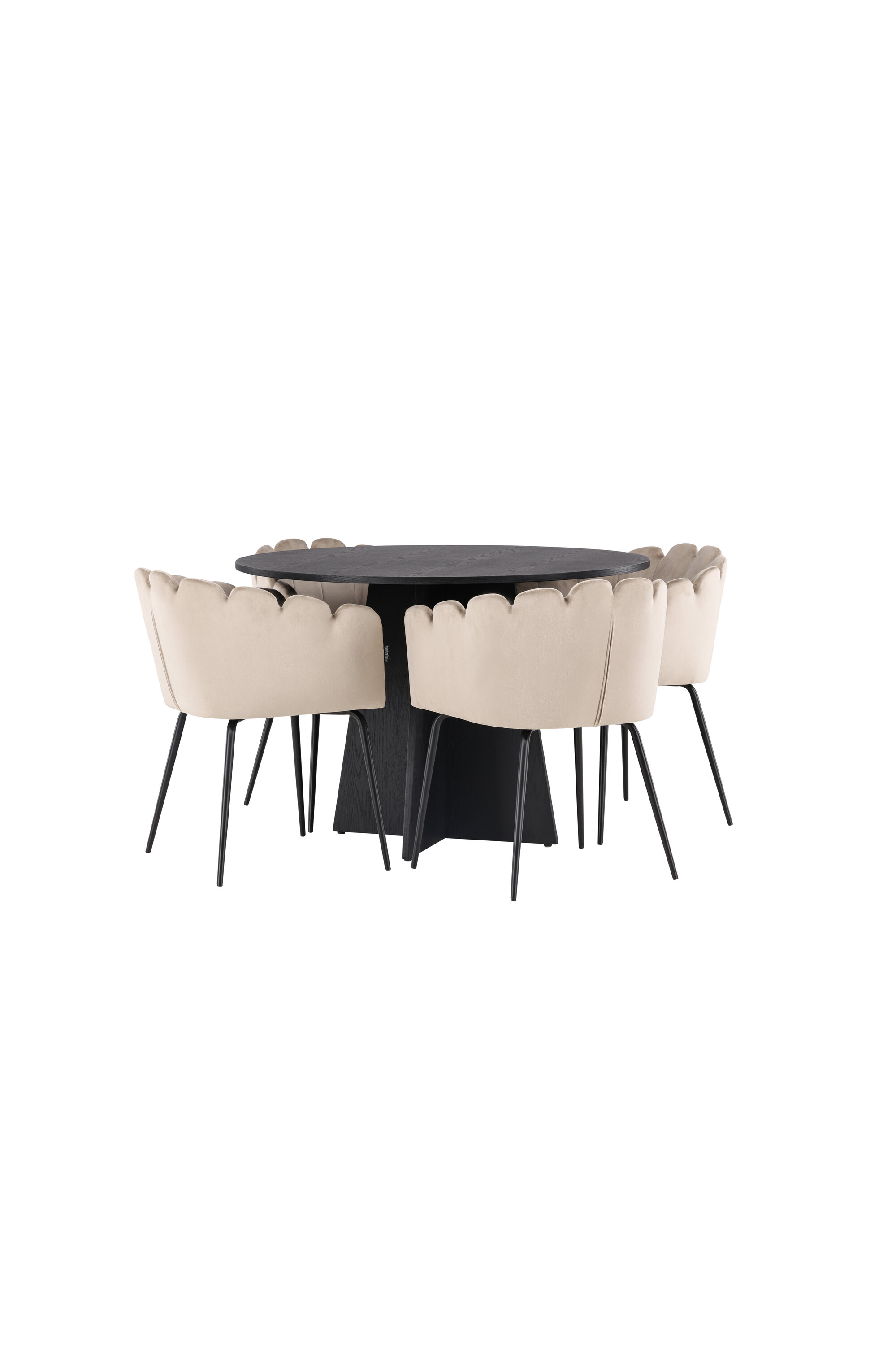 Sisusta elutuba elegantselt! Ühtlaselt mustas värvitoonis ümmargusel söögilaual Bootcut on spooniga MDF-ist lauaplaat ja disainirikas raam, mis jätab üldpildile armsa mulje. Siin koos meie populaarsete Limhamni sarja söögitoolidega. Toolil on kutsuv disain dekoratiivse kestakujulise dekoratiivõmblustega seljatoe ja maitsekalt beežist sametkangast ümara istmega. Jalad on musta pulbervärvitud metallist. Siin saab mugavalt istuda ja keegi ei riski äärepealt sattuda! Laua mõõdud: 110 cm.