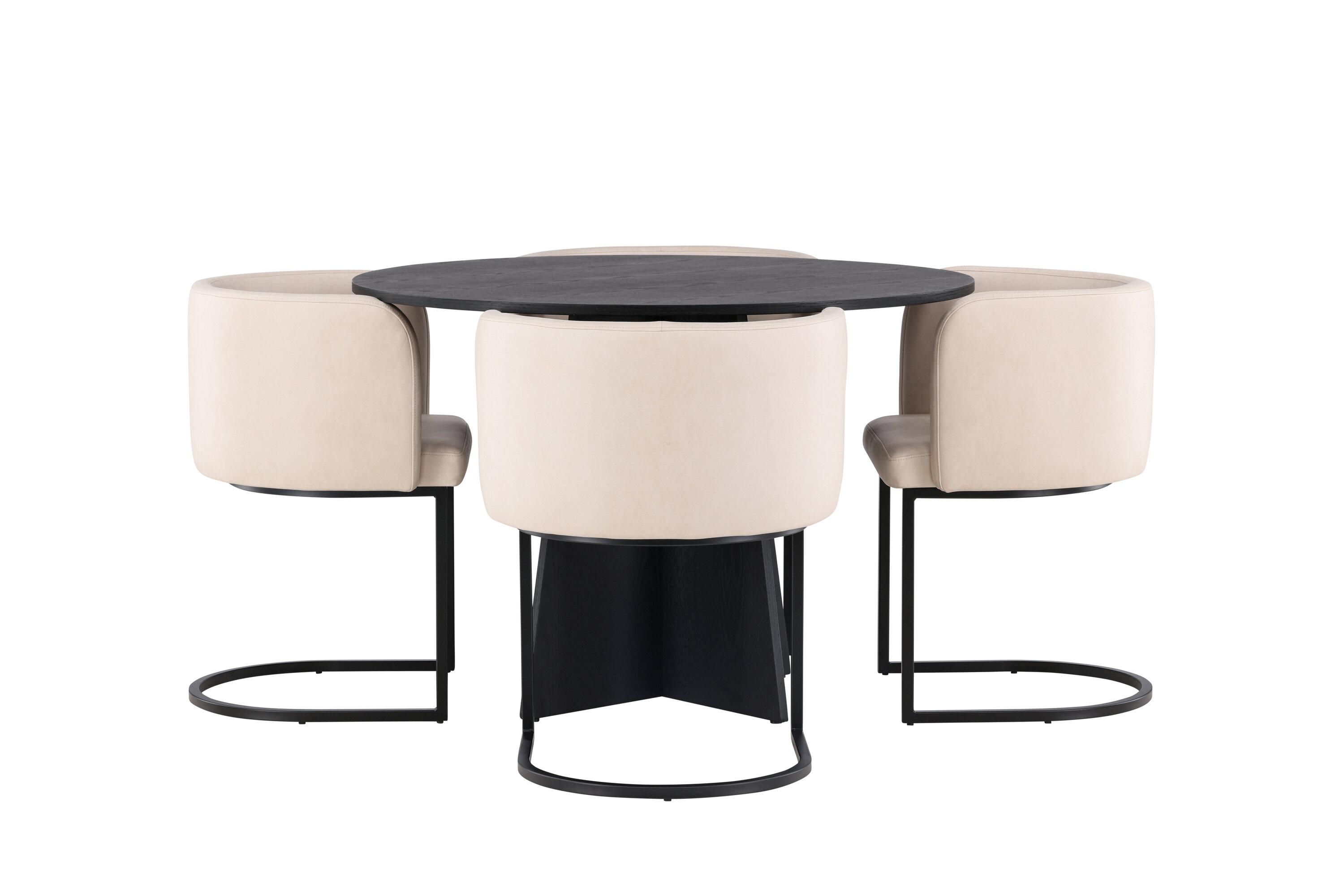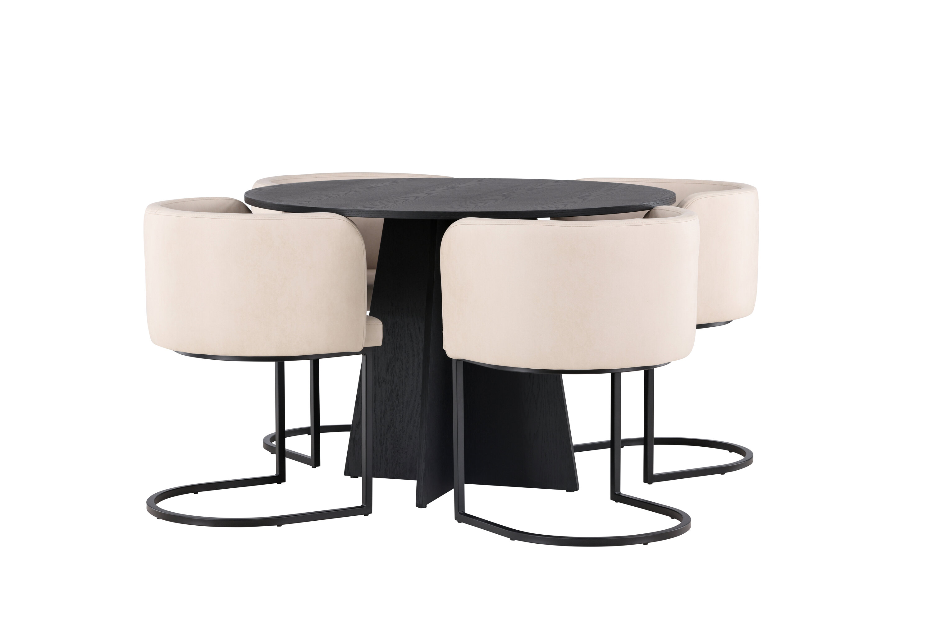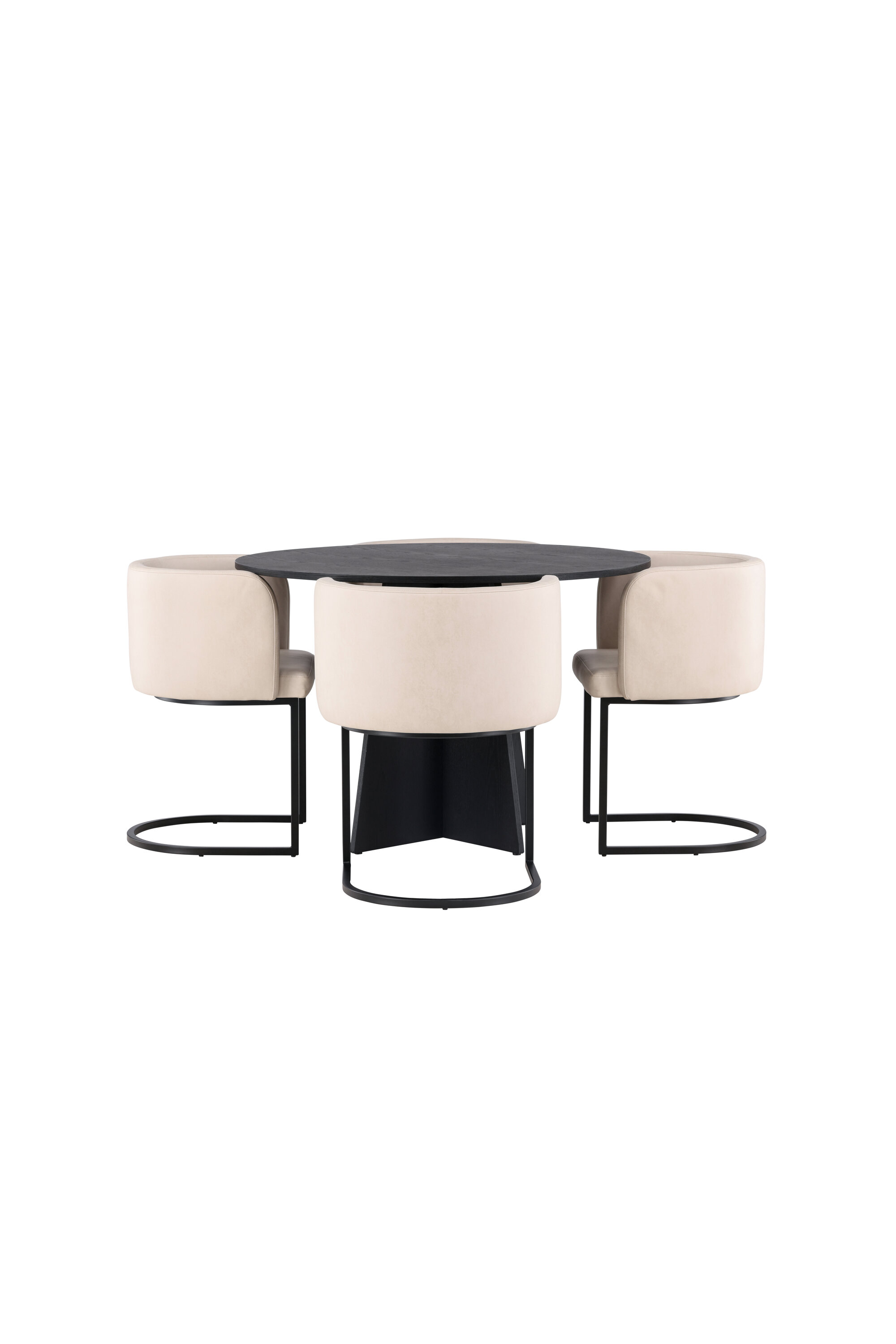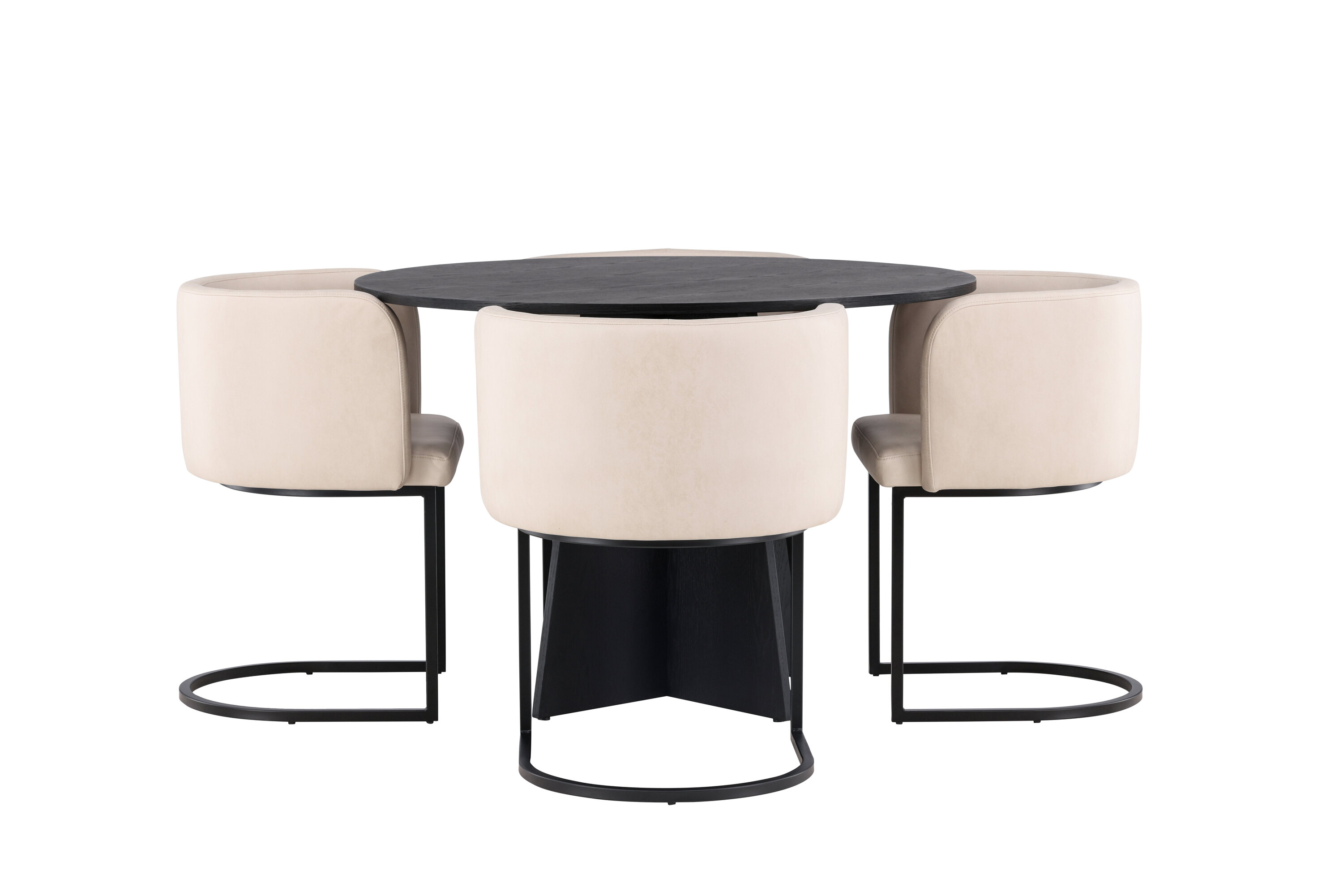 Sisusta luksuslikult ja suurejooneliselt! Ühtlaselt mustas värvitoonis ümmargusel söögilaual Bootcut on spooniga MDF-ist lauaplaat ja disainirikas raam, mis jätab üldpildile armsa mulje. Siin koos meie elegantsete Simrishamni seeria söögitoolidega. Toolil on täielikult polsterdatud iste, millel on ümar beežist TC-kangast seljatugi ja dekoratiivsed, minimalistlikud mustast terasest jalad. Istuge mugavalt ja nautige koos lähedastega eineid! Laua mõõdud: 110 cm.