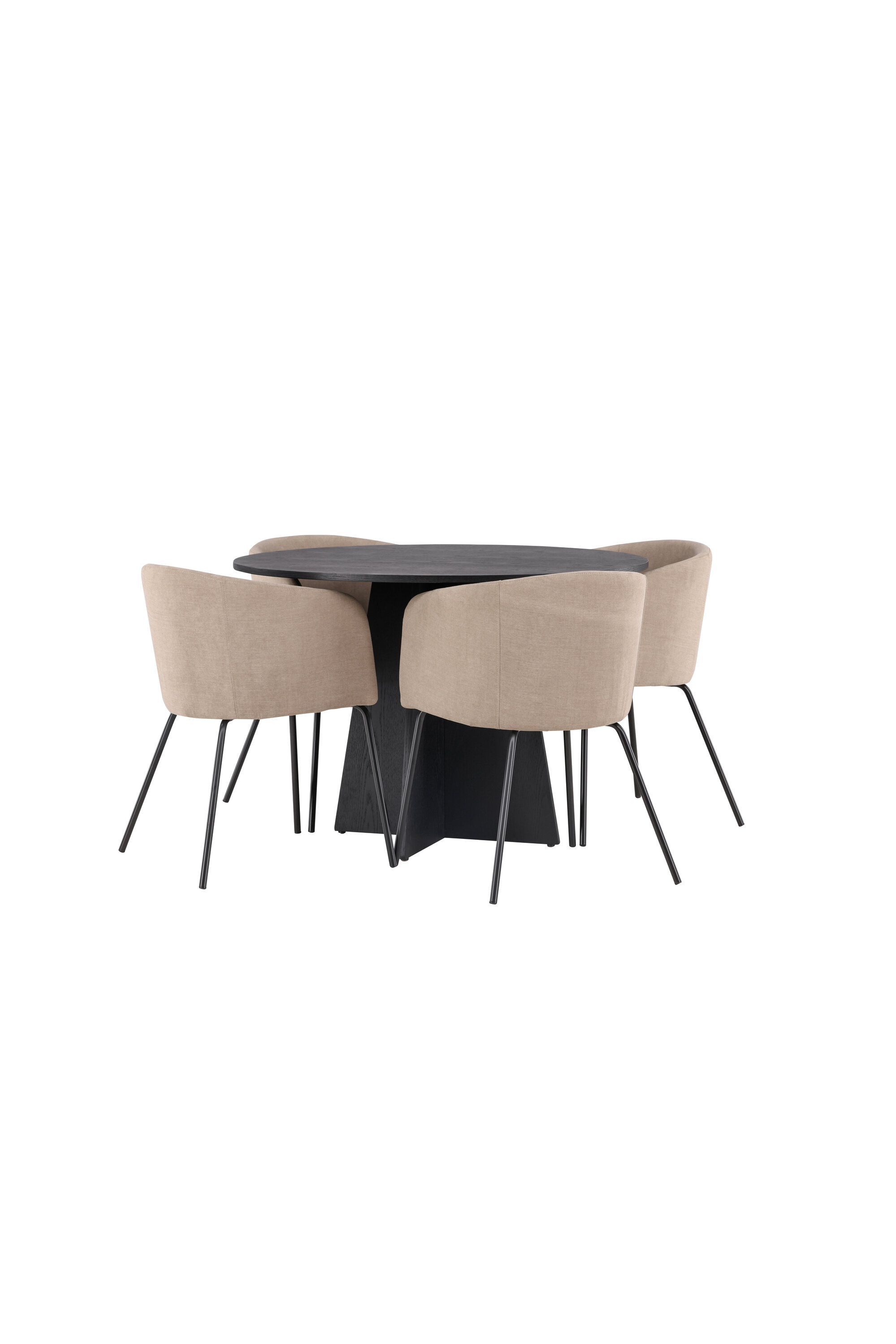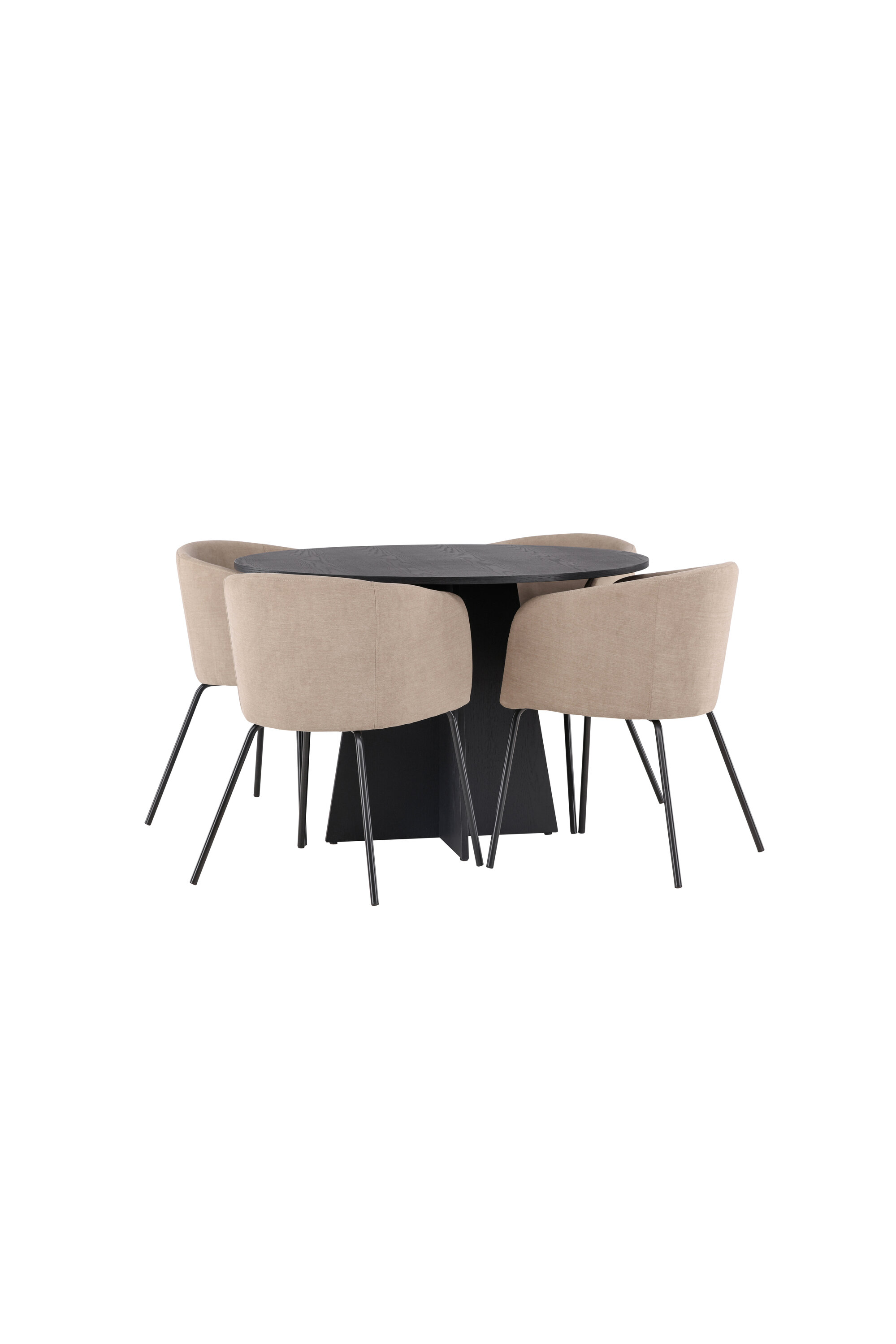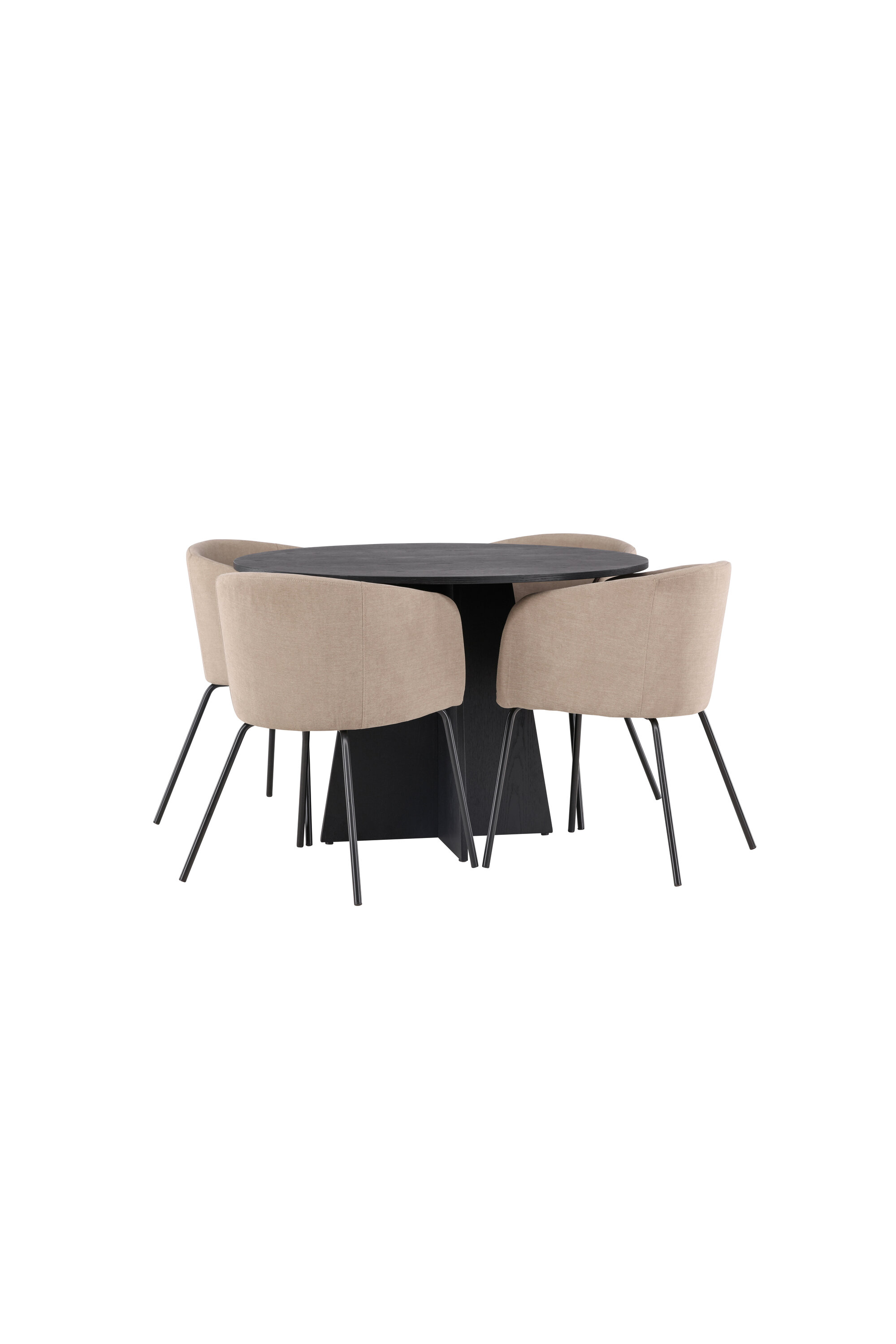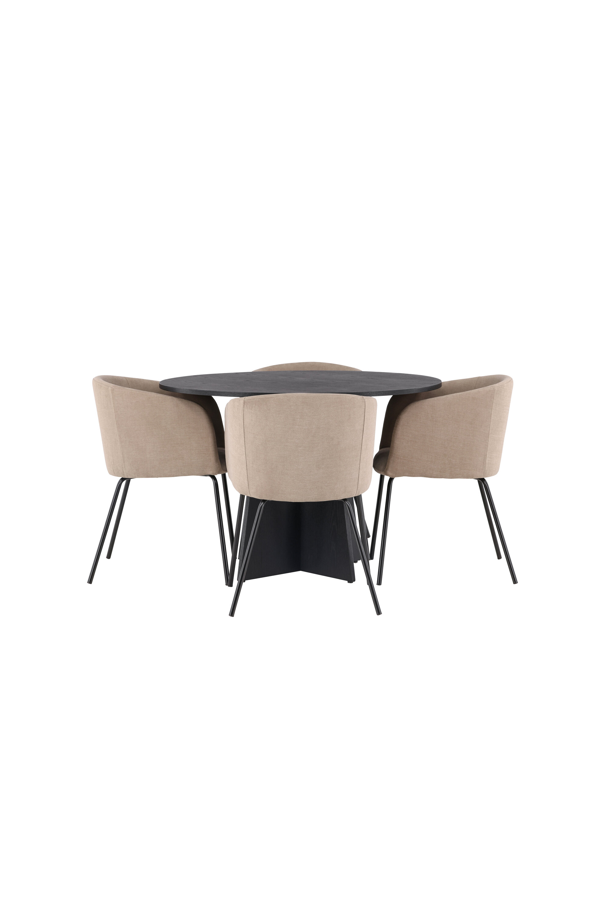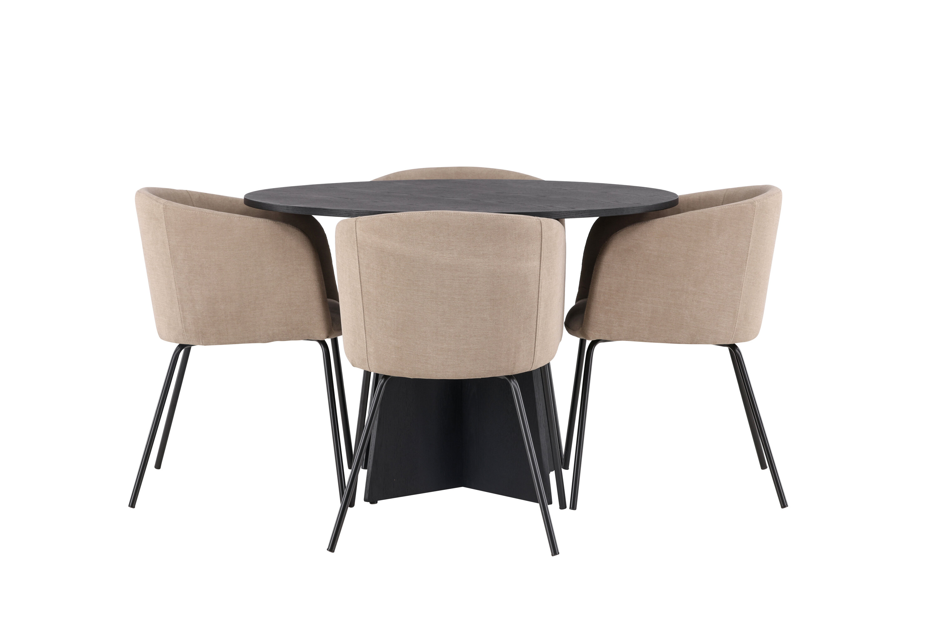 Maitsekas kombinatsioon mugavusest ja võluvast vormist! Ühtlaselt mustas värvitoonis ümmargusel söögilaual Bootcut on spooniga MDF-ist lauaplaat ja disainirikas raam, mis jätab üldpildile armsa mulje. Siin koos meie mugavate söögitoolidega Berit. Toolil on täielikult polsterdatud disain, millel on sametkangast ja polüesterlinast veidi ümar seljatugi ja iste ning kitsad mustast rauast jalad. Olgu siin veedetud aeg nauditav kogu perele! Laua mõõdud: 110 cm.