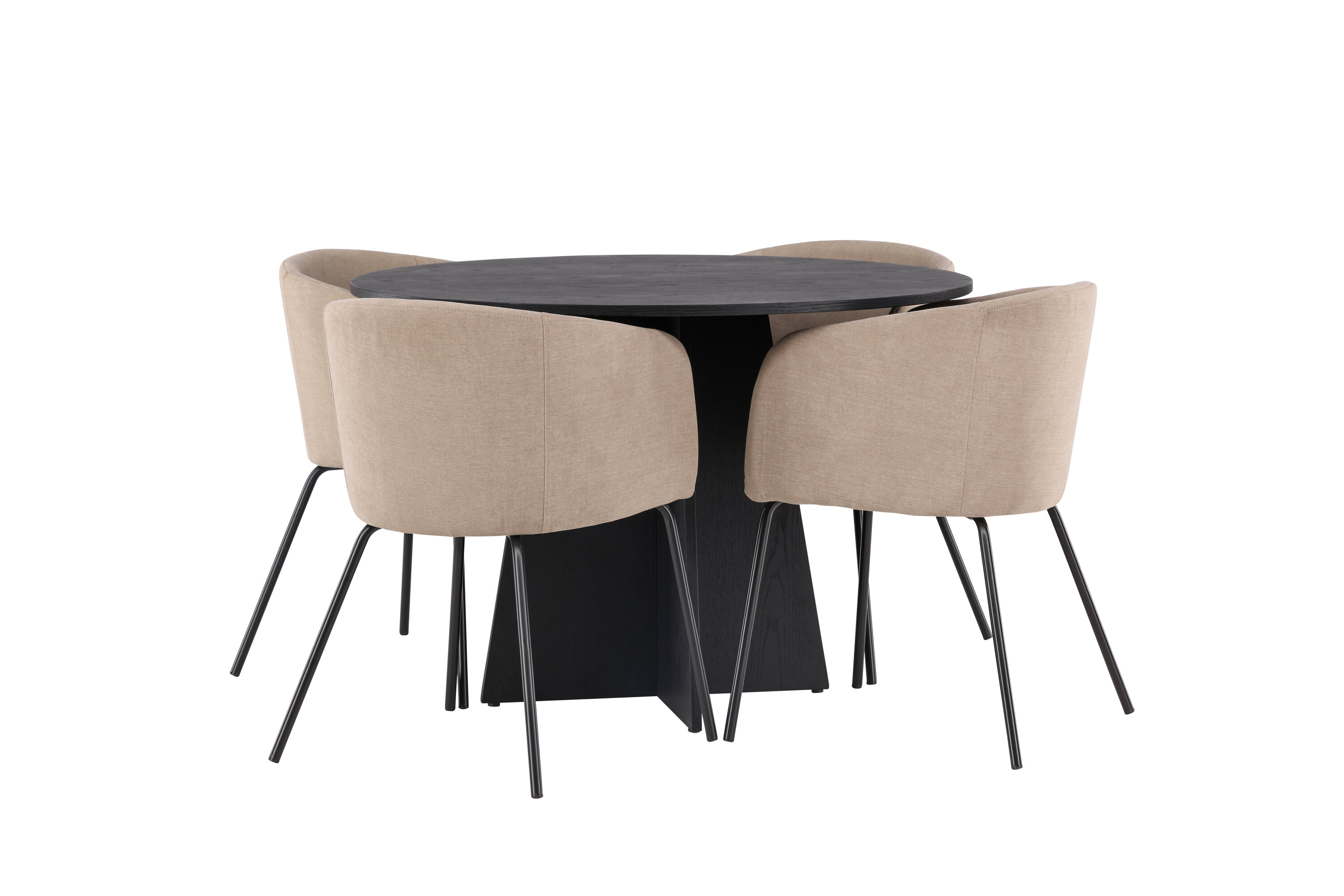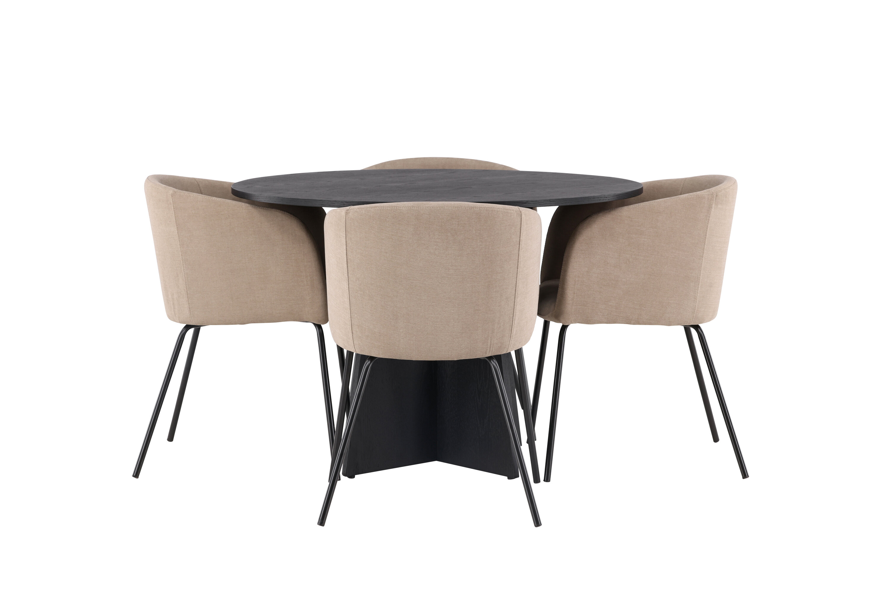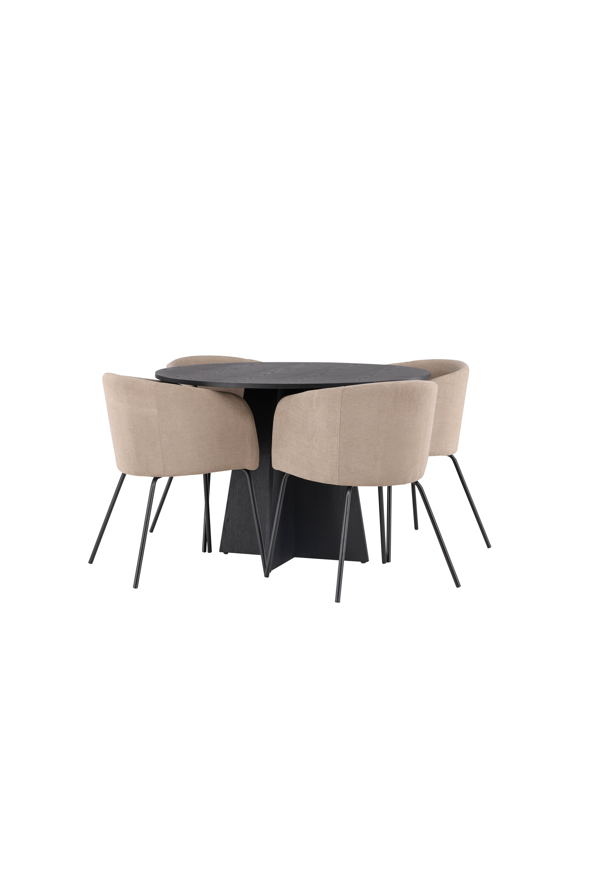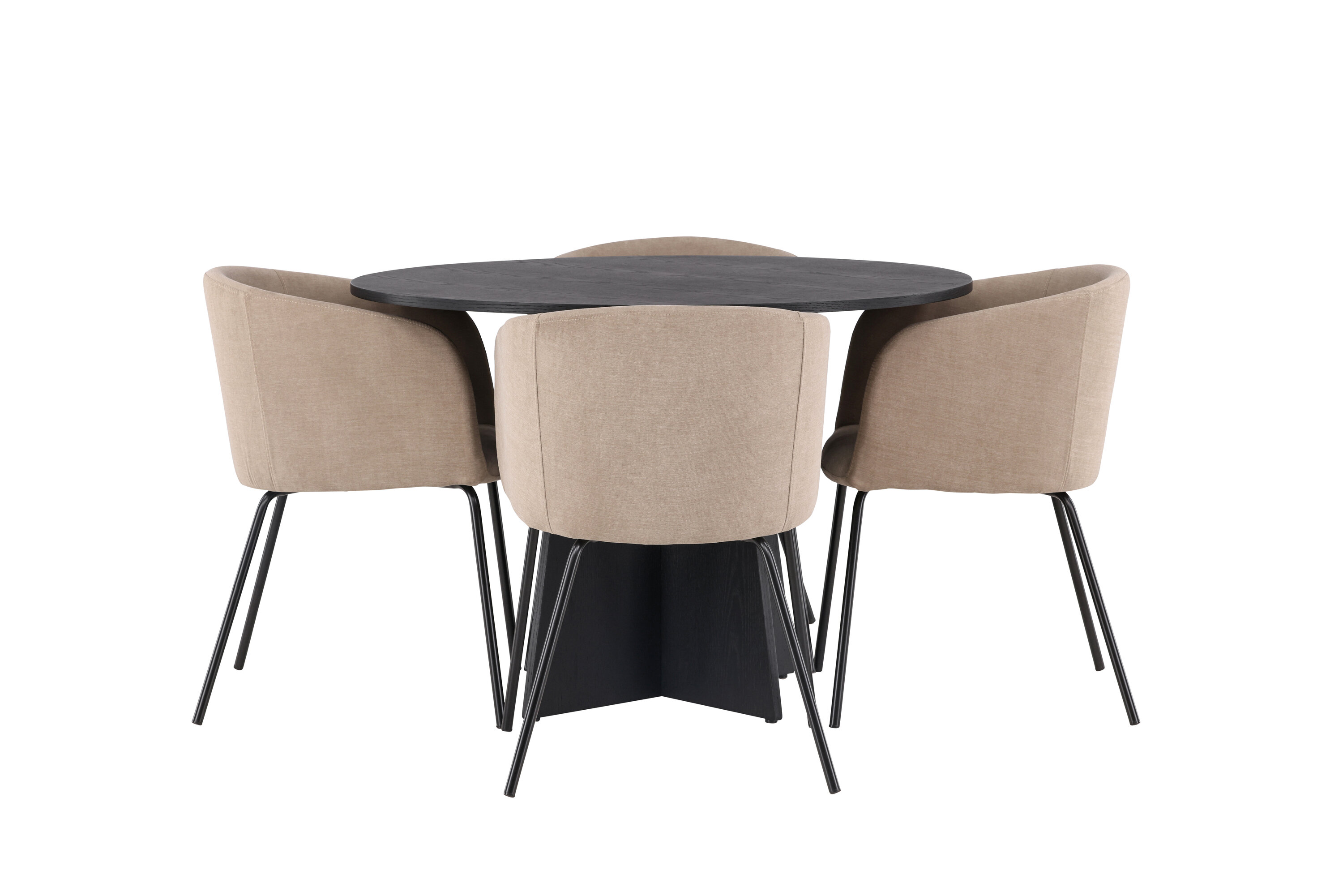 Maitsekas kombinatsioon mugavusest ja võluvast vormist! Ühtlaselt mustas värvitoonis ümmargusel söögilaual Bootcut on spooniga MDF-ist lauaplaat ja disainirikas raam, mis jätab üldpildile armsa mulje. Siin koos meie mugavate söögitoolidega Berit. Toolil on täielikult polsterdatud disain, millel on sametkangast ja polüesterlinast veidi ümar seljatugi ja iste ning kitsad mustast rauast jalad. Olgu siin veedetud aeg nauditav kogu perele! Laua mõõdud: 110 cm.