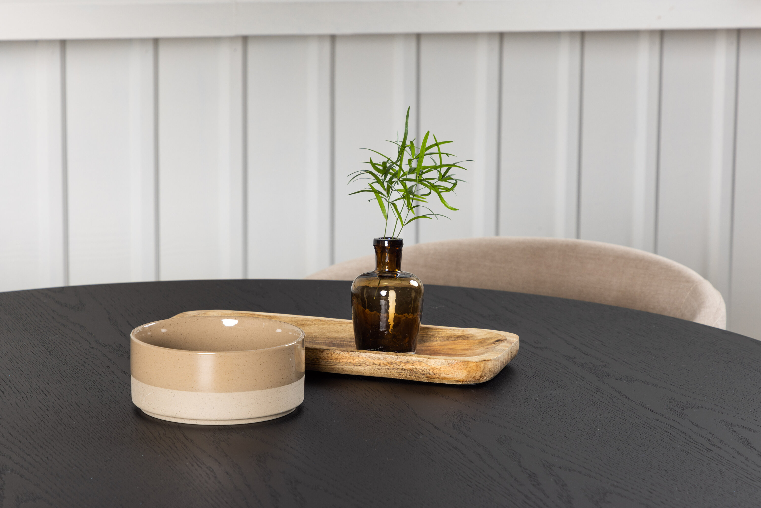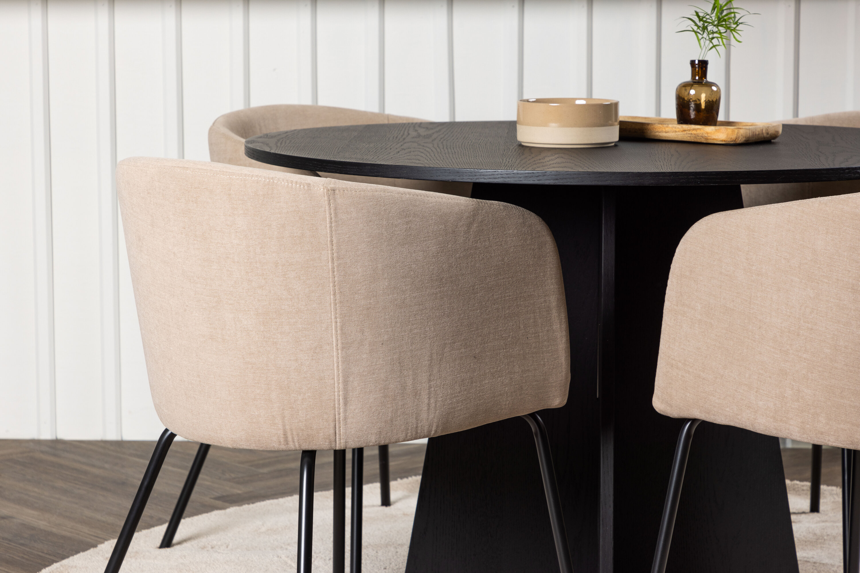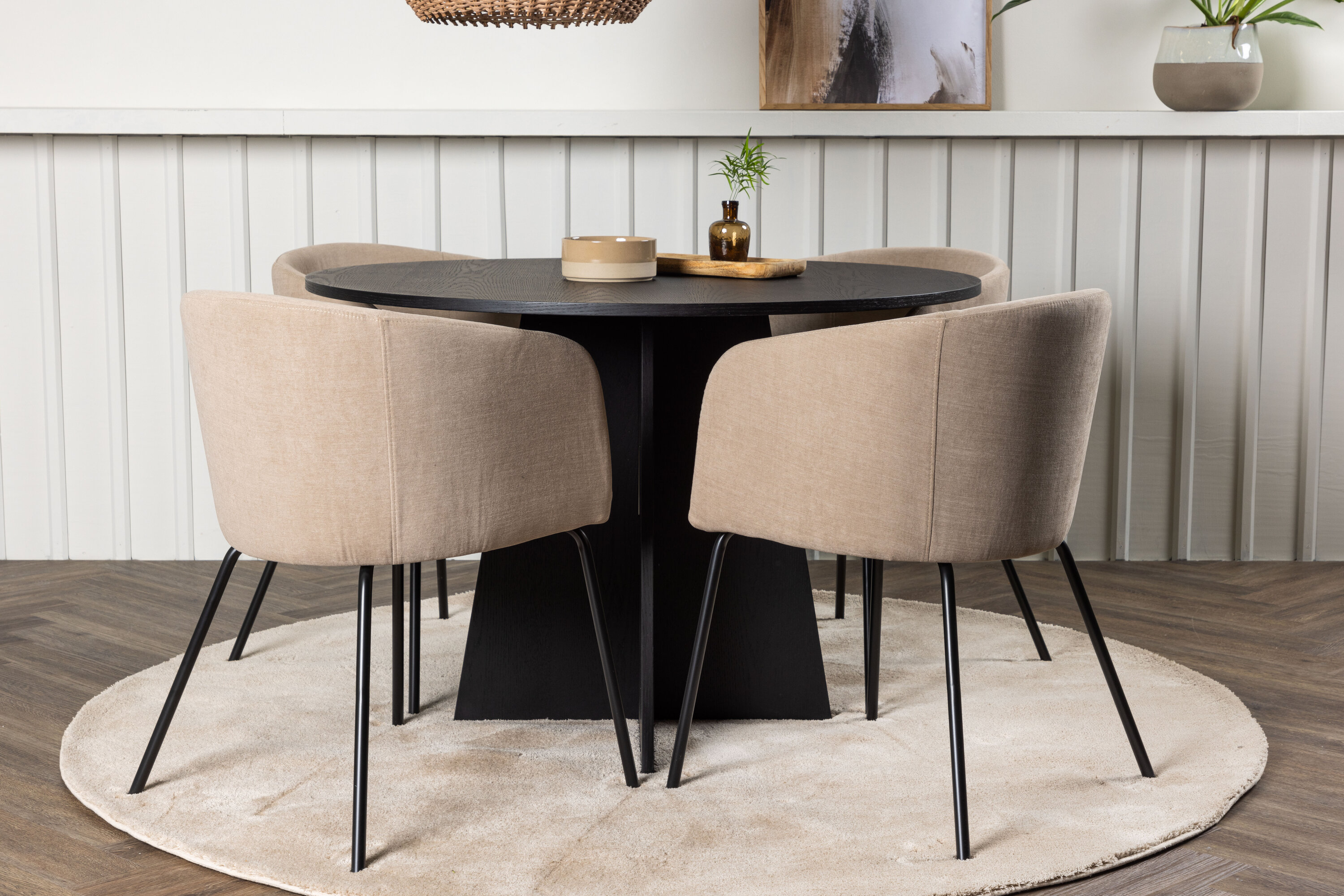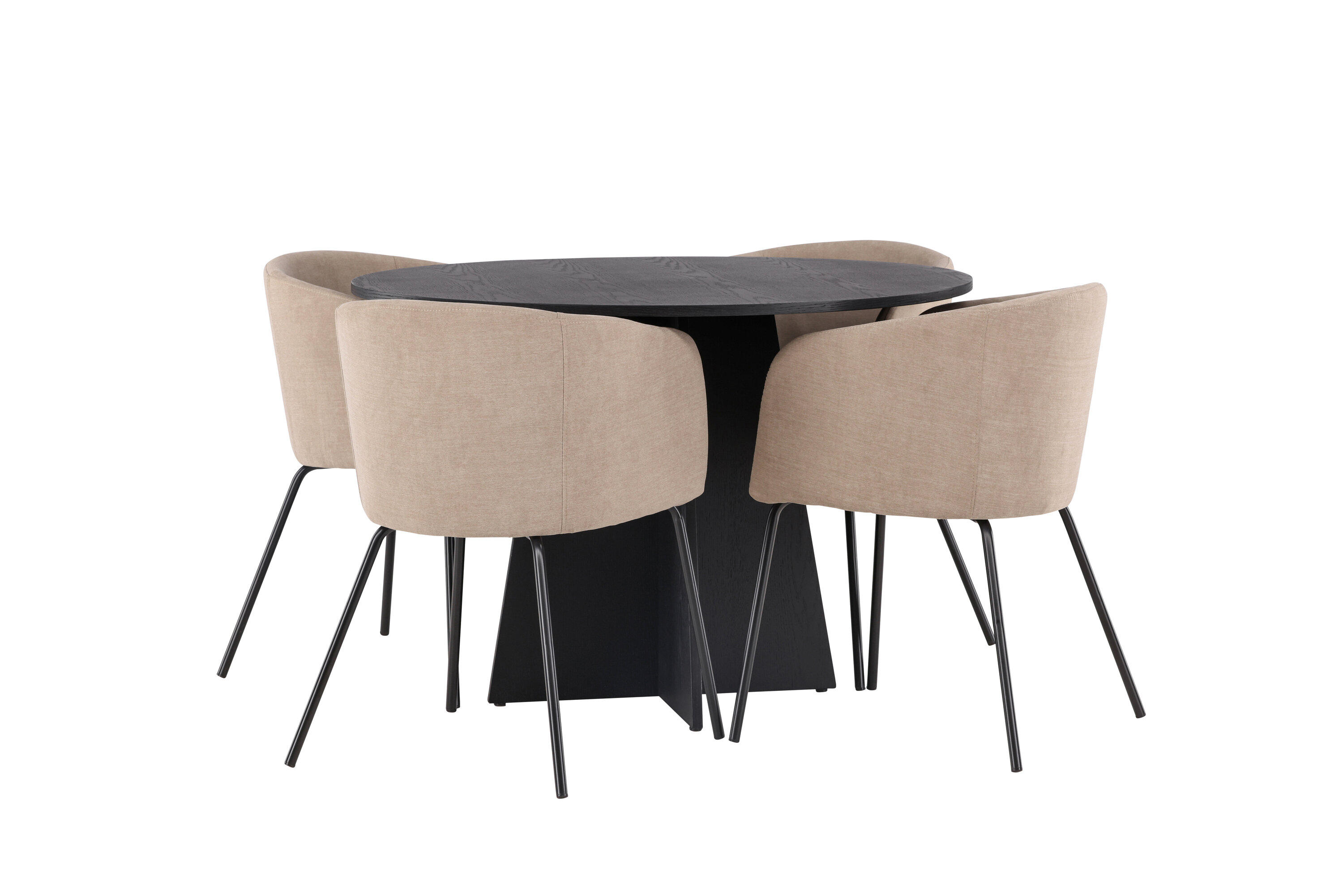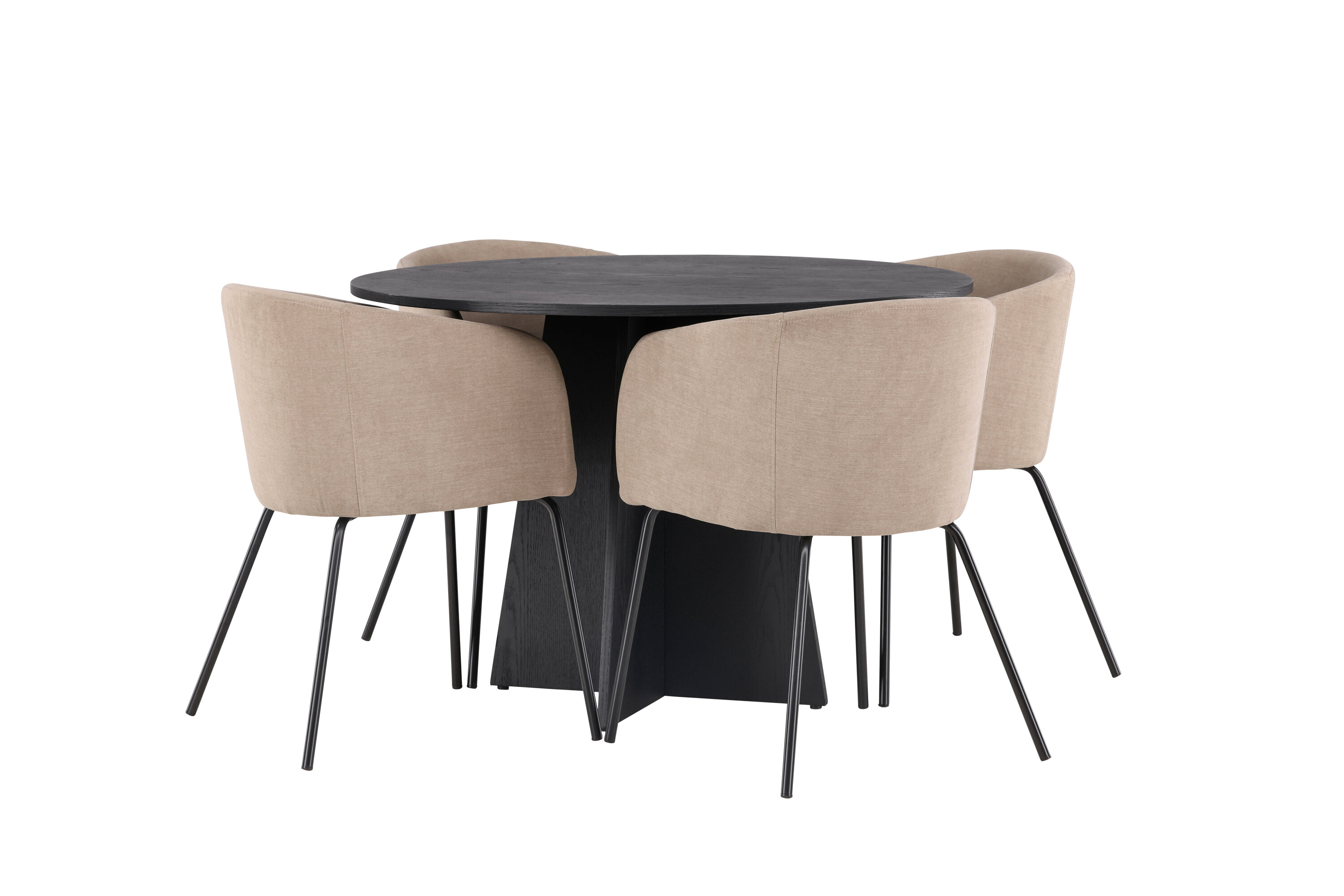 Maitsekas kombinatsioon mugavusest ja võluvast vormist! Ühtlaselt mustas värvitoonis ümmargusel söögilaual Bootcut on spooniga MDF-ist lauaplaat ja disainirikas raam, mis jätab üldpildile armsa mulje. Siin koos meie mugavate söögitoolidega Berit. Toolil on täielikult polsterdatud disain, millel on sametkangast ja polüesterlinast veidi ümar seljatugi ja iste ning kitsad mustast rauast jalad. Olgu siin veedetud aeg nauditav kogu perele! Laua mõõdud: 110 cm.
