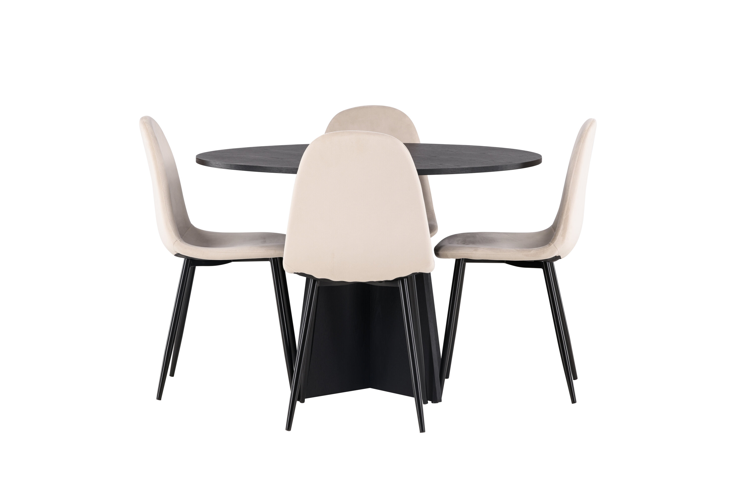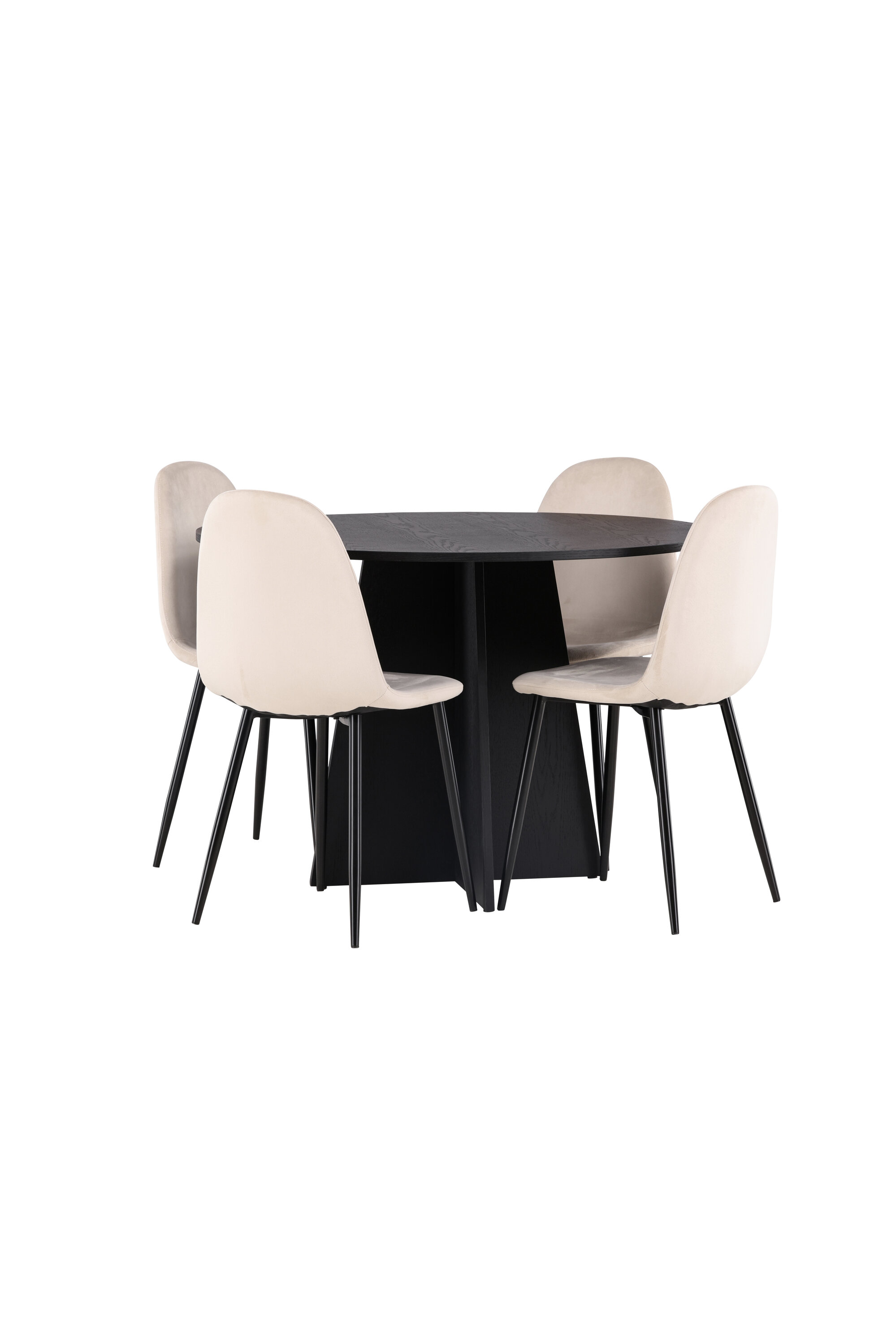 Kõik on seotud üksikasjadega! Ühtlaselt mustas värvitoonis ümmargusel söögilaual Bootcut on spooniga MDF-ist lauaplaat ja disainirikas raam, mis jätab üldpildile armsa mulje. Siin koos meie suurepäraste söögitoolidega Polar. See täielikult polsterdatud disainiga söögitool, mille seljatugi ja iste on beežist sametkangast ning jalad on mustast pulbervärvitud metallist, on sama mugav kui ka pilkupüüdev. Soe, beež värv on kirsiks tordil! Laua mõõdud: 110 cm.