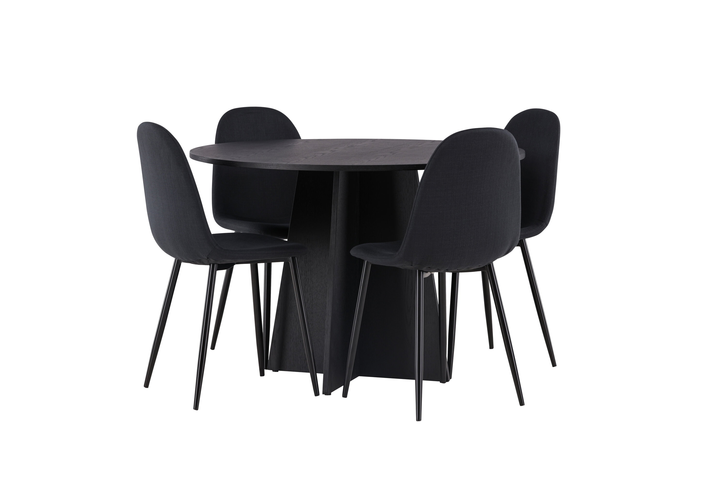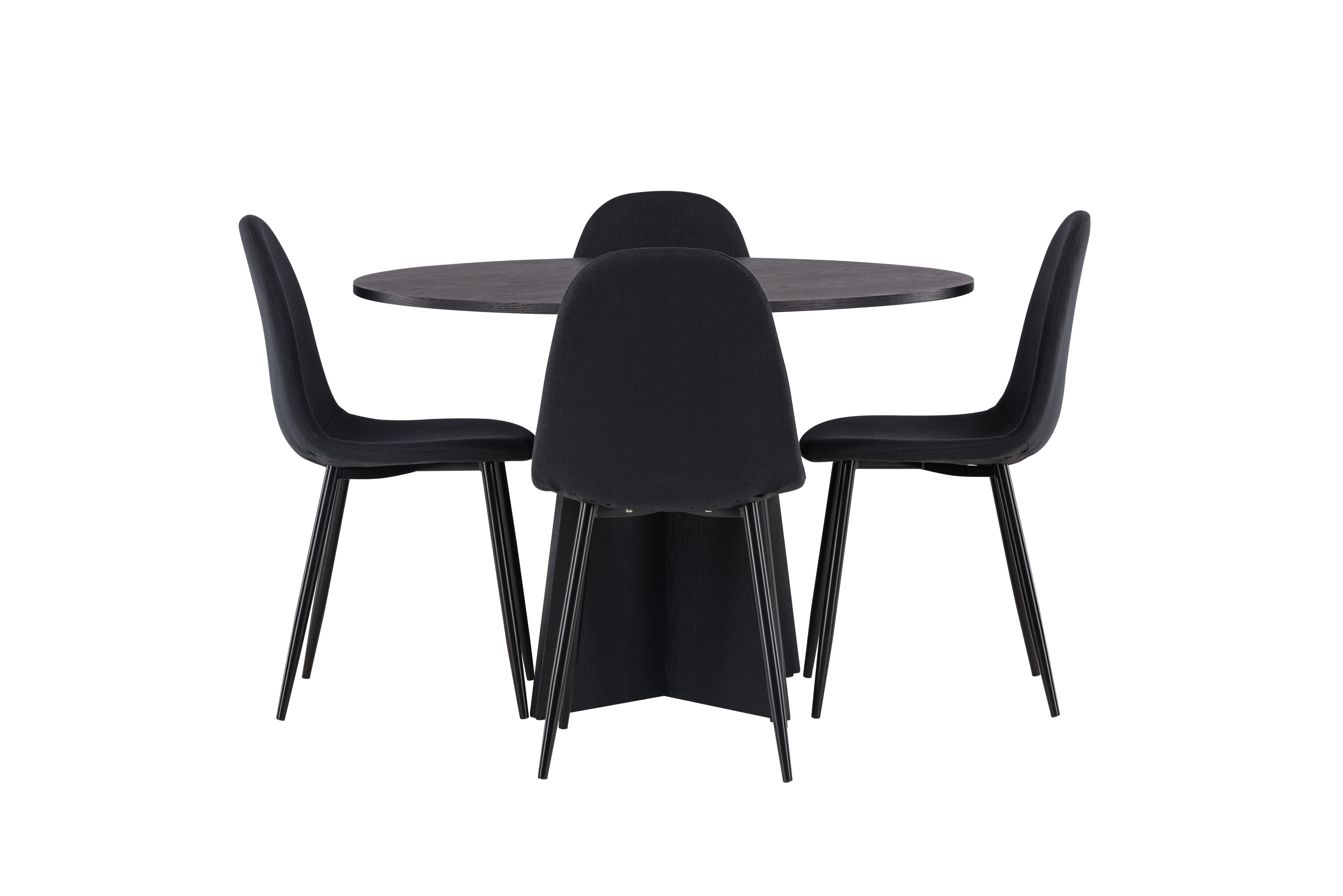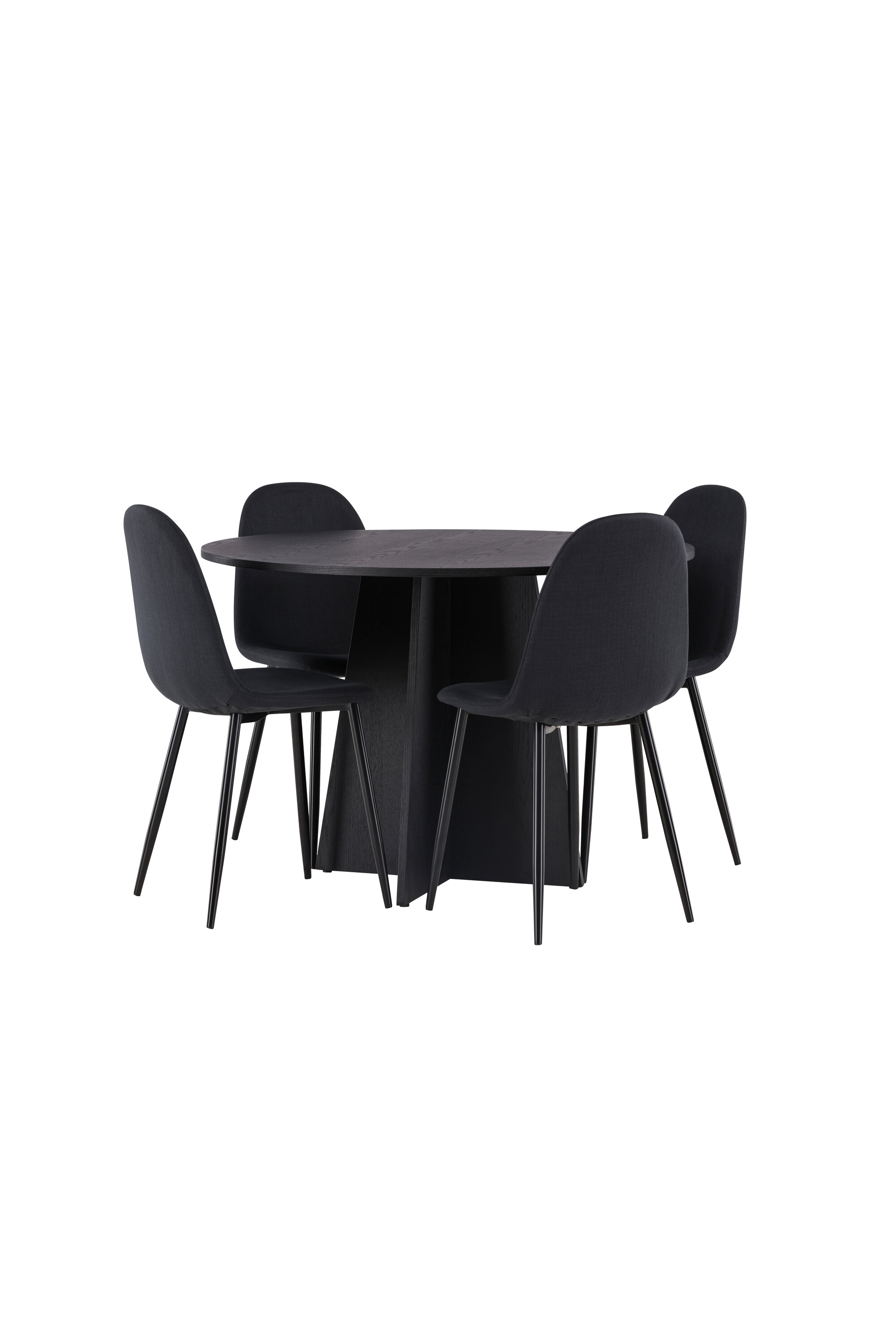 Sellest paremaks ei lähe! Ühtlaselt mustas värvitoonis ümmargusel söögilaual Bootcut on spooniga MDF-ist lauaplaat ja disainirikas raam, mis jätab üldpildile armsa mulje. Siin on laud kombineeritud Polari sarja mustade söögitoolidega. Toolil on ümar disain ja klassikaline disain – nii praktiline kui ka ajatu. Seljatugi ja iste on polsterdatud musta polüesterkangaga ning jalad musta pulbervärvitud metalliga. Sisusta oma kodu võluvalt ja mugavalt! Laua mõõdud: 110 cm.