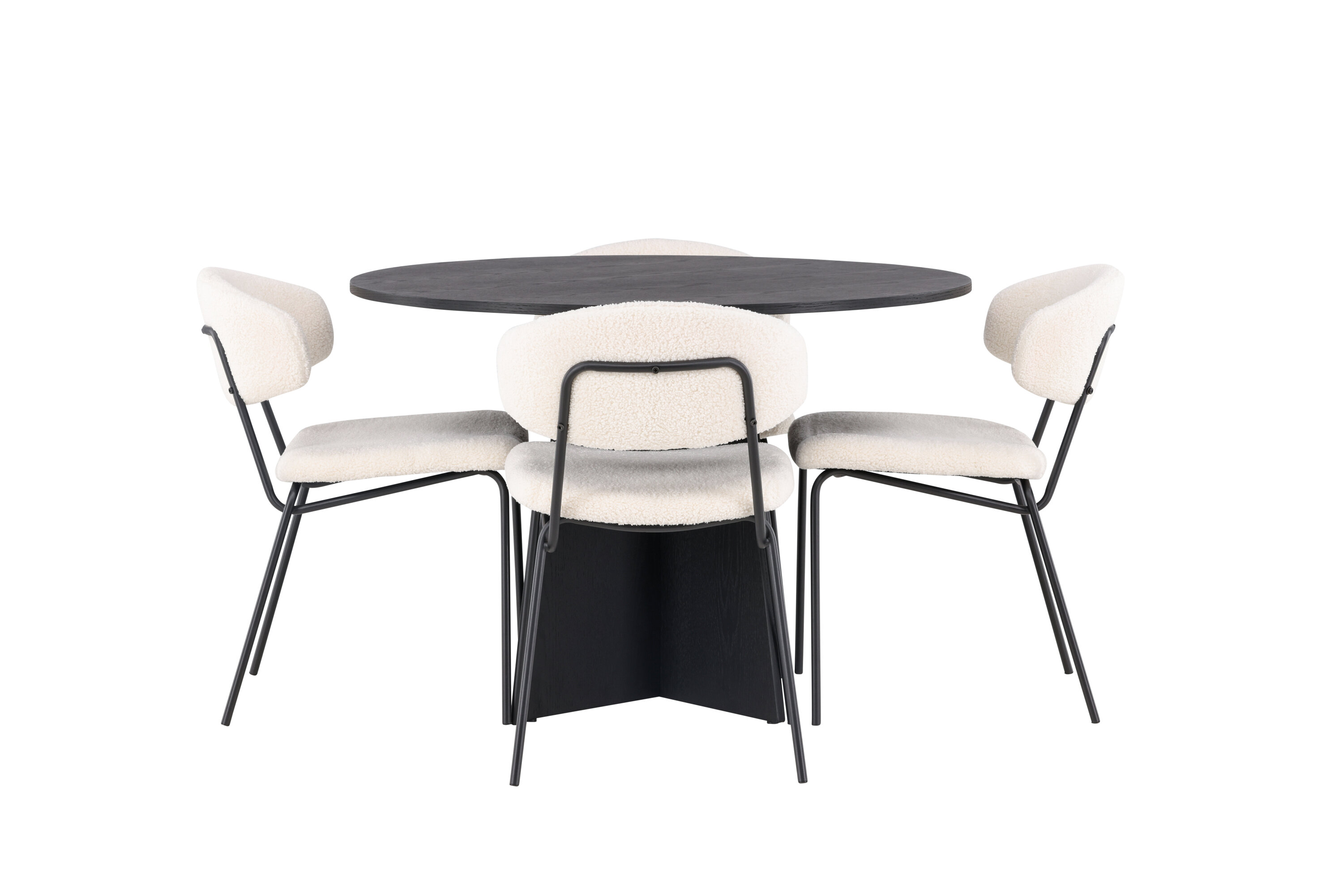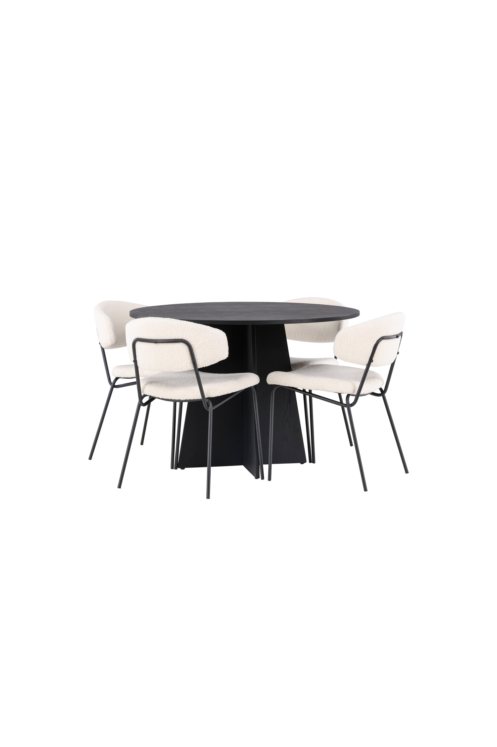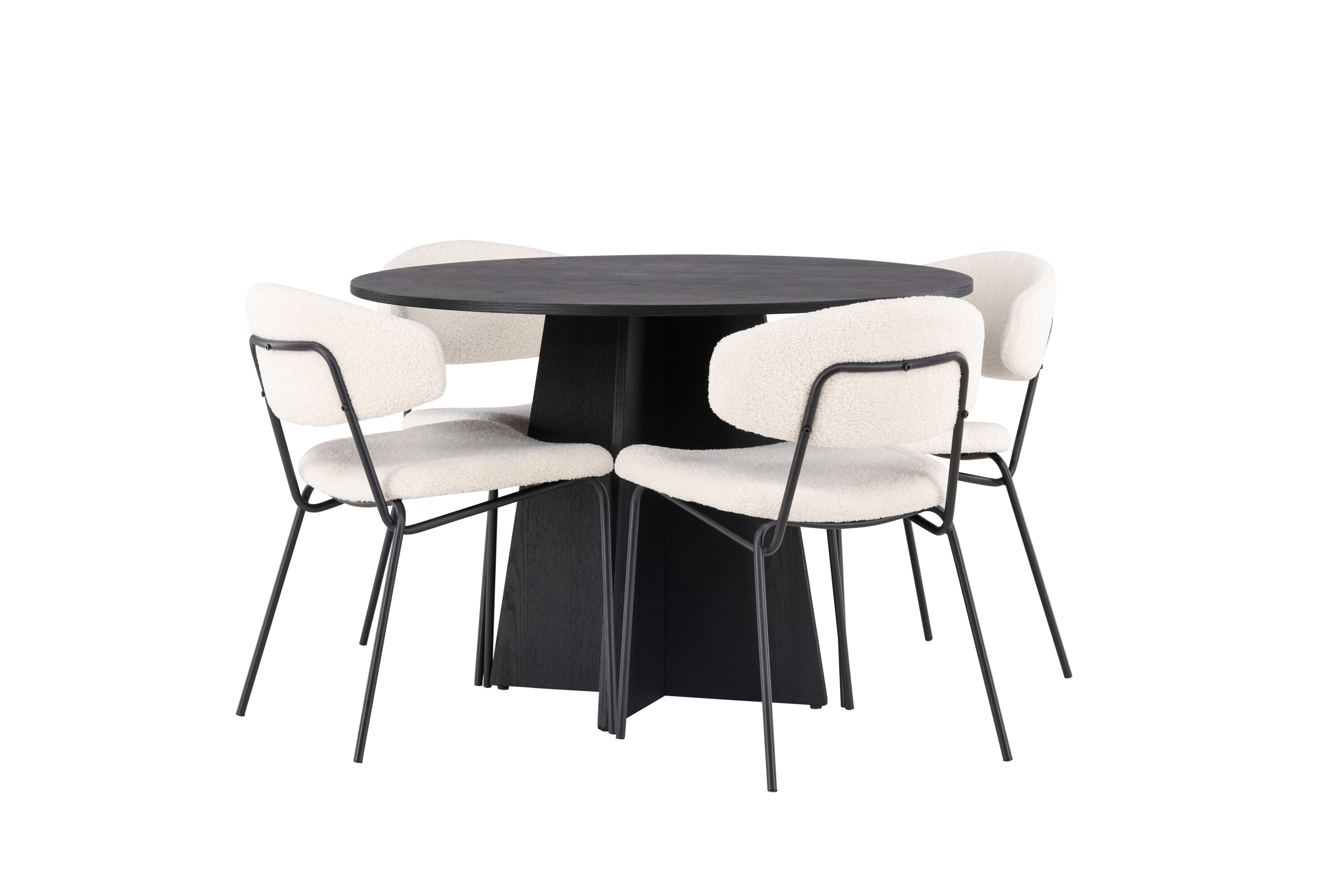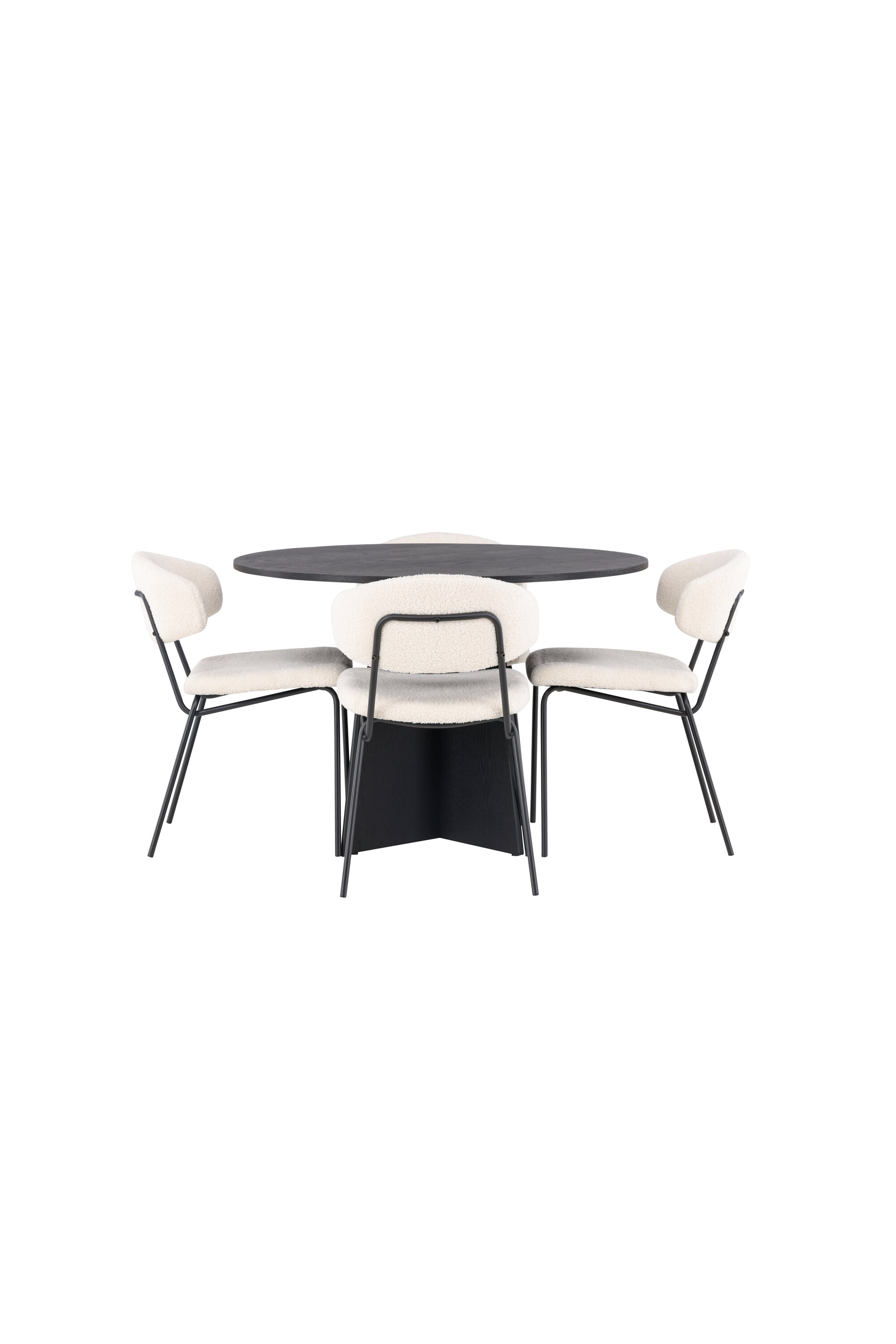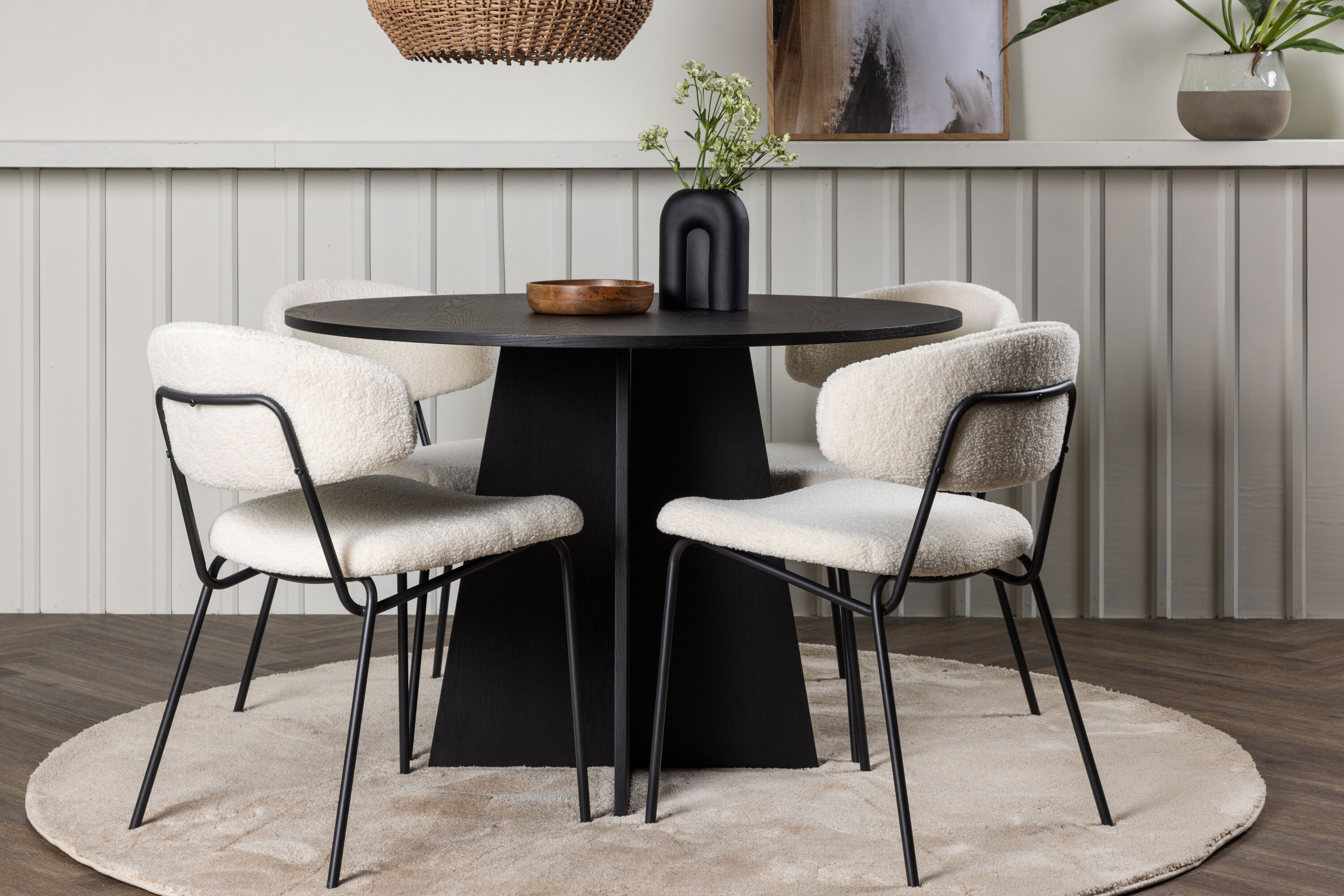 Tuttav samaaegselt trendikas! Ühtlaselt mustas värvitoonis ümmargusel söögilaual Bootcut on spooniga MDF-ist lauaplaat ja disainirikas raam, mis jätab üldpildile armsa mulje. Siin on stiilne kombinatsioon meie Chico sarja valgete söögitoolidega. Tool on valgest boucle kangast, polsterdatud istme ja seljatoega lisamugavuse tagamiseks. Jalad on kitsad mustast terasest, mis annab toolile õhulise tunde. Siin ei satu keegi äärele! Laua mõõdud: 110 cm.