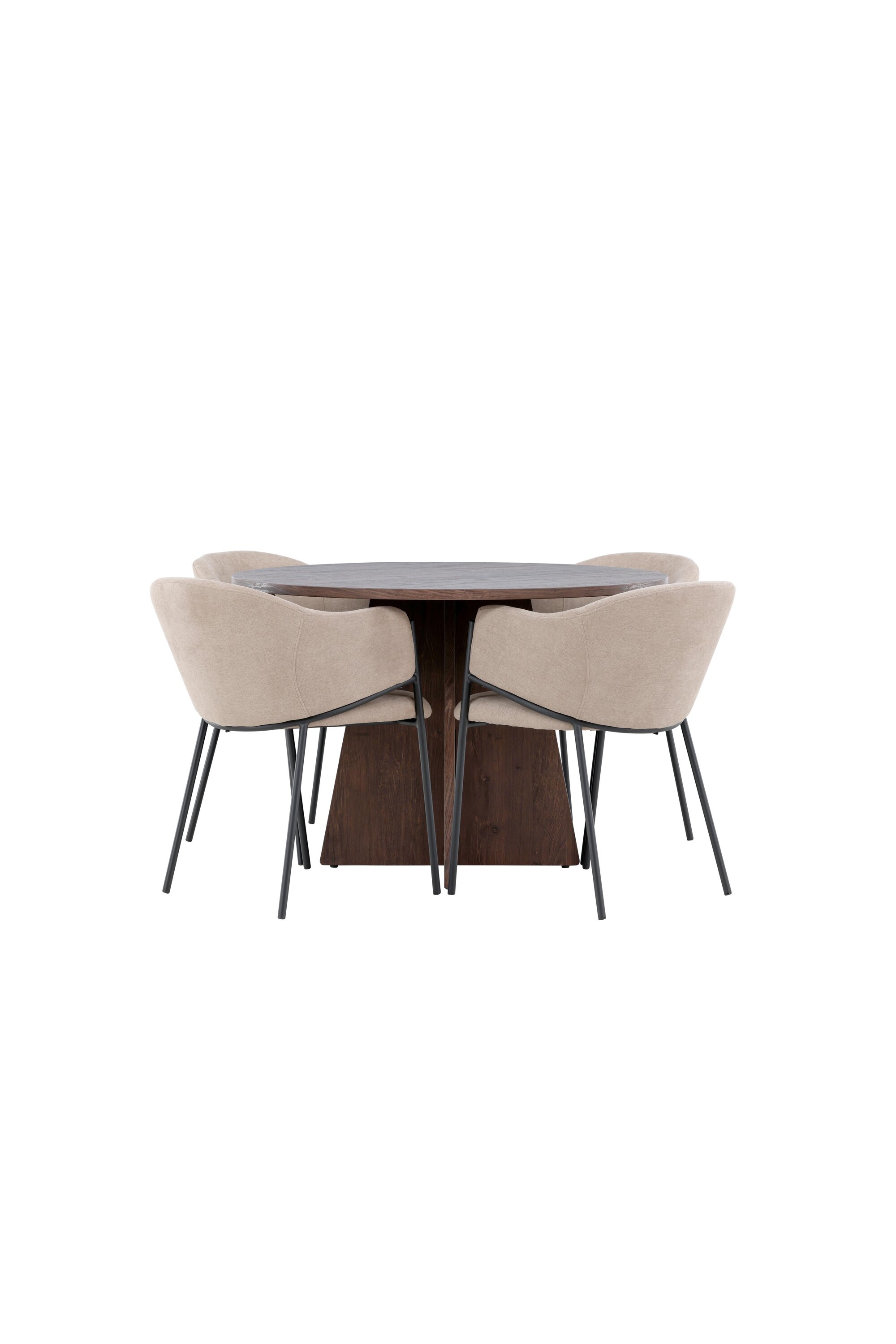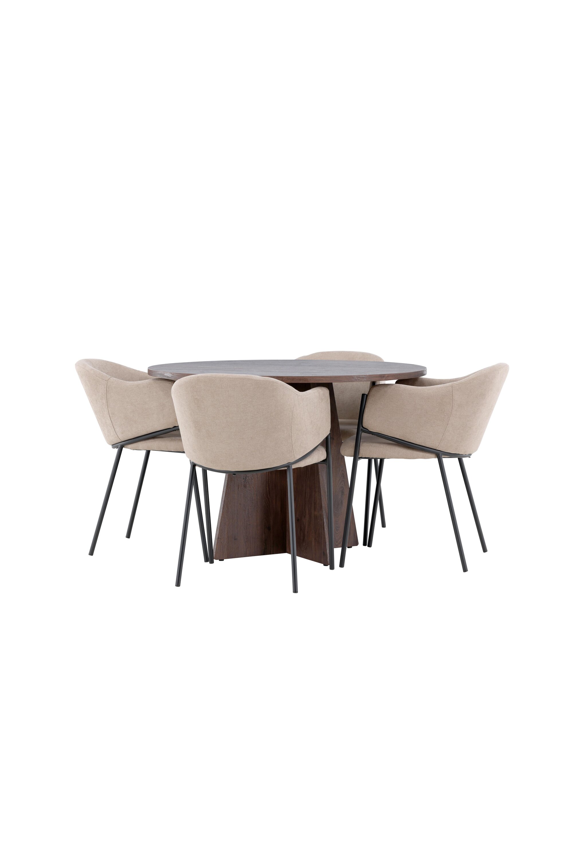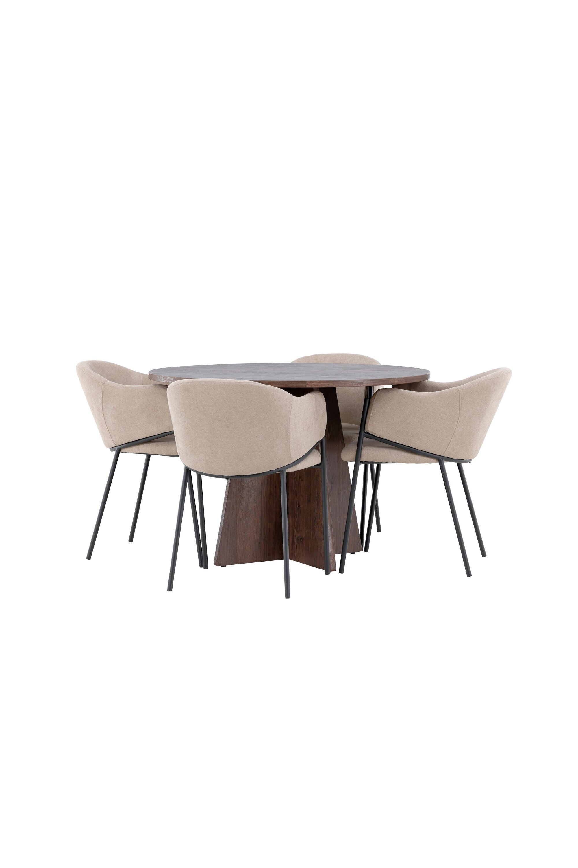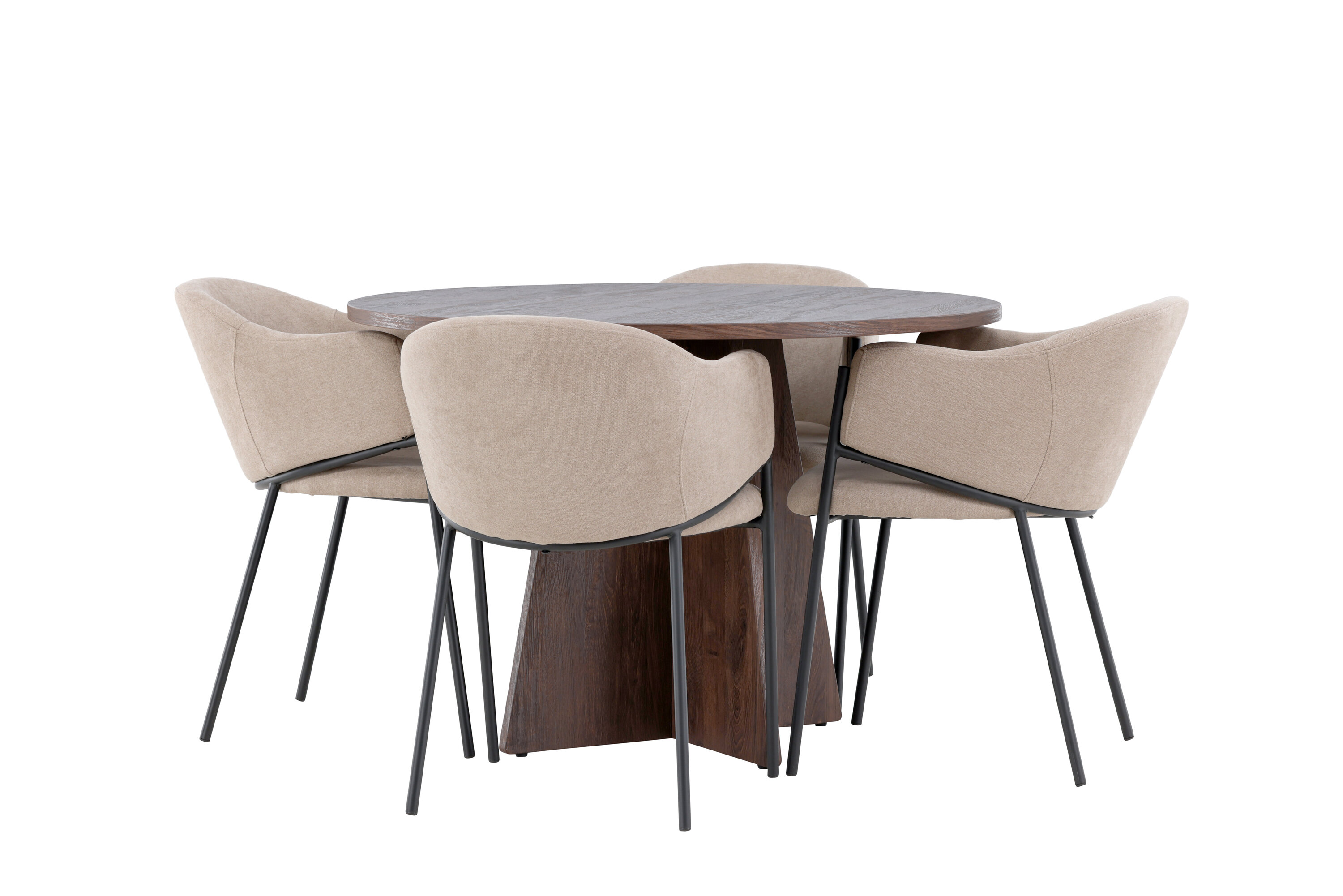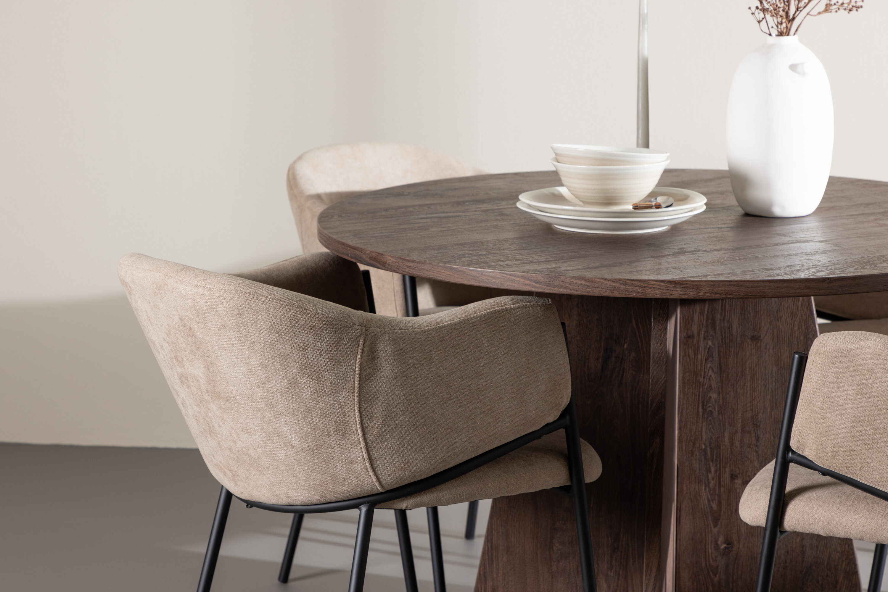Looge meie elegantse söögikomplektiga kutsuv ja stiilne söögituba, ühendades ümmarguse Bootcut laua mugavate Evelina toolidega. See söögikomplekt, mis sobib ideaalselt nii igapäevaseks kasutamiseks kui ka erilistel puhkudel, annab teie söögitoale moodsa ja peene ilme. Kauni mokaka varjundiga Bootcut laud on valmistatud MDF-st, pakkudes sellele kindla ja stabiilse struktuuri. Oma ümara kuju ja elegantse disainiga saab sellest teie söögitoa loomulik keskpunkt, mis sobib suurepäraselt hubaseks õhtusöögiks ja seltskondlikuks koosviibimiseks. Evelina toolid täiendavad lauda suurepäraselt oma stiilsete linasest soojas beežis toonis istmetega. Need toolid pakuvad nii mugavust kui ka stiili, mistõttu on need ideaalsed pikkadeks õhtusöökideks ja vestlusteks laua taga. See söögikomplekt on täiuslik segu funktsionaalsusest ja esteetikast, mistõttu on see suurepärane valik neile, kes soovivad kutsuvat ja elegantset söögituba. Laske oma söögitoast saada koht, kus luuakse mälestusi ja jagatakse hetki selle kauni Bootcut laua ja Evelina toolide kombinatsiooniga.