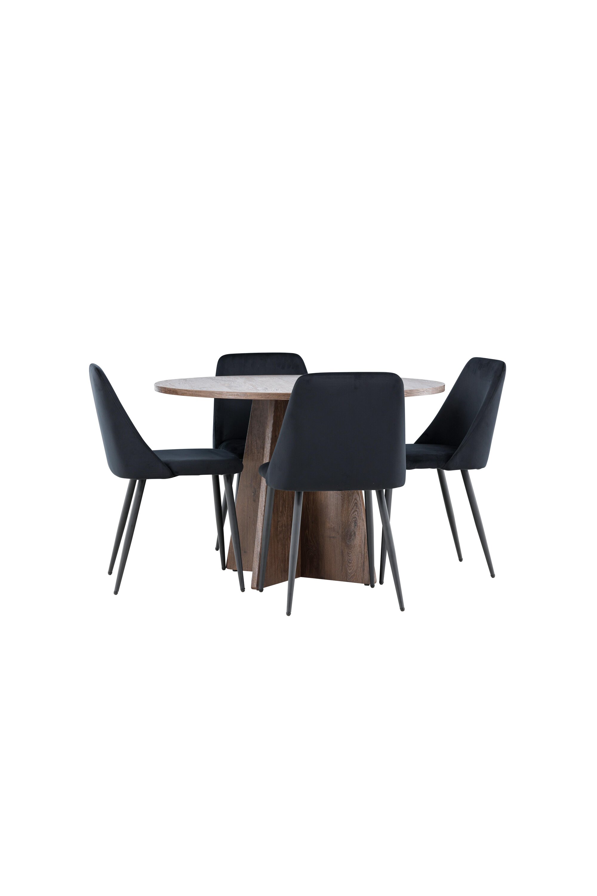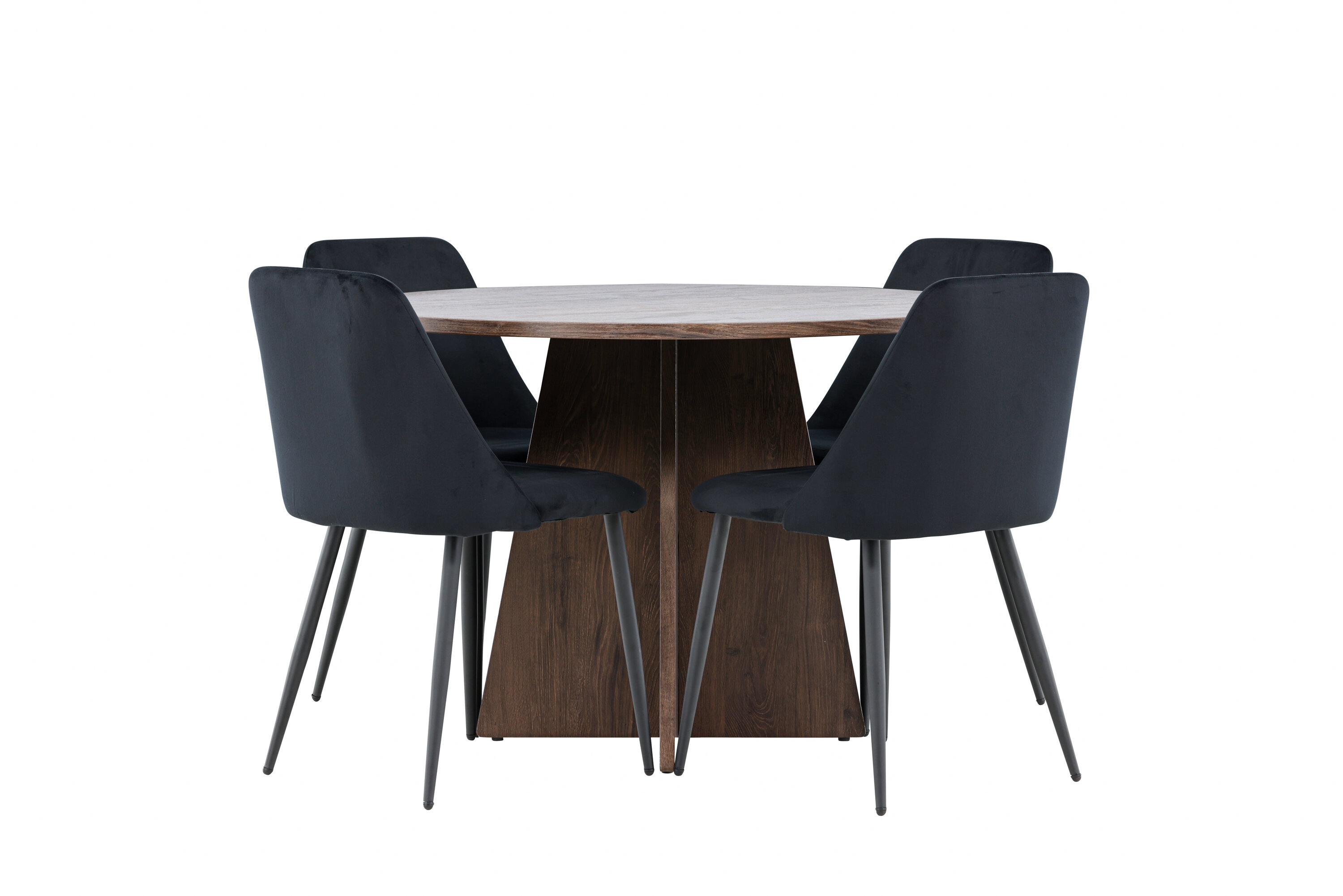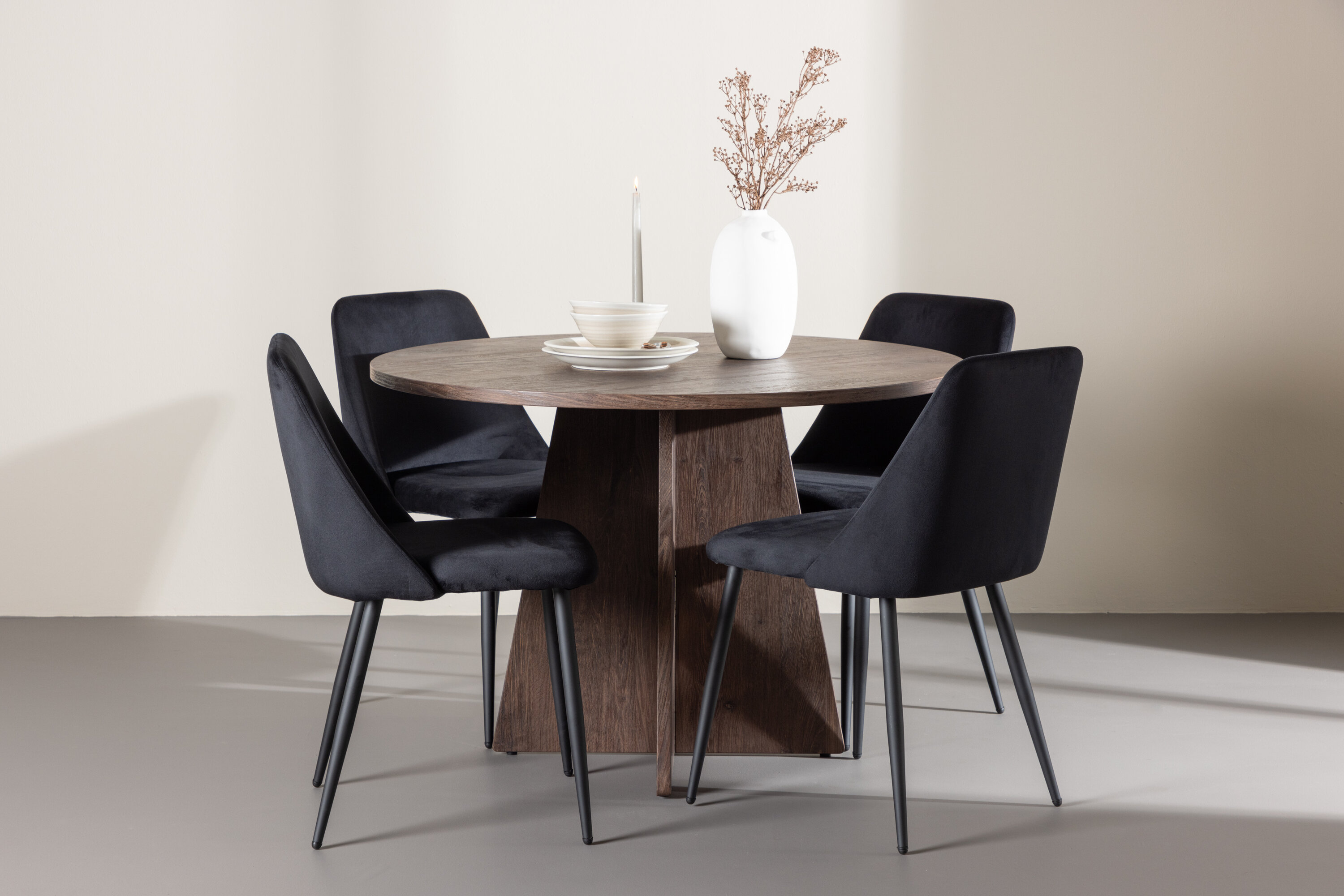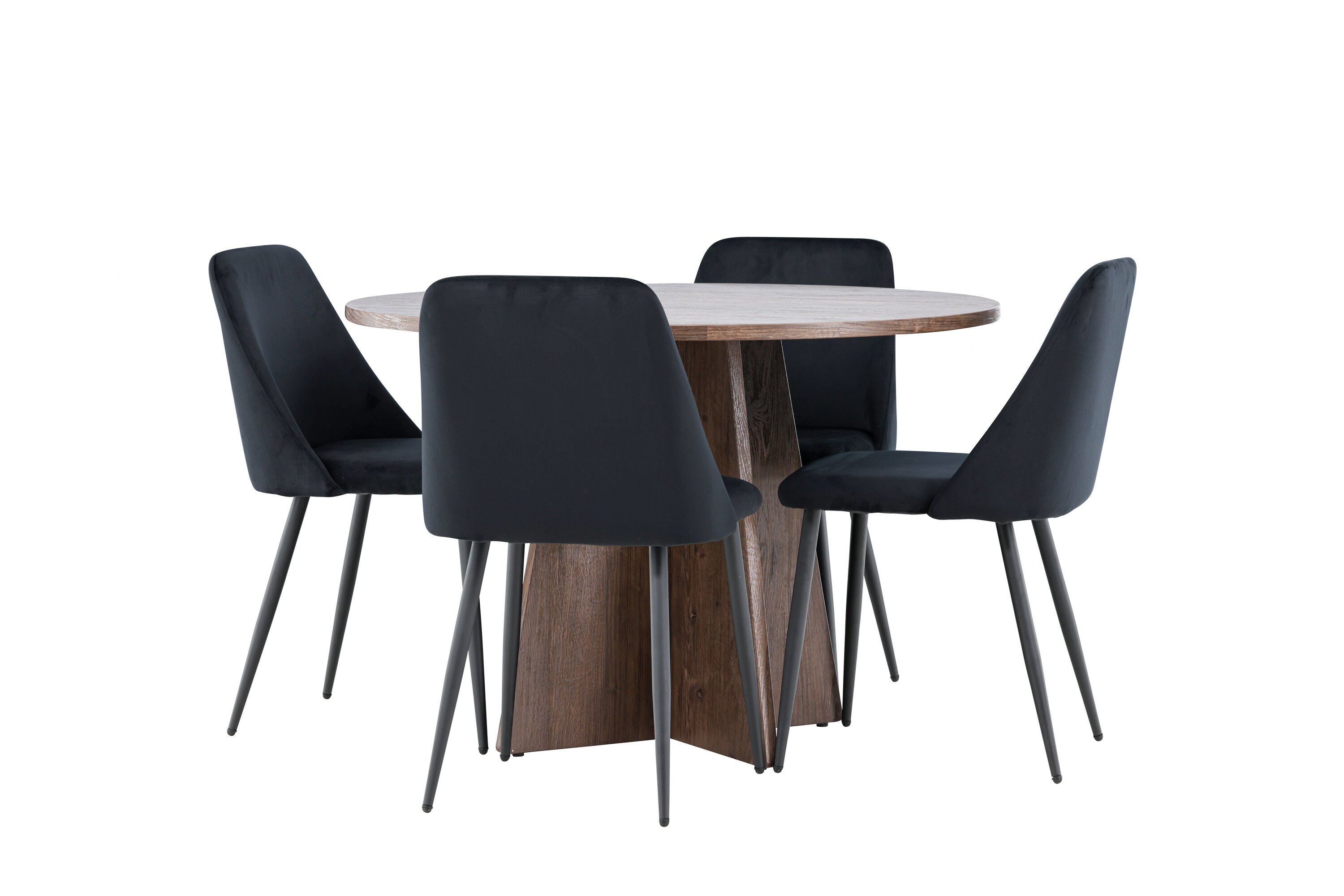 Muutke oma söögituba meie elegantse söögikomplektiga, mis ühendab elegantse Bootcut laua luksuslike öötoolidega. See söögikomplekt sobib suurepäraselt nii igapäevasteks eineteks kui ka pidulikeks sündmusteks, andes teie söögitoale peene ja kutsuva tunde. Bootcut laud on valmistatud MDF-st ja on kauni mokavärviga. 110 cm läbimõõduga pakub see palju ruumi söögiks ja vestluseks, samas kui selle ümar kuju loob teie söögituppa harmoonilise ja tasakaalustatud atmosfääri. Tugev konstruktsioon tagab pikaajalise kasutuse ja stabiilsuse. Neli Night-tooli täiendavad oma elegantsete musta sametist istmetega ideaalselt lauda. Toolid pakuvad nii mugavust kui ka stiili, mistõttu on need ideaalsed pikkadeks lõõgastavateks õhtusöökideks pere ja sõpradega. Nende kaasaegne disain koos kõrgete seljatugede ja pehmete istmetega lisab teie söögitoale rafineeritud hõngu. See söögikomplekt on täiuslik kombinatsioon esteetikast ja funktsionaalsusest, mistõttu on see suurepärane valik neile, kes soovivad elegantset ja mugavat söögituba. Täiendage oma söögituba stiilse Bootcuti laua ja öötoolide kombinatsiooniga ning looge koht, kus jagatakse mälestusi ja rõõmu.
