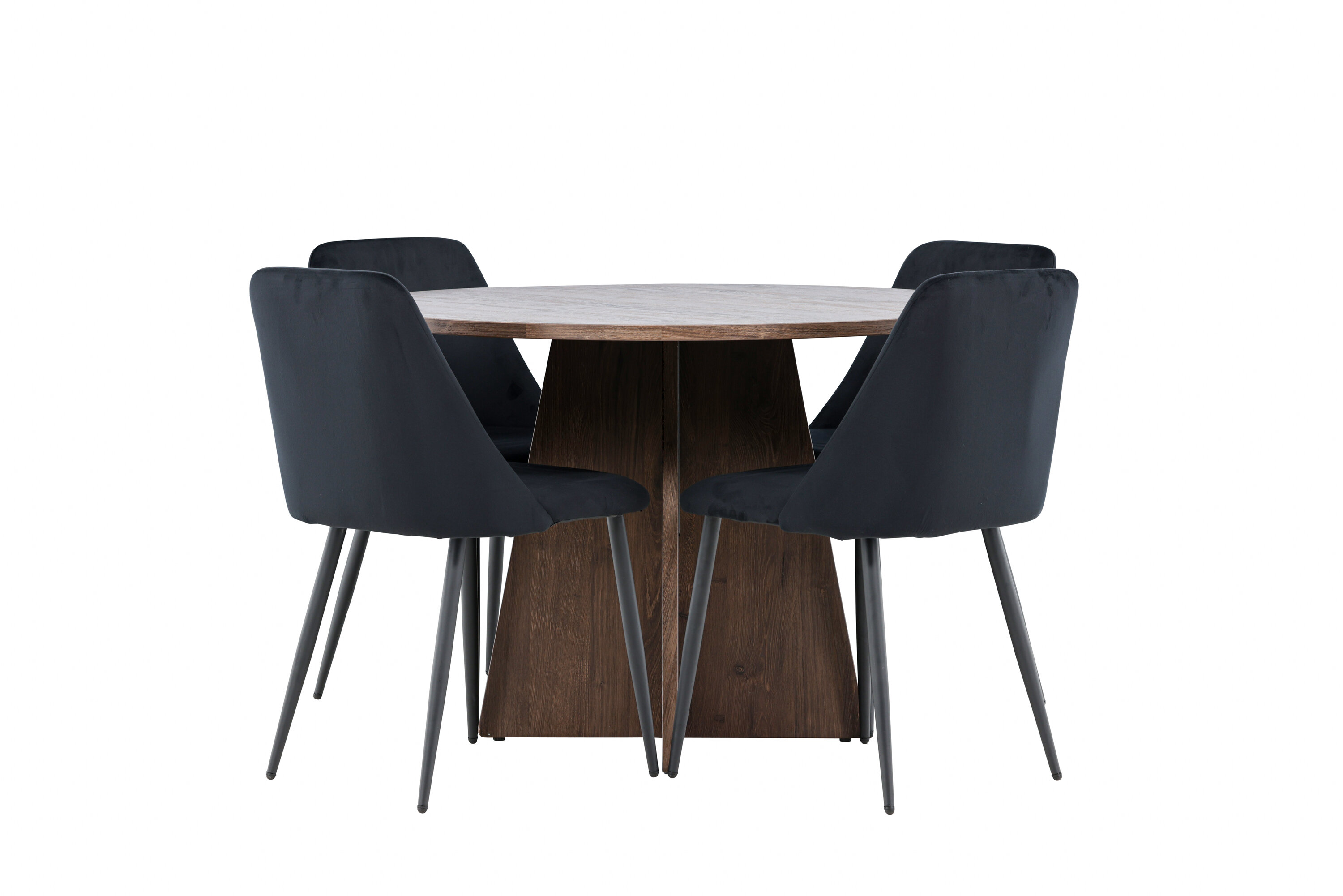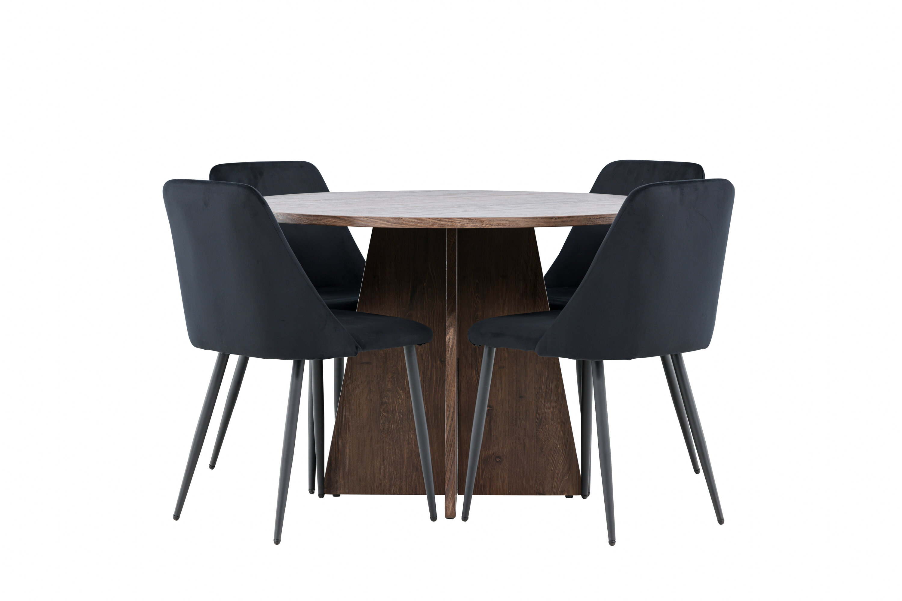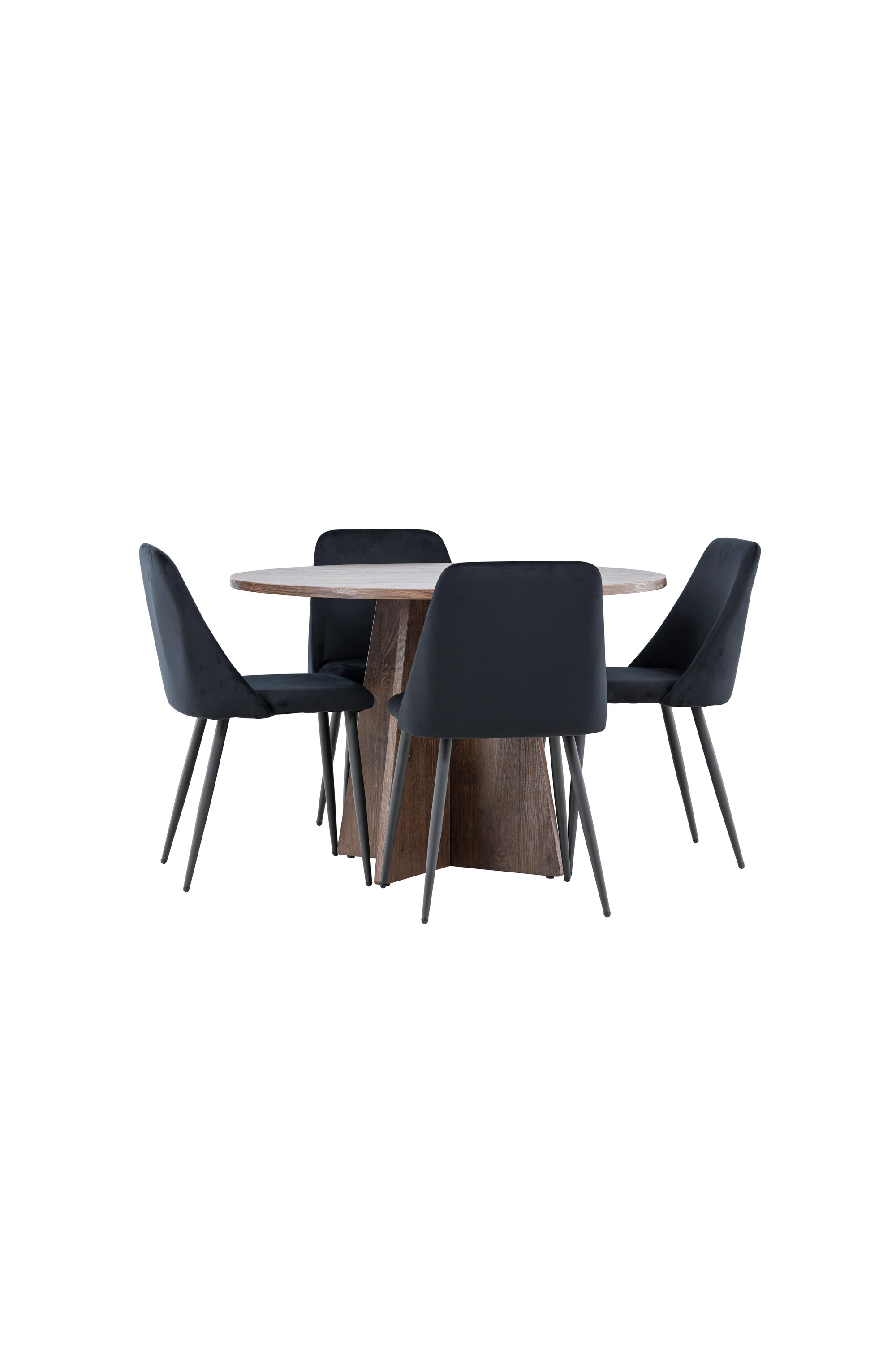Muutke oma söögituba meie elegantse söögikomplektiga, mis ühendab elegantse Bootcut laua luksuslike öötoolidega. See söögikomplekt sobib suurepäraselt nii igapäevasteks eineteks kui ka pidulikeks sündmusteks, andes teie söögitoale peene ja kutsuva tunde. Bootcut laud on valmistatud MDF-st ja on kauni mokavärviga. 110 cm läbimõõduga pakub see palju ruumi söögiks ja vestluseks, samas kui selle ümar kuju loob teie söögituppa harmoonilise ja tasakaalustatud atmosfääri. Tugev konstruktsioon tagab pikaajalise kasutuse ja stabiilsuse. Neli Night-tooli täiendavad oma elegantsete musta sametist istmetega ideaalselt lauda. Toolid pakuvad nii mugavust kui ka stiili, mistõttu on need ideaalsed pikkadeks lõõgastavateks õhtusöökideks pere ja sõpradega. Nende kaasaegne disain koos kõrgete seljatugede ja pehmete istmetega lisab teie söögitoale rafineeritud hõngu. See söögikomplekt on täiuslik kombinatsioon esteetikast ja funktsionaalsusest, mistõttu on see suurepärane valik neile, kes soovivad elegantset ja mugavat söögituba. Täiendage oma söögituba stiilse Bootcuti laua ja öötoolide kombinatsiooniga ning looge koht, kus jagatakse mälestusi ja rõõmu.