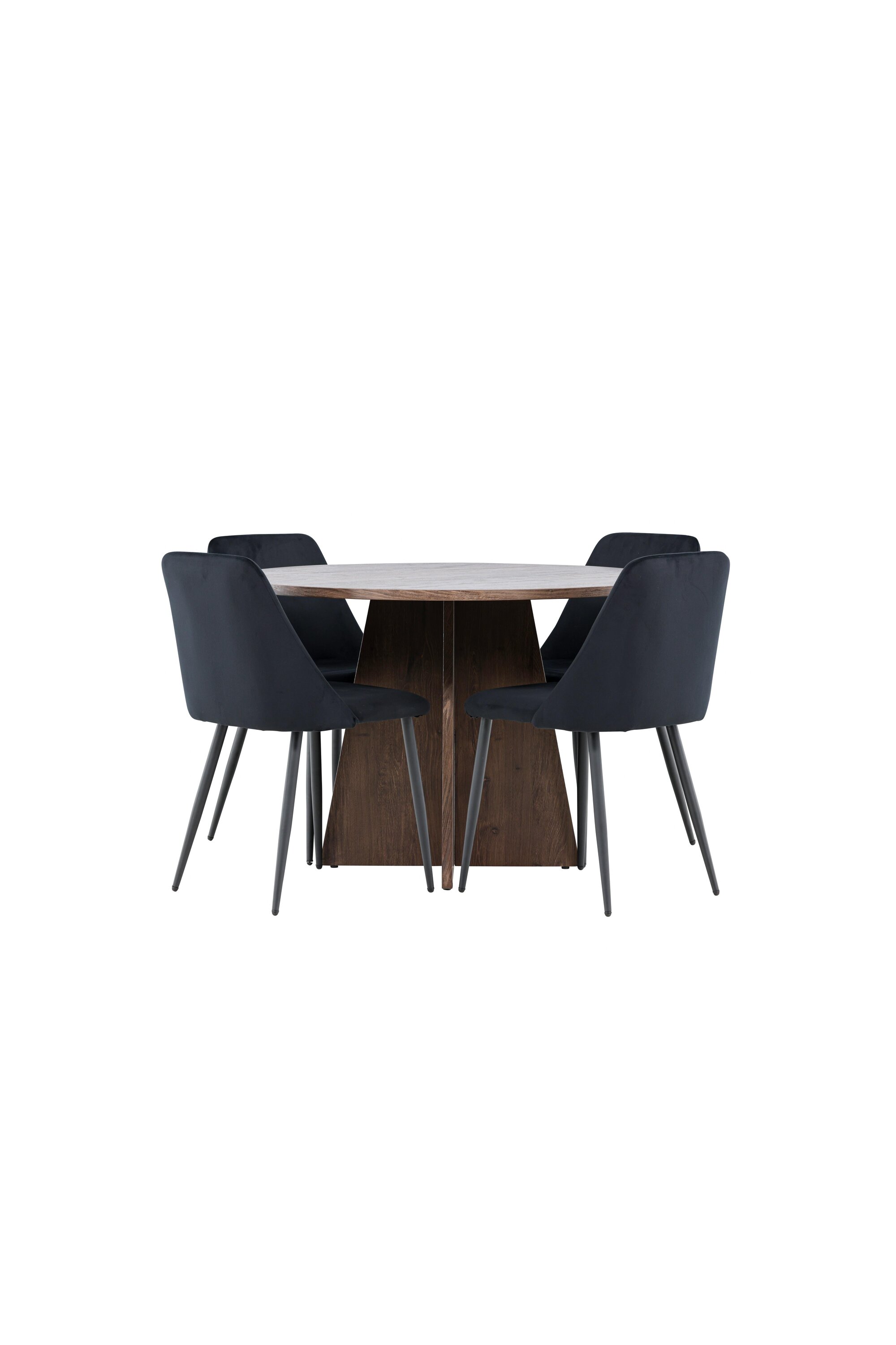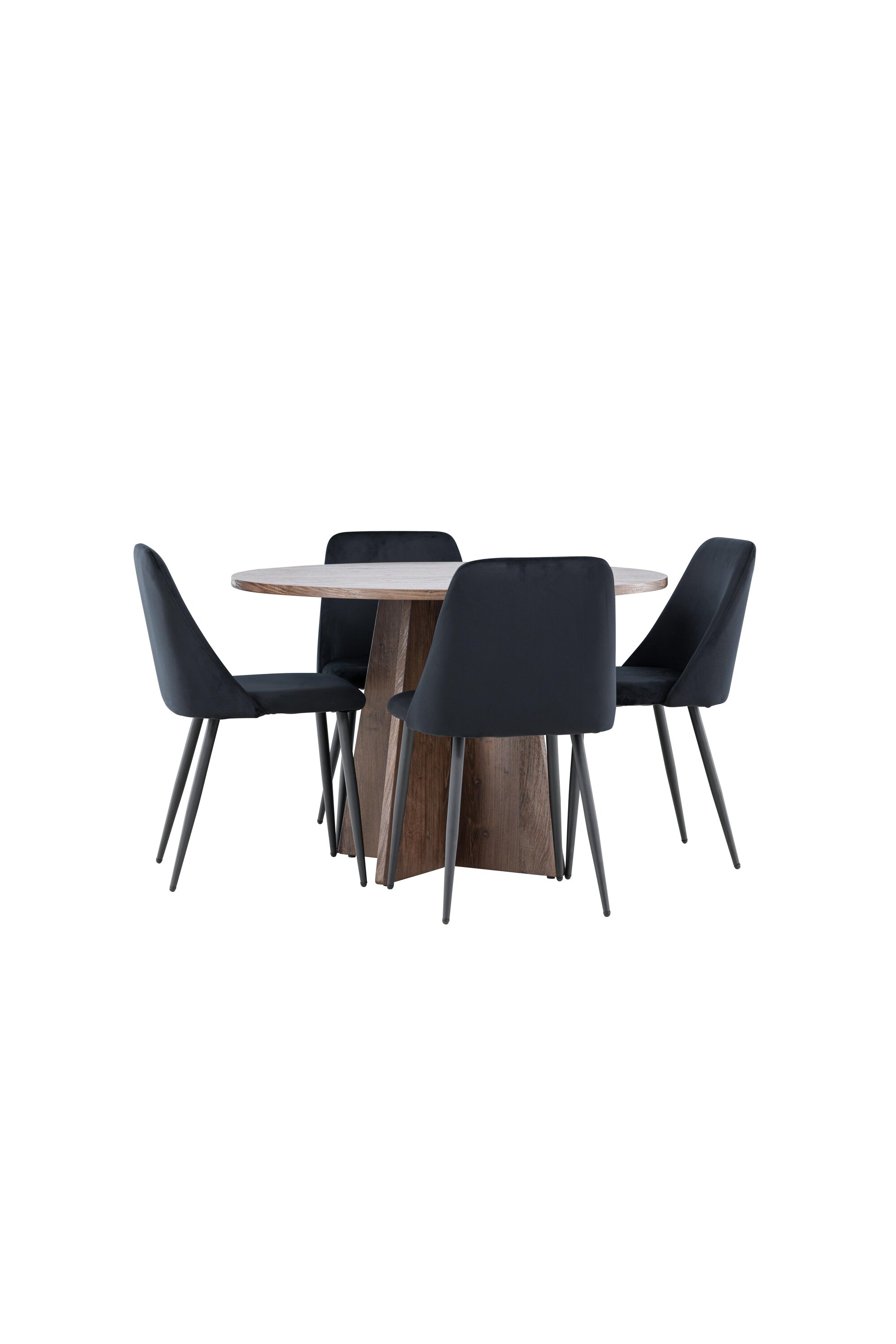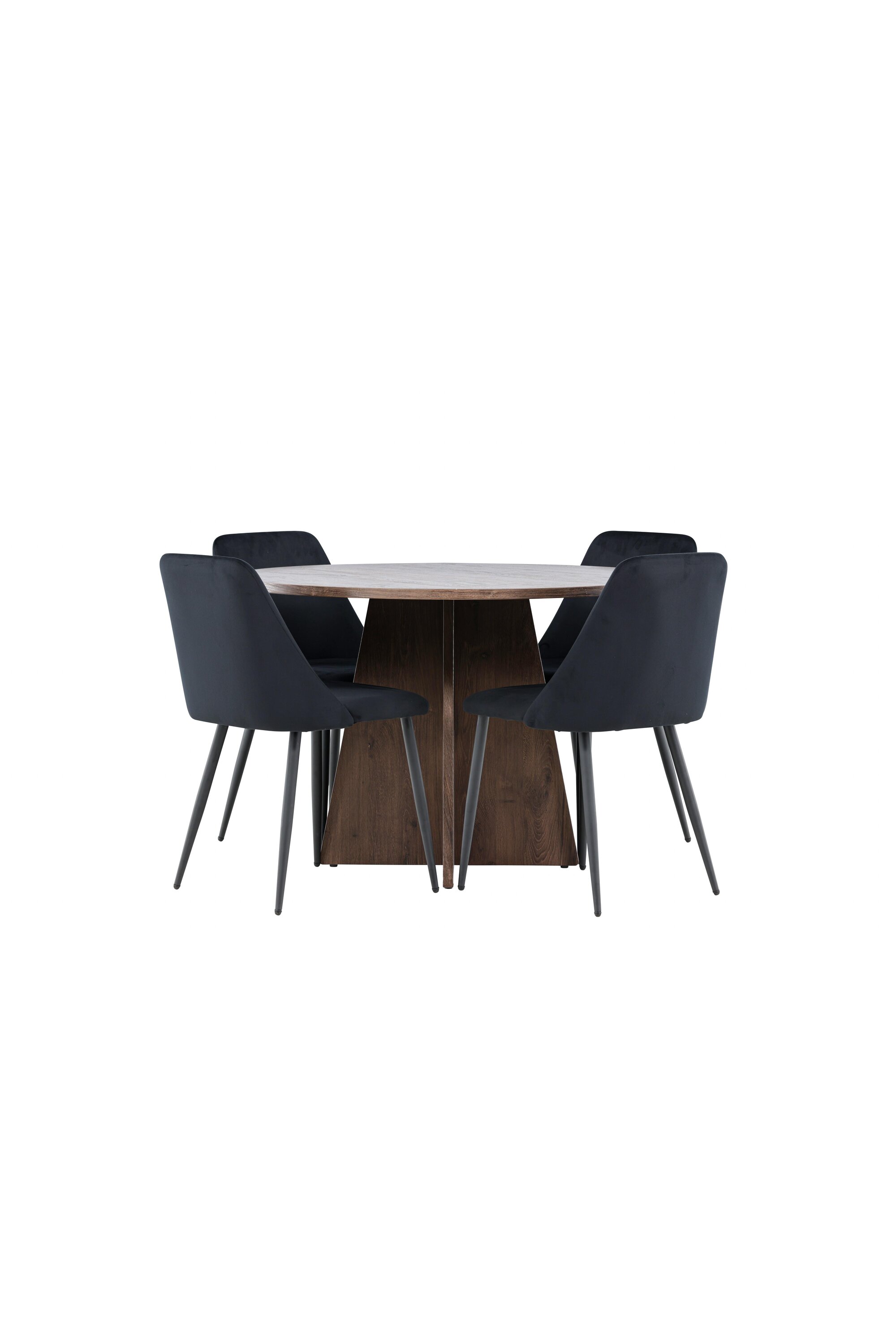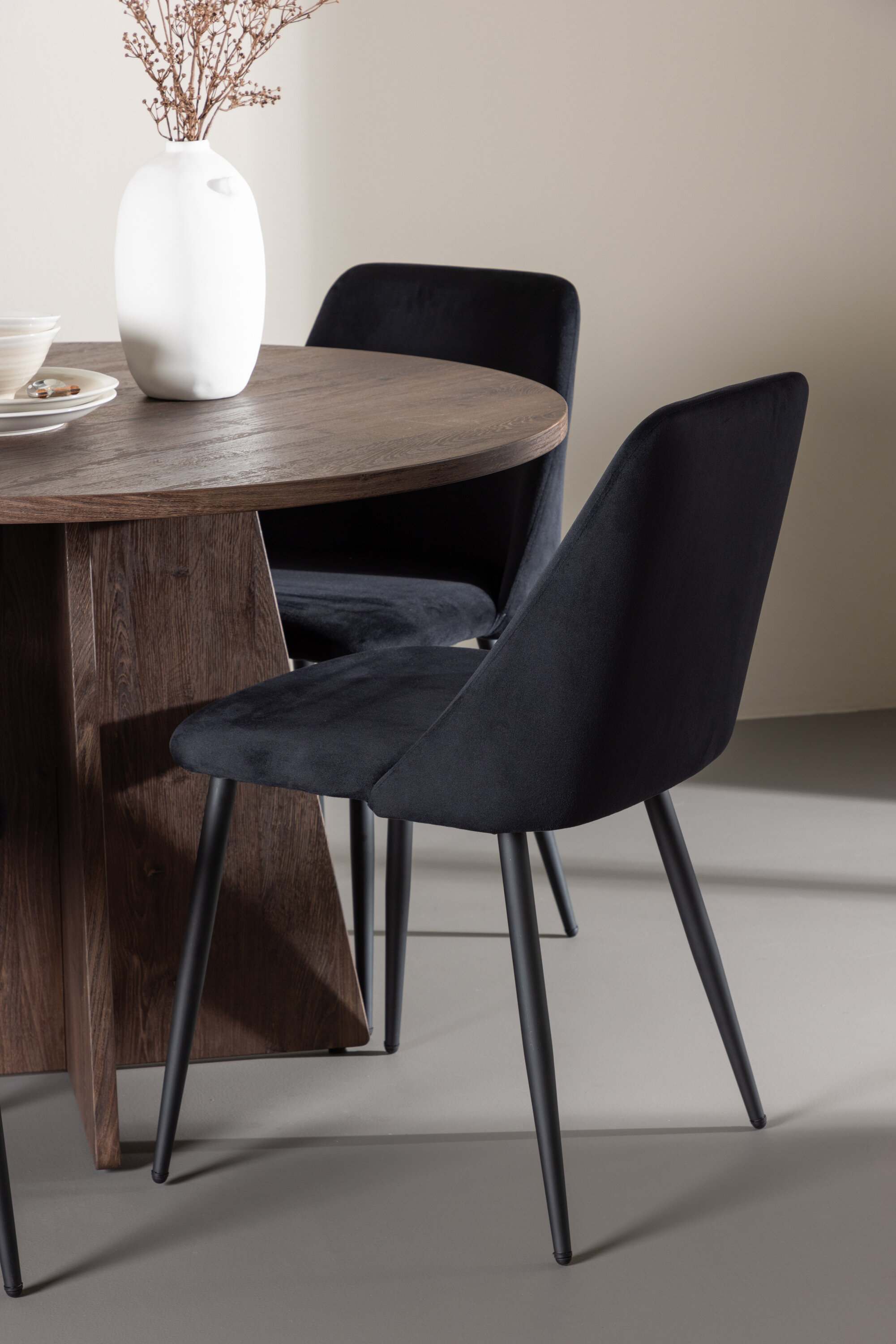 Muutke oma söögituba meie elegantse söögikomplektiga, mis ühendab elegantse Bootcut laua luksuslike öötoolidega. See söögikomplekt sobib suurepäraselt nii igapäevasteks eineteks kui ka pidulikeks sündmusteks, andes teie söögitoale peene ja kutsuva tunde. Bootcut laud on valmistatud MDF-st ja on kauni mokavärviga. 110 cm läbimõõduga pakub see palju ruumi söögiks ja vestluseks, samas kui selle ümar kuju loob teie söögituppa harmoonilise ja tasakaalustatud atmosfääri. Tugev konstruktsioon tagab pikaajalise kasutuse ja stabiilsuse. Neli Night-tooli täiendavad oma elegantsete musta sametist istmetega ideaalselt lauda. Toolid pakuvad nii mugavust kui ka stiili, mistõttu on need ideaalsed pikkadeks lõõgastavateks õhtusöökideks pere ja sõpradega. Nende kaasaegne disain koos kõrgete seljatugede ja pehmete istmetega lisab teie söögitoale rafineeritud hõngu. See söögikomplekt on täiuslik kombinatsioon esteetikast ja funktsionaalsusest, mistõttu on see suurepärane valik neile, kes soovivad elegantset ja mugavat söögituba. Täiendage oma söögituba stiilse Bootcuti laua ja öötoolide kombinatsiooniga ning looge koht, kus jagatakse mälestusi ja rõõmu.