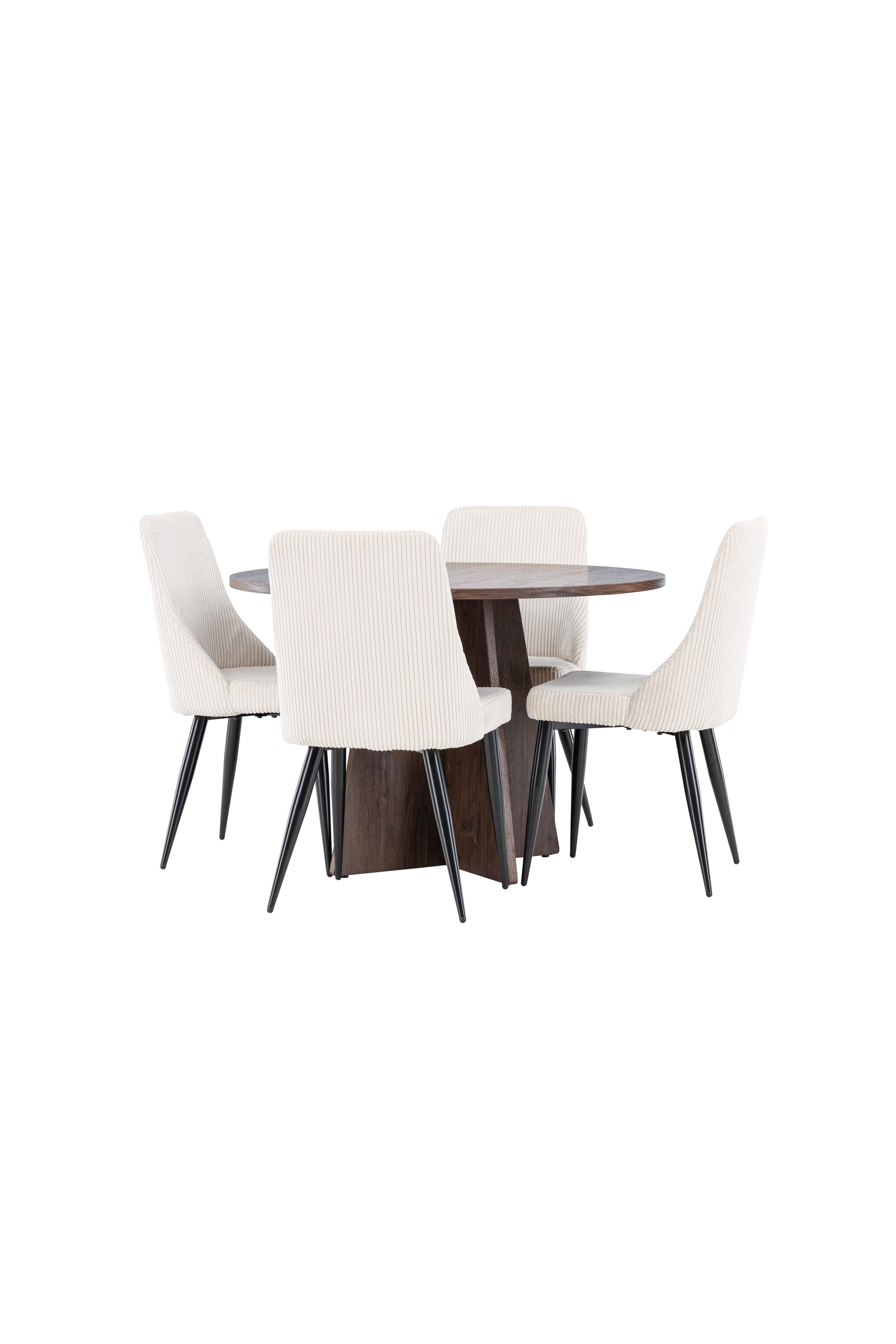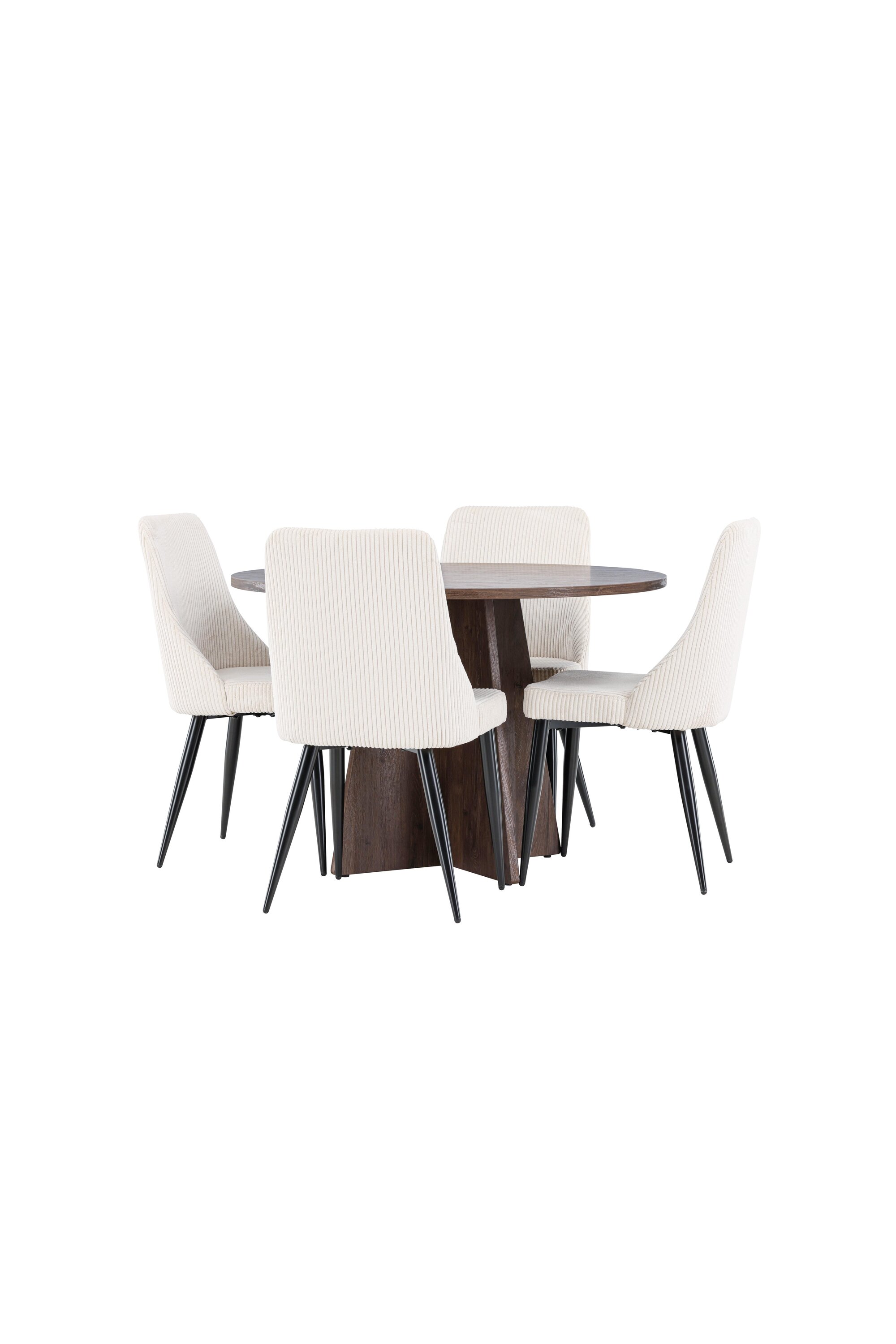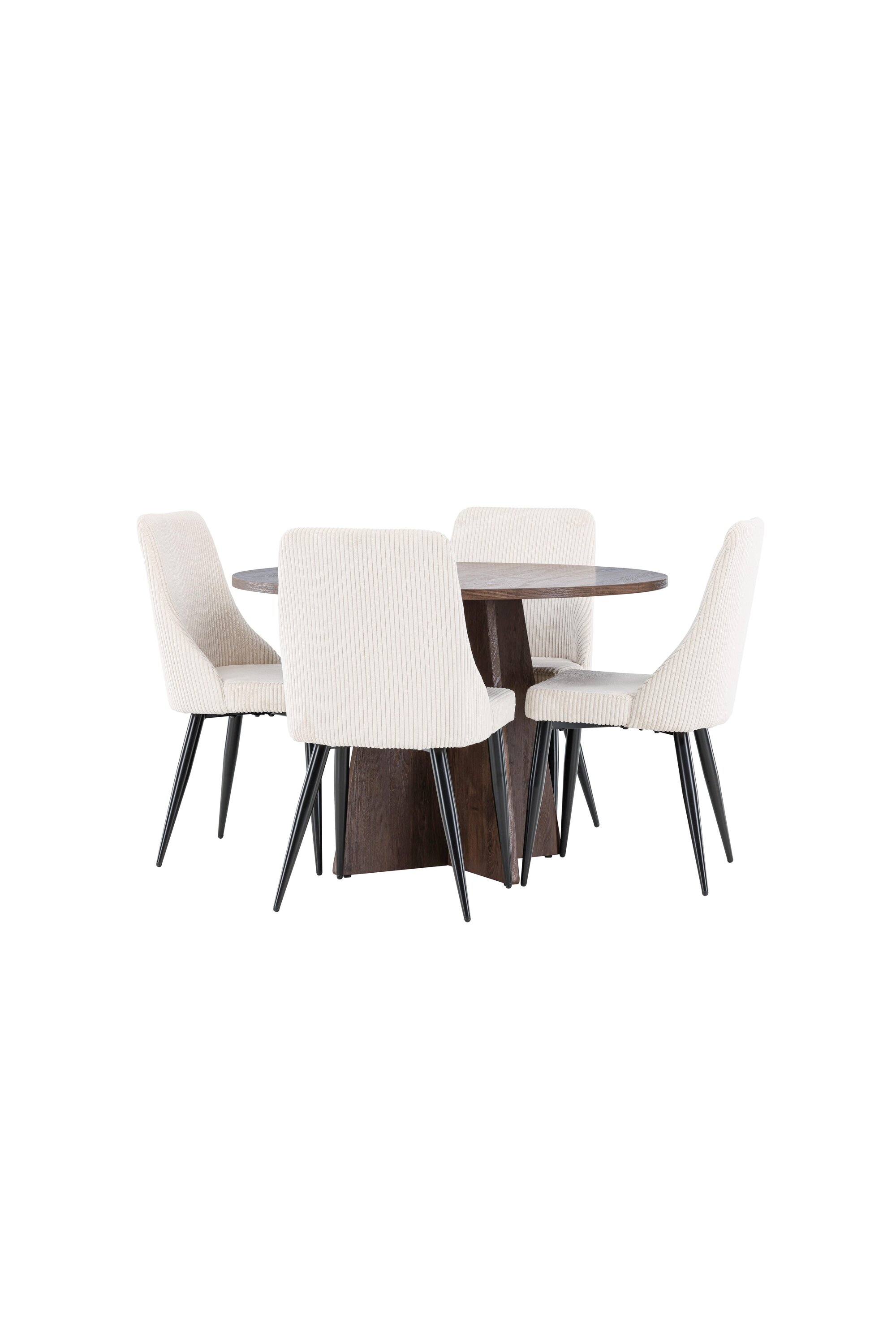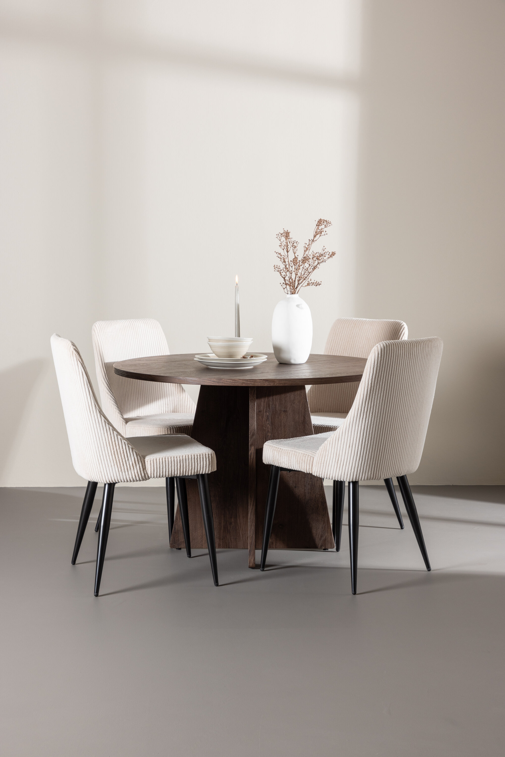 Muutke oma söögituba meie elegantse söögikomplektiga, mis ühendab elegantse Bootcuti laua ja keerukate Leone toolidega. See söögikomplekt sobib ideaalselt nii igapäevaseks söömiseks kui ka pidulikeks sündmusteks, andes teie söögitoale kaasaegse ja kutsuva tunde. Bootcut laud on valmistatud MDF-st ja on kauni mokavärviga. 110 cm läbimõõduga pakub see palju ruumi söögiks ja vestluseks, samas kui selle ümar kuju loob teie söögituppa harmoonilise ja tasakaalustatud atmosfääri. Tugev konstruktsioon tagab pikaajalise kasutuse ja stabiilsuse. Neli Leone tooli täiendavad oma elegantsete beežide velvetist istmetega suurepäraselt lauda. Toolid pakuvad nii mugavust kui ka stiili, mistõttu on need ideaalsed pikkadeks lõõgastavateks õhtusöökideks pere ja sõpradega. Nende kaasaegne disain koos kõrgete seljatugede ja mugavate istmetega lisab teie söögitoale rafineeritud hõngu. See söögikomplekt on täiuslik kombinatsioon esteetikast ja funktsionaalsusest, mistõttu on see suurepärane valik neile, kes soovivad elegantset ja mugavat söögituba. Täiustage oma söögituba stiilse Bootcuti laua ja Leone toolide kombinatsiooniga ning looge koht, kus jagatakse mälestusi ja rõõmu.
