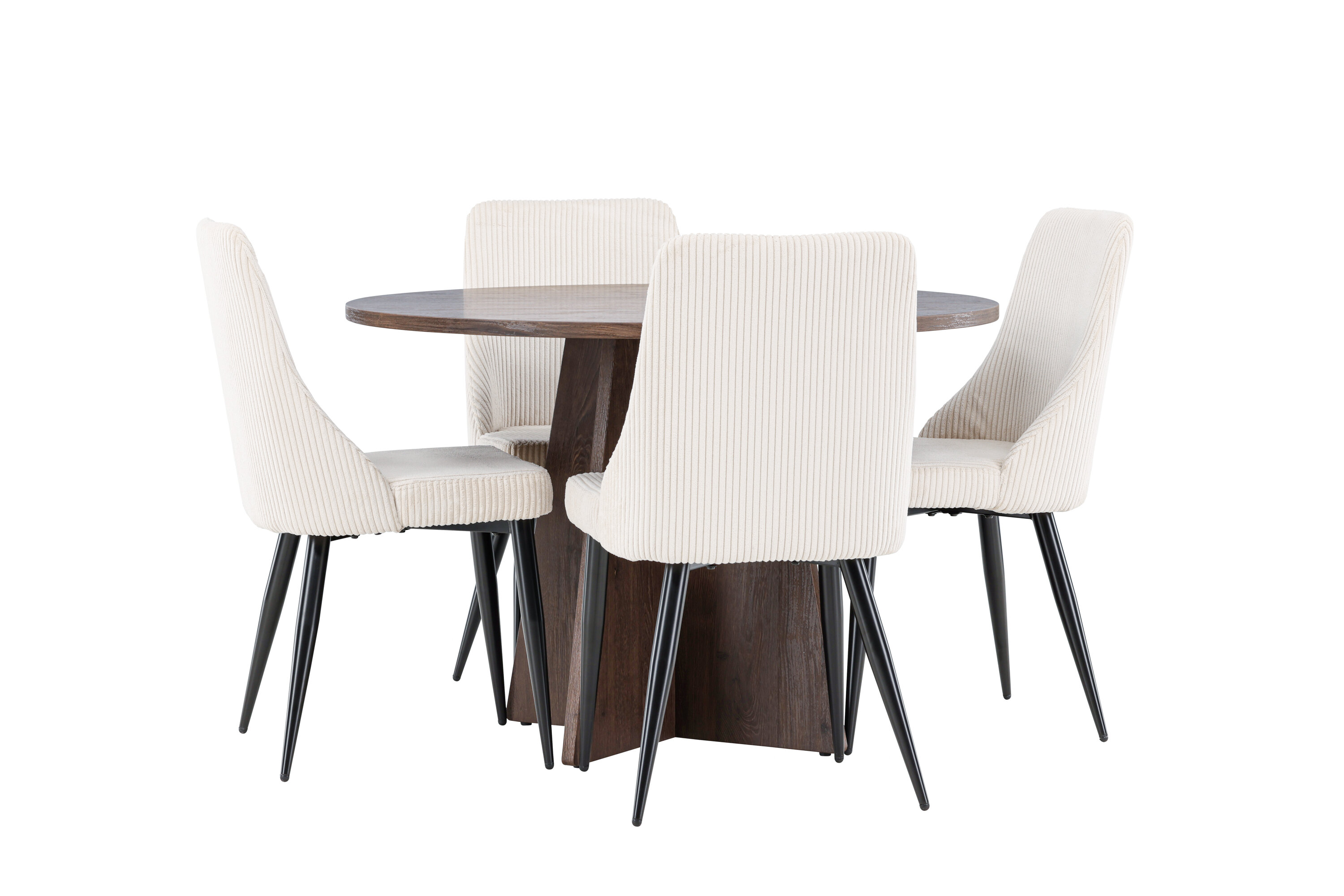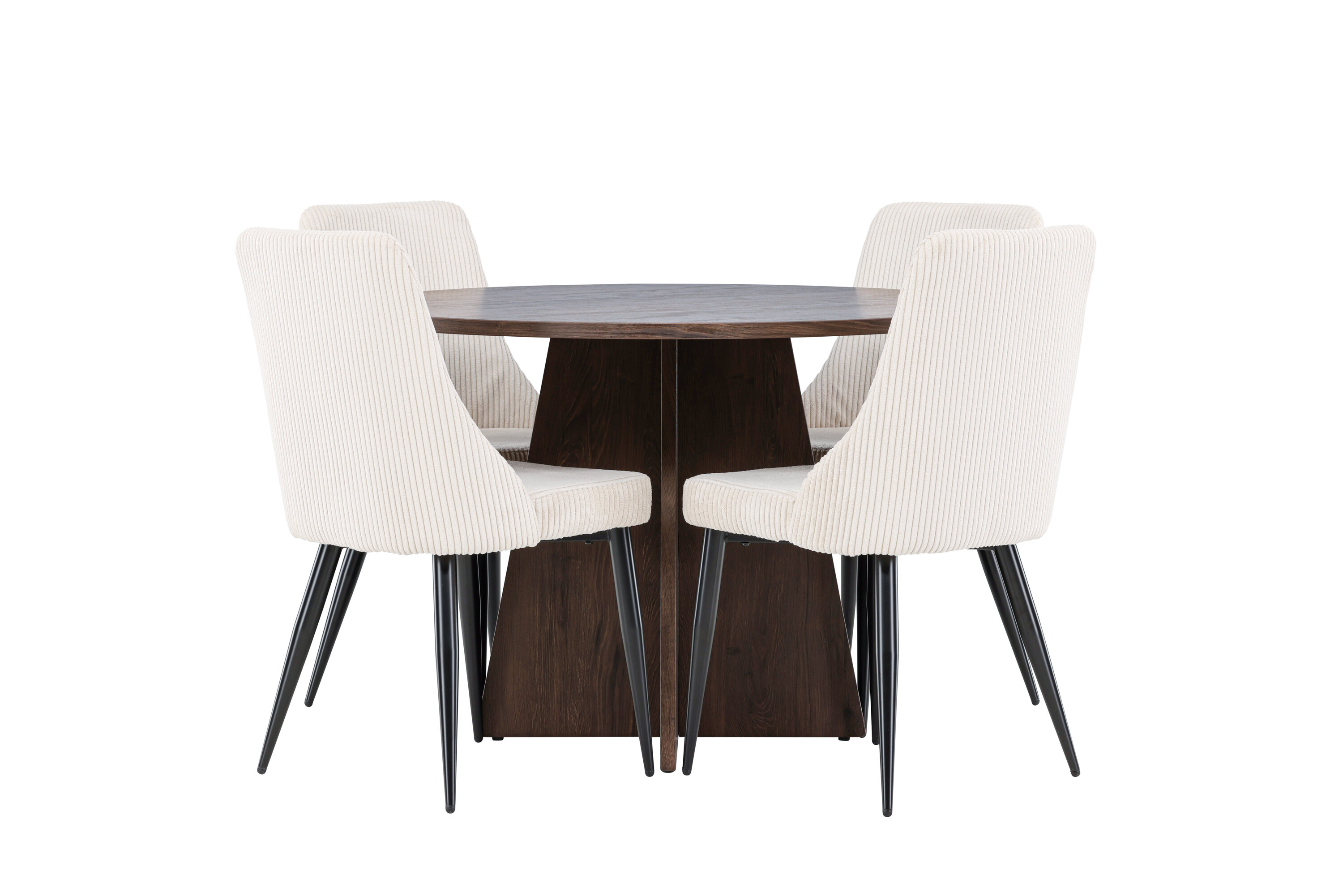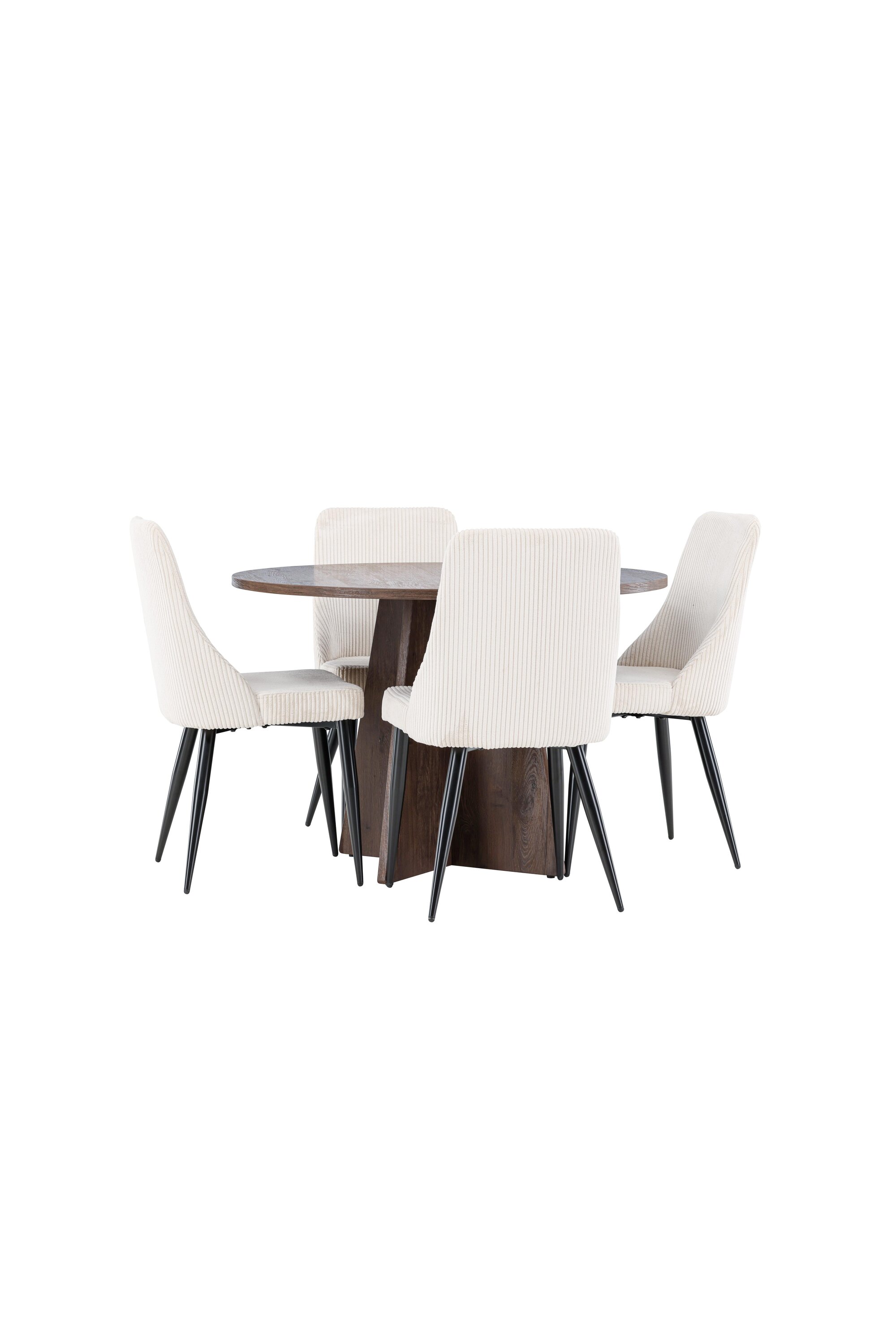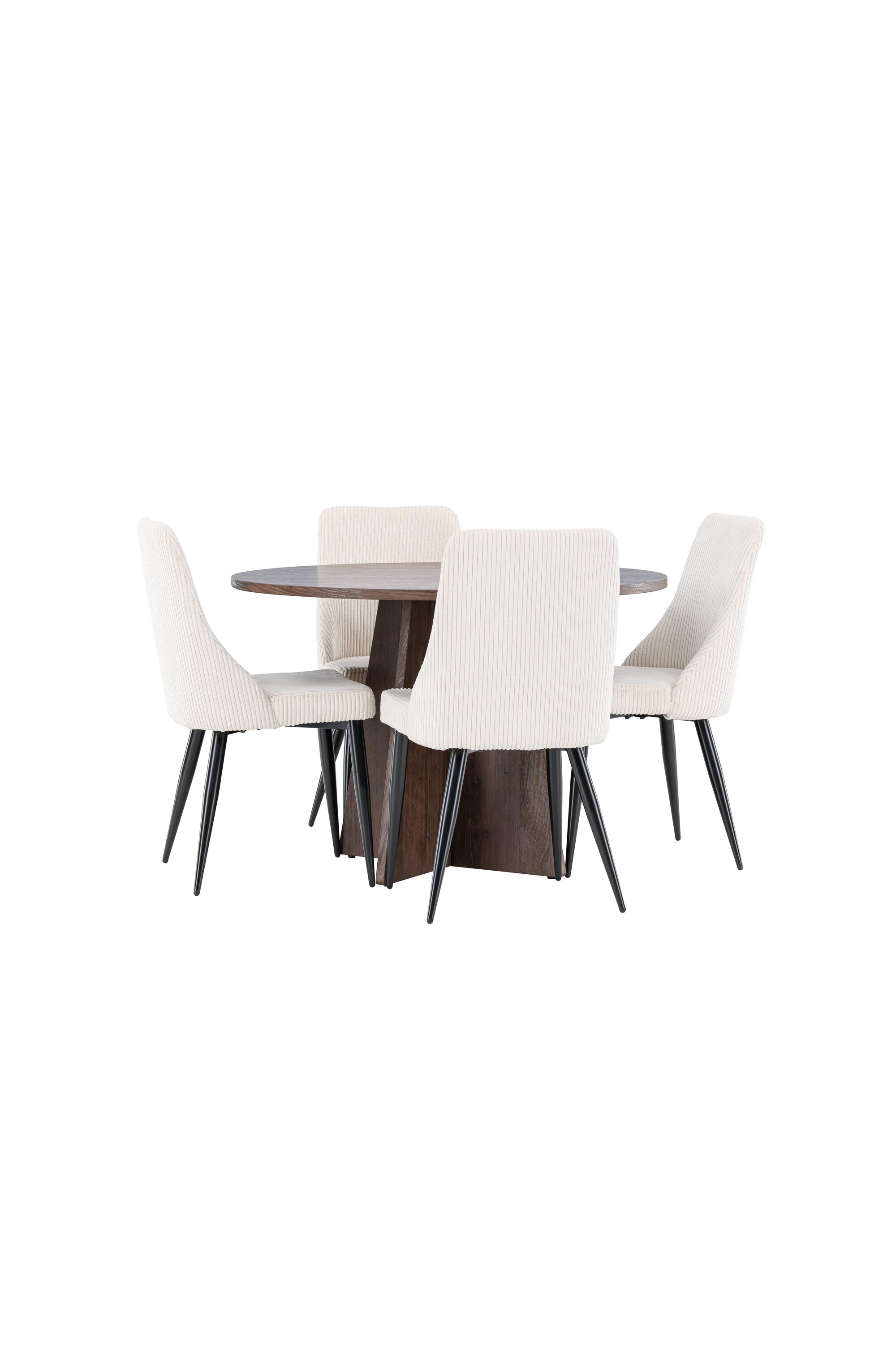 Muutke oma söögituba meie elegantse söögikomplektiga, mis ühendab elegantse Bootcuti laua ja keerukate Leone toolidega. See söögikomplekt sobib ideaalselt nii igapäevaseks söömiseks kui ka pidulikeks sündmusteks, andes teie söögitoale kaasaegse ja kutsuva tunde. Bootcut laud on valmistatud MDF-st ja on kauni mokavärviga. 110 cm läbimõõduga pakub see palju ruumi söögiks ja vestluseks, samas kui selle ümar kuju loob teie söögituppa harmoonilise ja tasakaalustatud atmosfääri. Tugev konstruktsioon tagab pikaajalise kasutuse ja stabiilsuse. Neli Leone tooli täiendavad oma elegantsete beežide velvetist istmetega suurepäraselt lauda. Toolid pakuvad nii mugavust kui ka stiili, mistõttu on need ideaalsed pikkadeks lõõgastavateks õhtusöökideks pere ja sõpradega. Nende kaasaegne disain koos kõrgete seljatugede ja mugavate istmetega lisab teie söögitoale rafineeritud hõngu. See söögikomplekt on täiuslik kombinatsioon esteetikast ja funktsionaalsusest, mistõttu on see suurepärane valik neile, kes soovivad elegantset ja mugavat söögituba. Täiustage oma söögituba stiilse Bootcuti laua ja Leone toolide kombinatsiooniga ning looge koht, kus jagatakse mälestusi ja rõõmu.