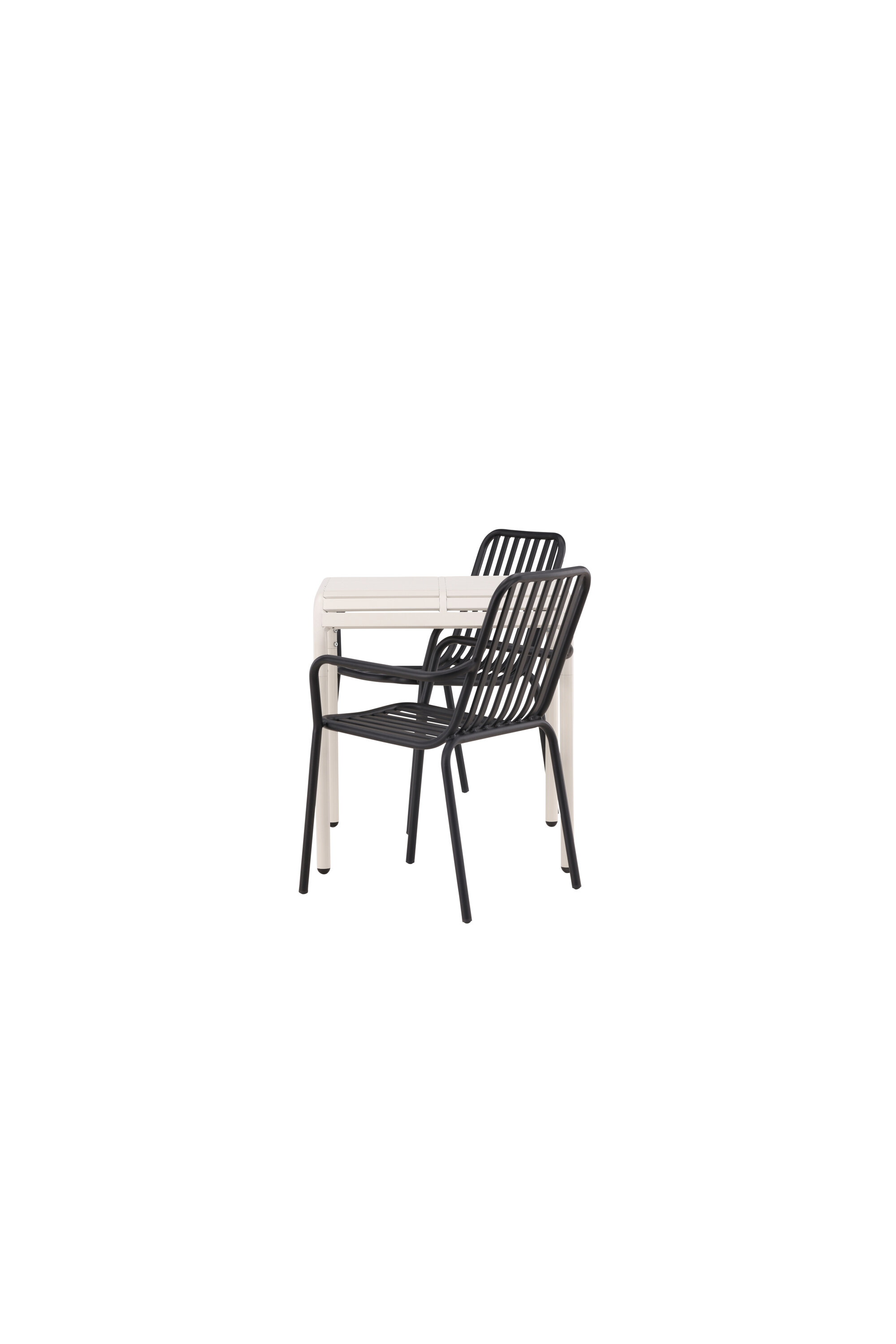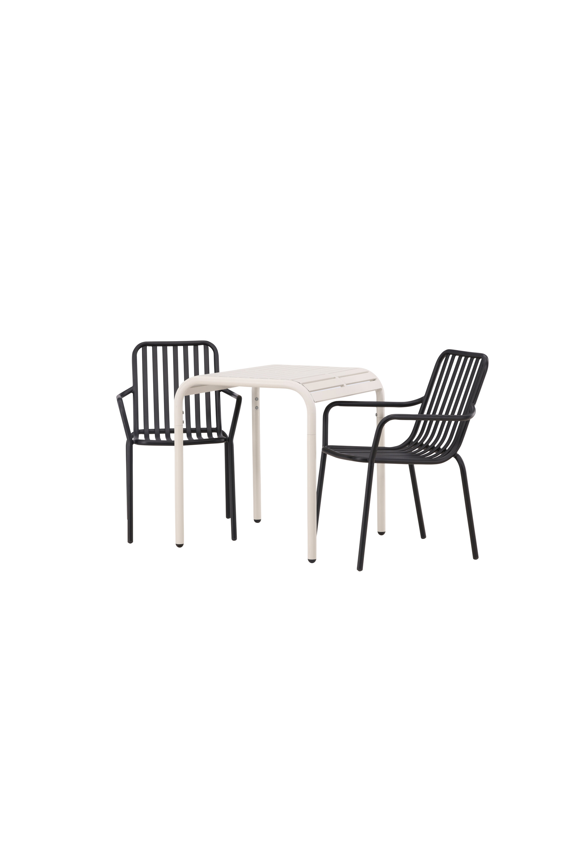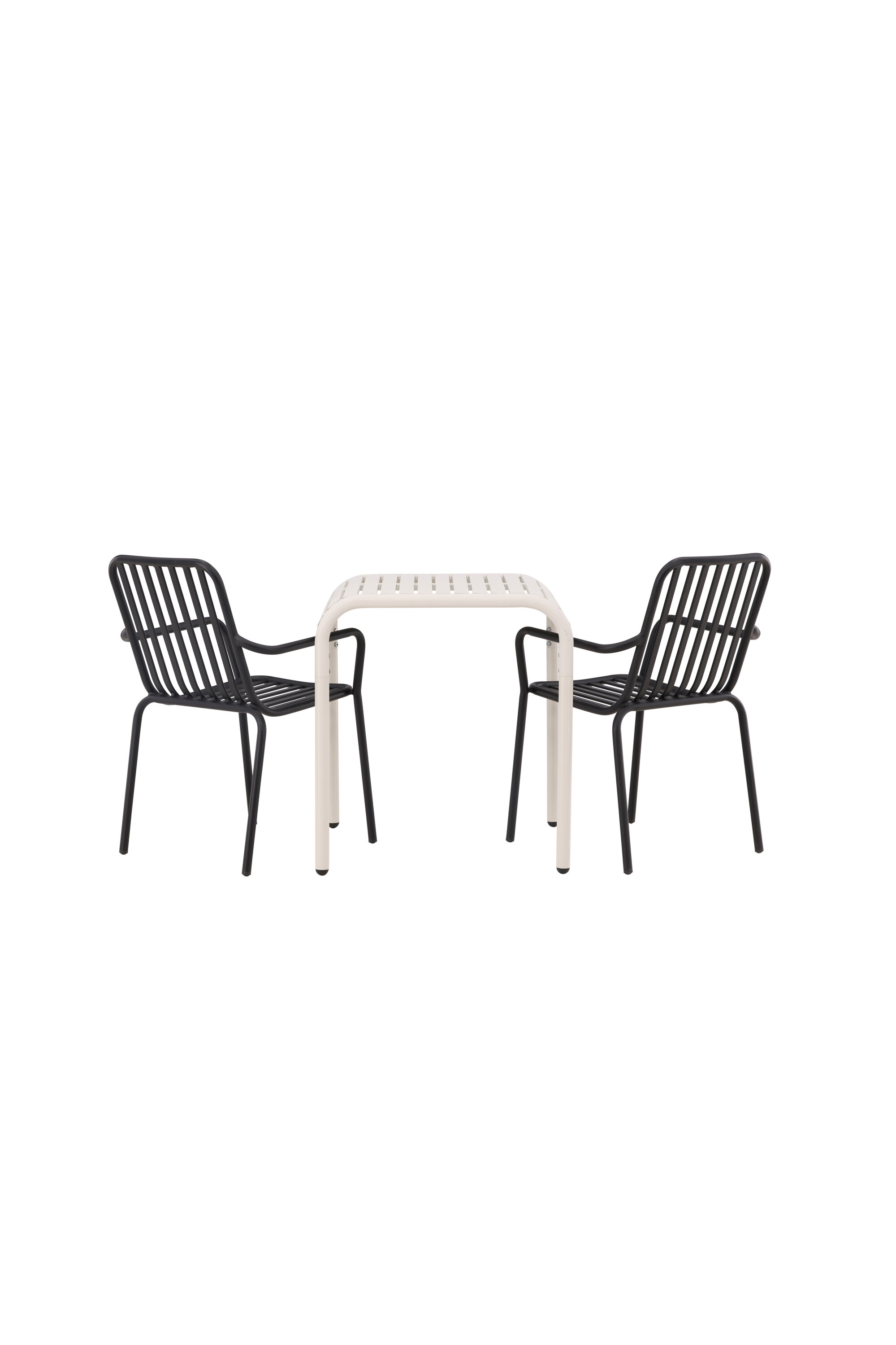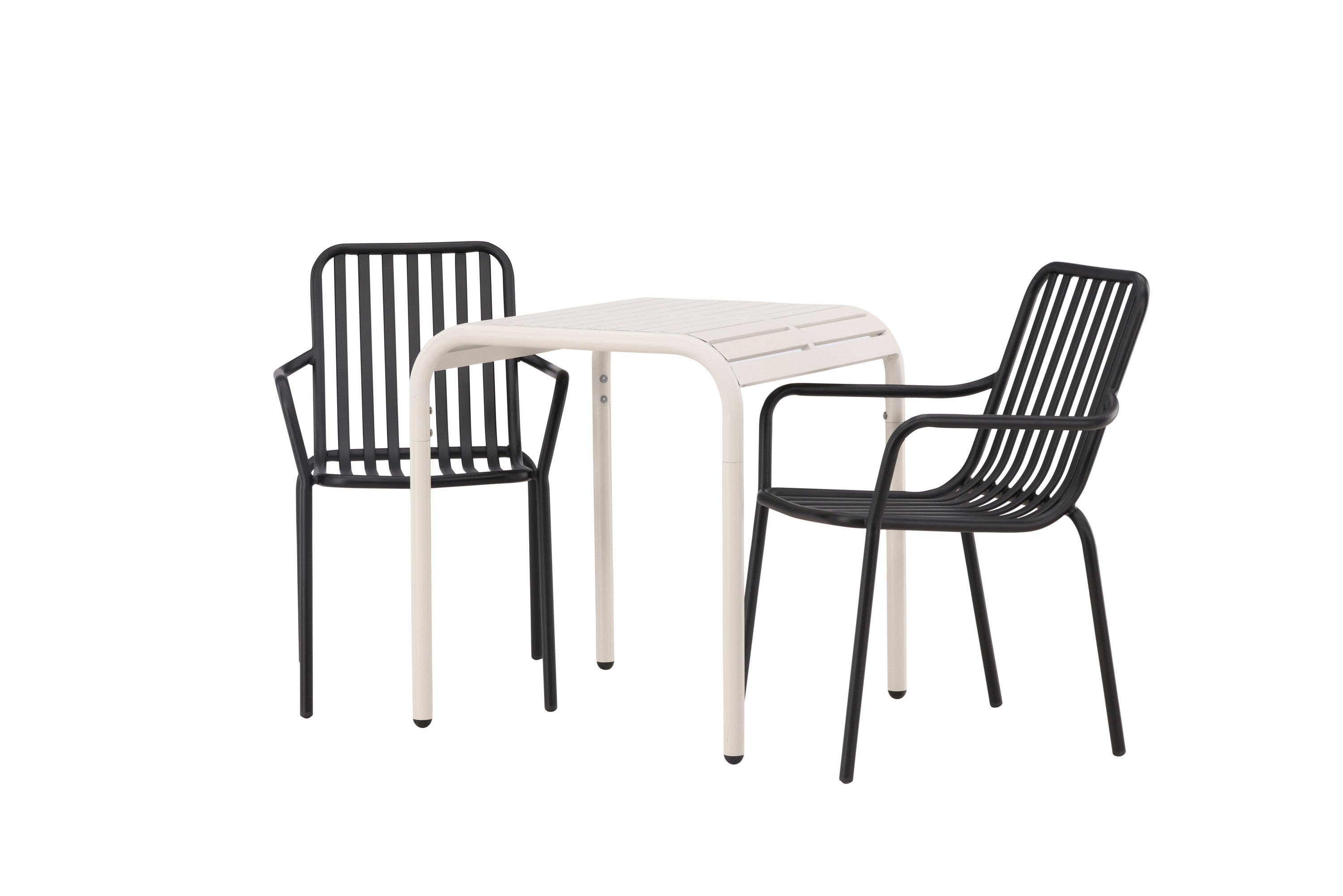 Kaasaegne ja kutsuv kohvikuseltskond, millest õhkub võlu! Borneo seeria laual on ajatu Skandinaavia disain. Lauaplaat on soonikkoes ja mööda servi allapoole lainetav. Kõik kokku valmistatud beežist alumiiniumist, mis annab teile vastupidava laua, mida on lihtne liigutada. Siin on stiilne kombinatsioon 2 Pekingi sarja söögitooliga. Alumiiniumist ja tahmamust värvi sooniline disain muudab tooli nii kaasaegse kui ka ajatu. Nautige oma lõunapausi sel suvel õues! Laua mõõdud: 70x70cm.