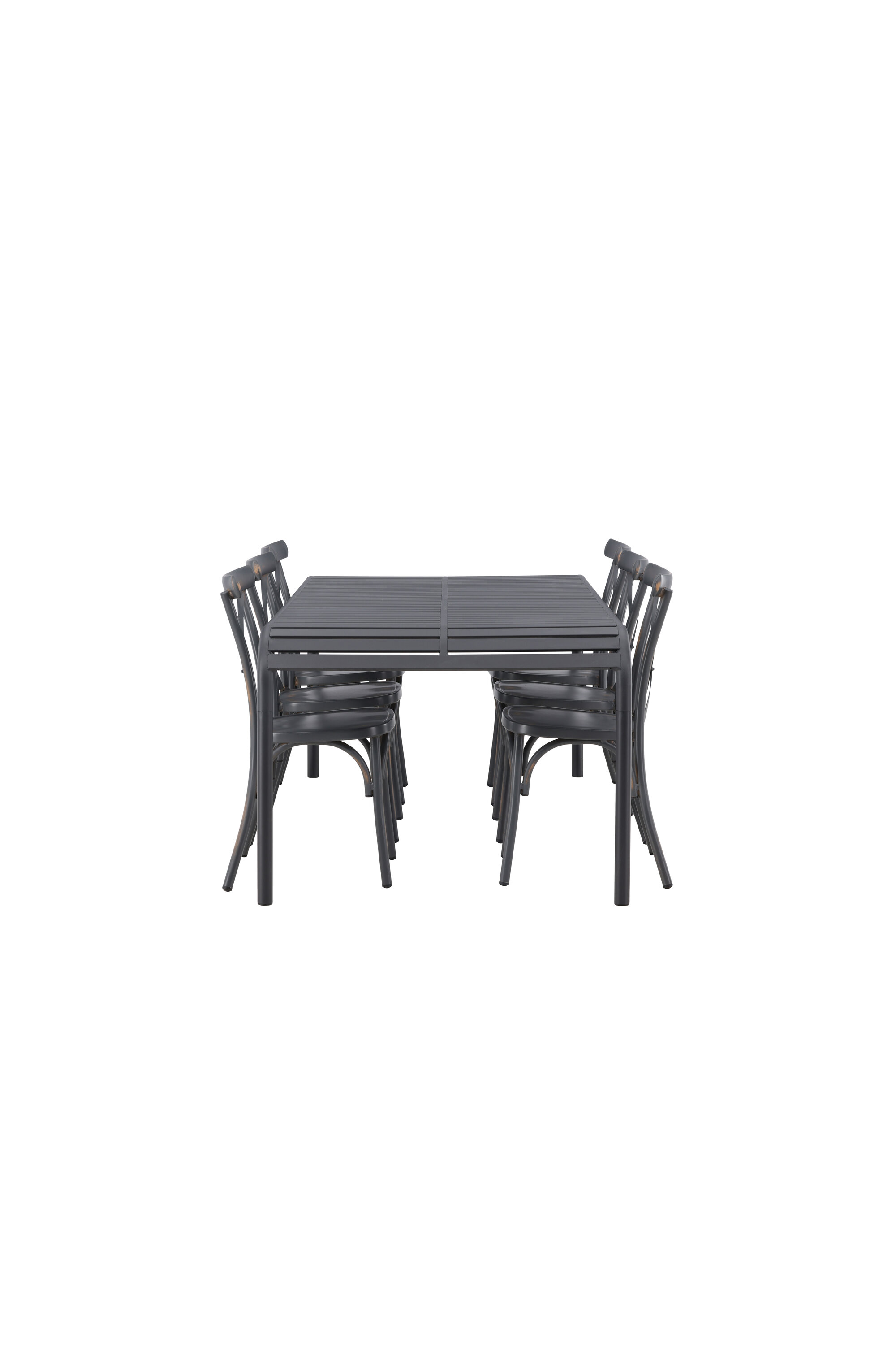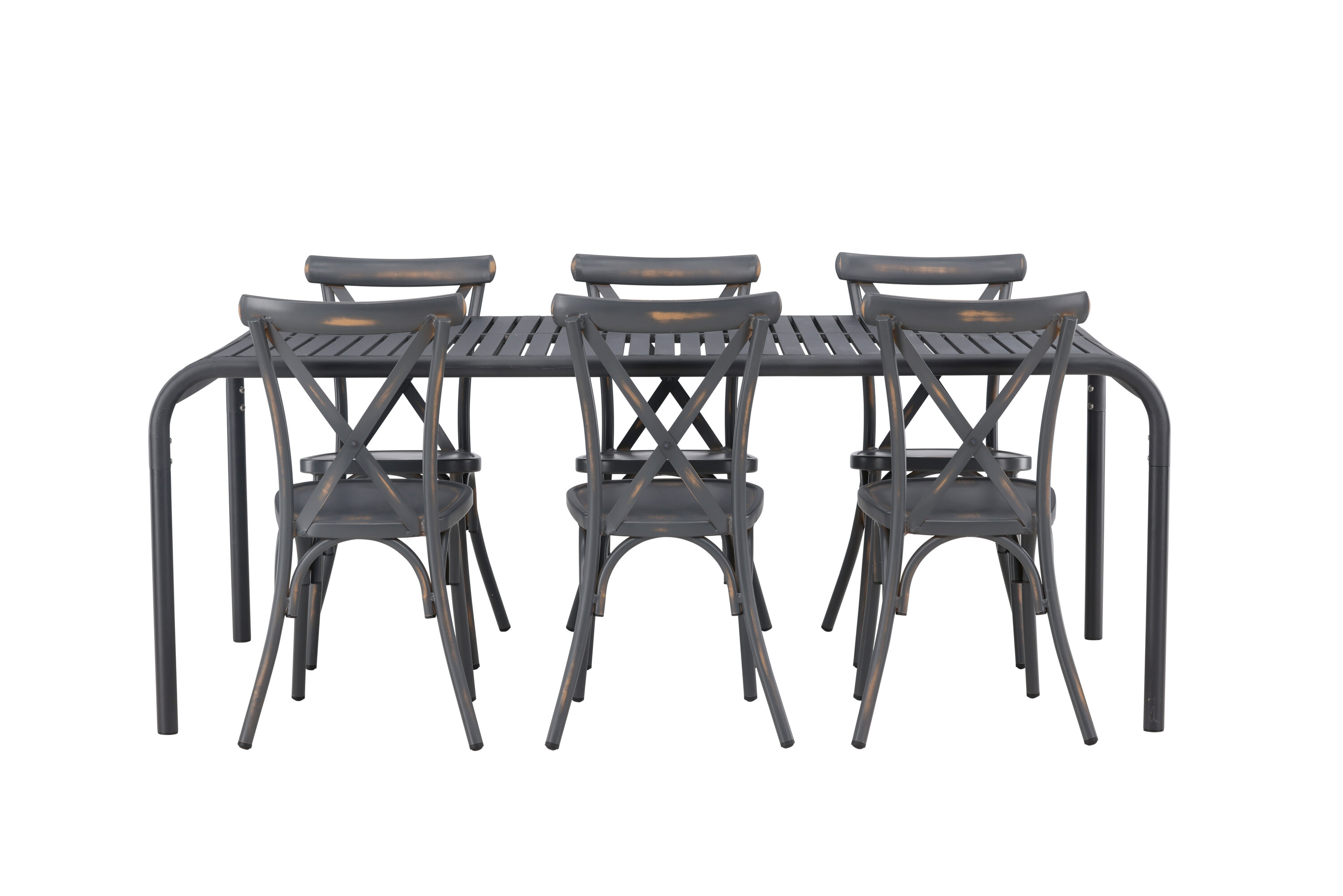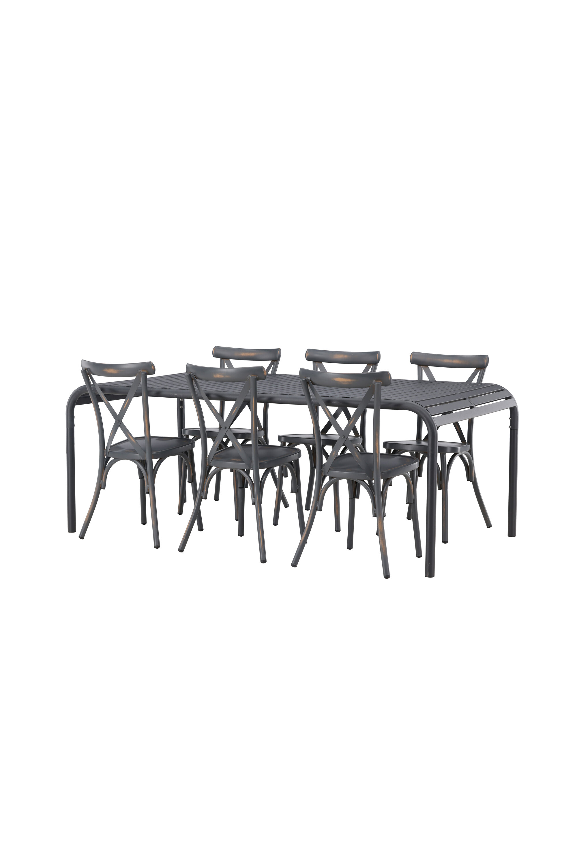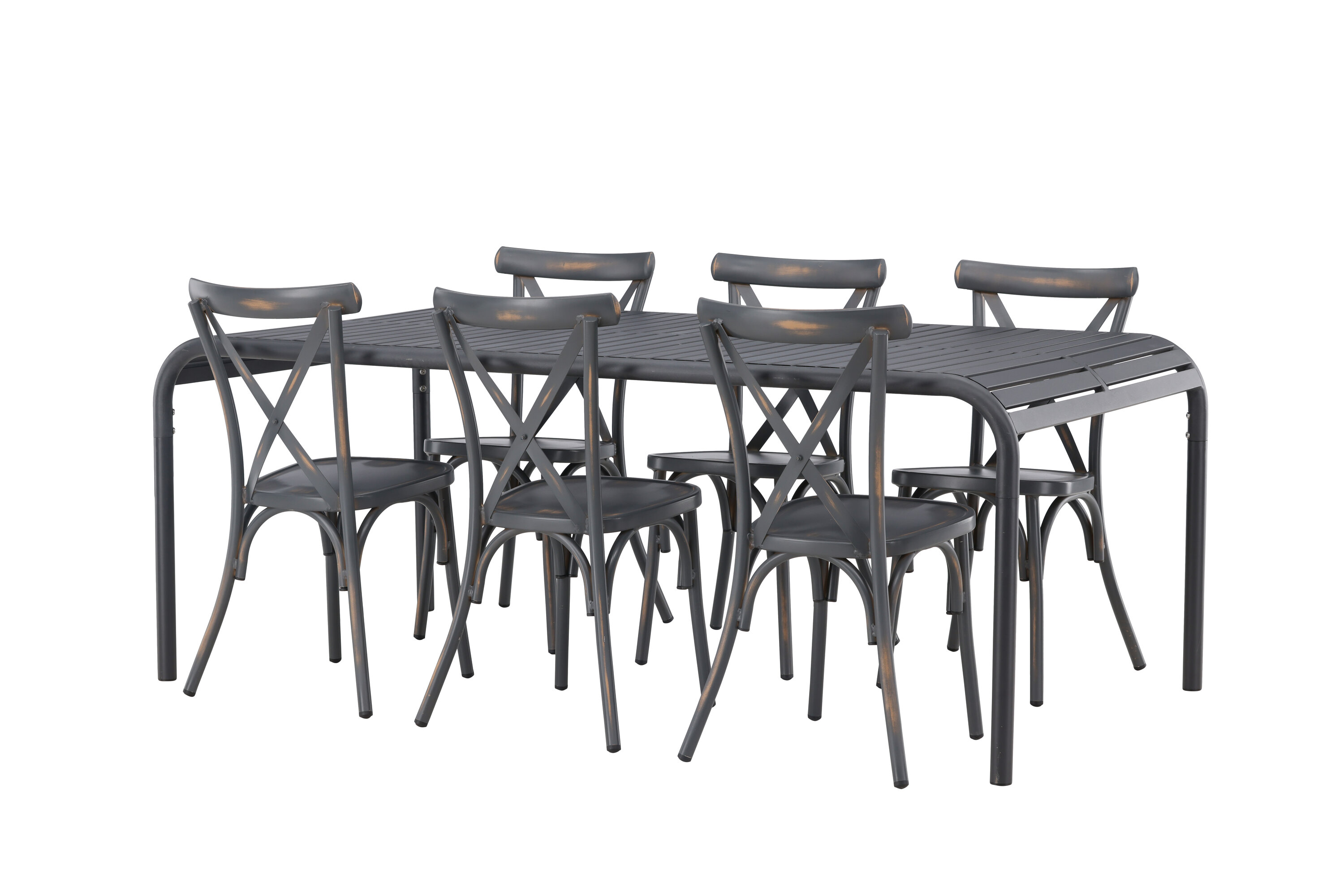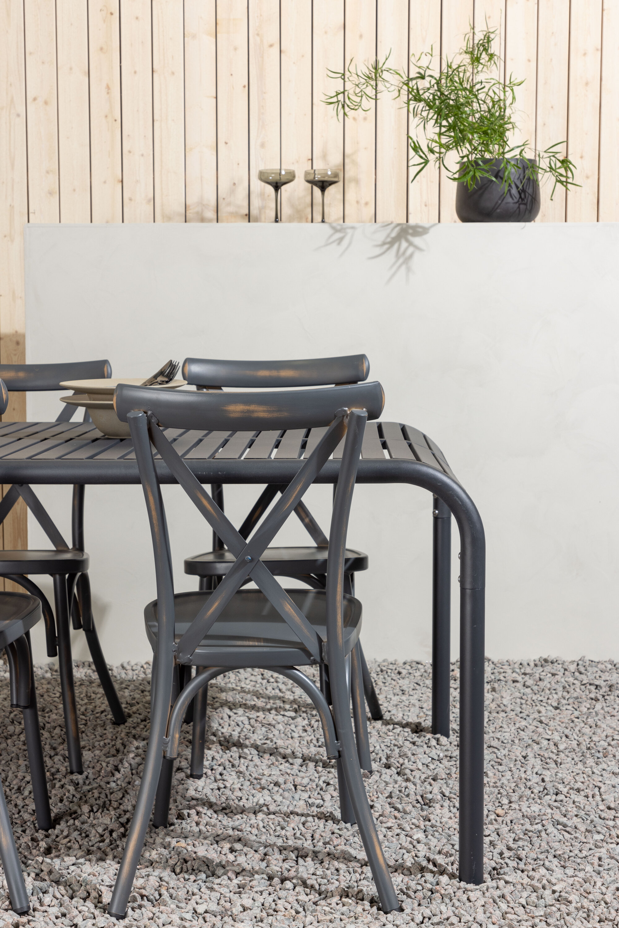 Sisustage talveaed läbimõeldult imeliselt kokkusobiva mustanahalise söögigrupiga! Ristkülikukujulisel söögilaual Borneo on painduvad vormid ja soonikkoes lauaplaat, mis lainetab mööda servi mööda jalgu. Kõik kokku valmistatud vastupidavast alumiiniummaterjalist. Siin koos moodsate söögitoolidega sarjast Tablas. Tool on tööstusliku stiiliga ja valmistatud vastupidavast alumiiniumist tahmmustas värvitoonis. Söögigrupp sobib kasutamiseks õues! Laua mõõdud: 200x100x75cm.