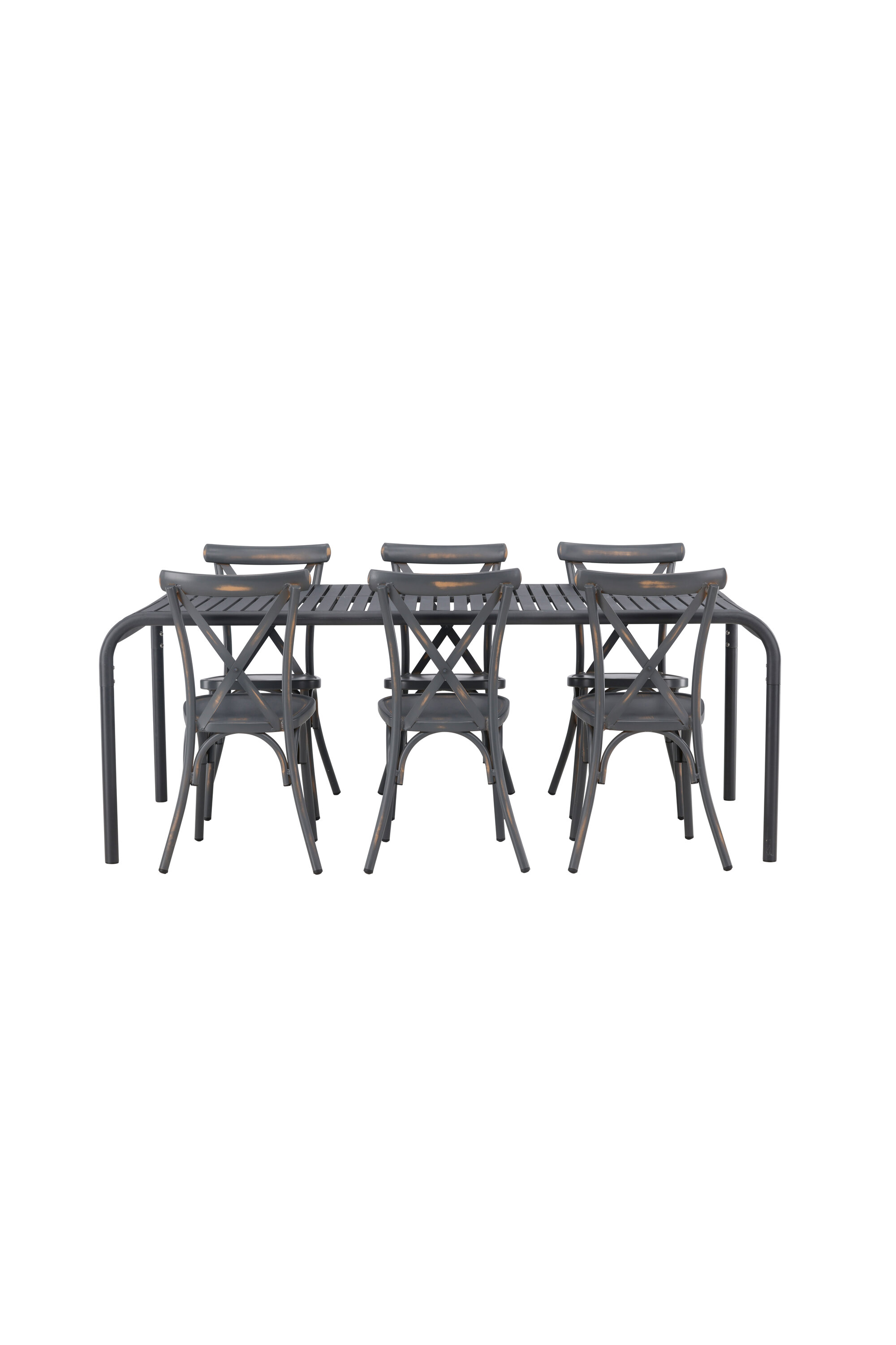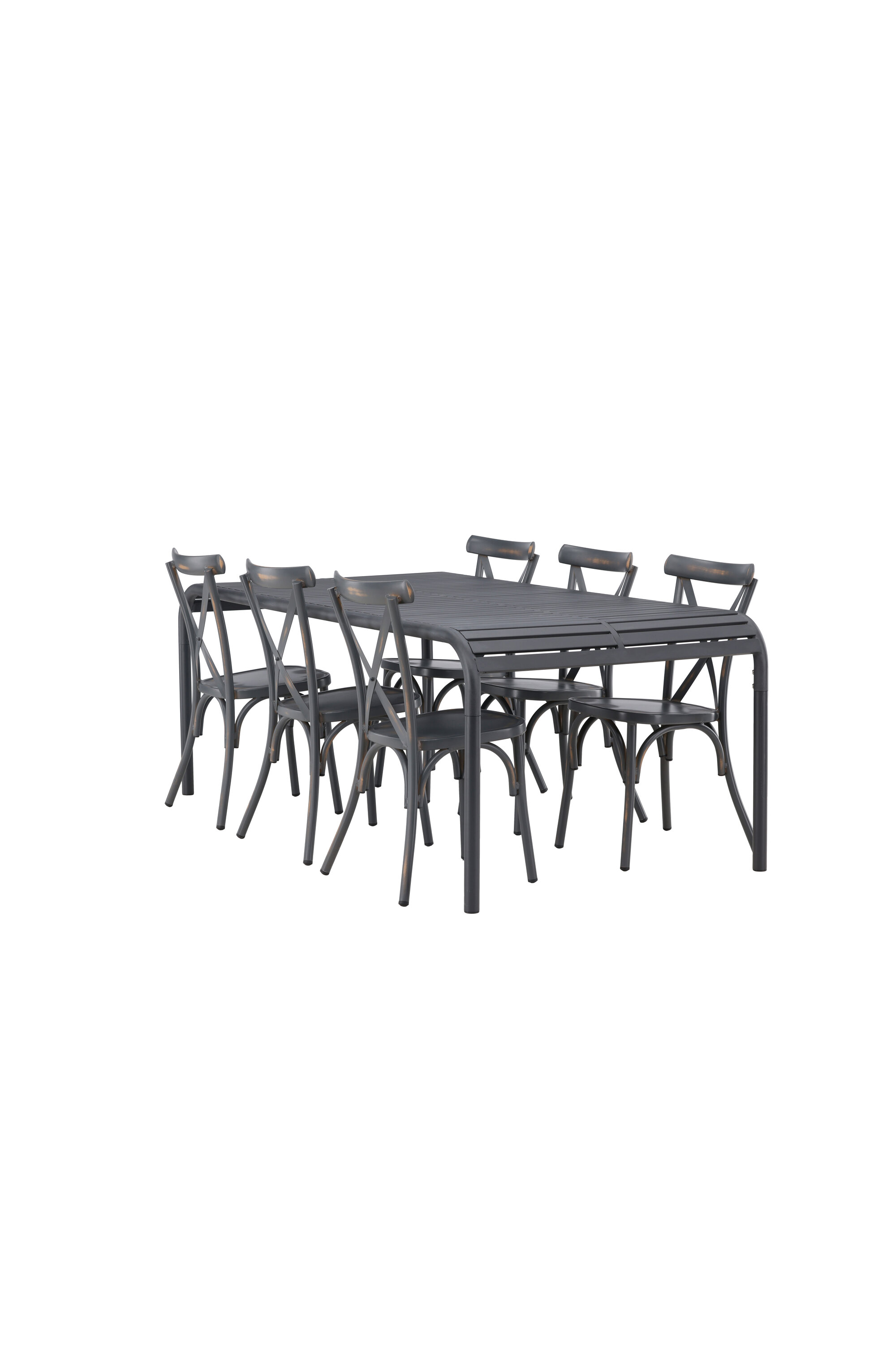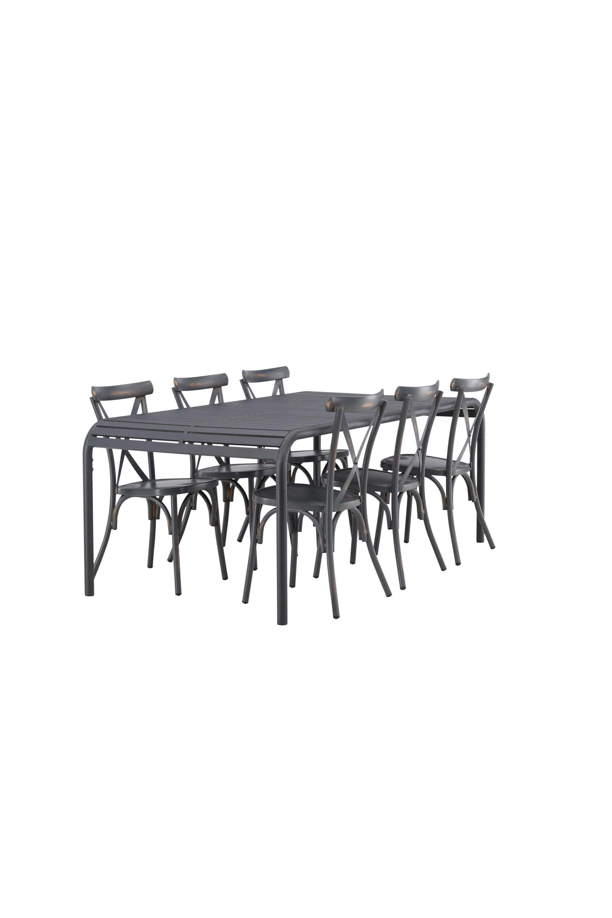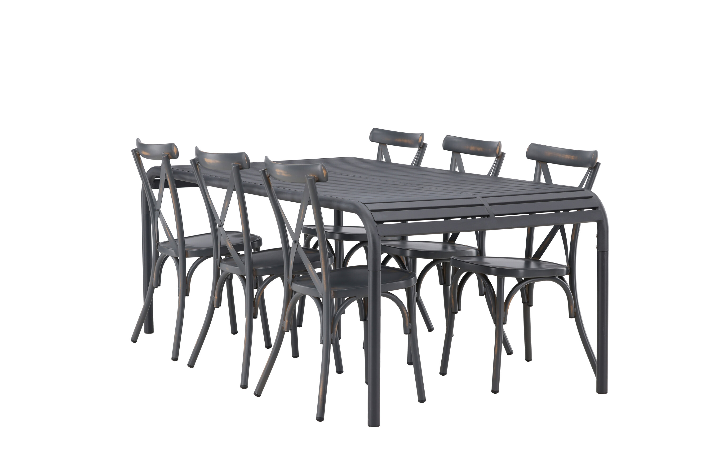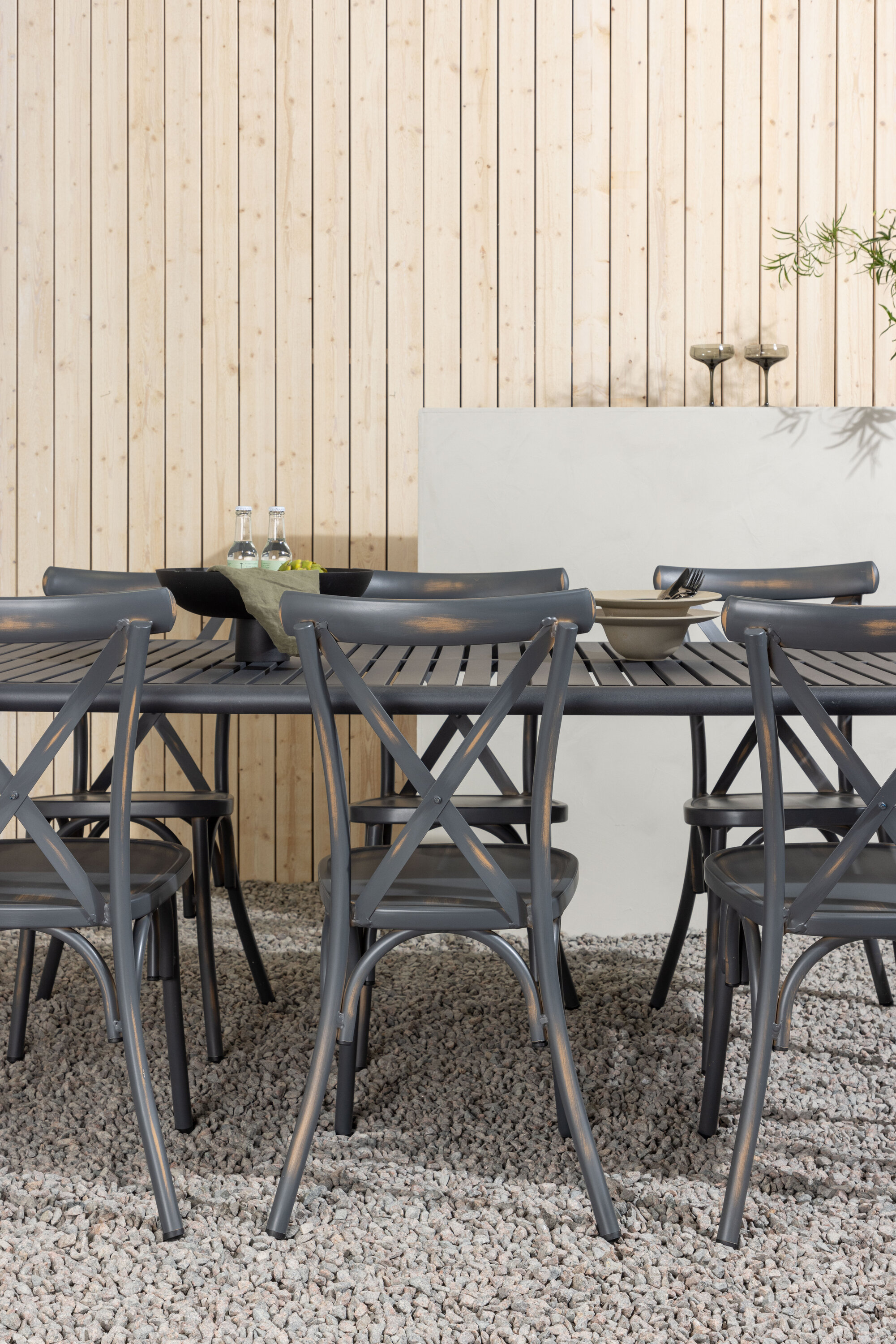 Sisustage talveaed läbimõeldult imeliselt kokkusobiva mustanahalise söögigrupiga! Ristkülikukujulisel söögilaual Borneo on painduvad vormid ja soonikkoes lauaplaat, mis lainetab mööda servi mööda jalgu. Kõik kokku valmistatud vastupidavast alumiiniummaterjalist. Siin koos moodsate söögitoolidega sarjast Tablas. Tool on tööstusliku stiiliga ja valmistatud vastupidavast alumiiniumist tahmmustas värvitoonis. Söögigrupp sobib kasutamiseks õues! Laua mõõdud: 200x100x75cm.