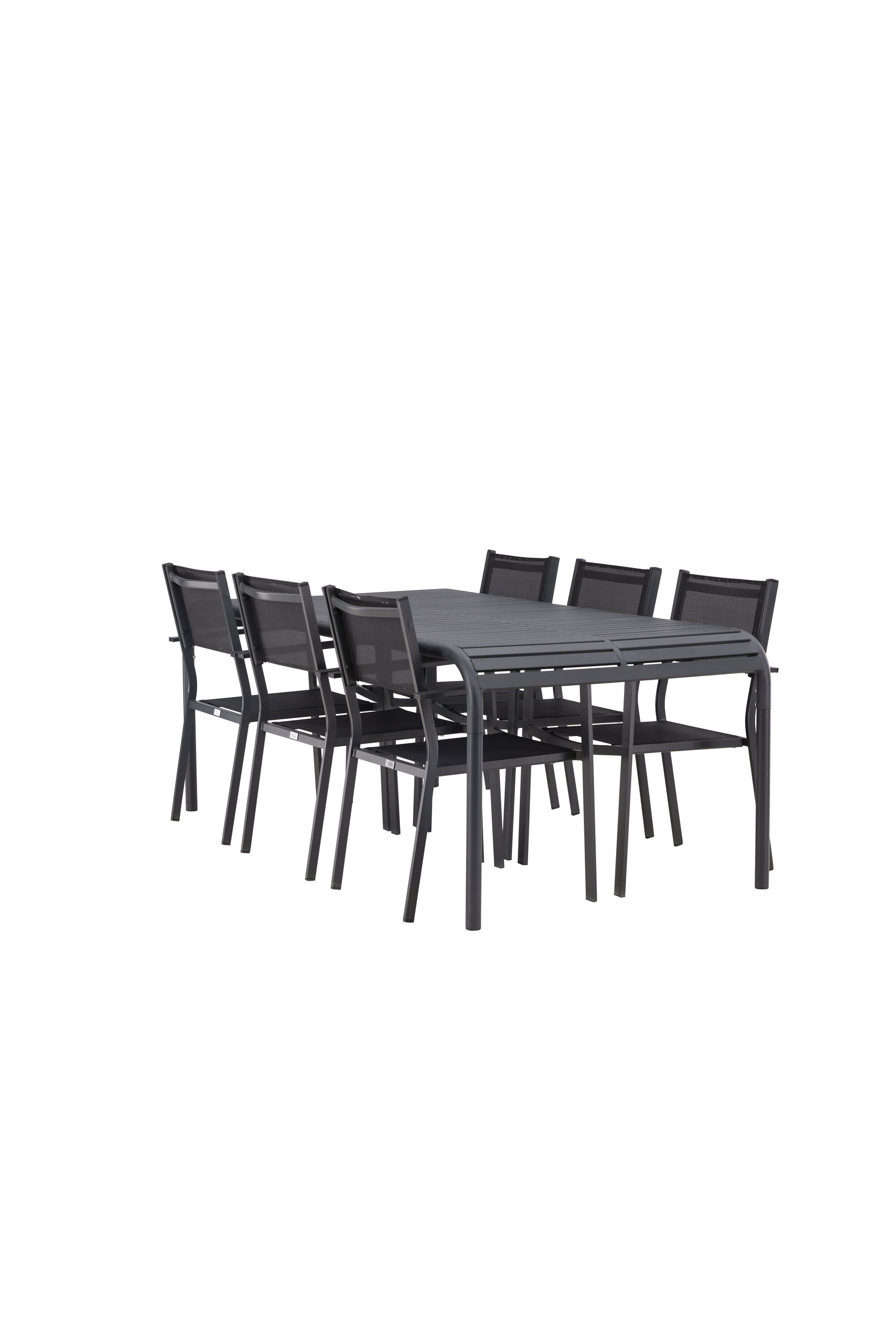 Praktiline söögigrupp igaks juhuks! Ristkülikukujulisel söögilaual Borneo on painduvad vormid ja soonikkoes lauaplaat, mis lainetab mööda servi mööda jalgu. Kõik kokku valmistatud vastupidavast materjalist alumiiniumist. Siin on stiilne disain koos meie Copacabana sarja mustade söögitoolidega. Toolidel on sirge põhjamaise disainiga must alumiinium, iste tekstiilist ja praktiliseks hoiustamiseks virnastatavad. Siit saate hästi läbimõeldud söögigrupi koos kõigi õigete funktsioonidega! Laua mõõdud: 200x100x75cm.