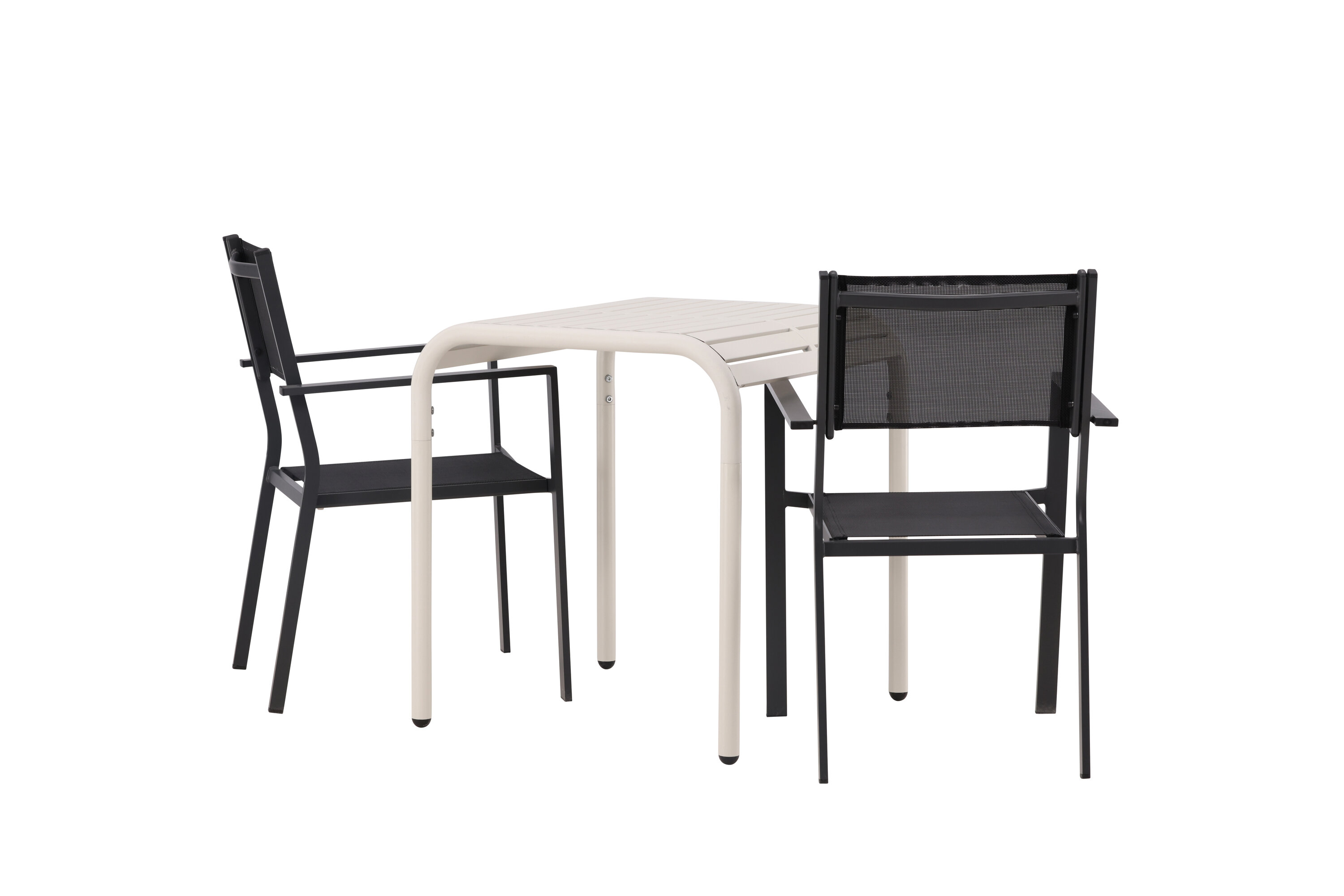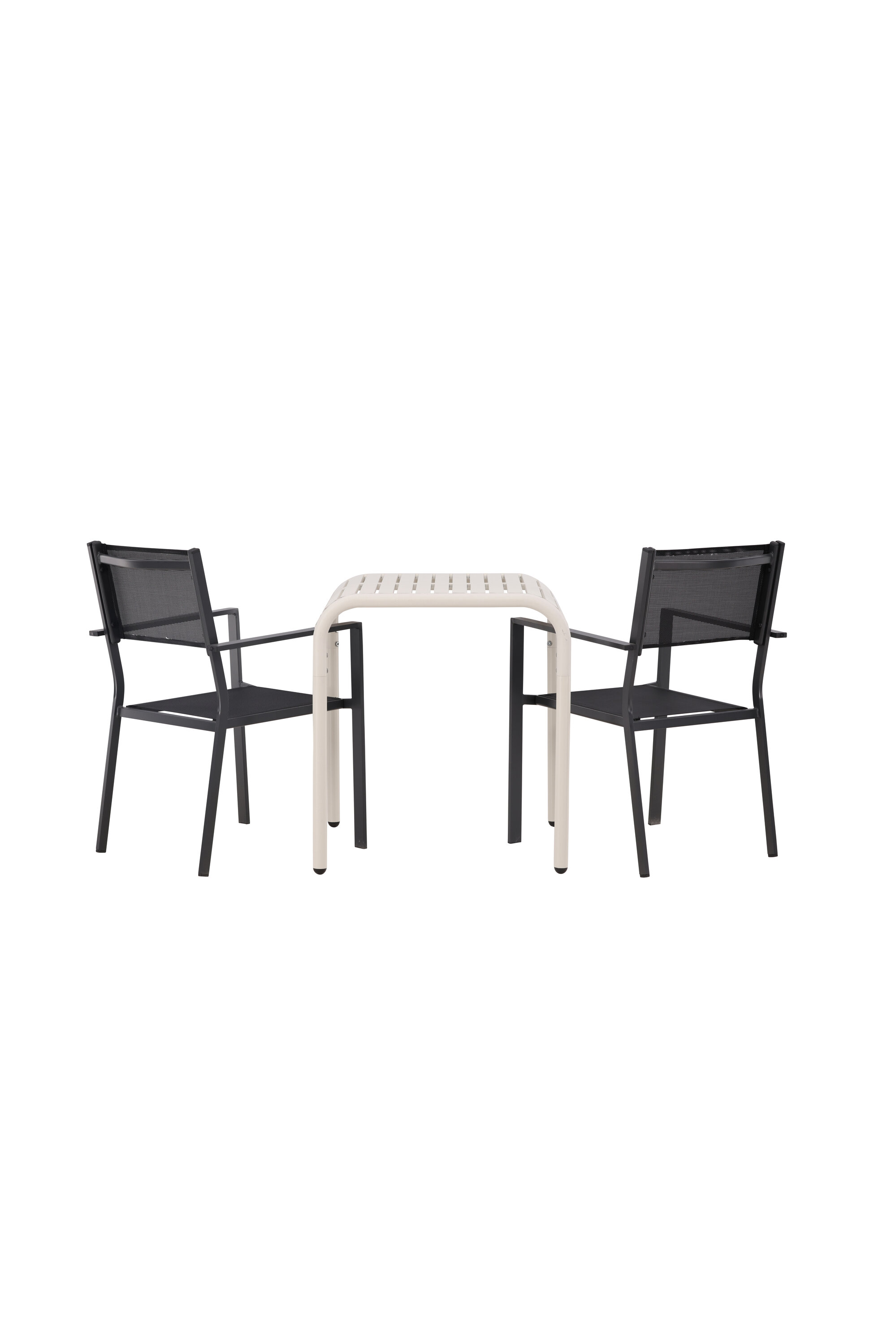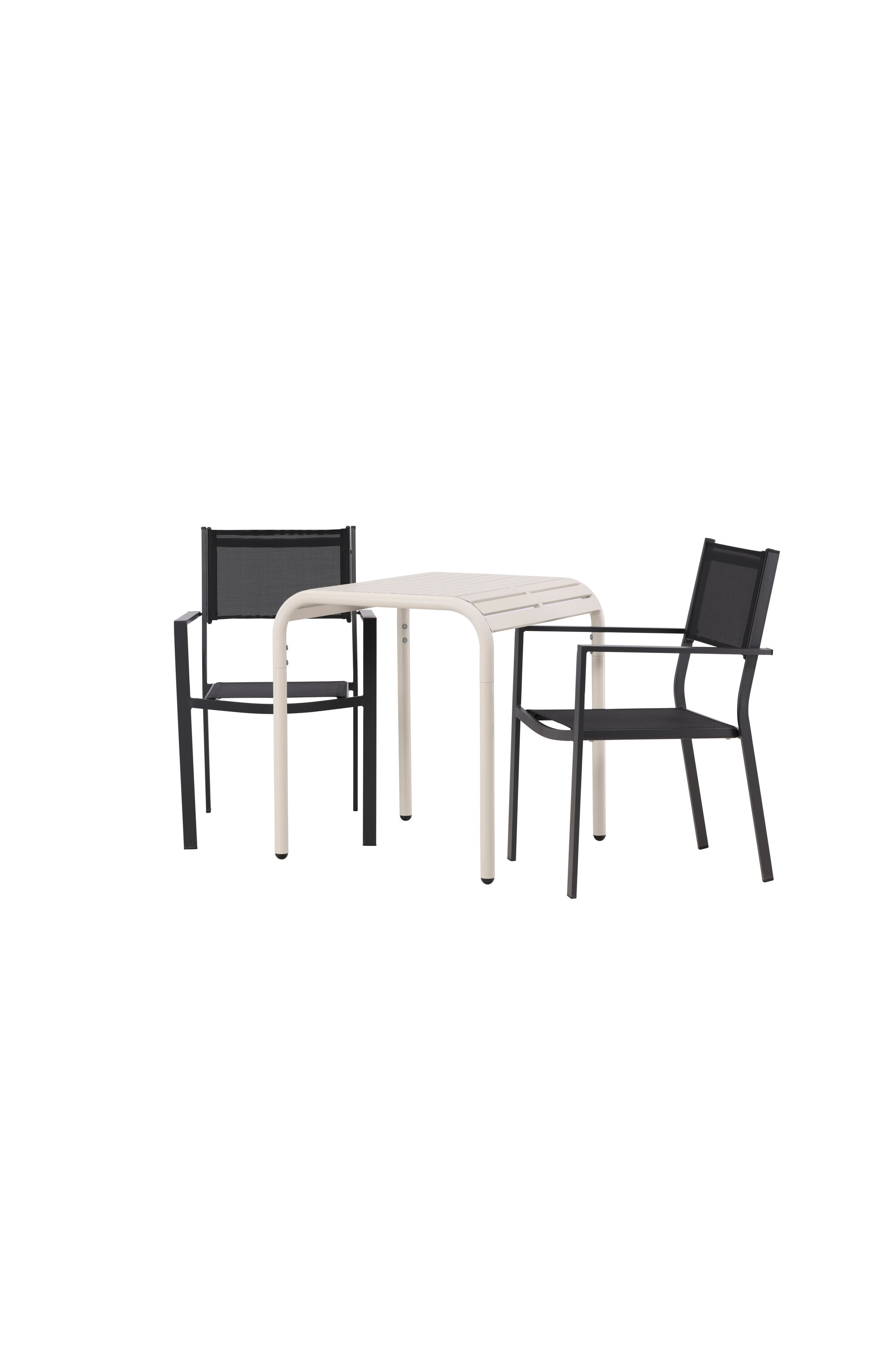 Ideaalne kohvikugrupp väikesele rõdule või terrassile! Borneo seeria laual on ajatu Skandinaavia disain. Lauaplaat on soonikkoes ja mööda servi allapoole lainetav. Kõik kokku valmistatud beežist alumiiniumist, mis annab teile vastupidava laua, mida on lihtne liigutada. Siin on stiilne kombinatsioon 2 Copacabana seeria söögitooliga. Toolid on sirge põhjamaise kujuga ja virnastatavad. Iste on tekstiilist ja toolijalad mustast alumiiniumist. Kata sel suvel õues laud! Laua mõõdud: 70x70cm.