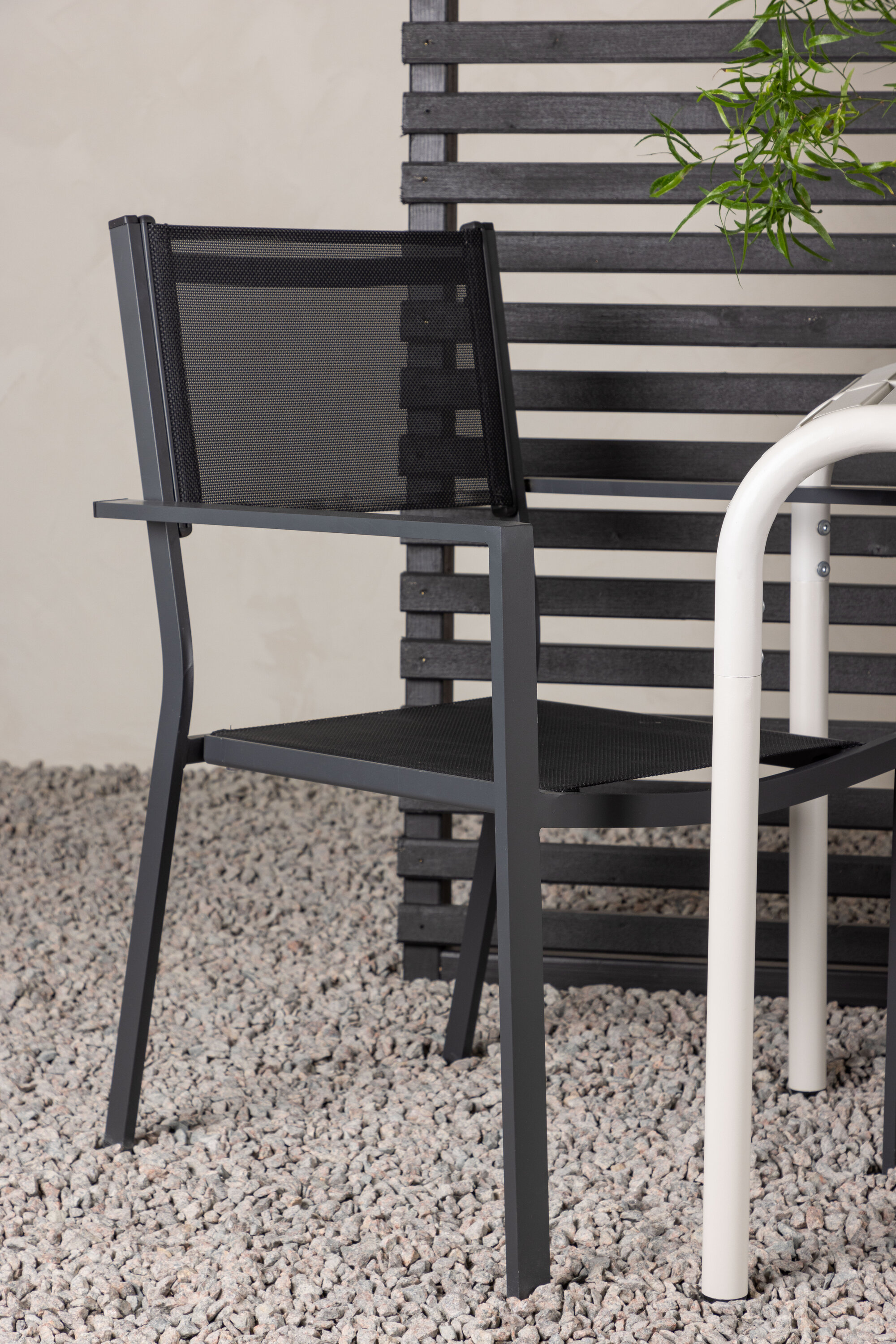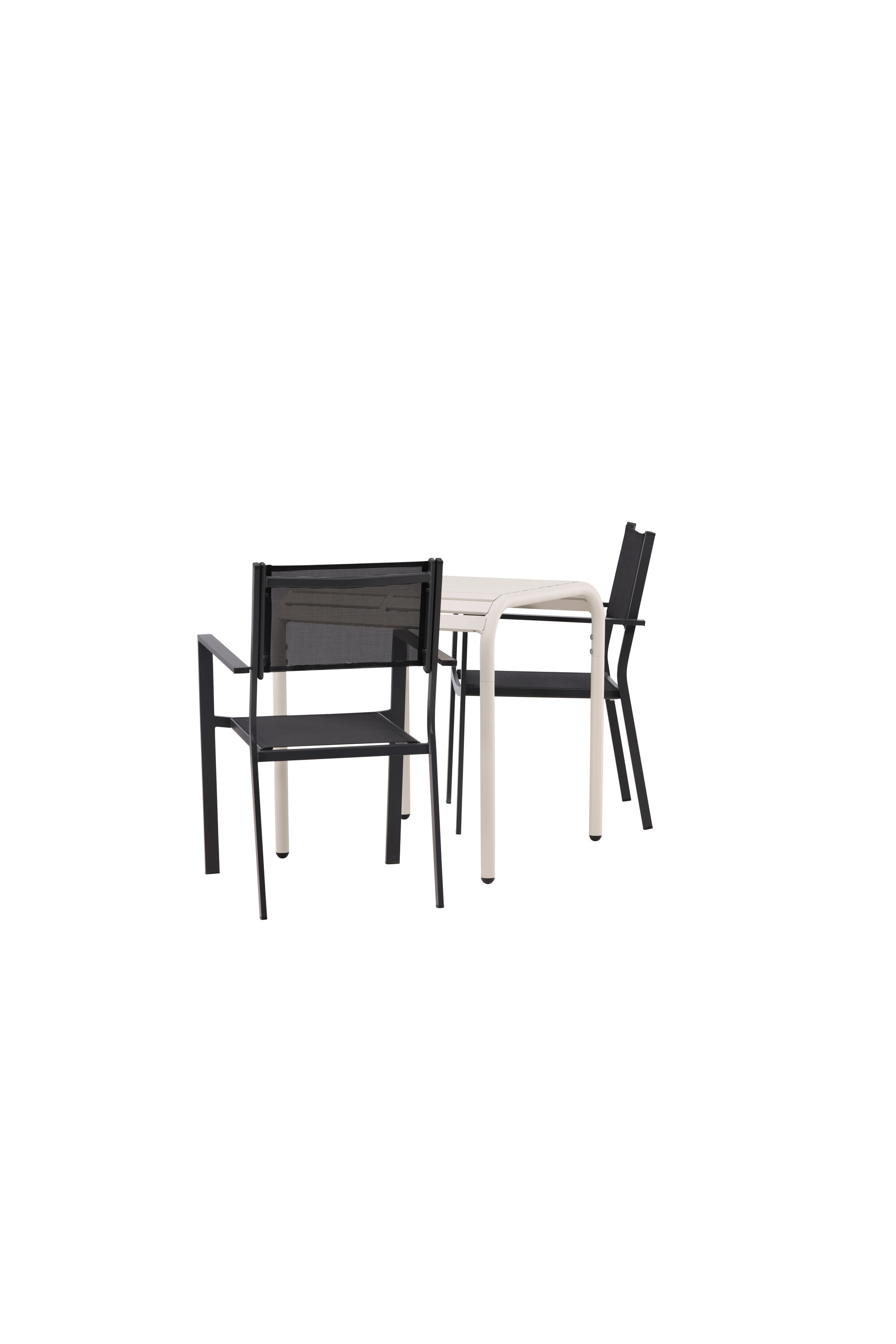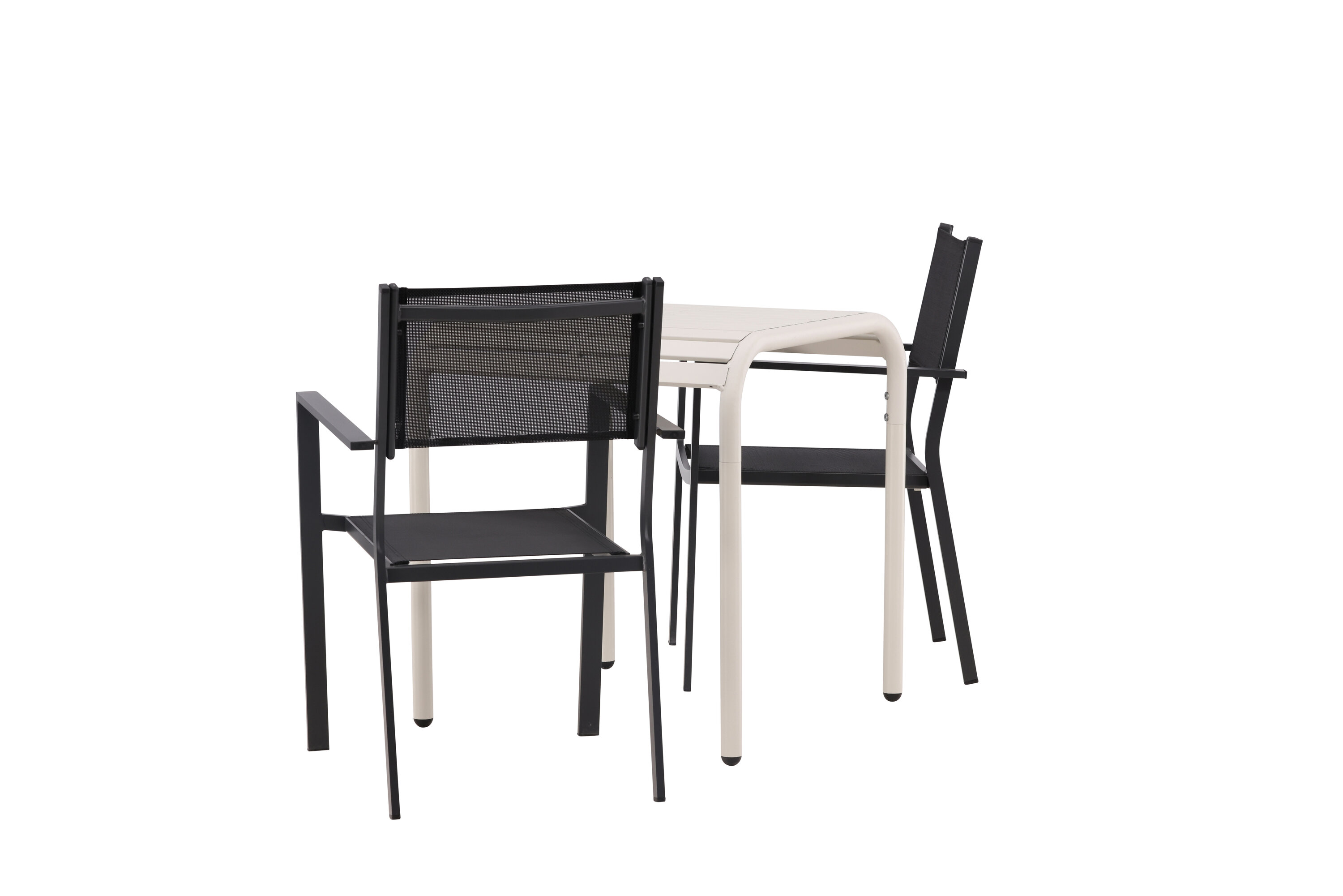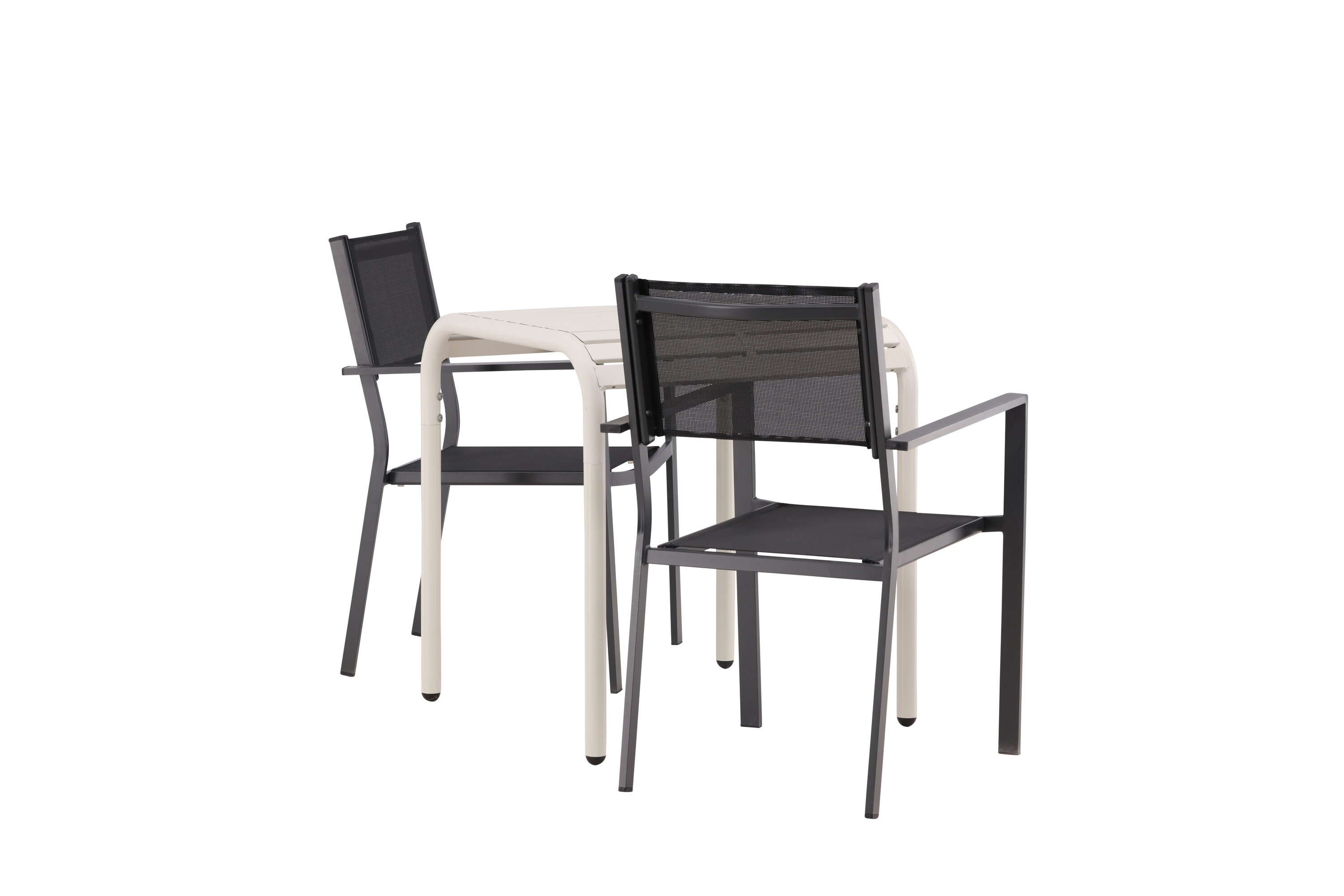 Ideaalne kohvikugrupp väikesele rõdule või terrassile! Borneo seeria laual on ajatu Skandinaavia disain. Lauaplaat on soonikkoes ja mööda servi allapoole lainetav. Kõik kokku valmistatud beežist alumiiniumist, mis annab teile vastupidava laua, mida on lihtne liigutada. Siin on stiilne kombinatsioon 2 Copacabana seeria söögitooliga. Toolid on sirge põhjamaise kujuga ja virnastatavad. Iste on tekstiilist ja toolijalad mustast alumiiniumist. Kata sel suvel õues laud! Laua mõõdud: 70x70cm.
