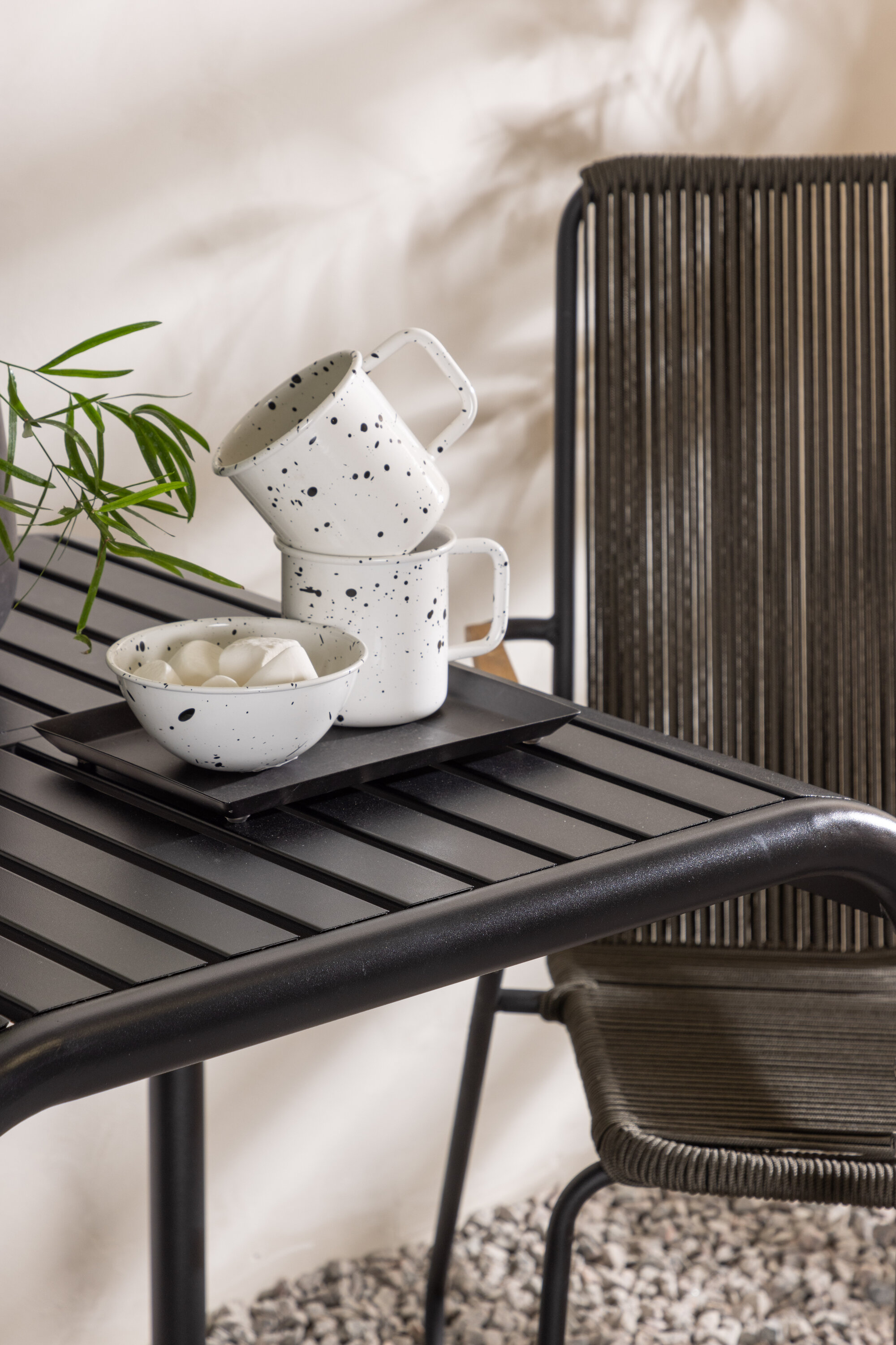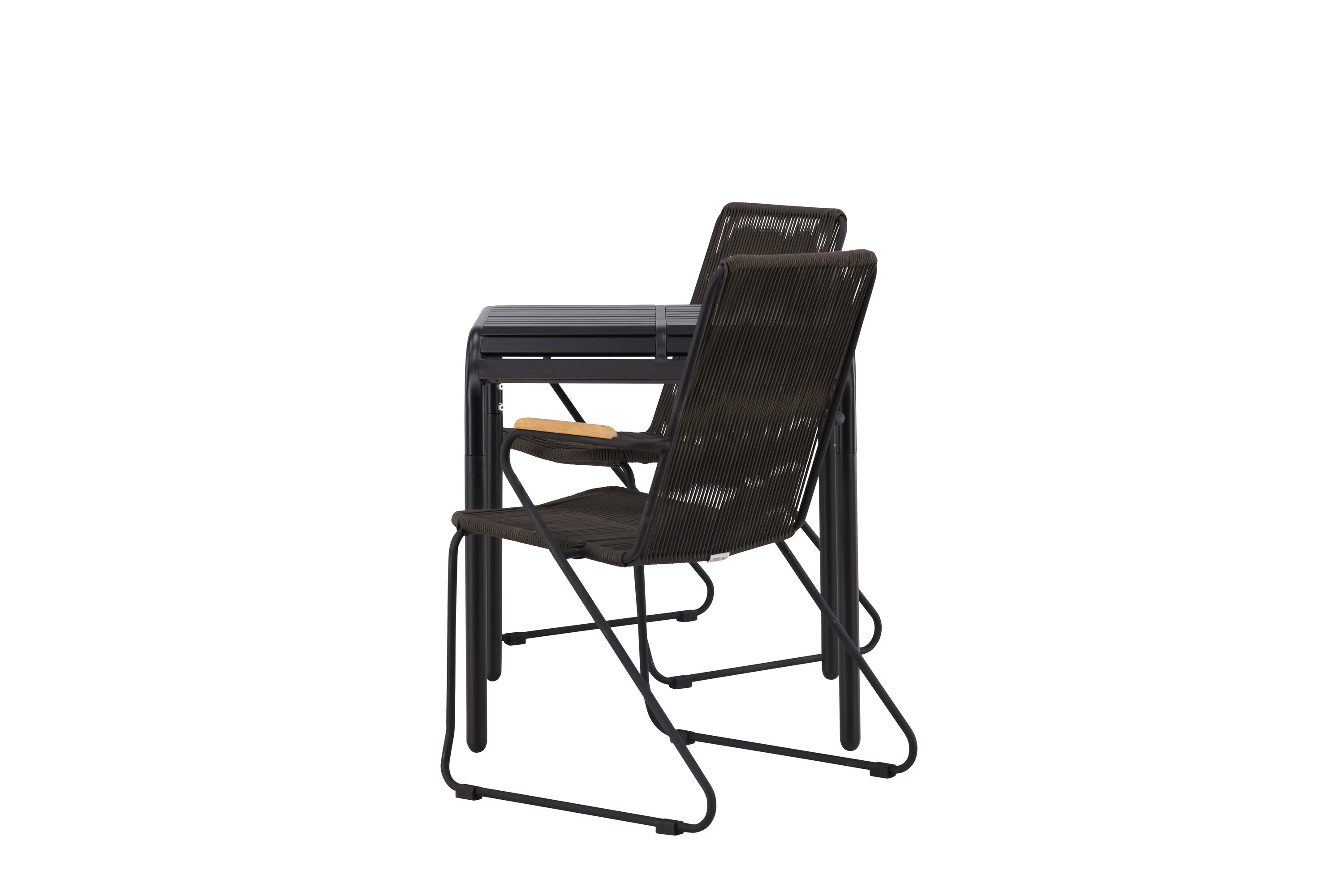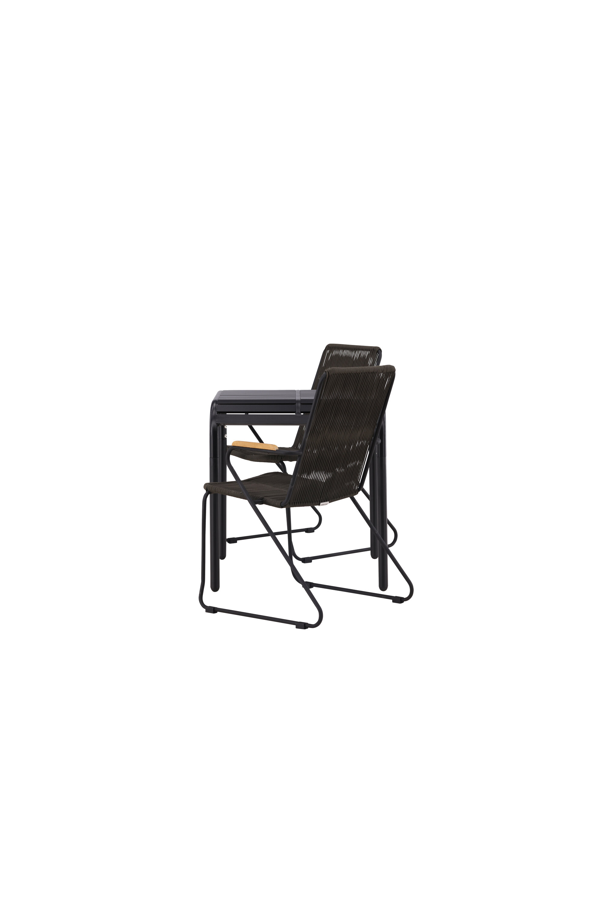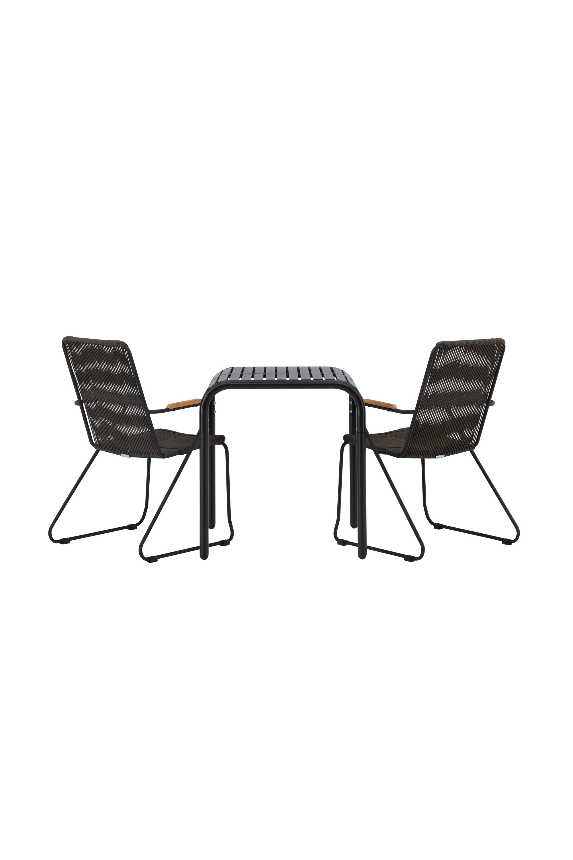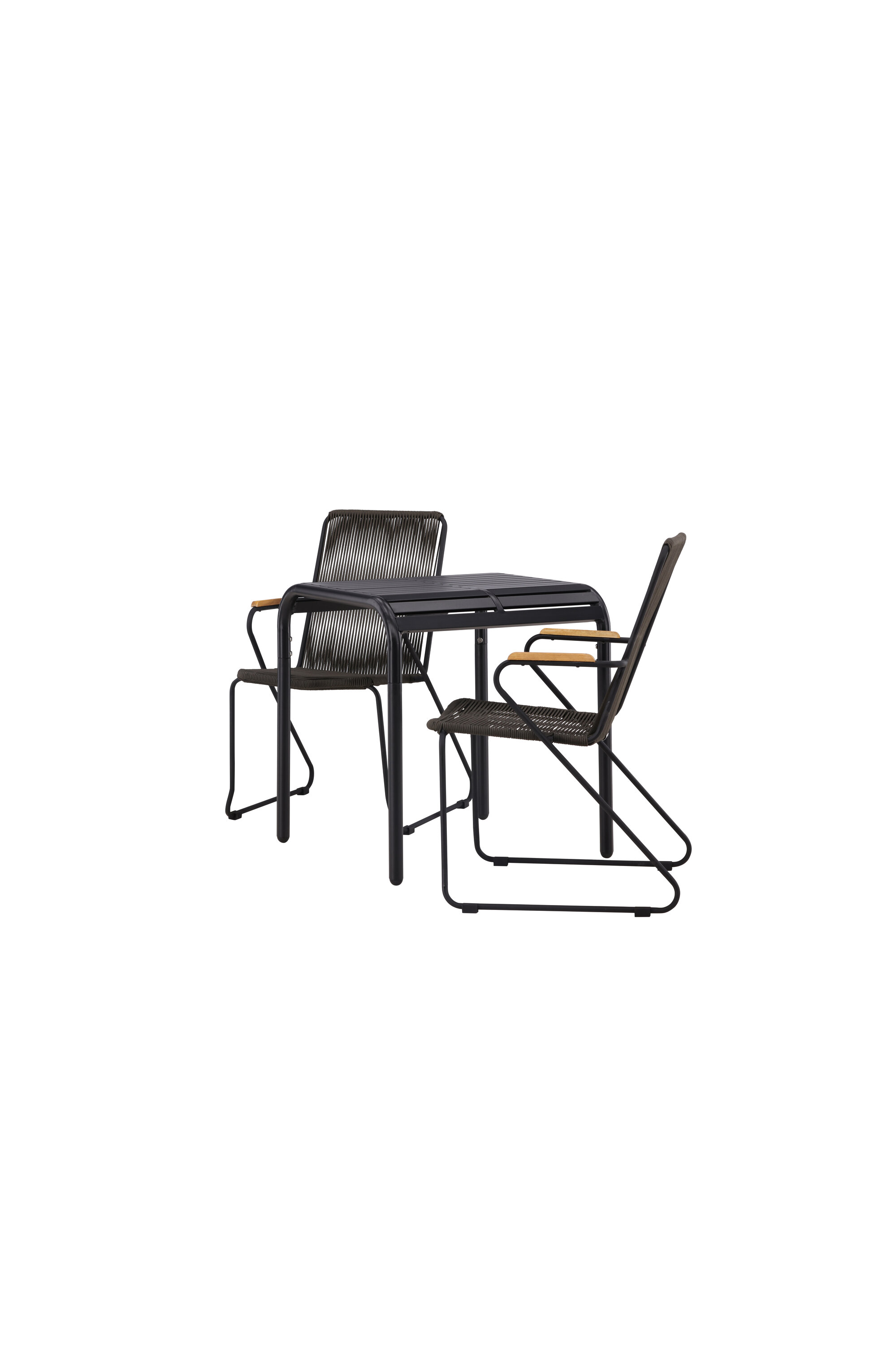 Fantastiline söögigrupp, mis sobib suurepäraselt kõikideks selle suve kohvipausideks! Borneo seeria laual on ajatu Skandinaavia disain. Lauaplaat on soonikkoes ja mööda servi allapoole lainetav. Kõik koos valmistatud mustast alumiiniumist, mis annab teile vastupidava laua, mida on lihtne liigutada. Siin koos 2 stiilse Bois seeria söögitooliga. Toolil on mugav disain tiikpuust käetugedega ja tumehalli istmega köiest. Sel suvel istuge mugavalt ja lõõgastuge! Laua mõõdud: 70x70cm.