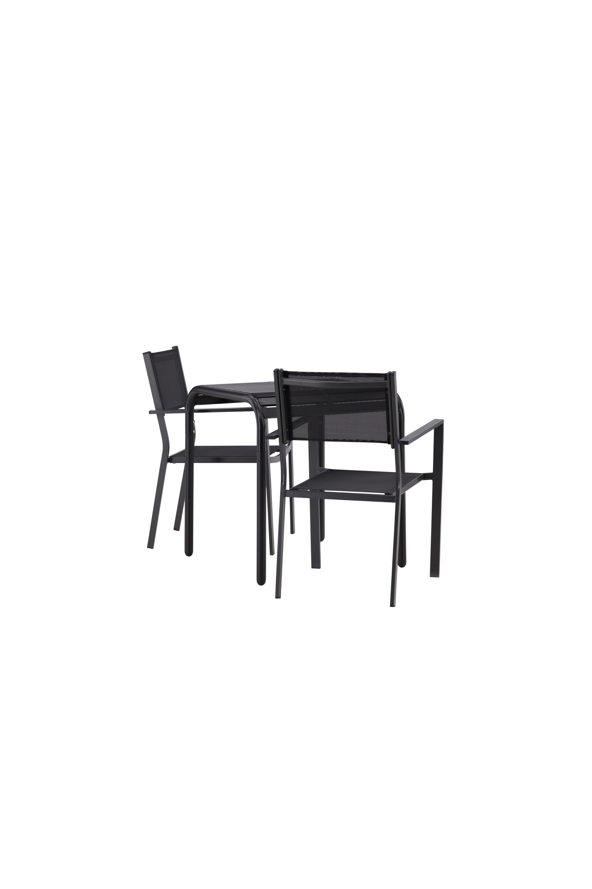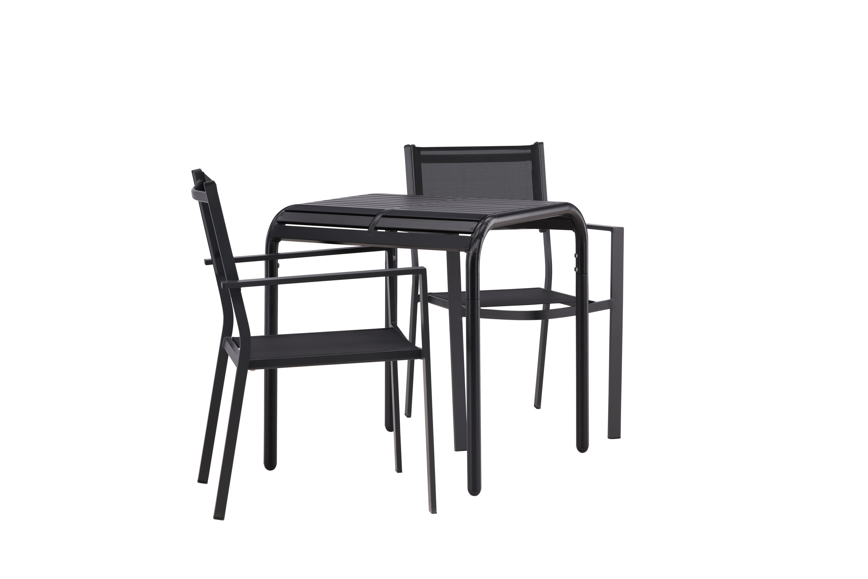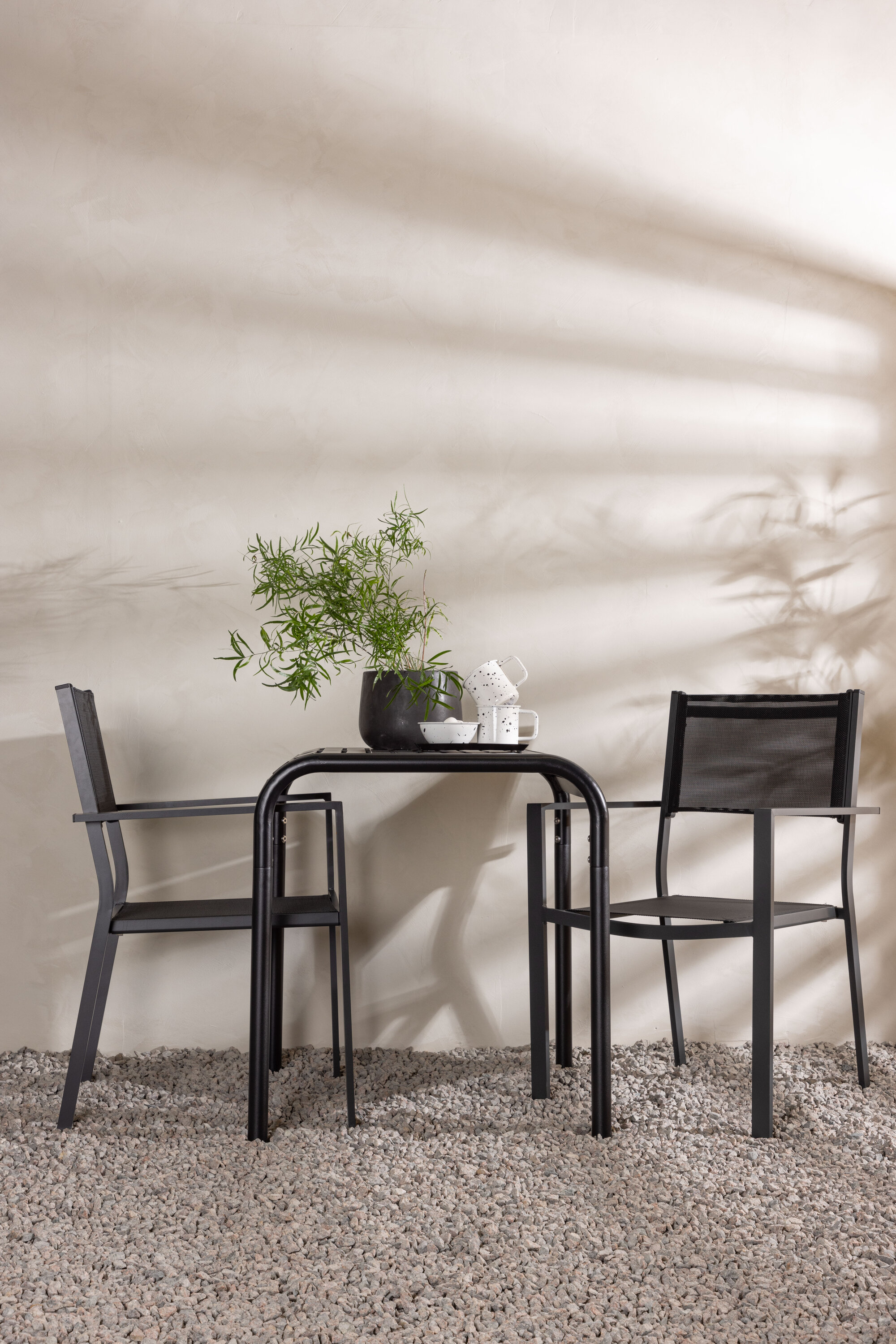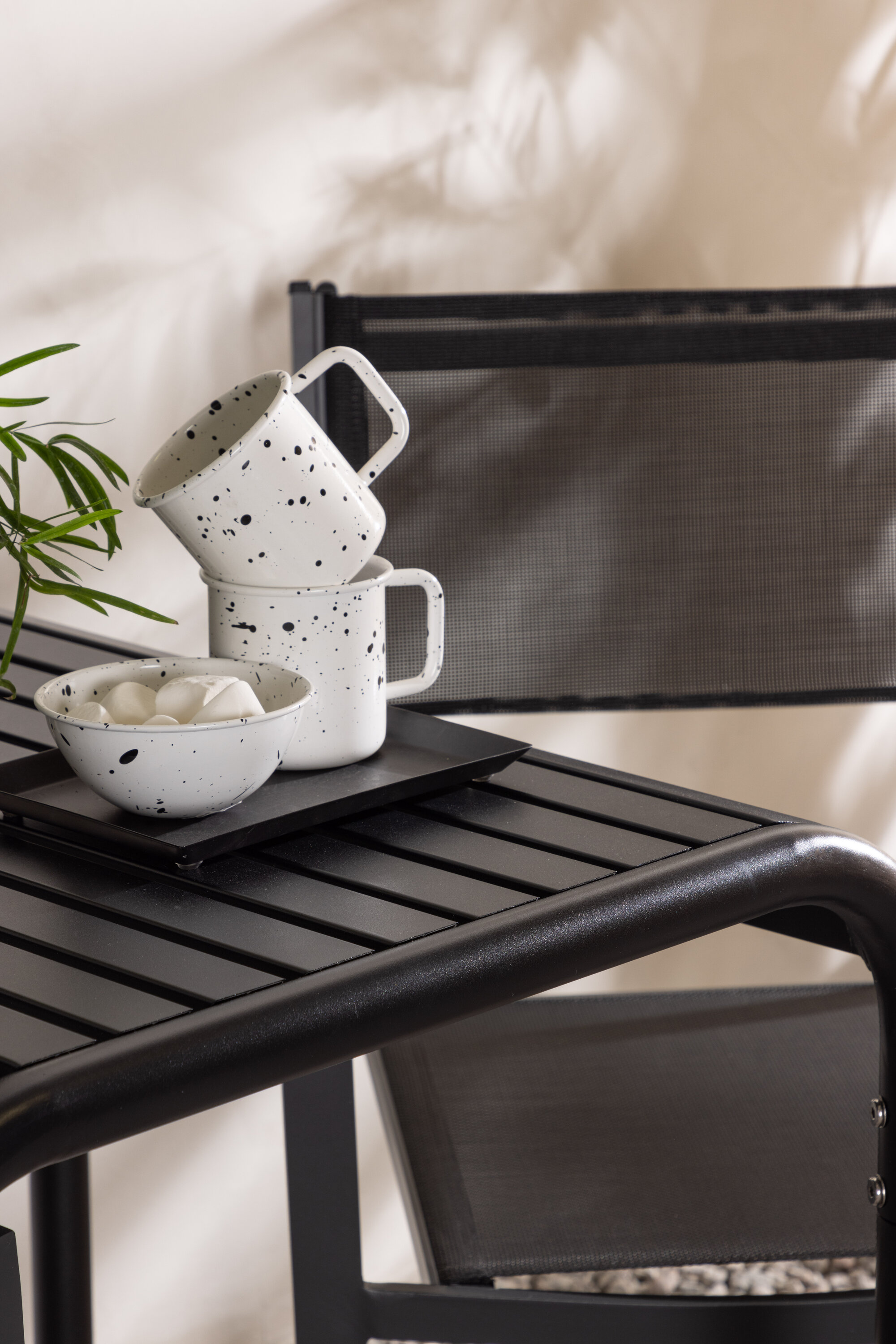 Ideaalne kohvikugrupp väikesele rõdule või terrassile! Borneo seeria laual on ajatu Skandinaavia disain. Lauaplaat on soonikkoes ja mööda servi allapoole lainetav. Kõik koos valmistatud mustast alumiiniumist, mis annab teile vastupidava laua, mida on lihtne liigutada. Siin on stiilne kombinatsioon 2 Copacabana seeria söögitooliga. Toolid on sirge põhjamaise kujuga ja virnastatavad. Iste on tekstiilist ja jalad mustast alumiiniumist. Söö sel suvel lõunat väljas ja naudi lõõgastavaid hetki! Laua mõõdud: 70x70cm.