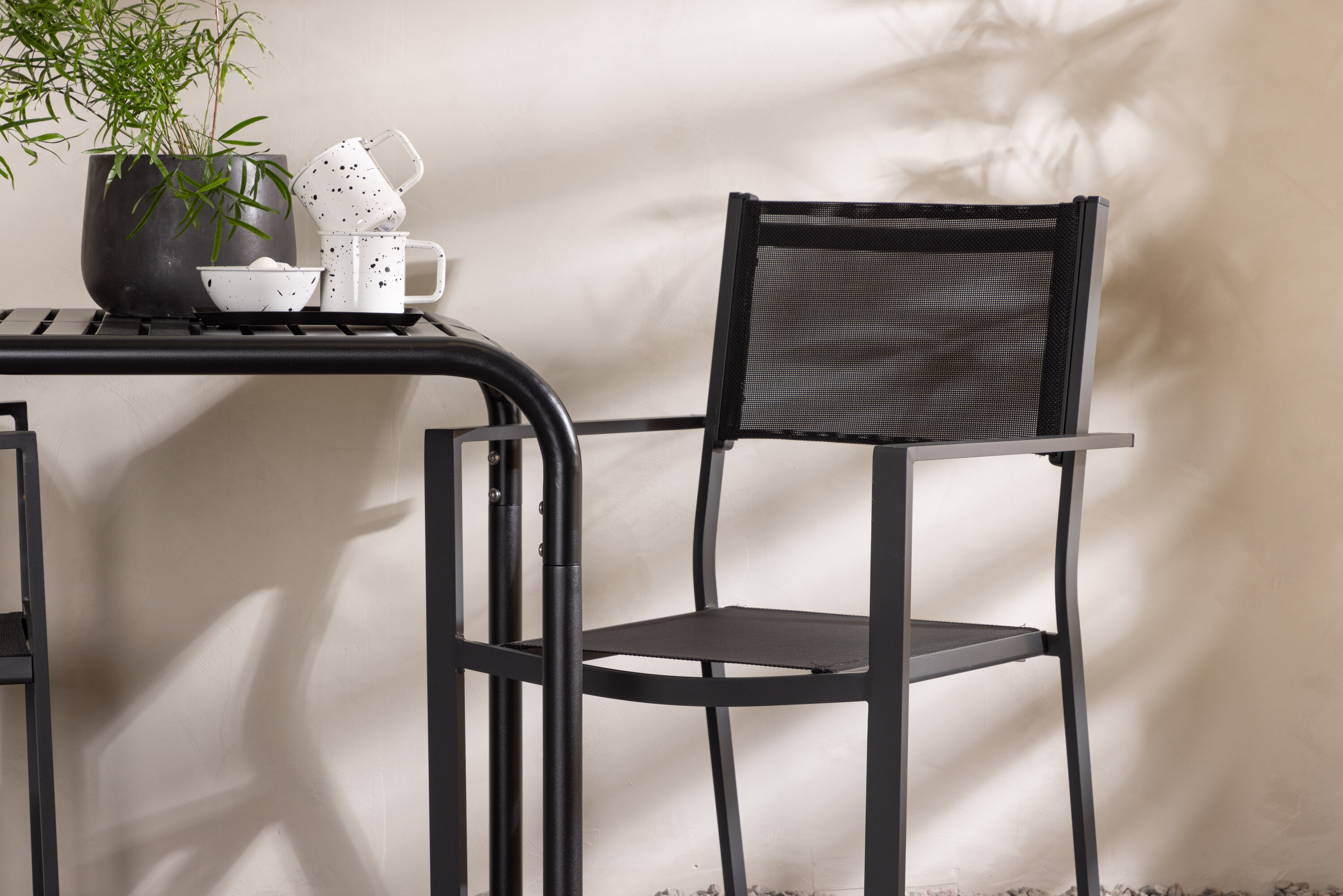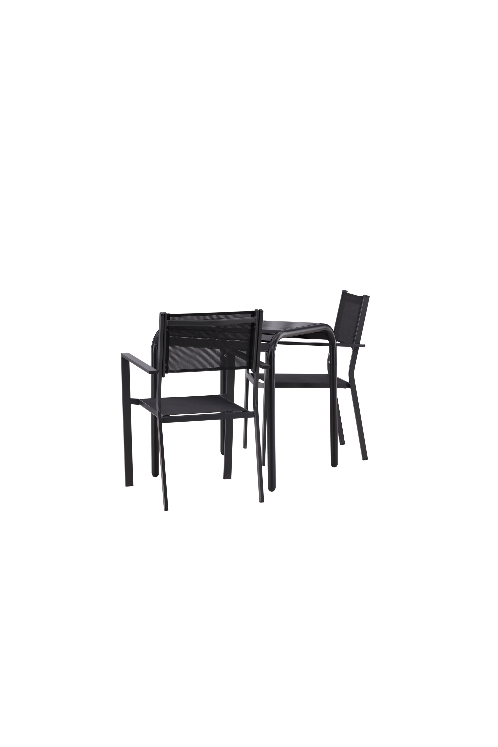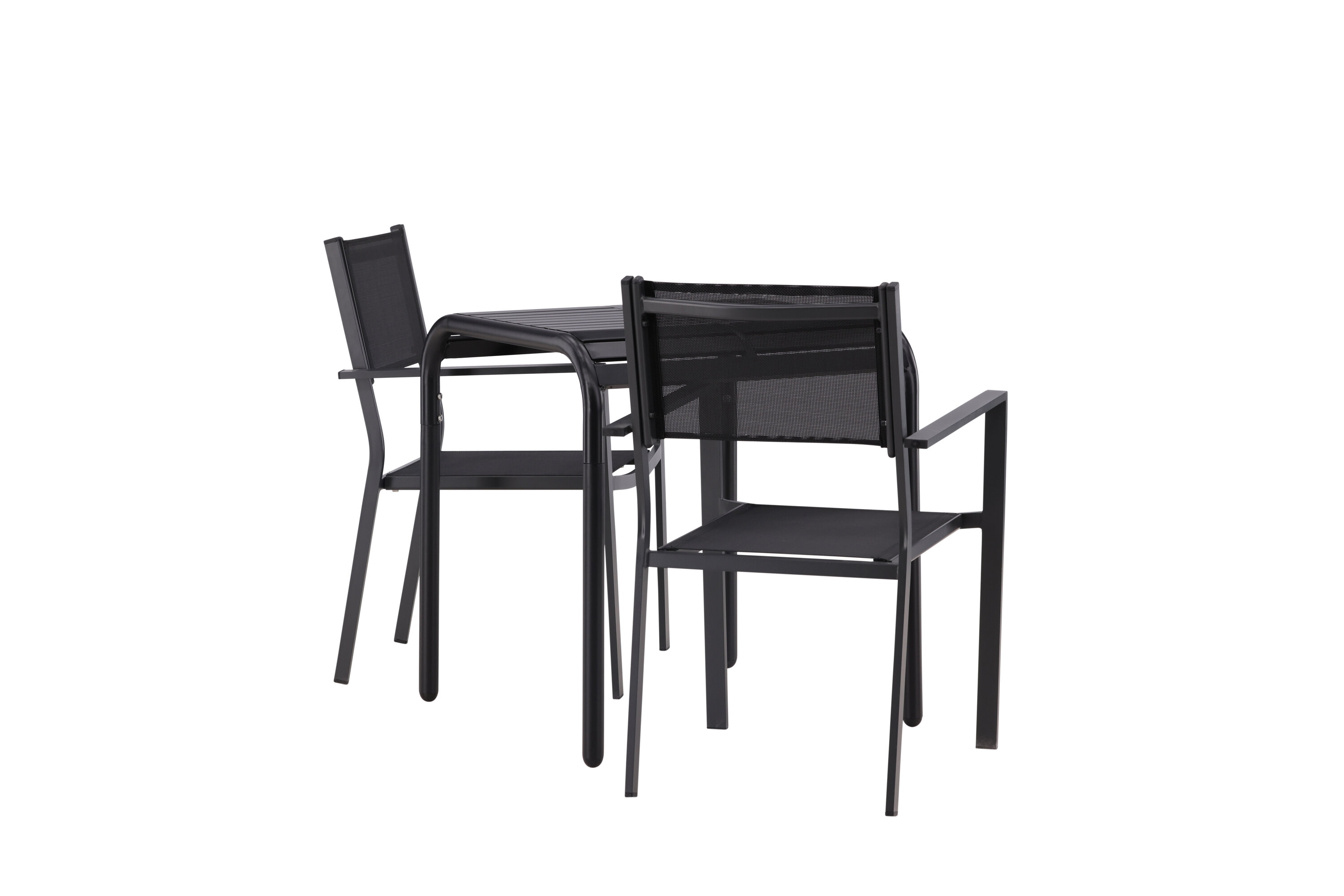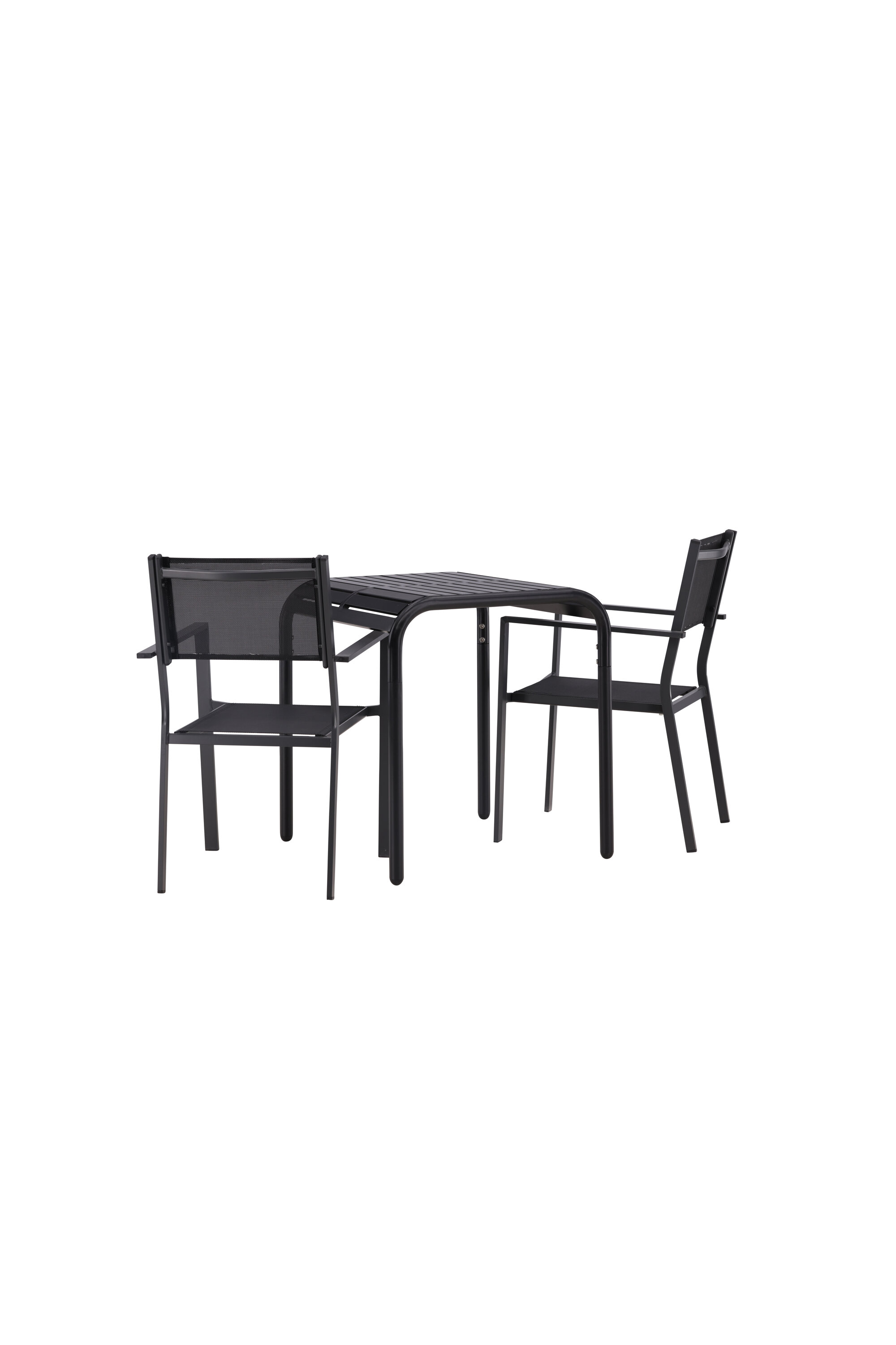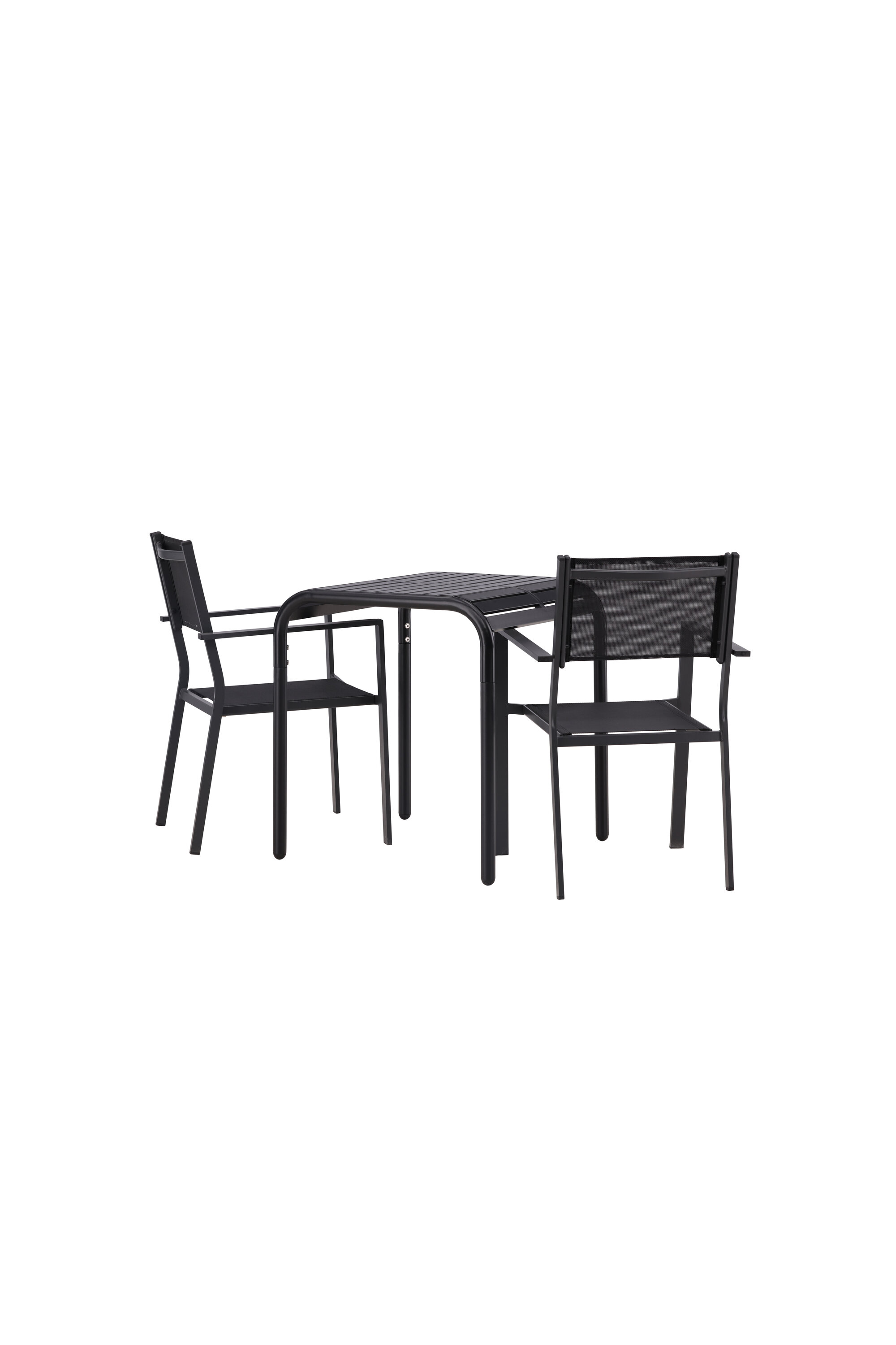 Ideaalne kohvikugrupp väikesele rõdule või terrassile! Borneo seeria laual on ajatu Skandinaavia disain. Lauaplaat on soonikkoes ja mööda servi allapoole lainetav. Kõik koos valmistatud mustast alumiiniumist, mis annab teile vastupidava laua, mida on lihtne liigutada. Siin on stiilne kombinatsioon 2 Copacabana seeria söögitooliga. Toolid on sirge põhjamaise kujuga ja virnastatavad. Iste on tekstiilist ja jalad mustast alumiiniumist. Söö sel suvel lõunat väljas ja naudi lõõgastavaid hetki! Laua mõõdud: 70x70cm.