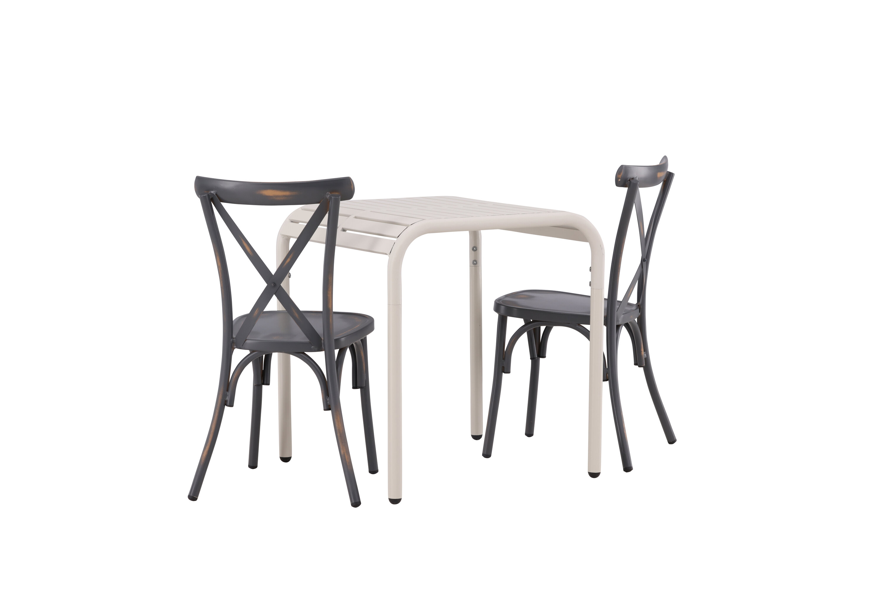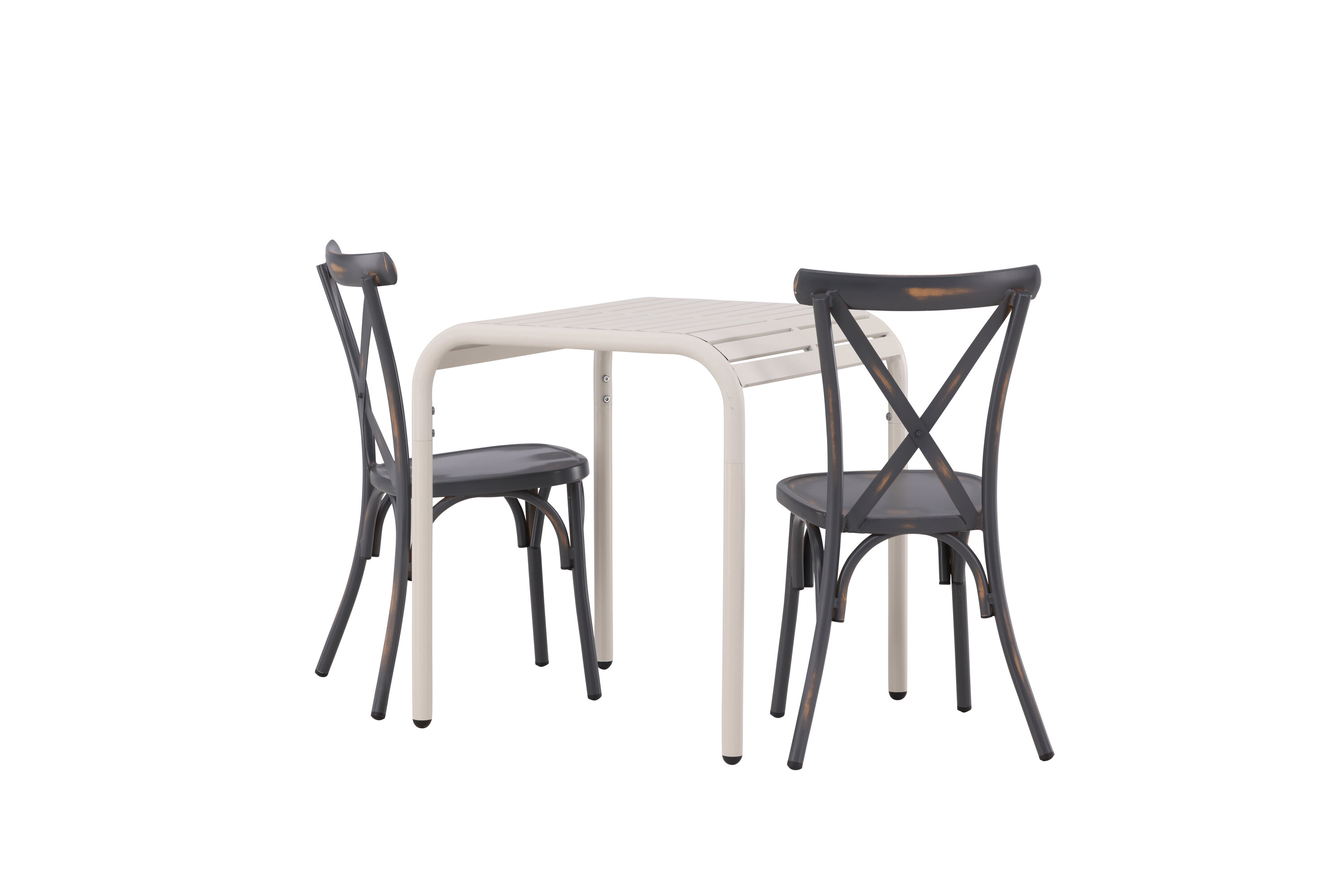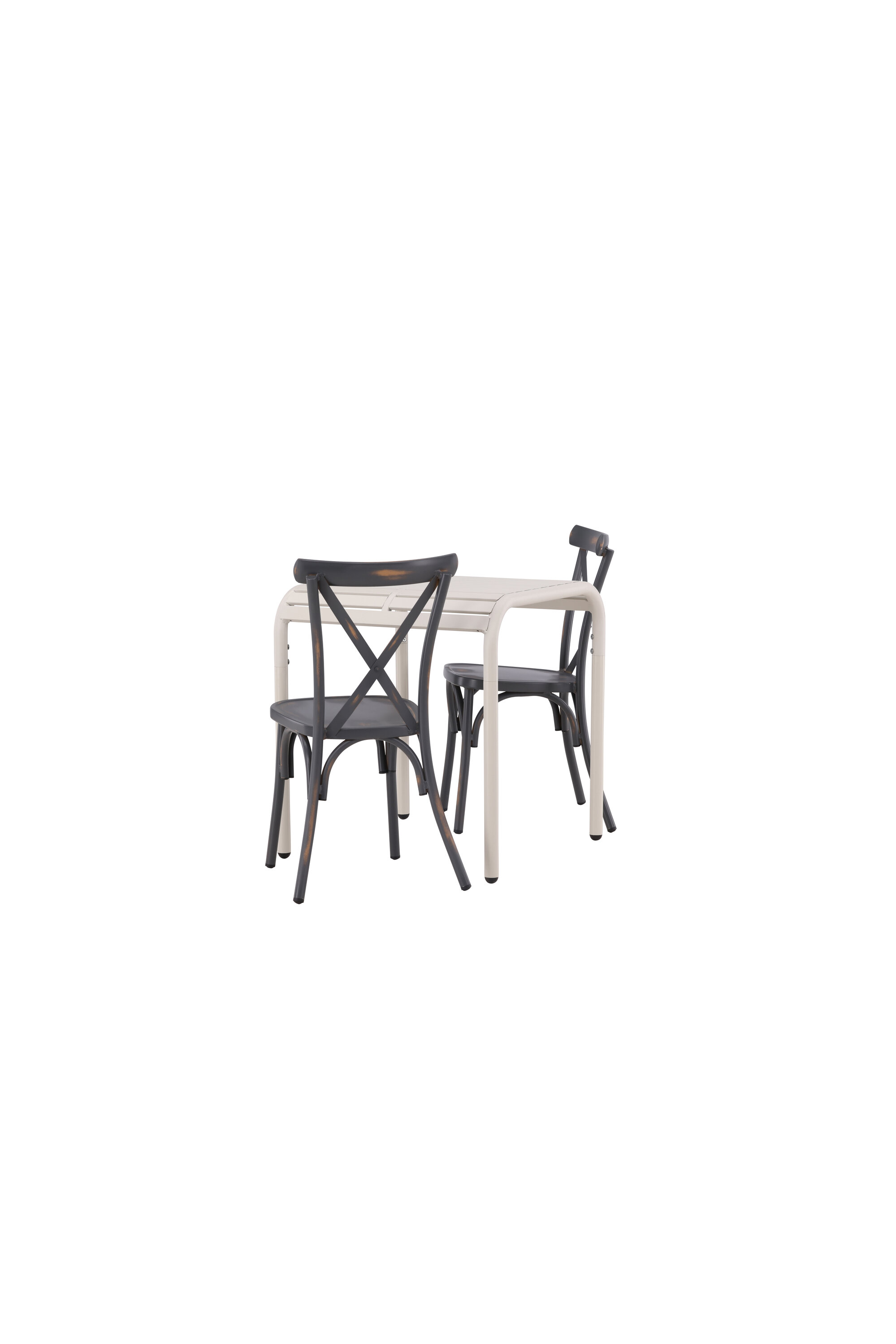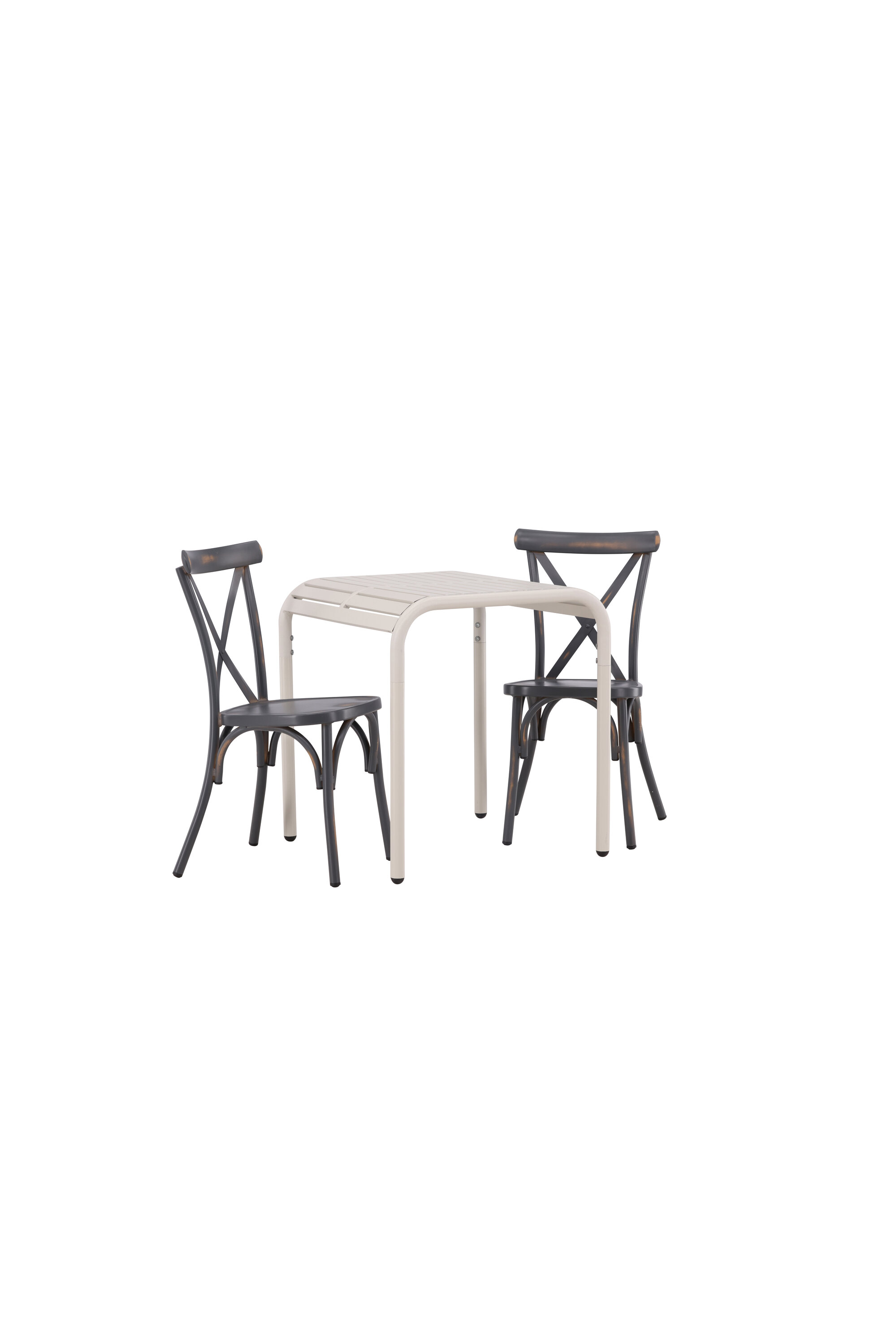 Ideaalne kohvigrupp teie terrassile! Sellel Borneo sarja kohvikulaual on ajatu Skandinaavia disain. Lauaplaat on soonikkoes ja mööda servi allapoole lainetav. Kõik kokku valmistatud beežist alumiiniumist, mis annab teile vastupidava laua, mida on lihtne liigutada. Siin koos 2 söögitooliga sarjast Tablas. Toolil on ristatud seljatugi ja kergelt laienevad jalad, mis tagavad ühtlase mulje. Üleni valmistatud alumiiniumist tahmast musta värvi. Pidage sel suvel ypur kohvipausi õues ja nautige koos vabu hetki! Laua mõõdud: 70x70cm.