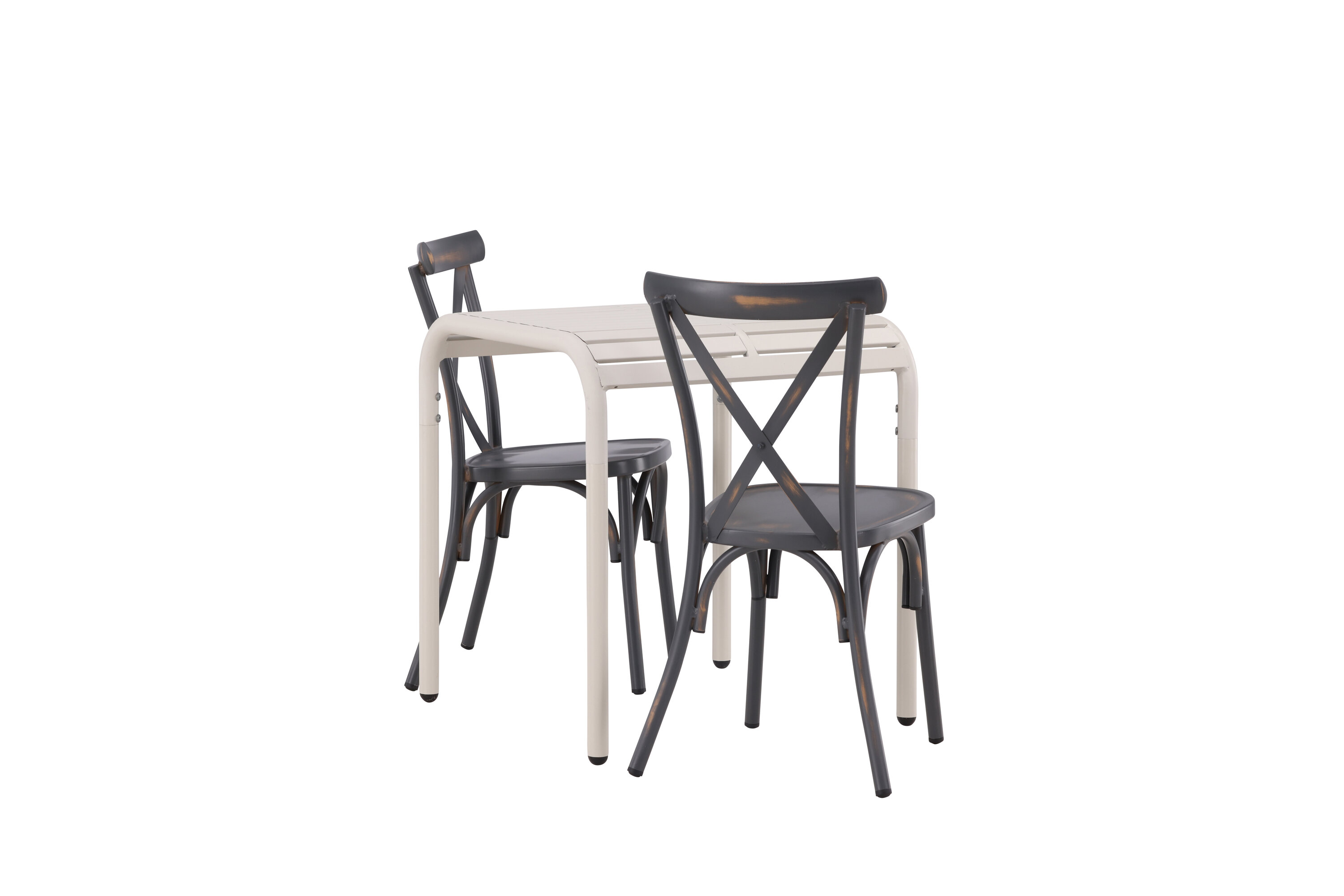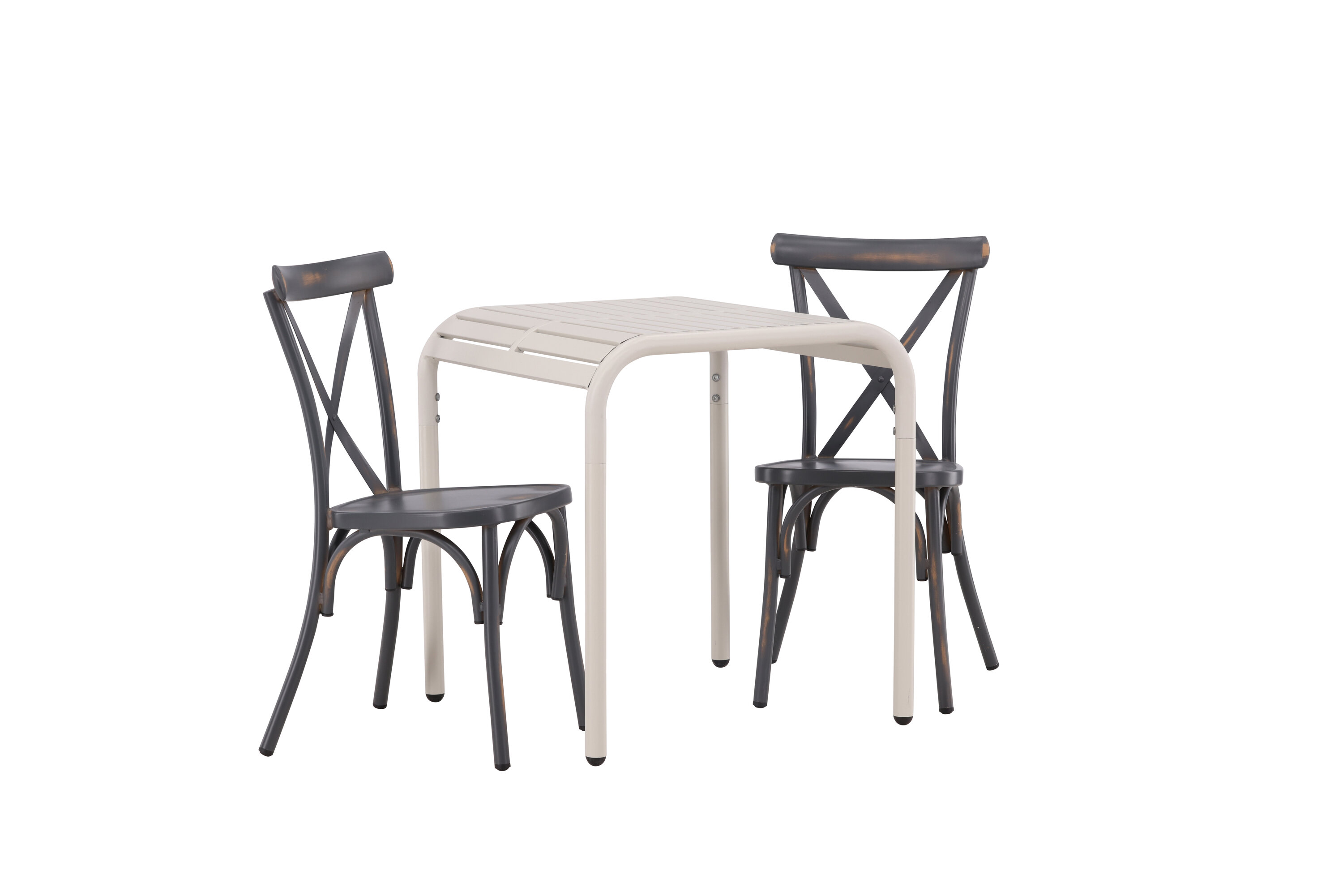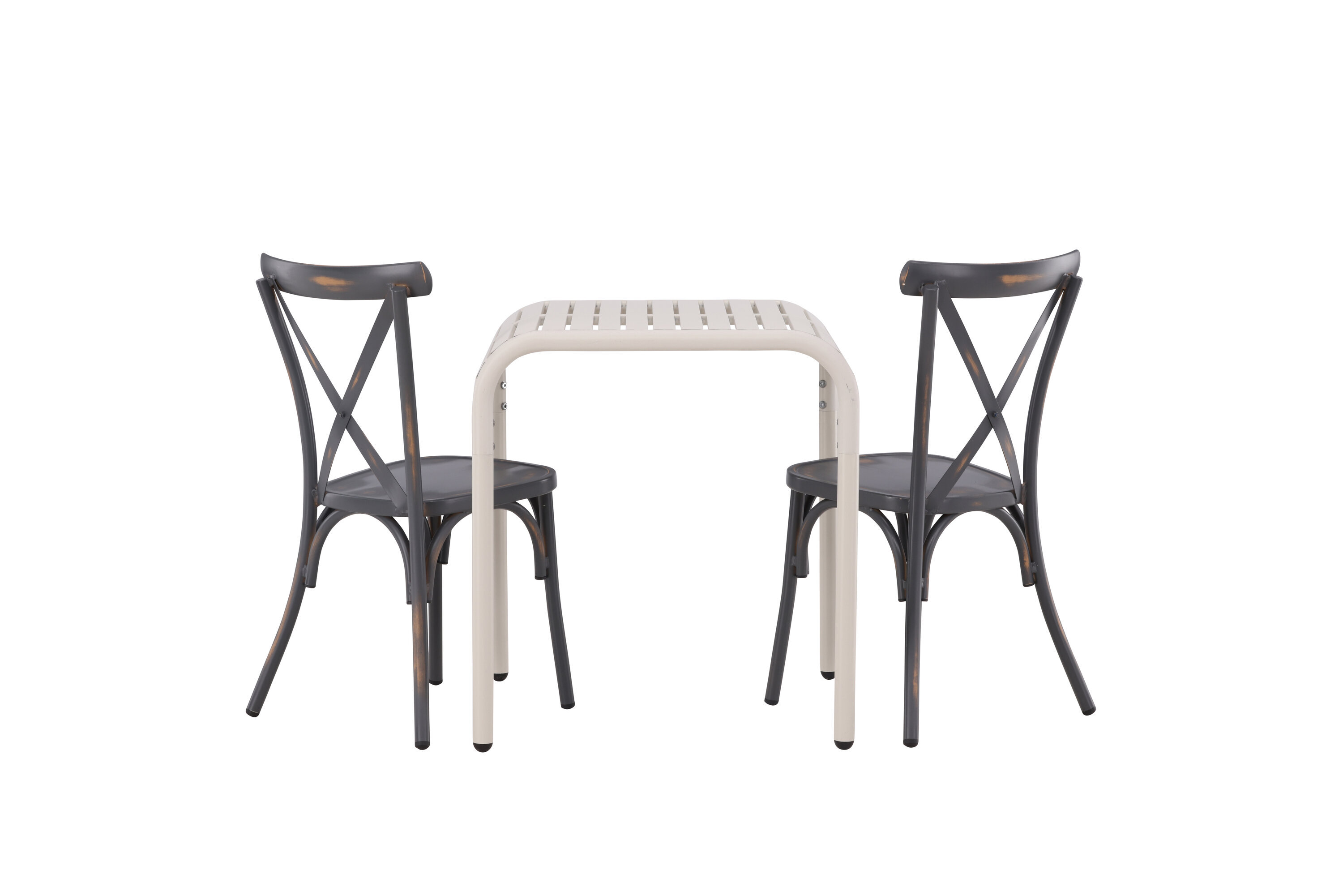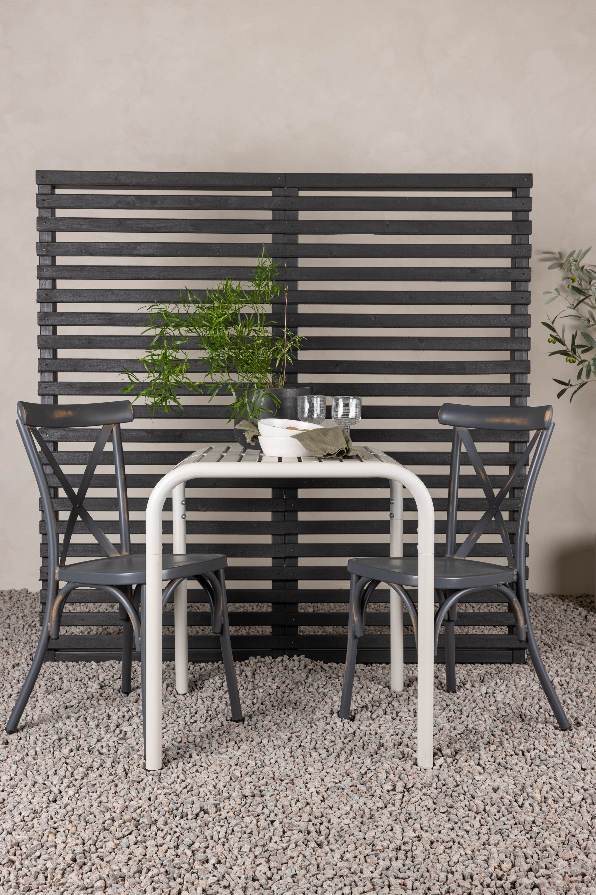 Ideaalne kohvigrupp teie terrassile! Sellel Borneo sarja kohvikulaual on ajatu Skandinaavia disain. Lauaplaat on soonikkoes ja mööda servi allapoole lainetav. Kõik kokku valmistatud beežist alumiiniumist, mis annab teile vastupidava laua, mida on lihtne liigutada. Siin koos 2 söögitooliga sarjast Tablas. Toolil on ristatud seljatugi ja kergelt laienevad jalad, mis tagavad ühtlase mulje. Üleni valmistatud alumiiniumist tahmast musta värvi. Pidage sel suvel ypur kohvipausi õues ja nautige koos vabu hetki! Laua mõõdud: 70x70cm.