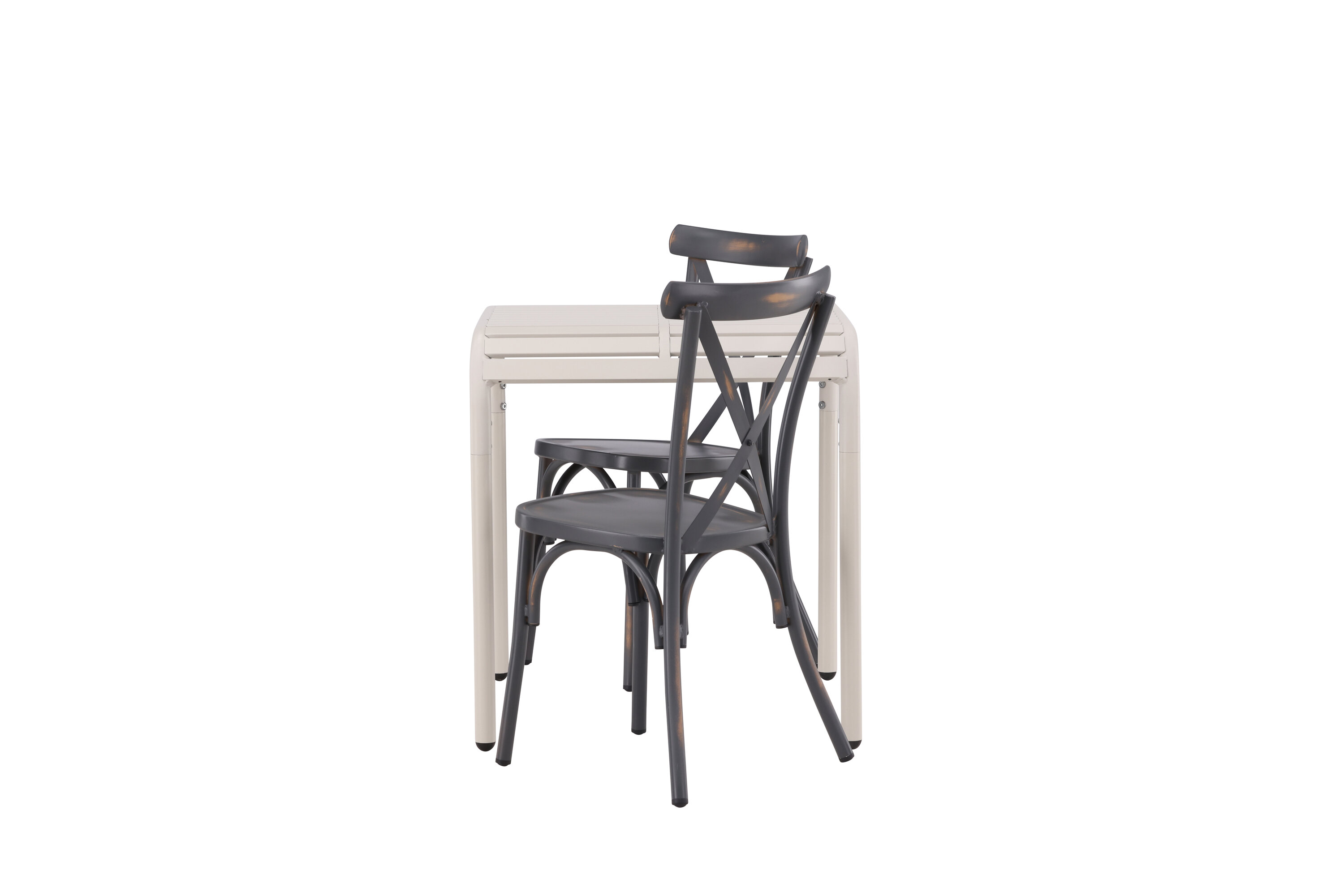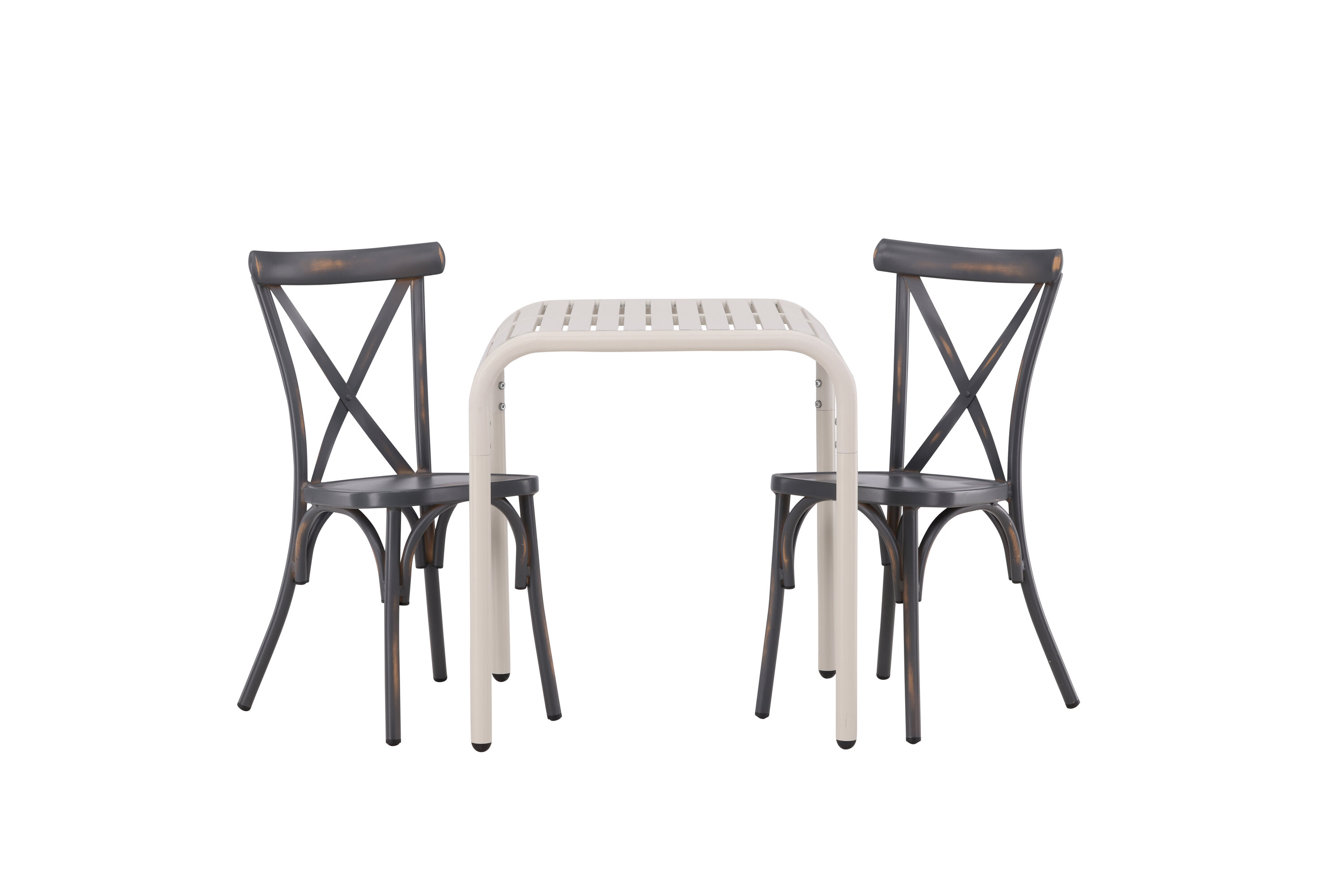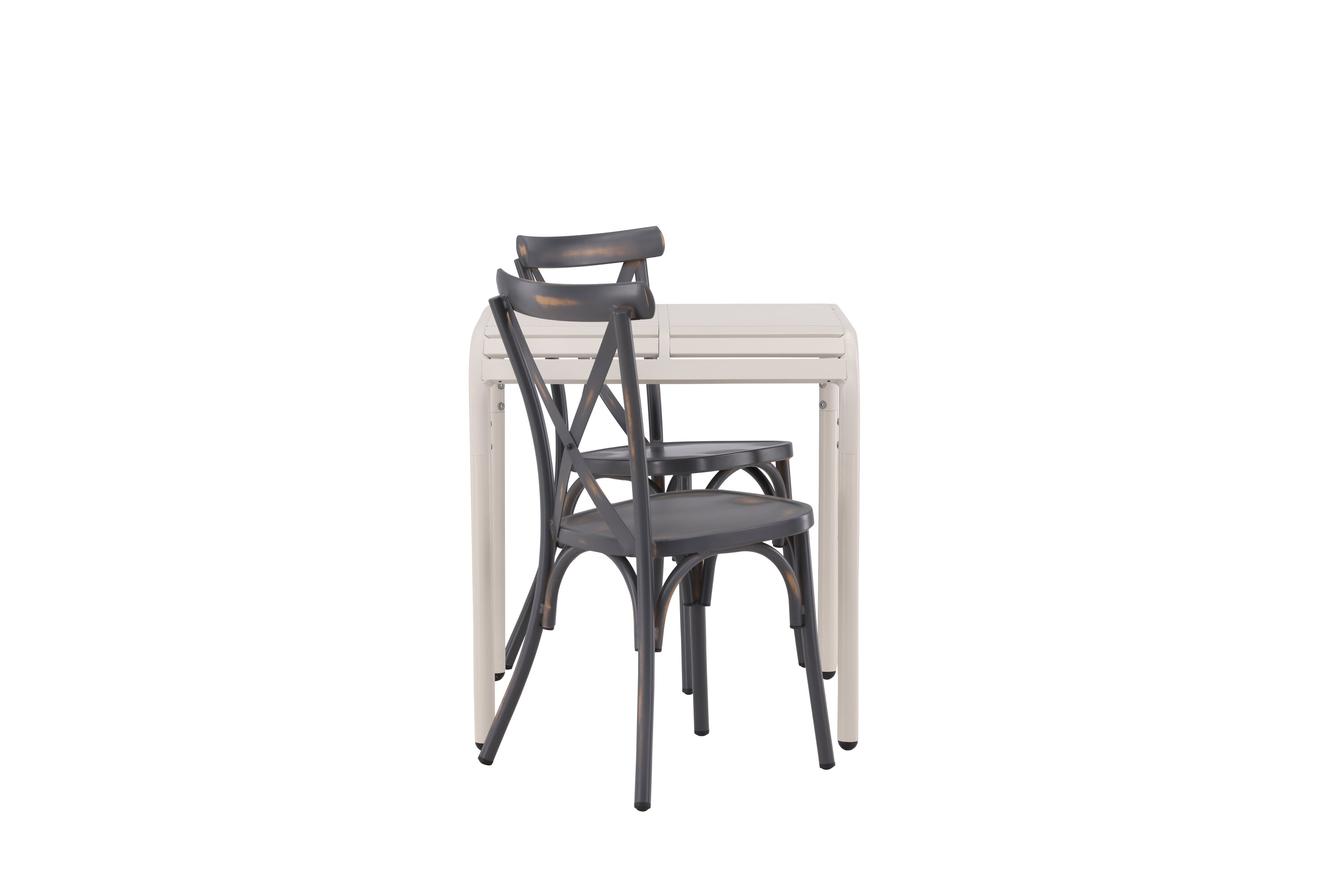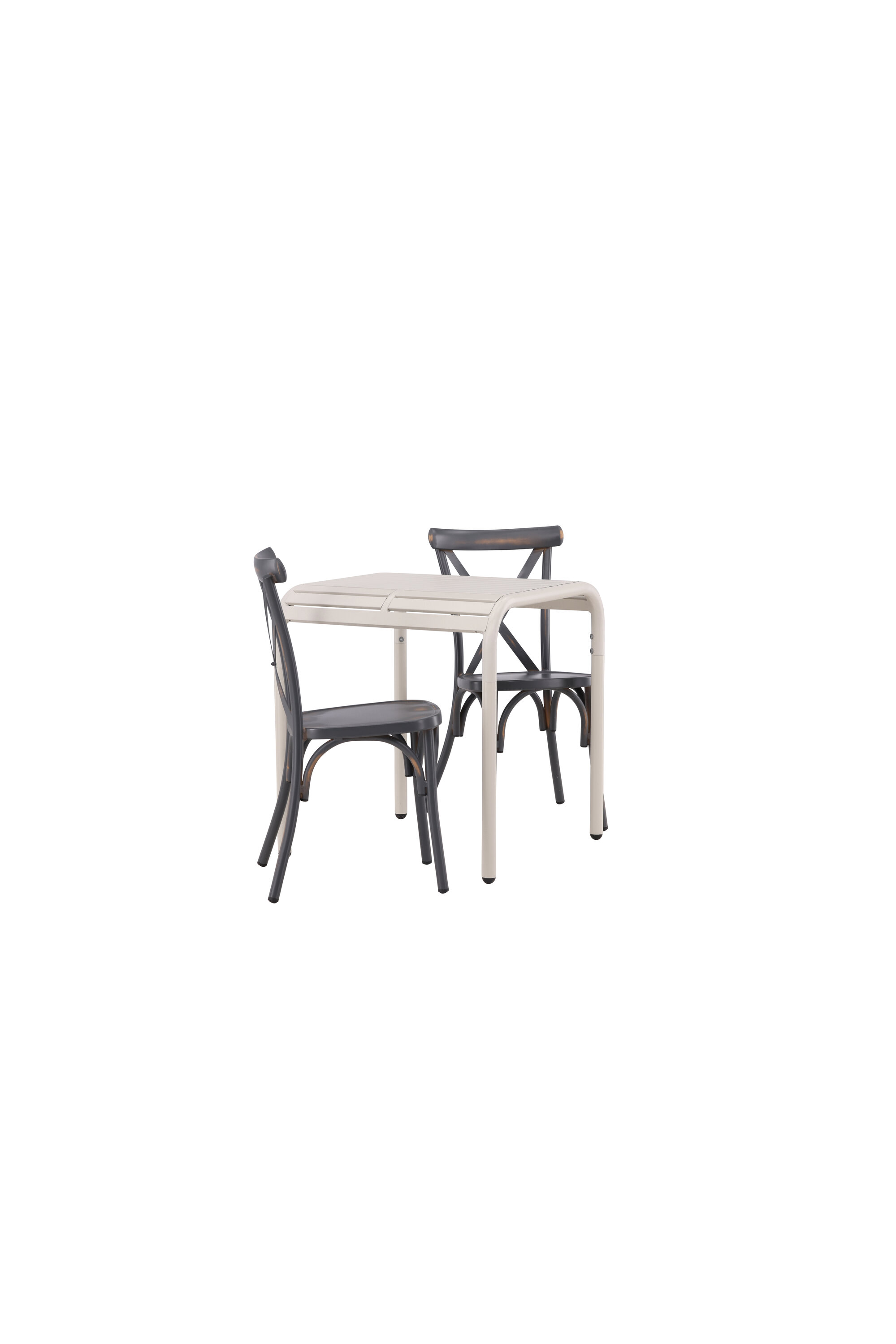Ideaalne kohvigrupp teie terrassile! Sellel Borneo sarja kohvikulaual on ajatu Skandinaavia disain. Lauaplaat on soonikkoes ja mööda servi allapoole lainetav. Kõik kokku valmistatud beežist alumiiniumist, mis annab teile vastupidava laua, mida on lihtne liigutada. Siin koos 2 söögitooliga sarjast Tablas. Toolil on ristatud seljatugi ja kergelt laienevad jalad, mis tagavad ühtlase mulje. Üleni valmistatud alumiiniumist tahmast musta värvi. Pidage sel suvel ypur kohvipausi õues ja nautige koos vabu hetki! Laua mõõdud: 70x70cm.