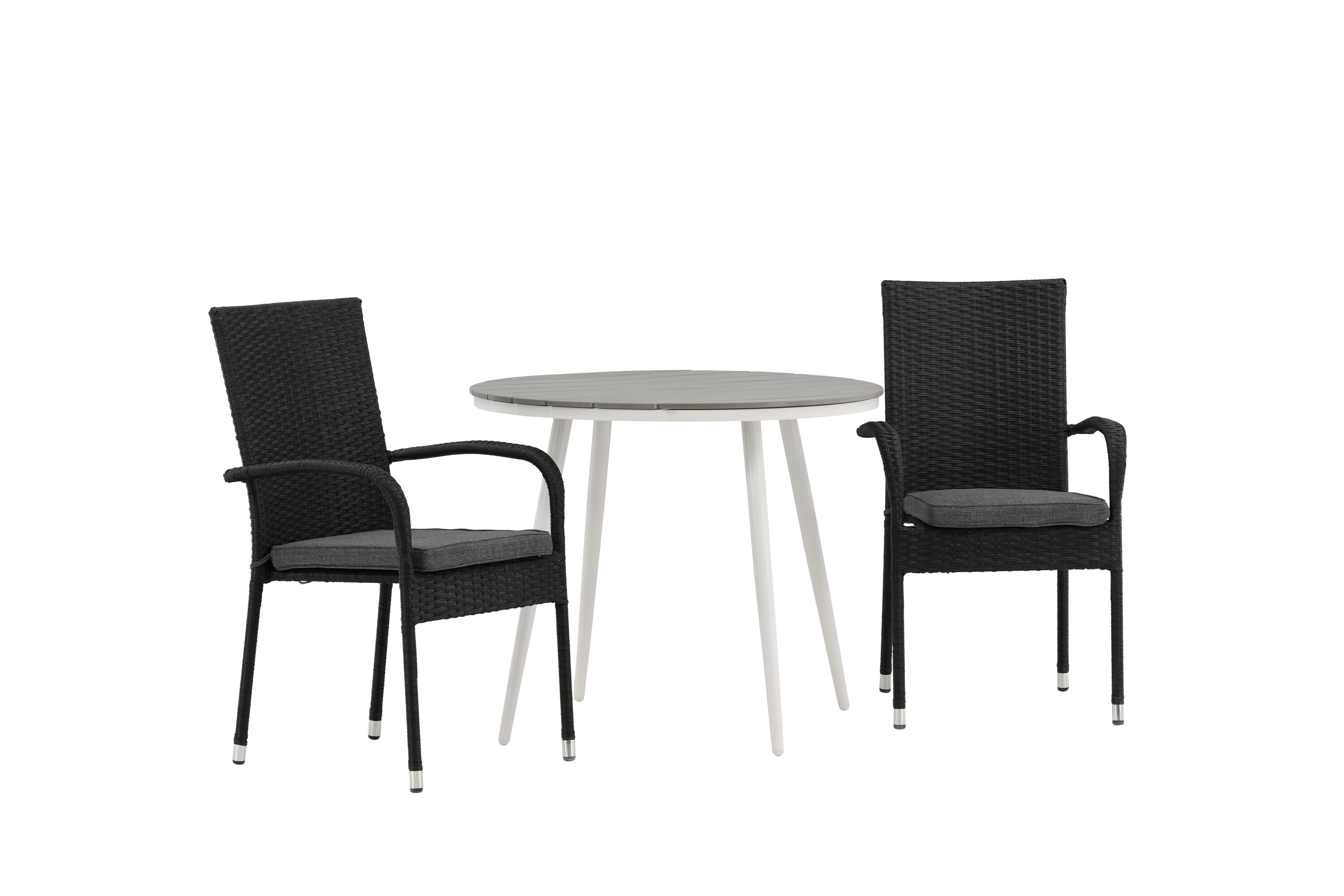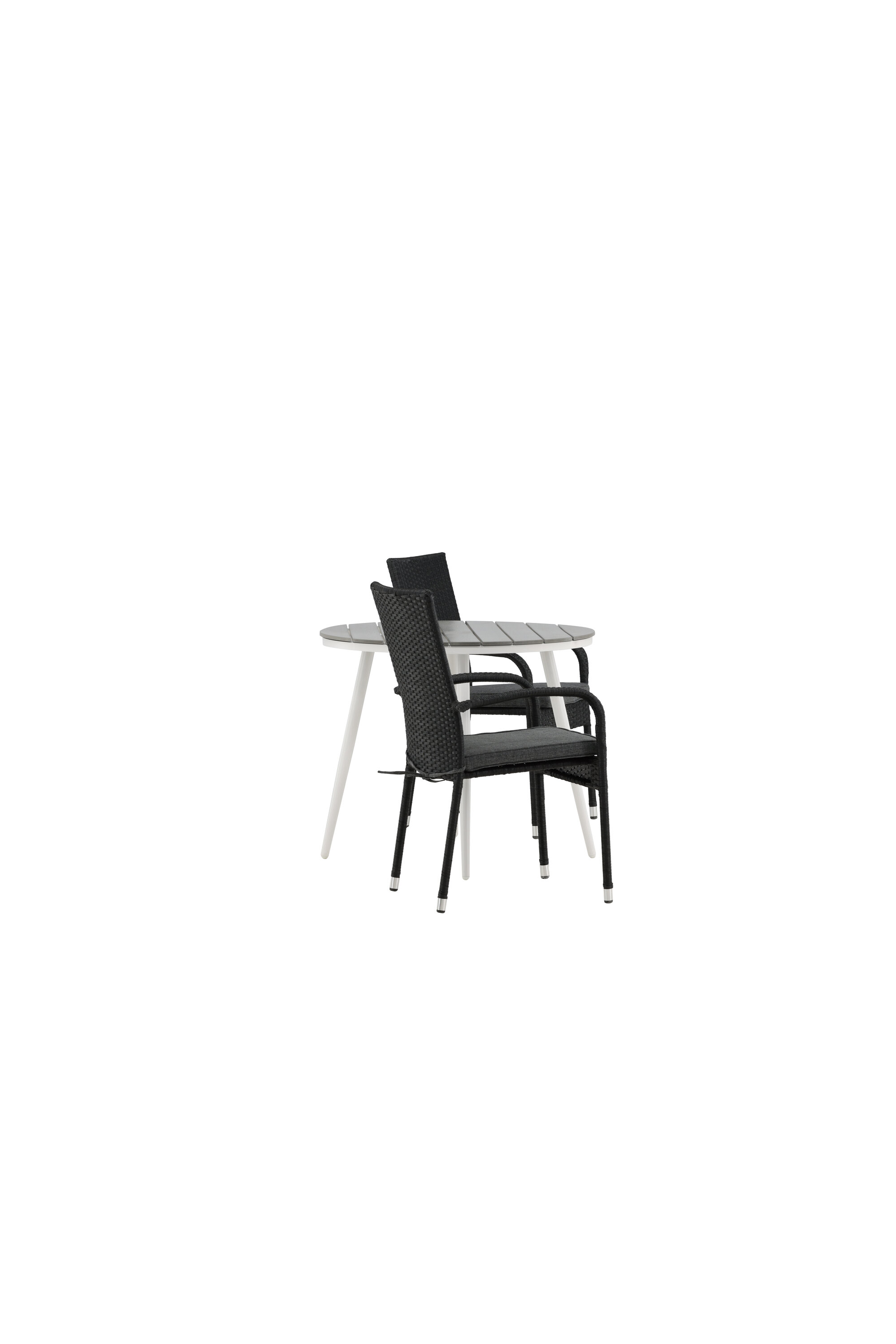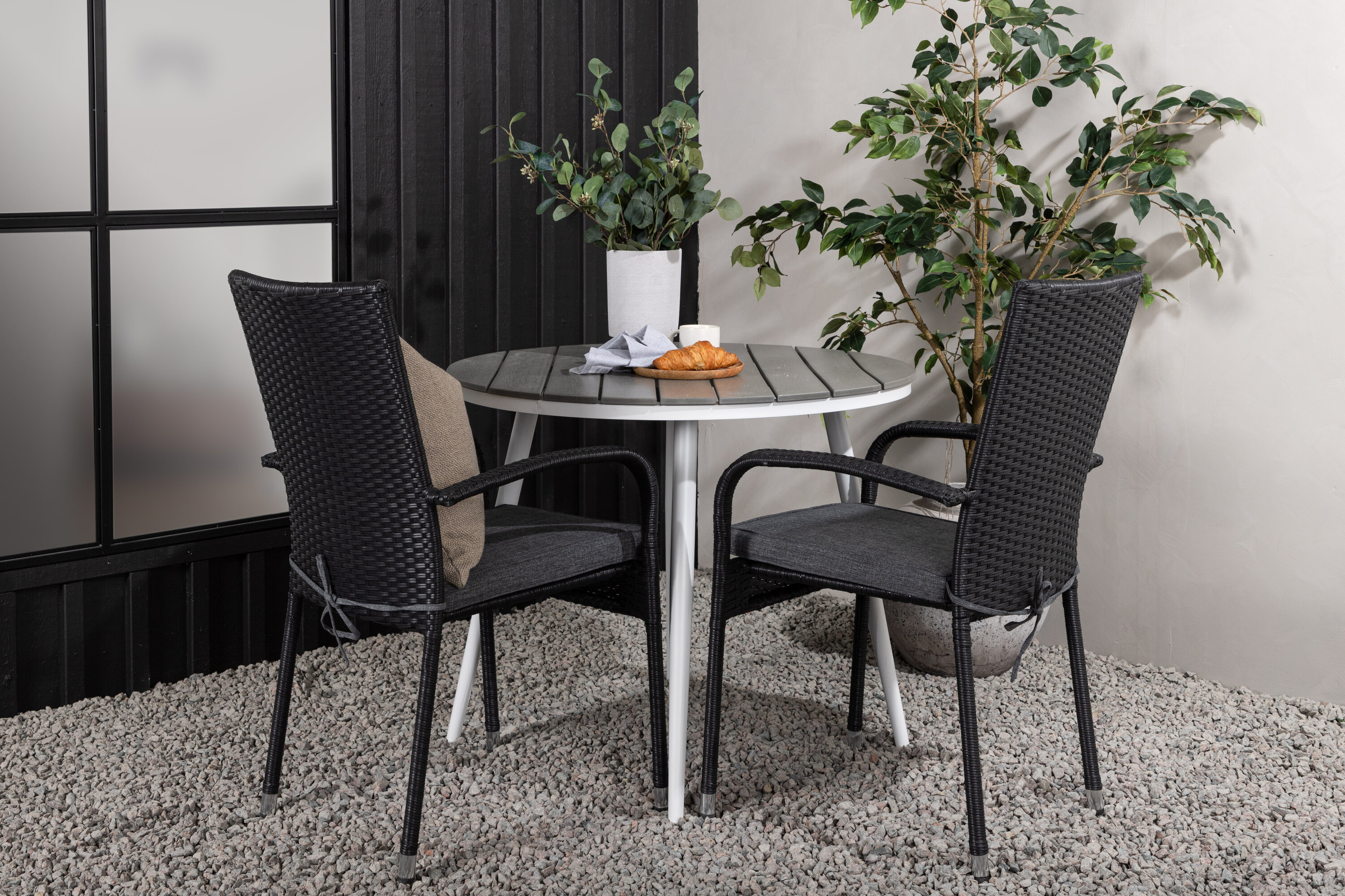 Mugav, kutsuv ja kena kohvikugrupp mugavates värvides – lihtne sobitada ja oma disainilt ajatu! Laual Break on ümmargune halli värvi Aintwood lauaplaat ja klassikaline valge alumiiniumist alusvanker. Mõõdud: 90ø cm. Siin on täiuslik kombinatsioon Anna sarja mugavate söögitoolidega. Tool on valmistatud kunstrotangist, integreeritud käetugedega, virnastatav ja maitsvat musta värvi, mida on lihtne muu mööbliga sobitada. Looge oma terrassile ideaalne kohvikoht!