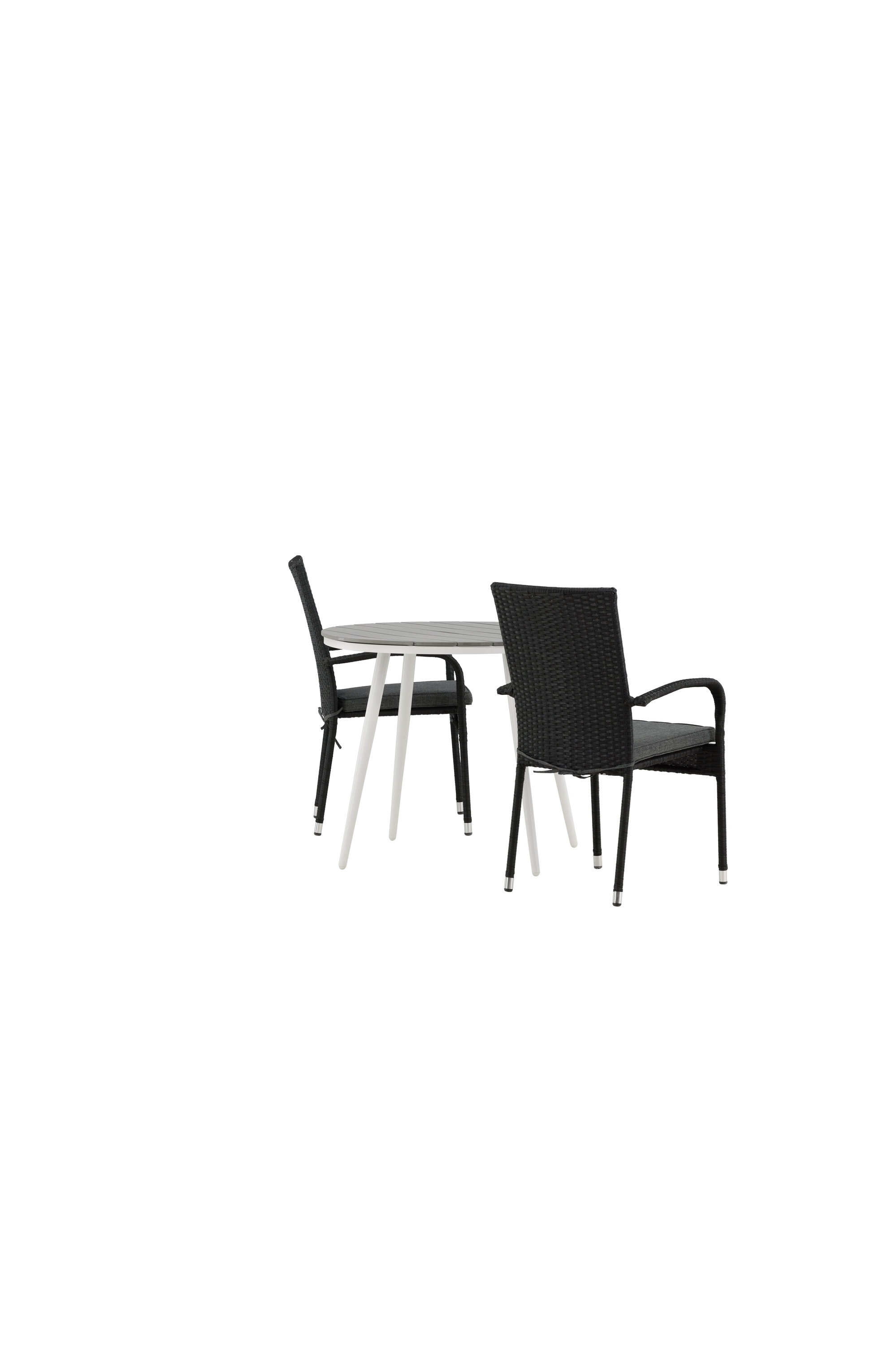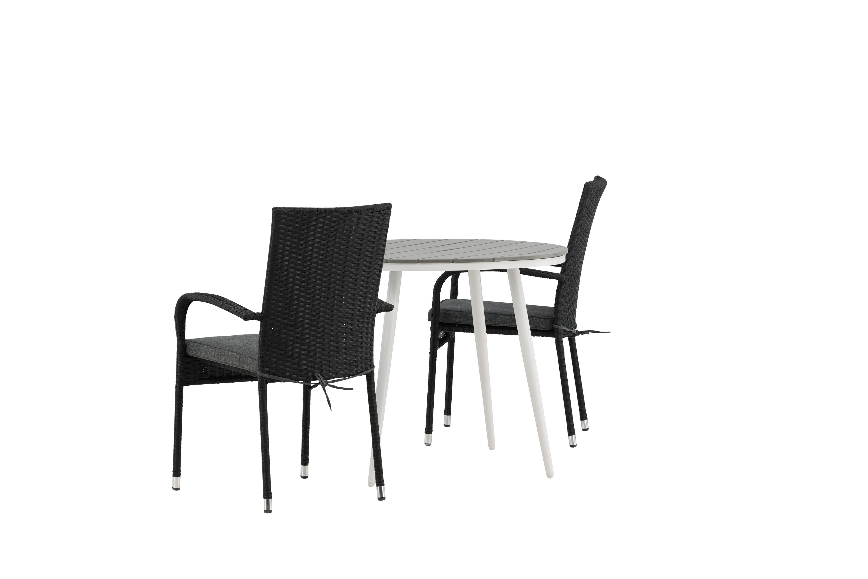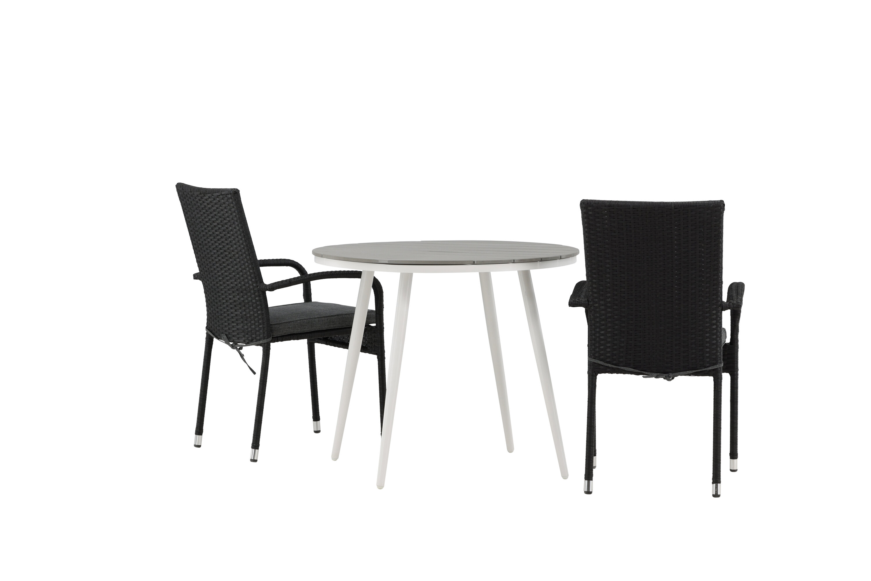 Mugav, kutsuv ja kena kohvikugrupp mugavates värvides – lihtne sobitada ja oma disainilt ajatu! Laual Break on ümmargune halli värvi Aintwood lauaplaat ja klassikaline valge alumiiniumist alusvanker. Mõõdud: 90ø cm. Siin on täiuslik kombinatsioon Anna sarja mugavate söögitoolidega. Tool on valmistatud kunstrotangist, integreeritud käetugedega, virnastatav ja maitsvat musta värvi, mida on lihtne muu mööbliga sobitada. Looge oma terrassile ideaalne kohvikoht!