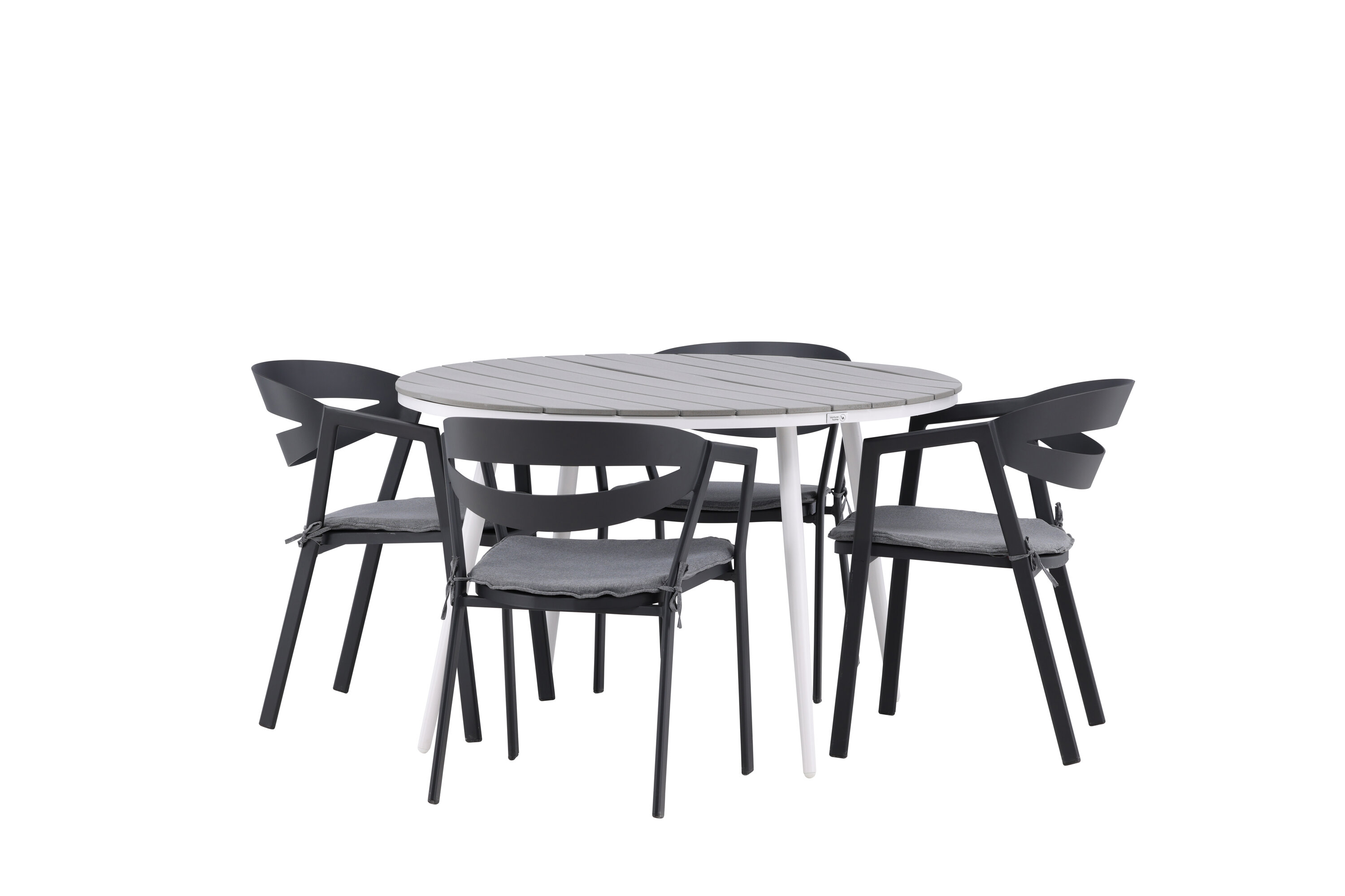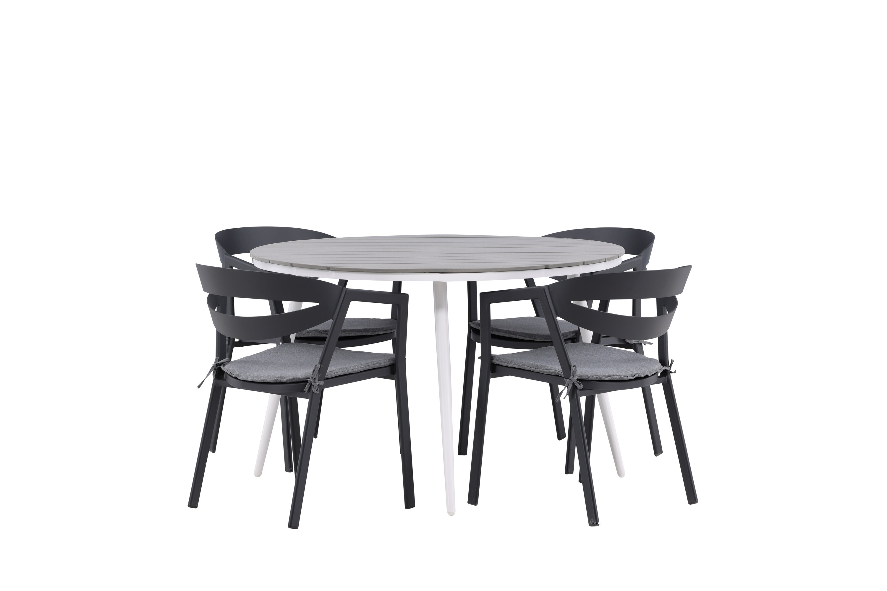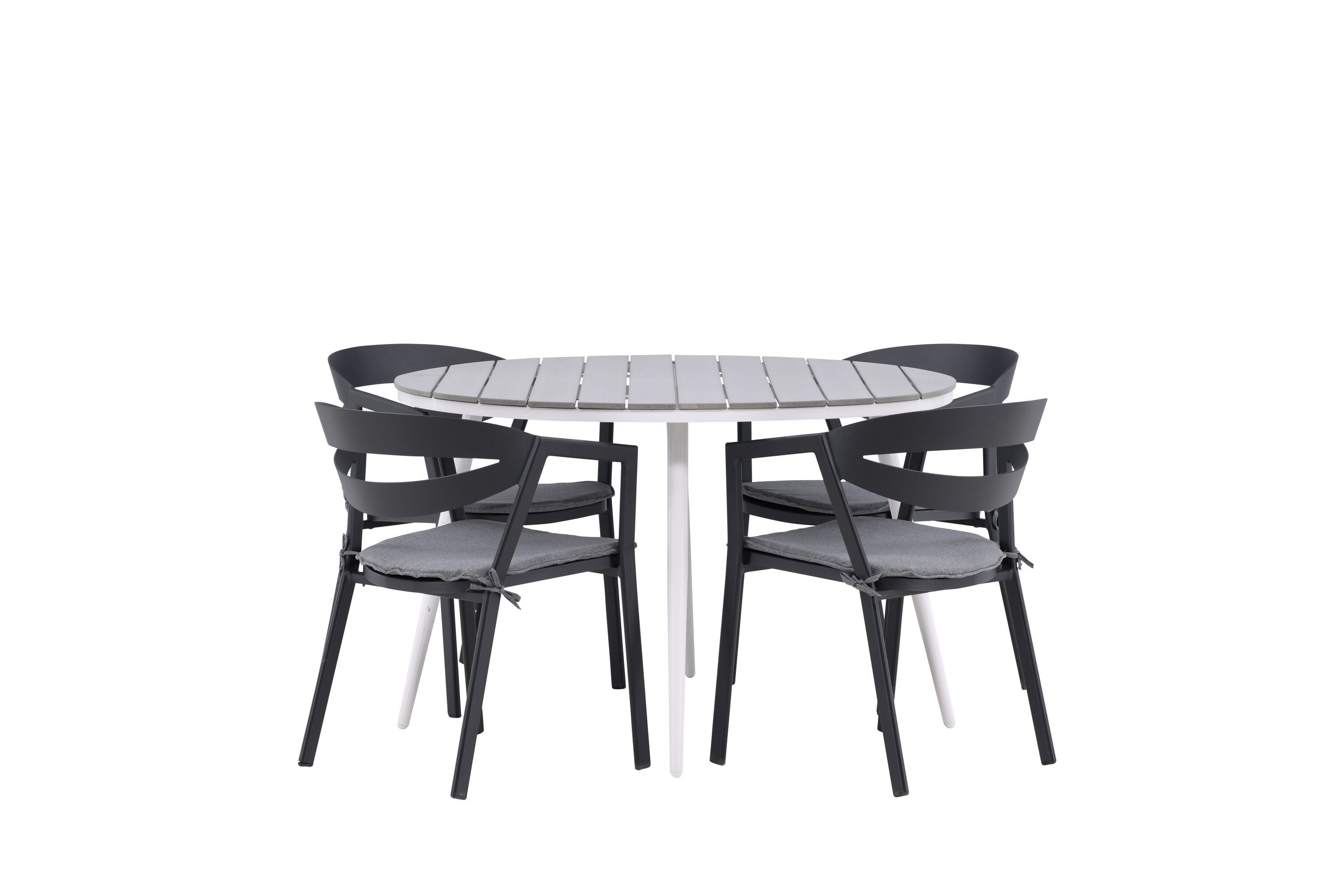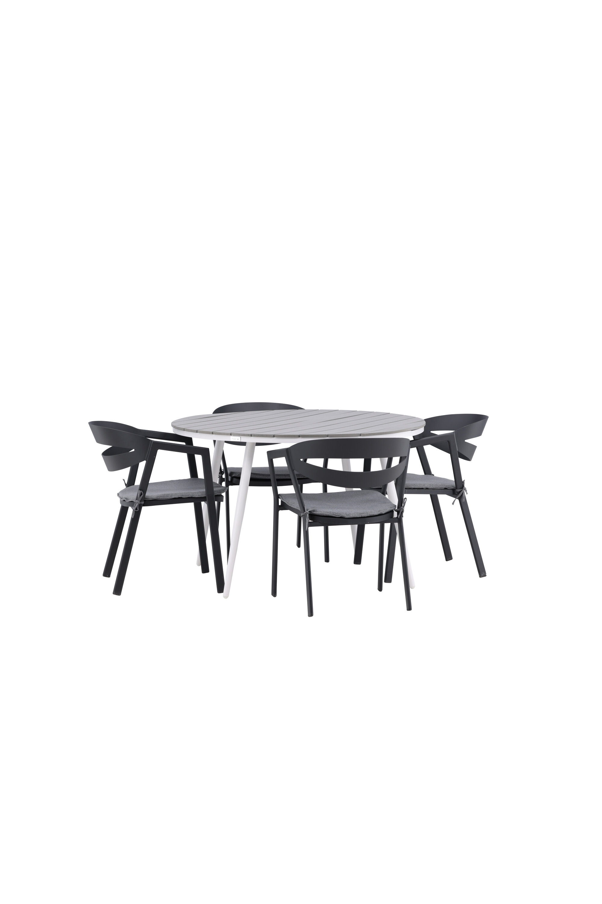 Ümmargune toidugrupp, mis ühendab ajatu disaini kutsuvate vormidega! Söögilaud Break on klassikalise disainiga halli Aintwoodi ümara lauaplaadi ja valgest alumiiniumist kergelt laienevate jalgadega. Siin on ideaalne kombinatsioon mugavate söögitoolidega sarjast Slit. Toolidel on integreeritud mustast alumiiniumist käetoed ja halli padi lisamugavuseks. Looge oma terrassile ideaalne kohvikoht!