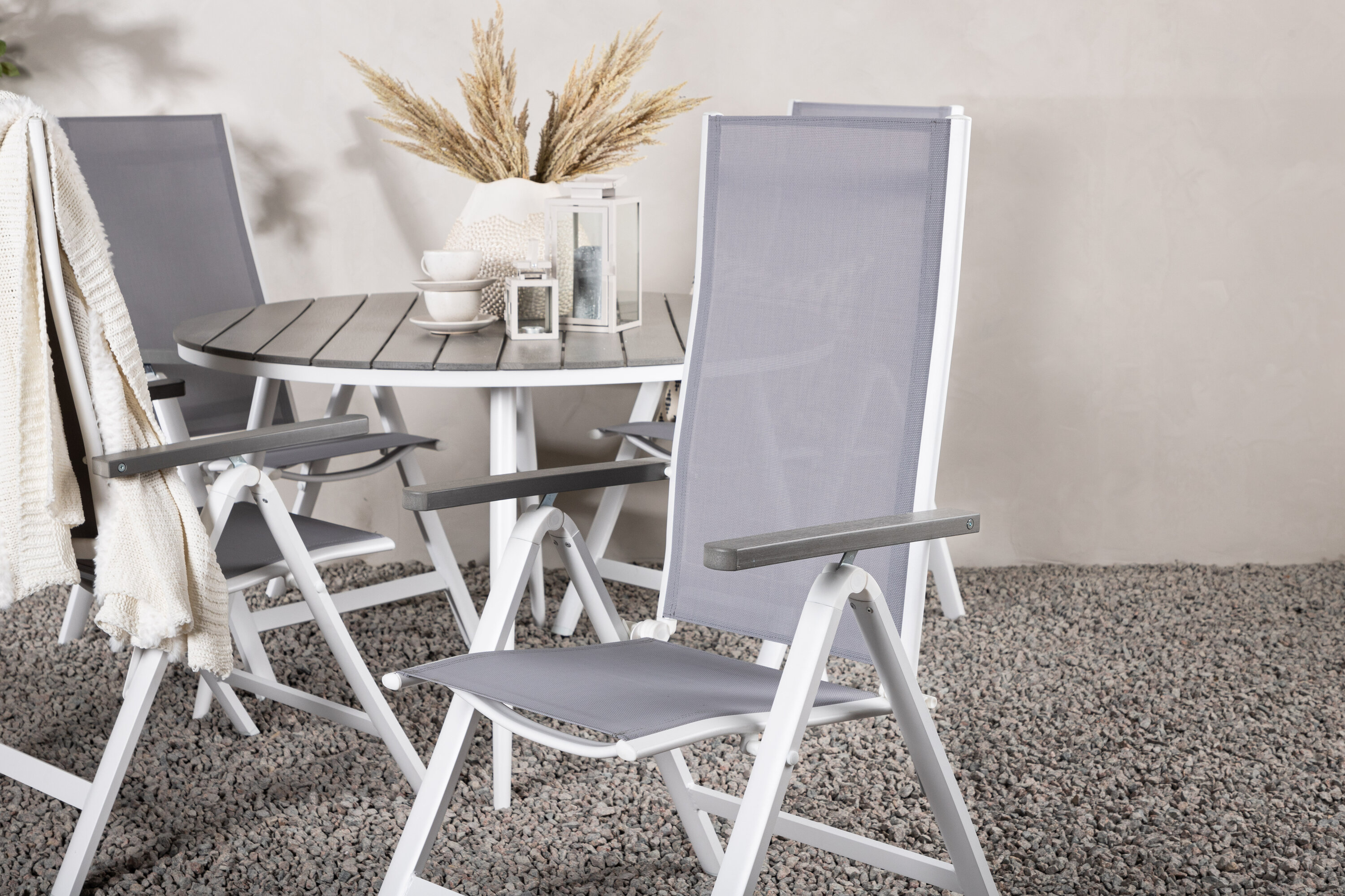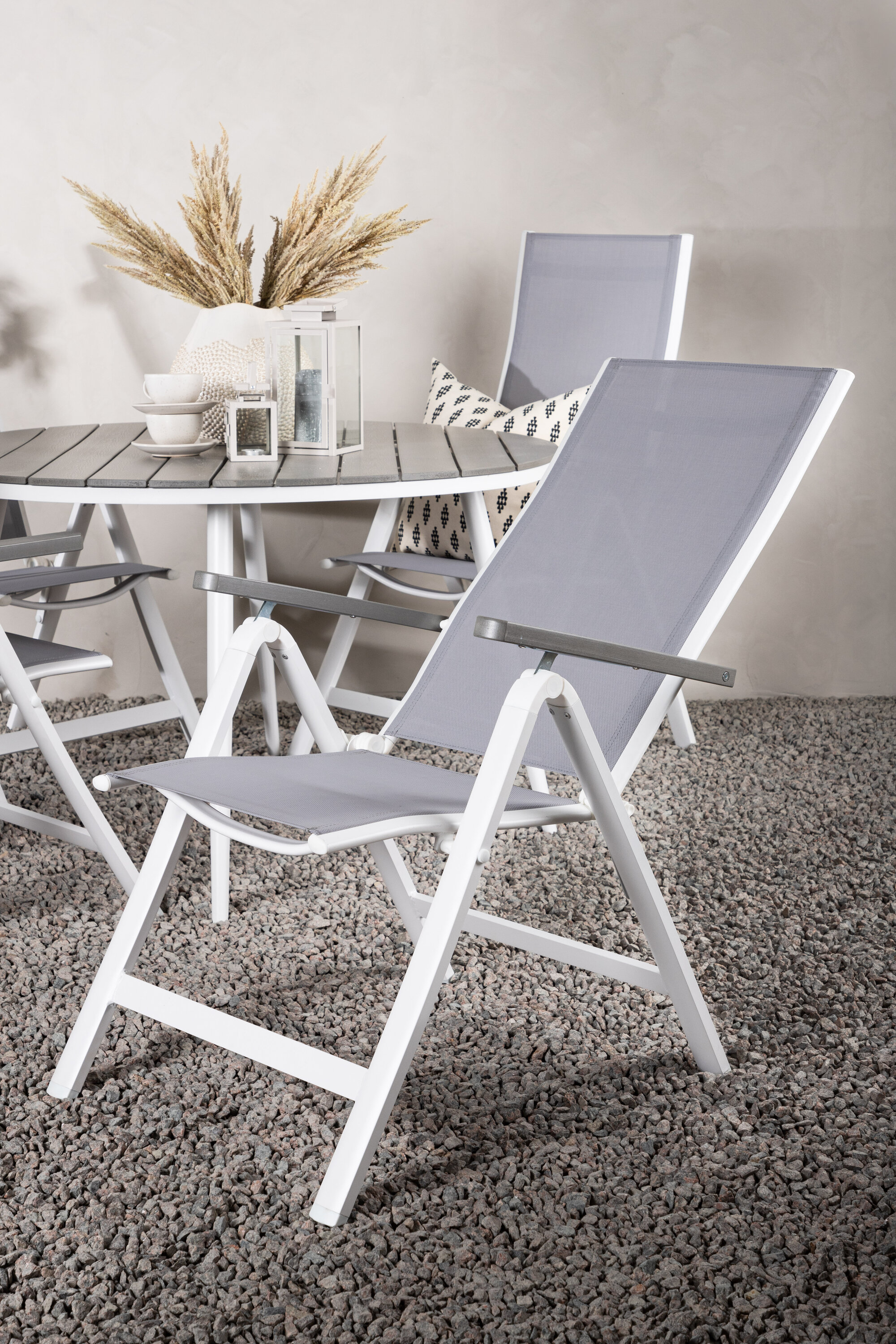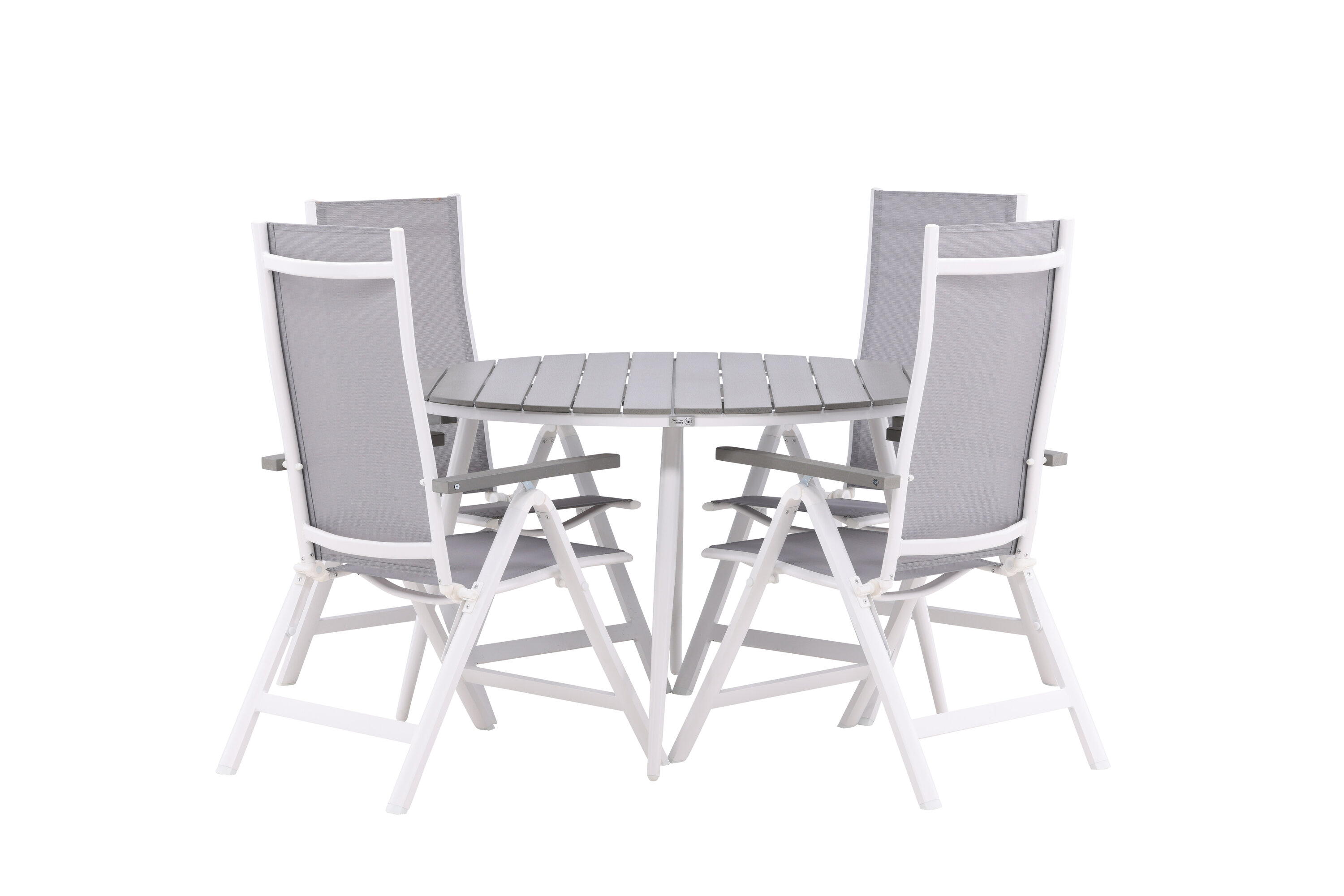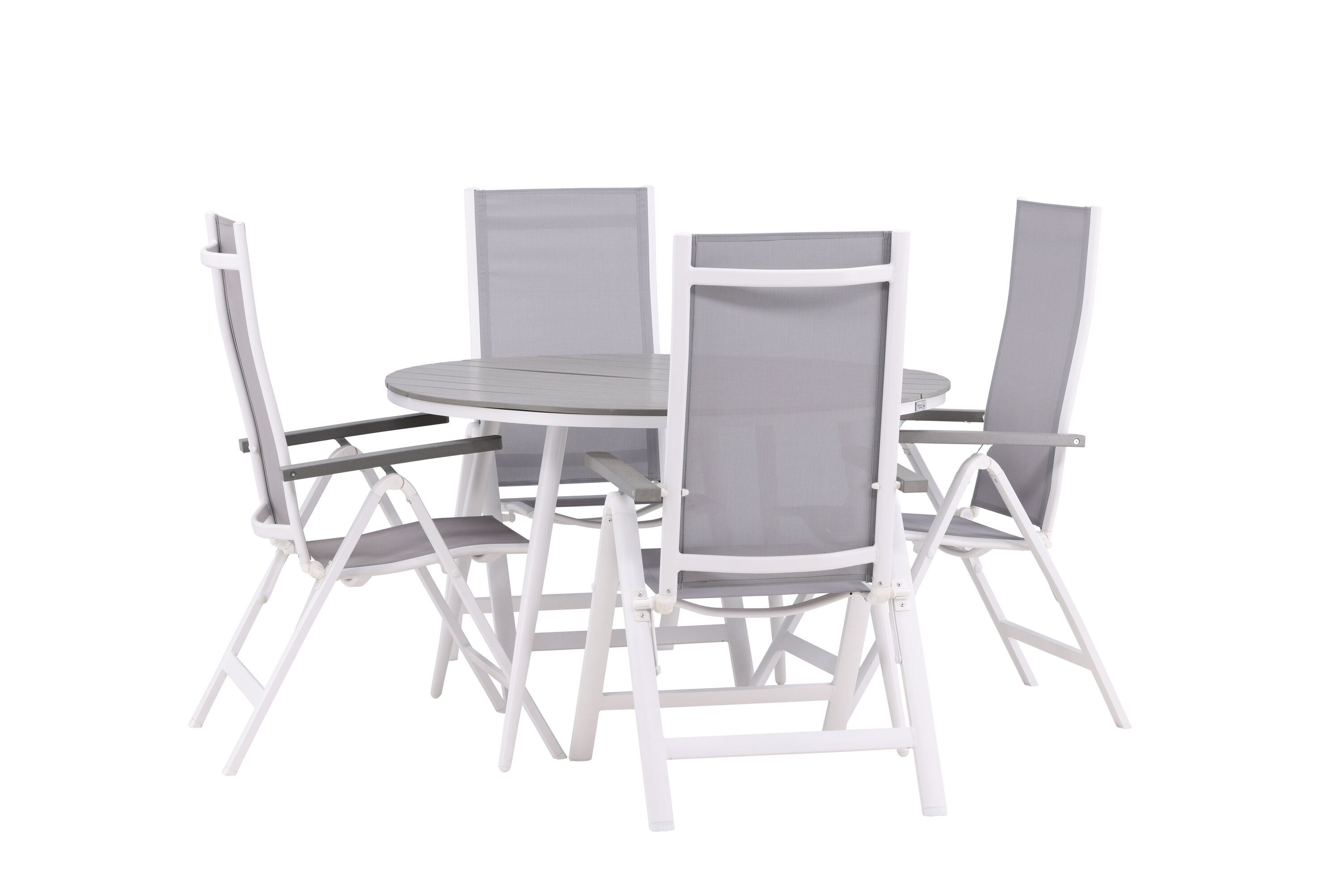 Meeldivates värvides maitsev kokkusobiv toidugrupp – sobib suurepäraselt kogu suvisteks õuesöökideks! Söögilaual Break on hallist Aintwoodist ümmargune lauaplaat ja klassikaline valge alumiiniumist alusvanker. Mõõdud: 120ø cm. Siin koos 4 Albany seeria söögitooliga, mugavusele ja vastupidavusele keskenduv tool. Tool on hall 5-asendiline tekstiilist tool maitsvate käetugede ja valge alumiiniumraami konstruktsiooniga. Seljatugi on optimaalse mugavuse ja lõõgastumise tagamiseks kokkuklapitav. Siin istud kaua ja naudid head toitu!