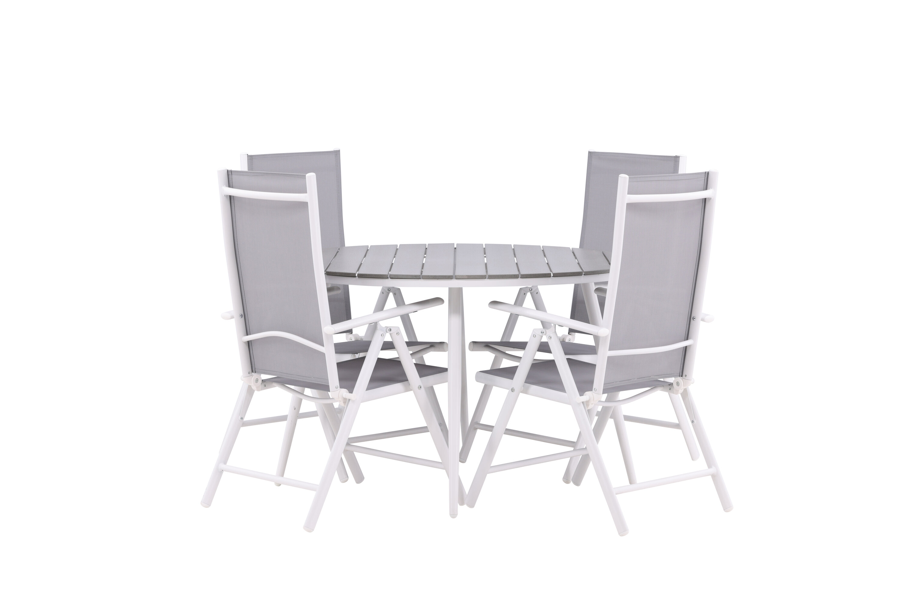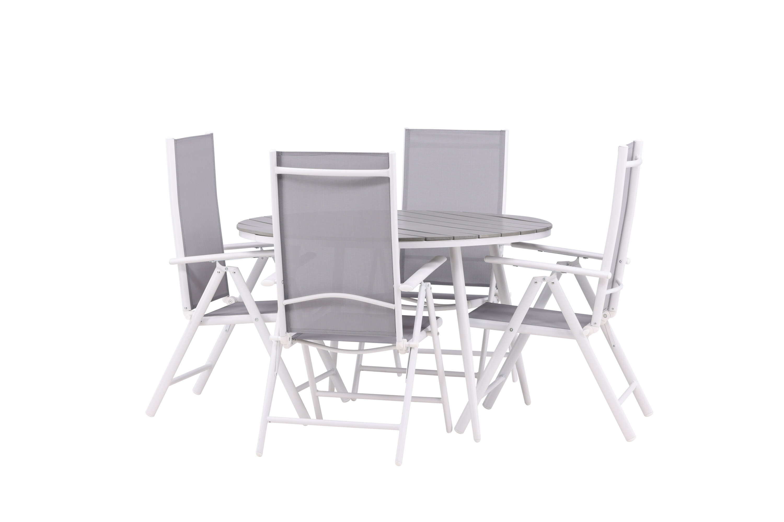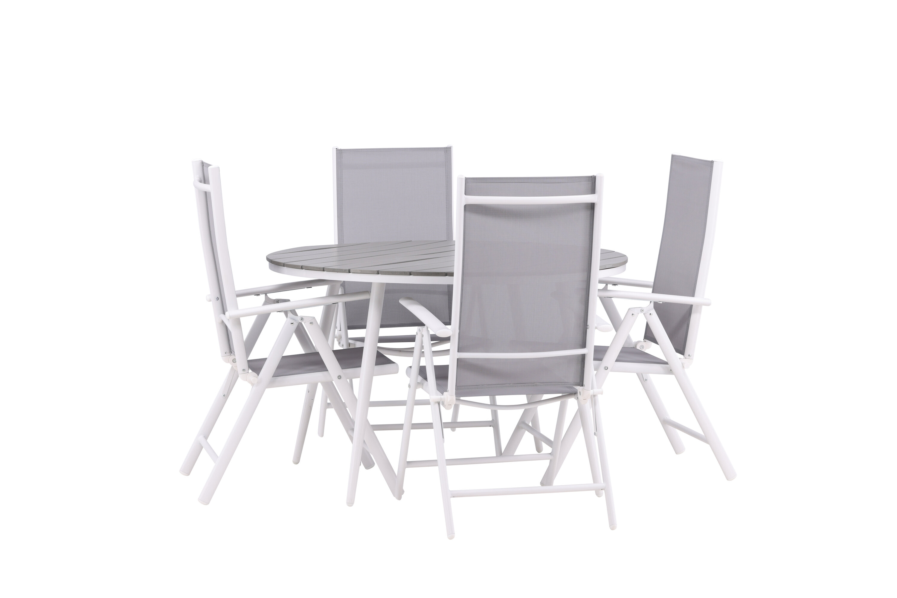 Klassikalise disaini ja sihvaka värviskaalaga söögigrupp ei lähe kunagi ajast maha – lihtne sobitada ja oma disainilt ajatu! Laual Break on ümmargune halli värvi Aintwood lauaplaat ja klassikaline valge alumiiniumist alusvanker. Siin täiuslik kombinatsioon sama sarja kokkupandavate söögitoolidega. Hallist tekstiilist toolide seljatugesid saab reguleerida, et tagada optimaalne mugavus ja lõõgastus söögilaua ümber. Looge oma siseõue täiuslik keskpunkt!