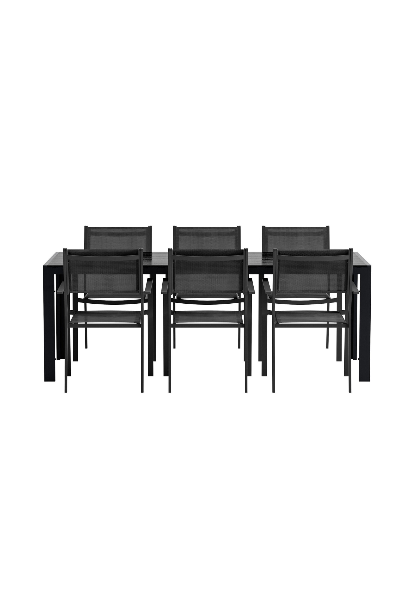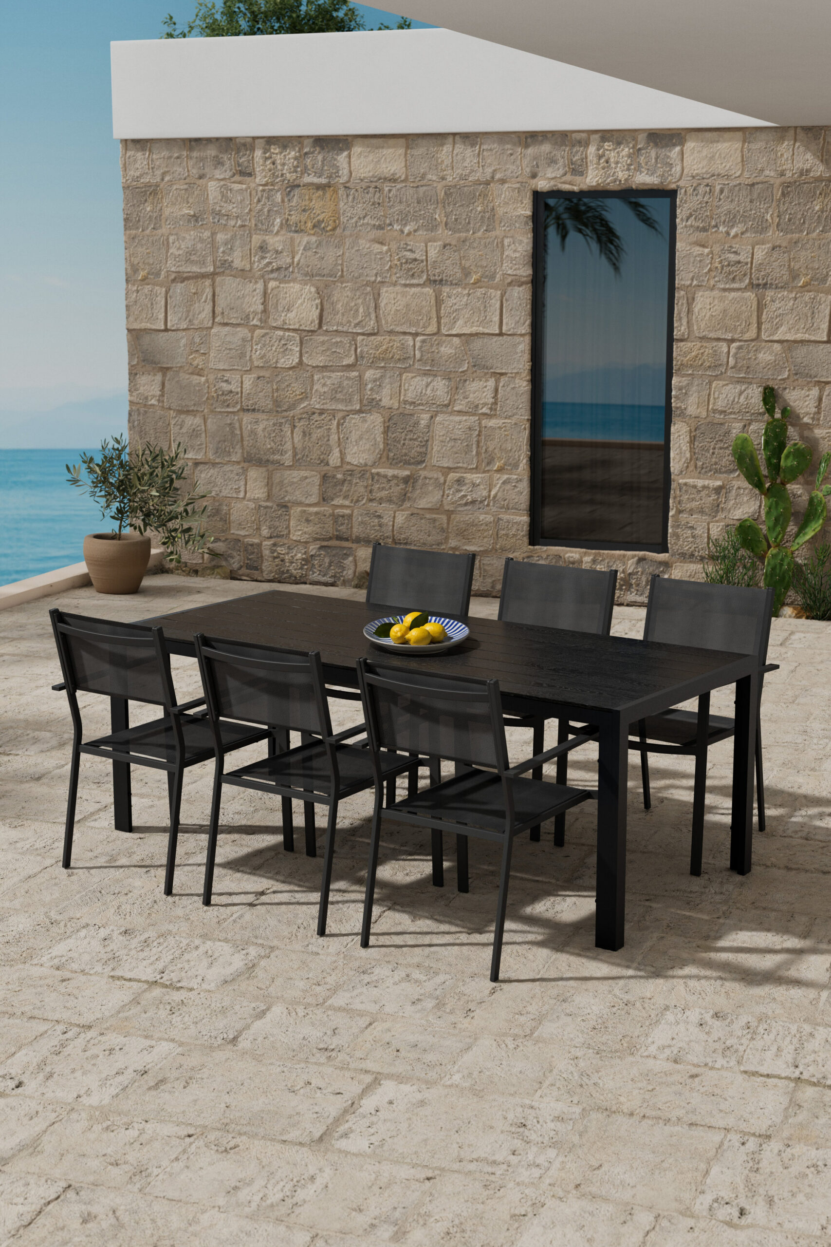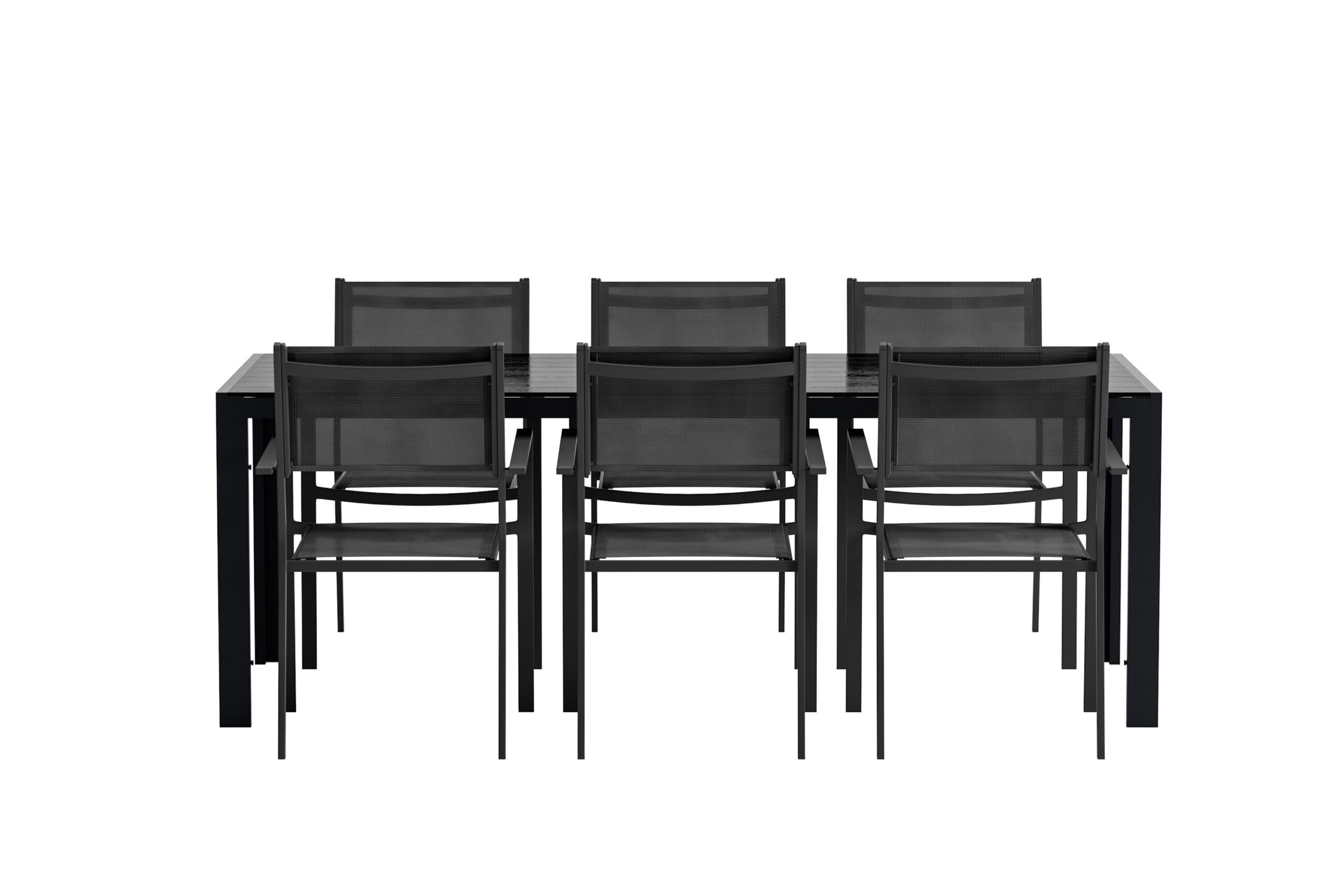 Looge moodne ja vastupidav välisöögituba selle elegantse söögikomplektiga, mis ühendab Copacabana toolid põhjamaise disainiga Break söögilauaga. Copacabana söögitoolil on tugev ja stiilne must alumiiniumraam pehme musta tekstiilist istmega. Tool on nii mugav kui ka kulumiskindel ning kuna see on virnastatav, muutub hoiustamine lihtsaks ja mugavaks – ideaalne nutikaks ja atraktiivseks õuesisustamiseks. Söögilaud Break on ristkülikukujuline ja stiilne laud, millel on mustast polüpuidust lauaplaat ja alumiiniumist jalad. Laud on kerge, vastupidav ja vajaduse korral hõlpsasti liigutatav, samas kui puhas põhjamaise disainiga on seda lihtne sobitada igas väliskeskkonnas.