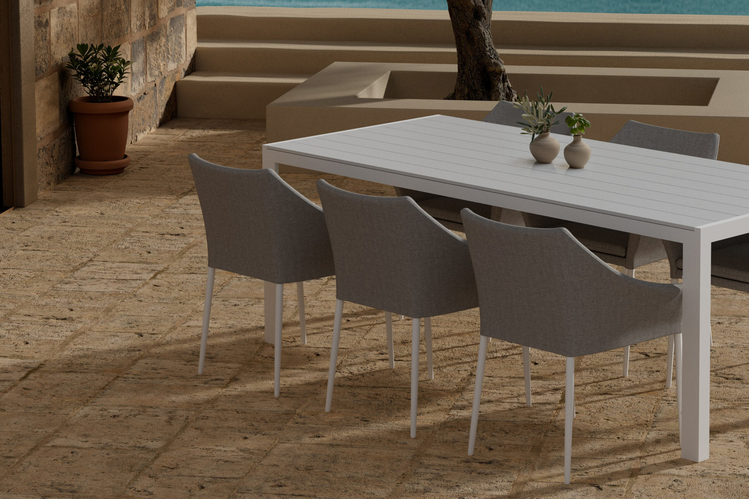 Break laual on kaasaegne ja lihtne disain valgest alumiiniumist ja vastupidavast aintpuidust. Selle ristkülikukujuline kuju ja avar lauaplaat teevad sellest praktilise ja stiilse valiku, mis sobib enamiku väliskeskkondadega. Laua ajatu välimus muudab selle sobitamise lihtsaks ning loob värske ja harmoonilise atmosfääri. Spoga toolid ja laud Break moodustavad koos elegantse ja funktsionaalse söögikomplekti, mis täiustab teie õueruumi ja kutsub õue imelisi hetki.